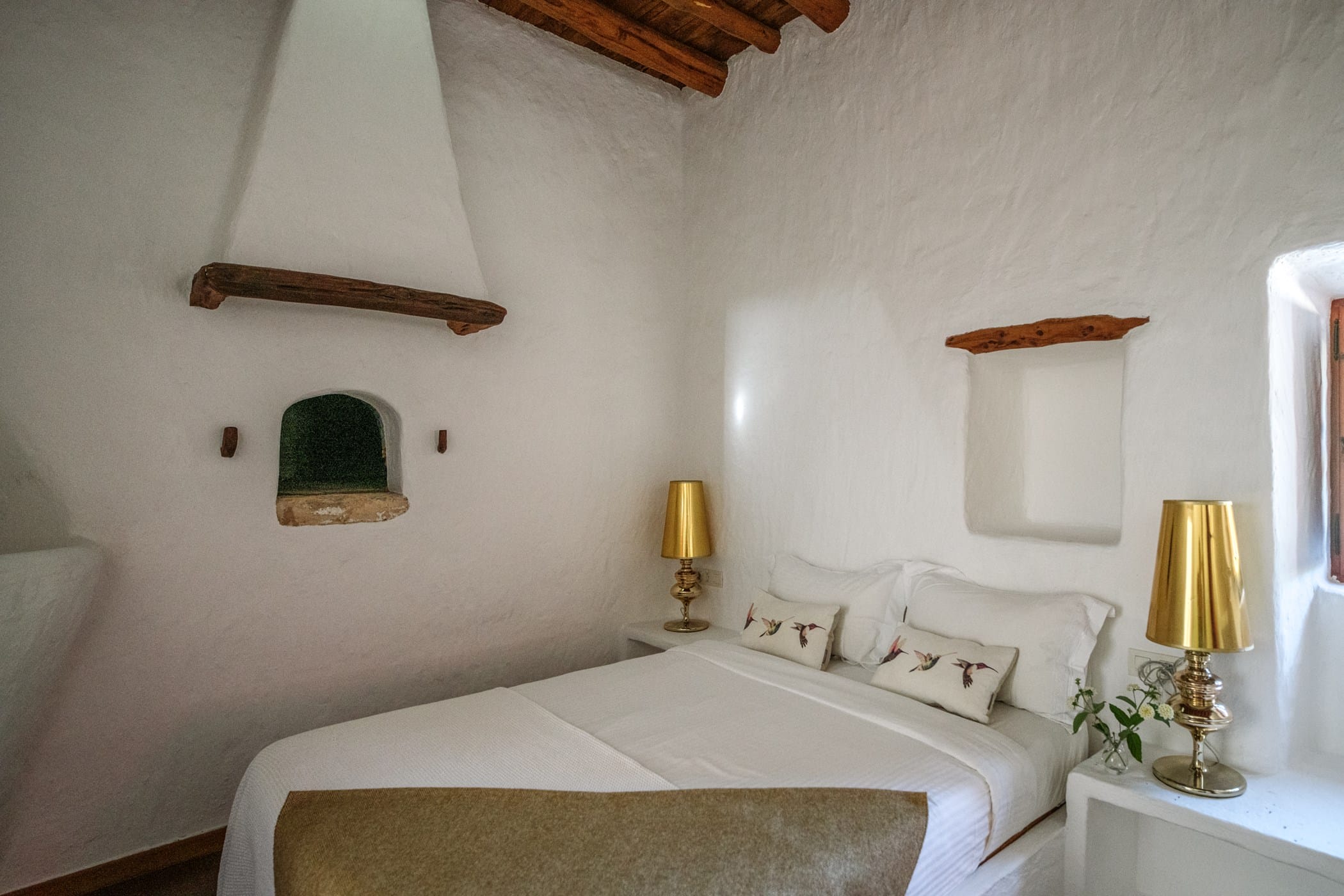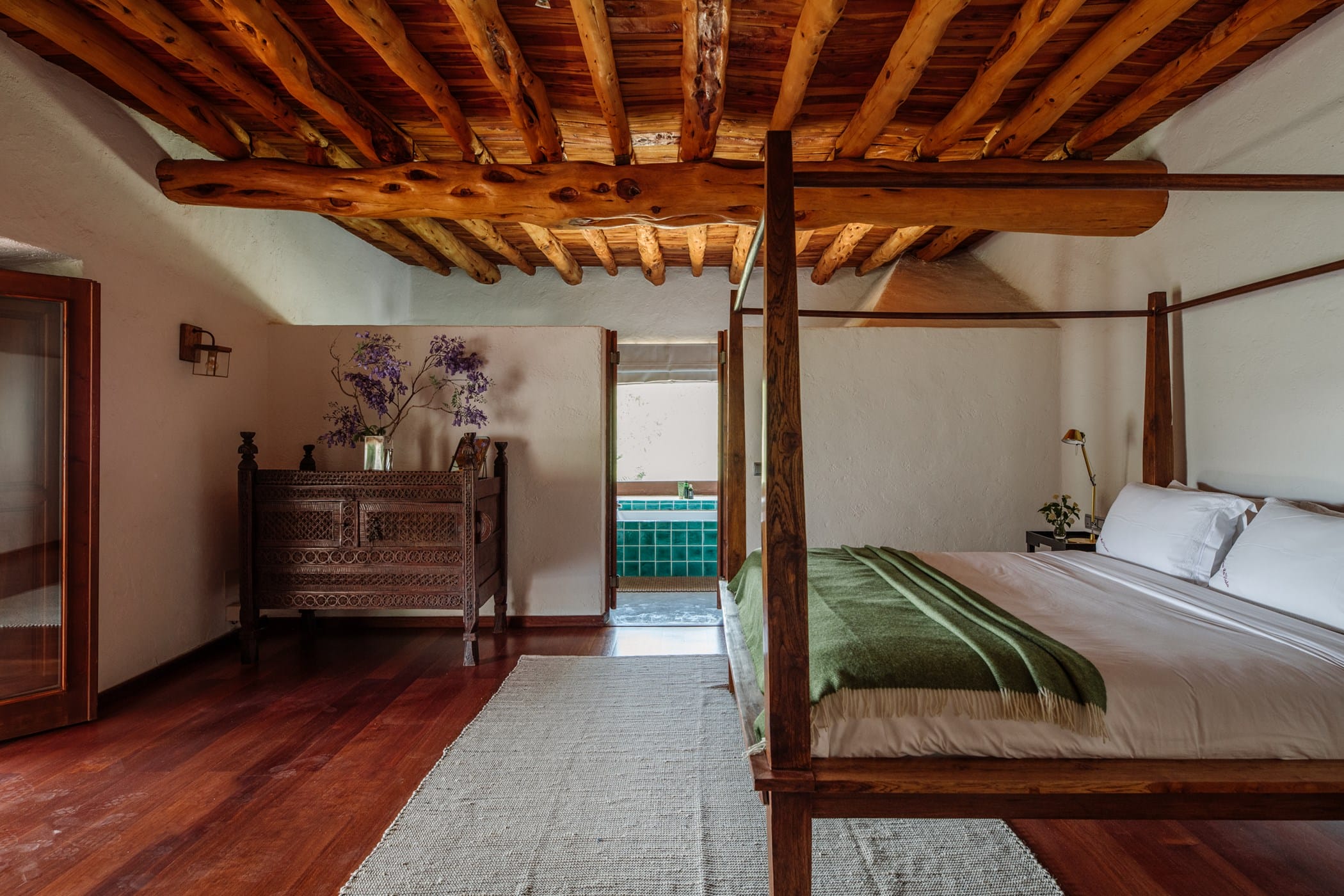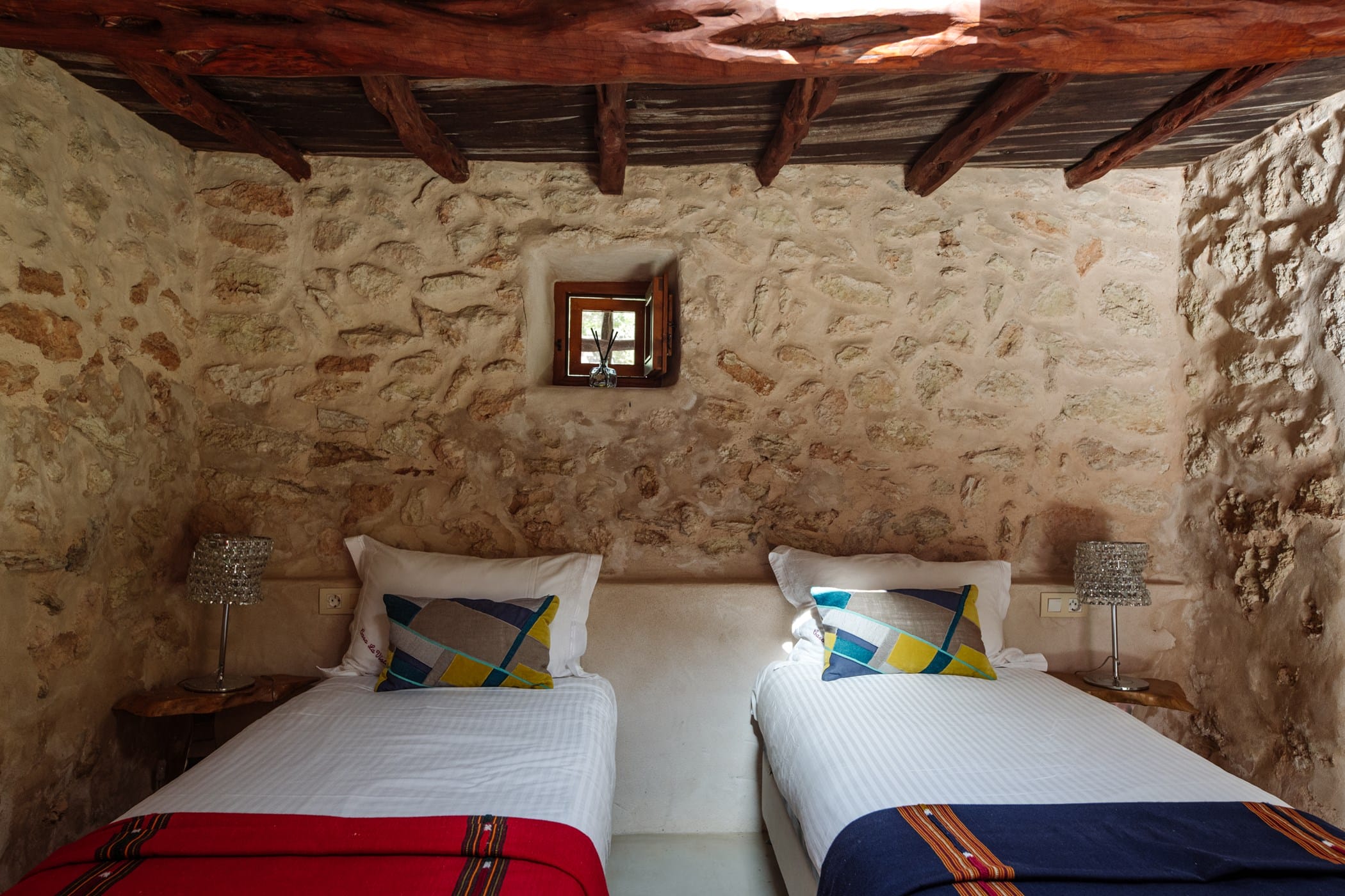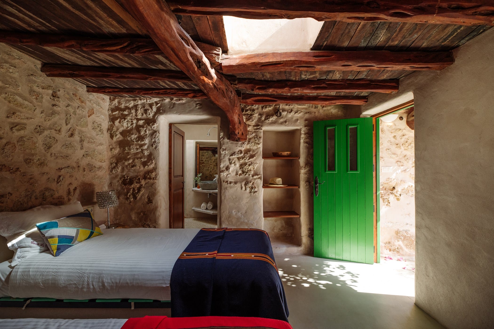 The second traditional finca house boasts original Sabina wood ceilings and contains three more bedrooms (two doubles and one twin), a second kitchen, and a cosy sitting area with fireplace.