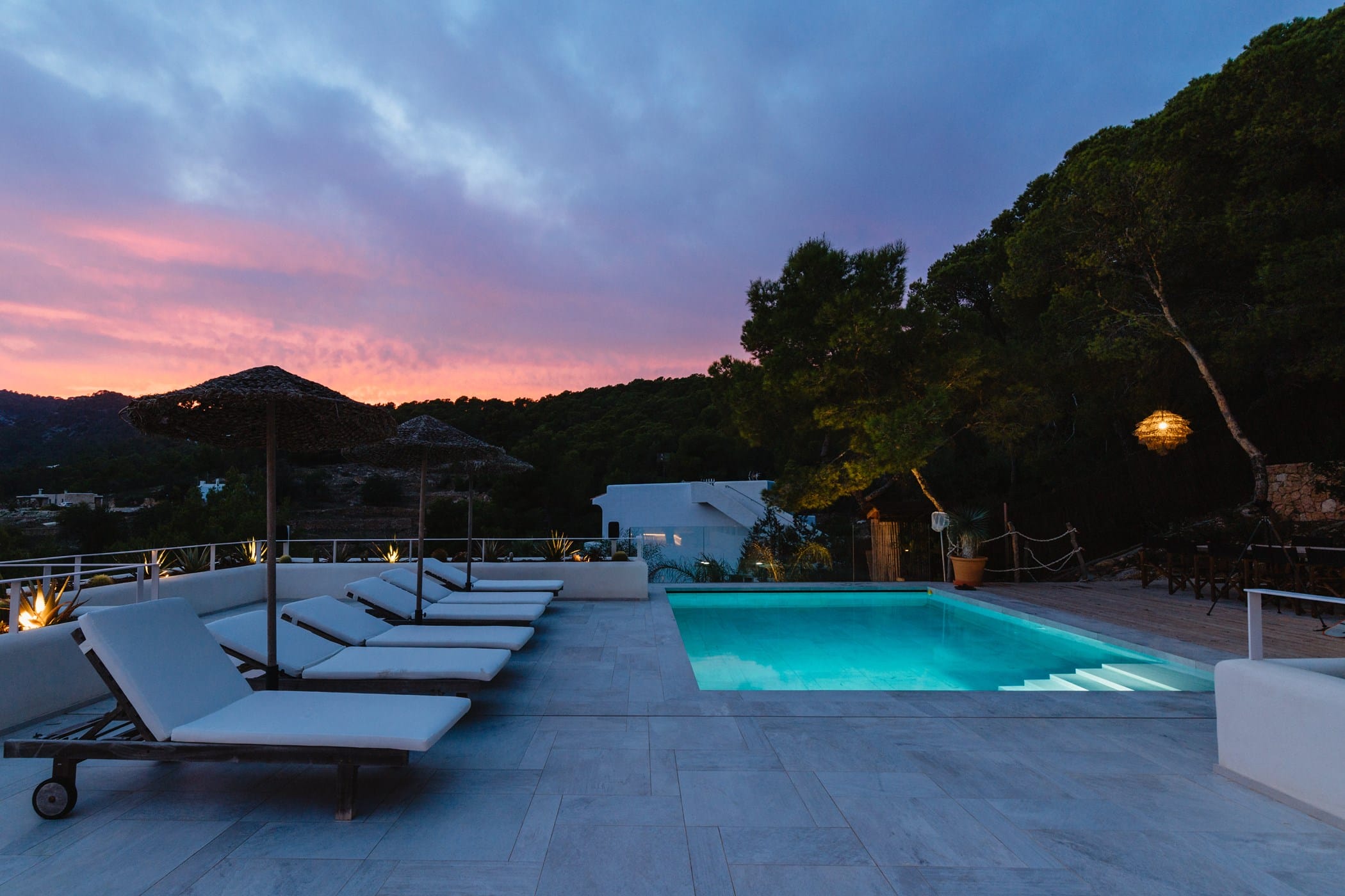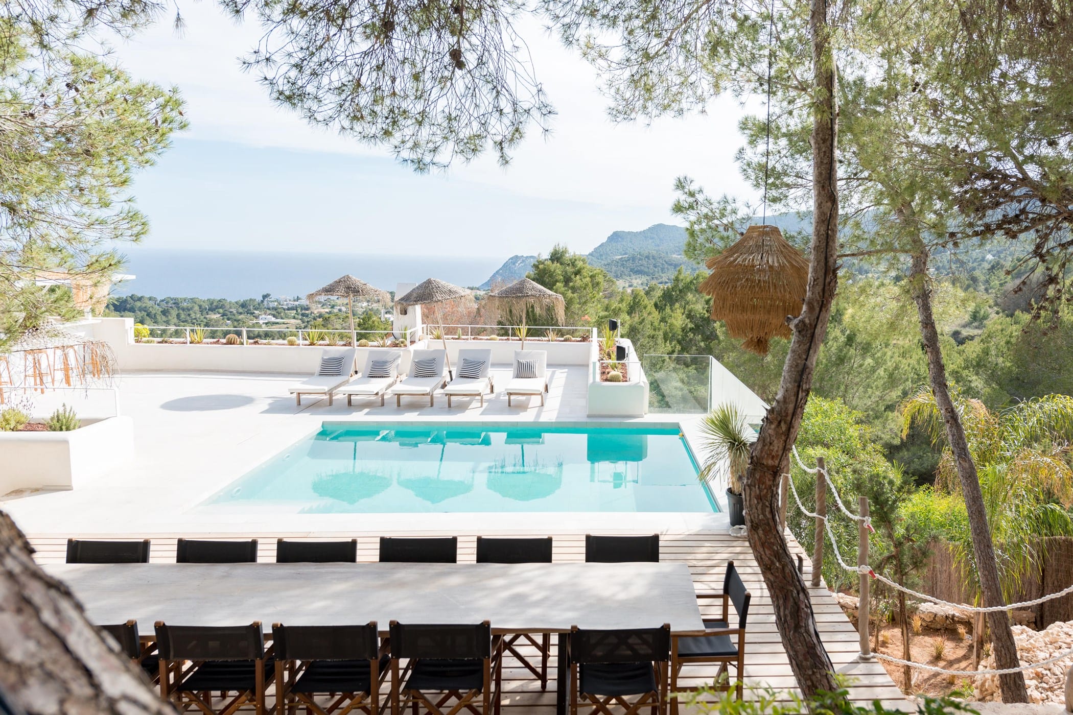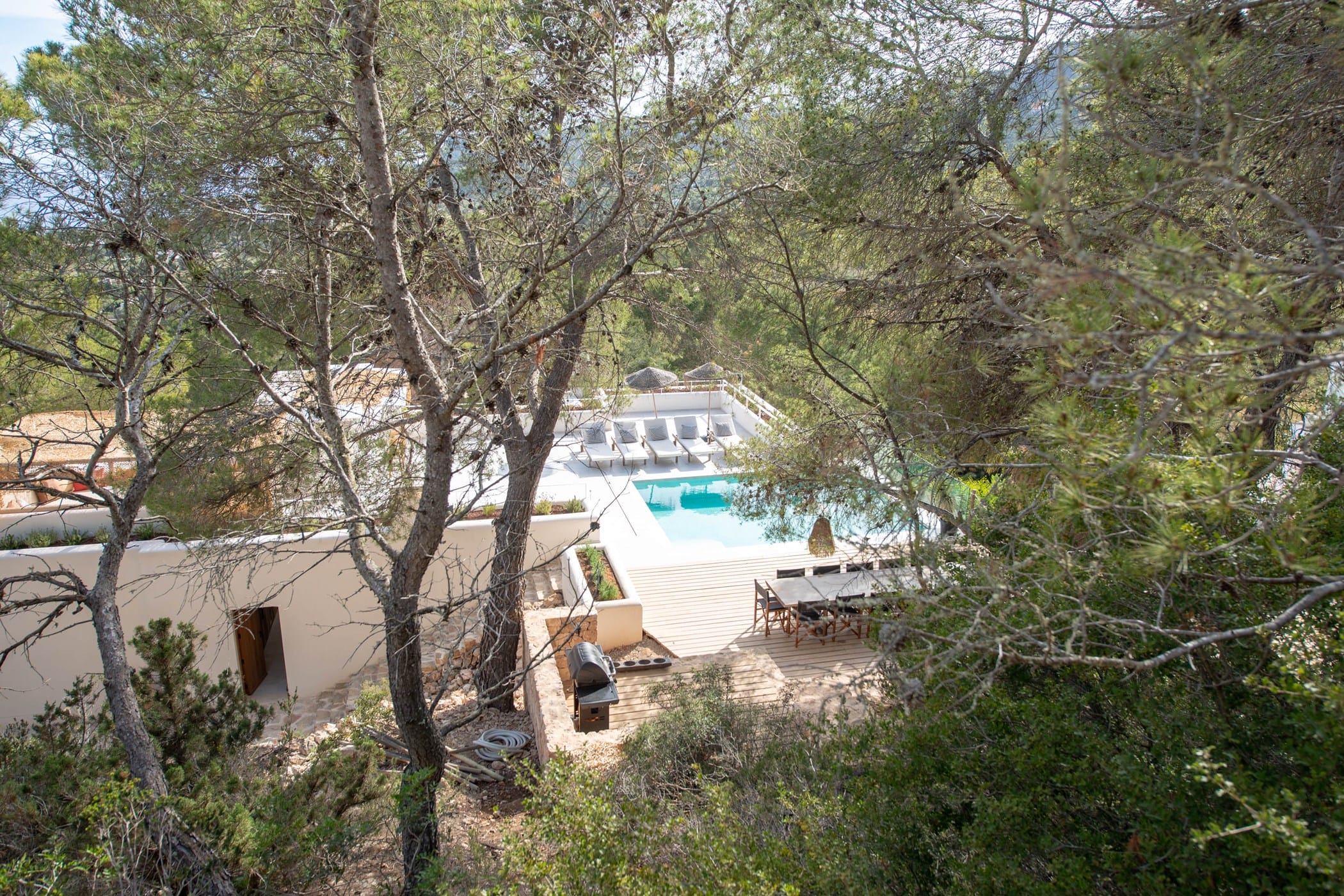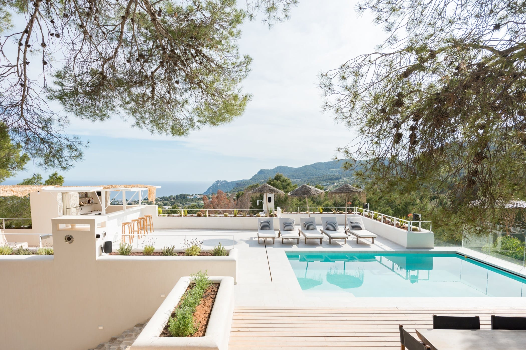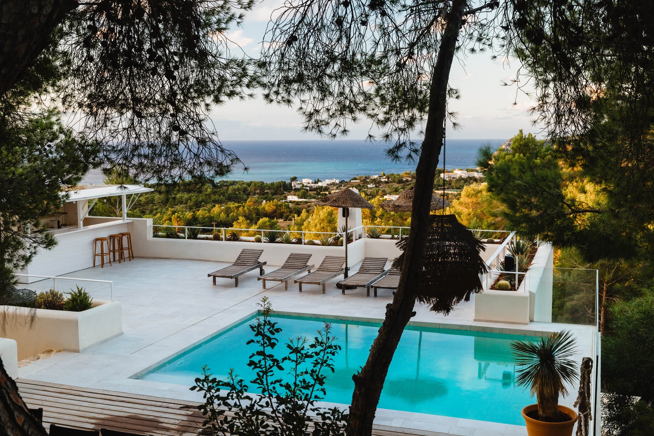 The standout rooftop features a pool with a fully stocked bar, sun loungers, and expansive sea views. Additional highlights include an outdoor gym and private yoga platform, all set within fragrant pine gardens.