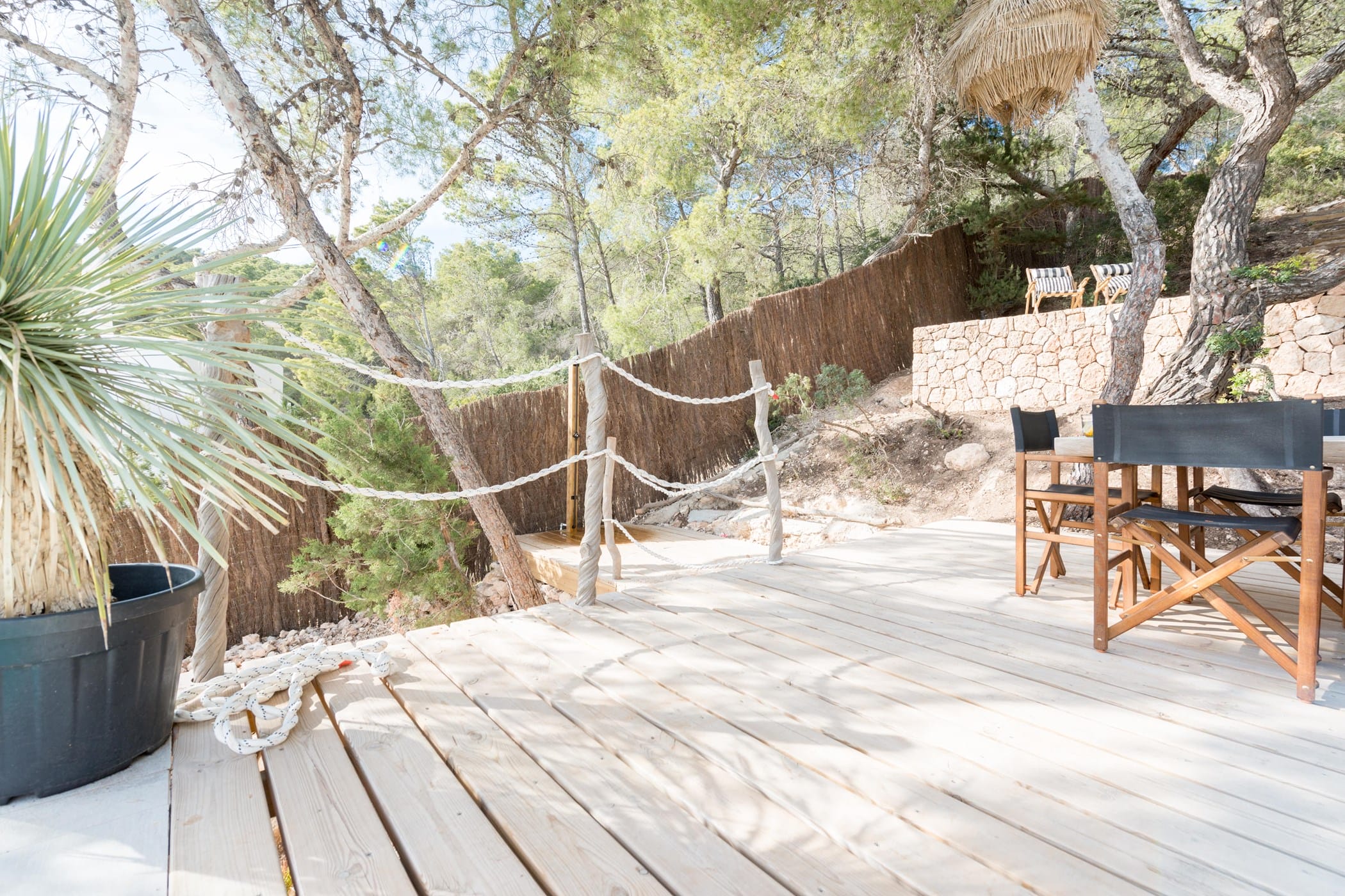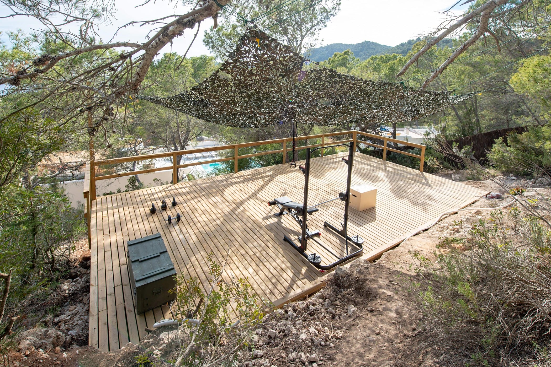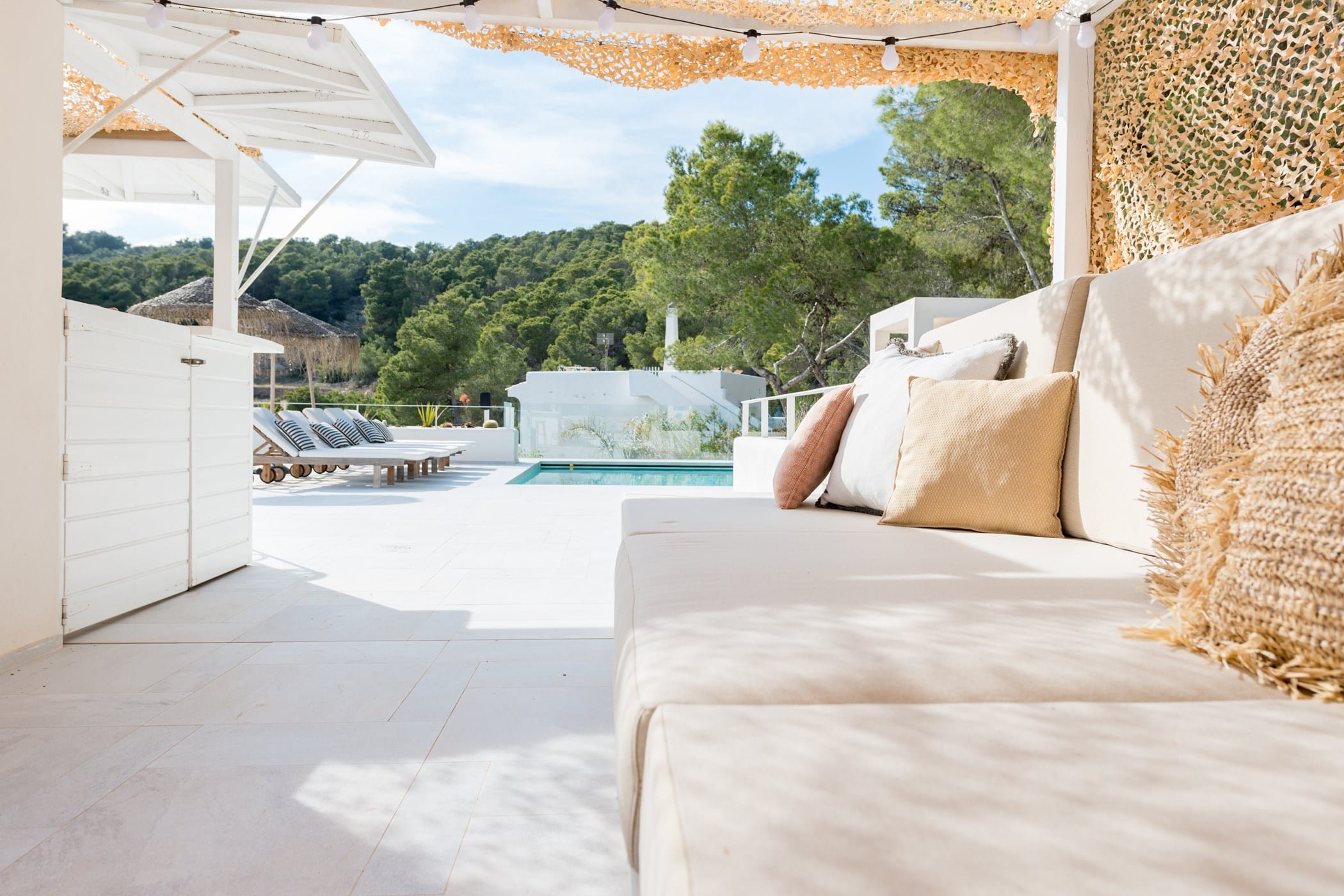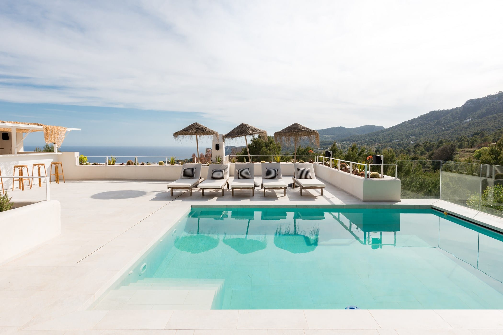 The standout rooftop features a pool with a fully stocked bar, sun loungers, and expansive sea views. Additional highlights include an outdoor gym and private yoga platform, all set within fragrant pine gardens.
