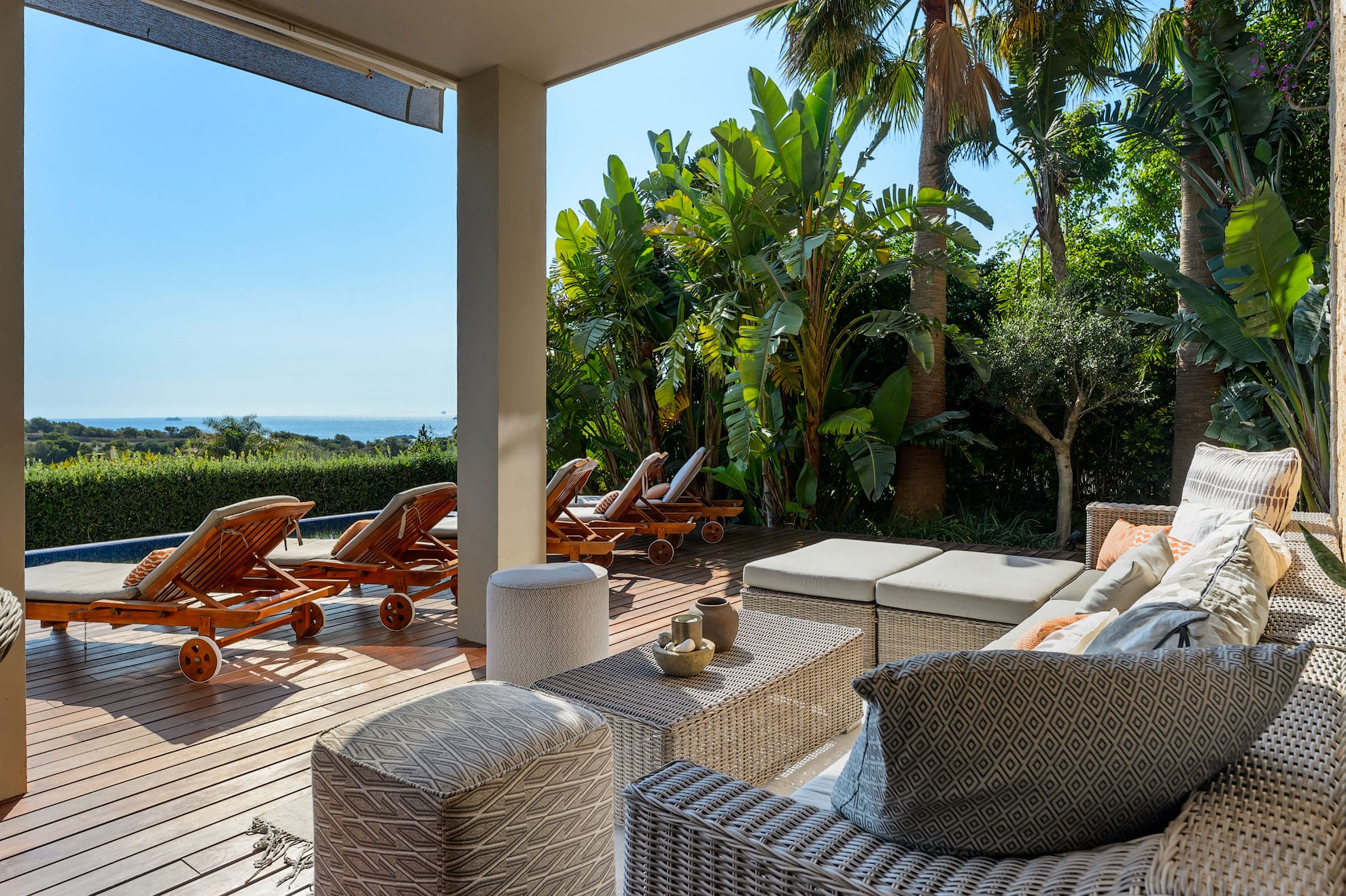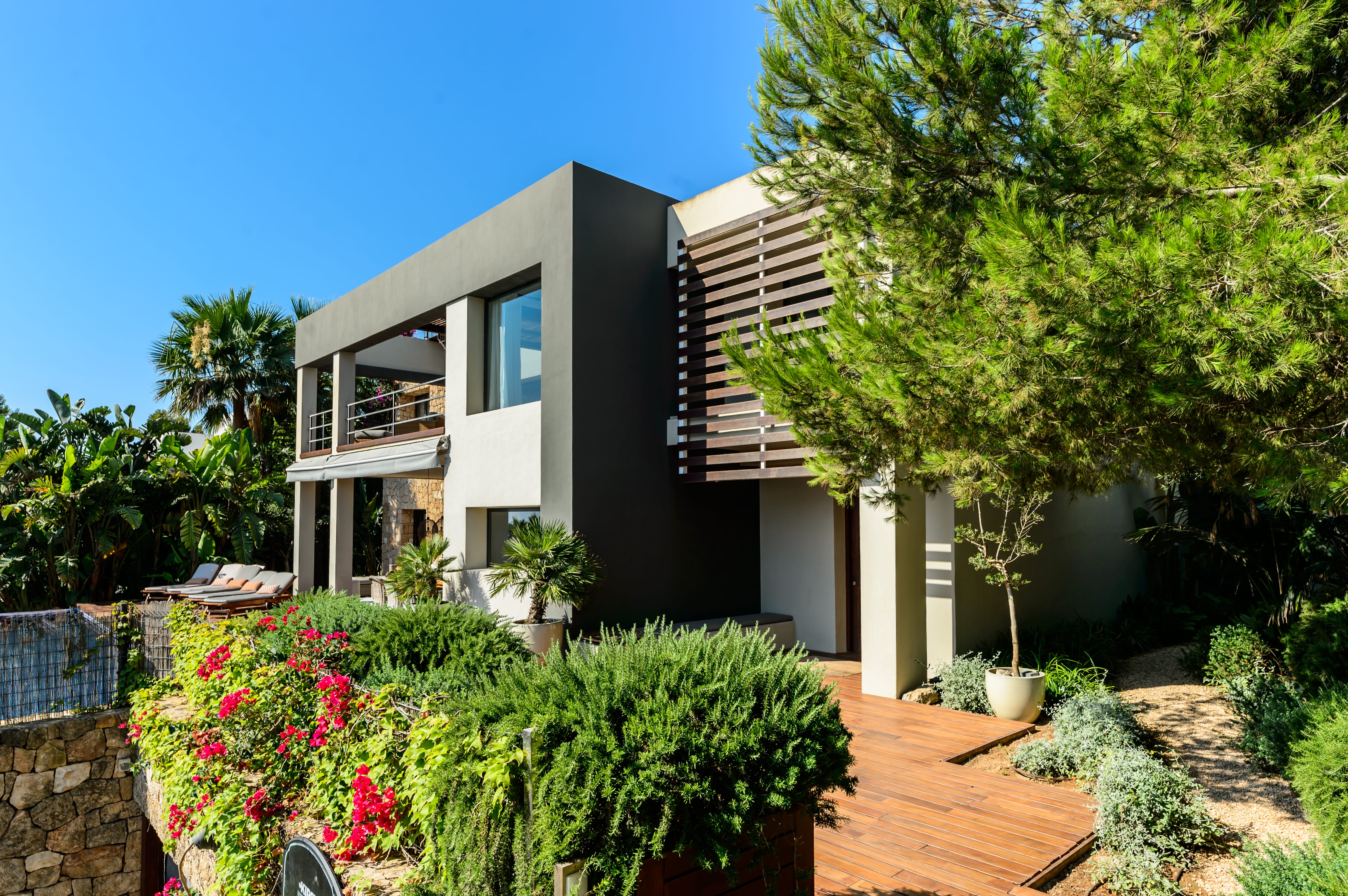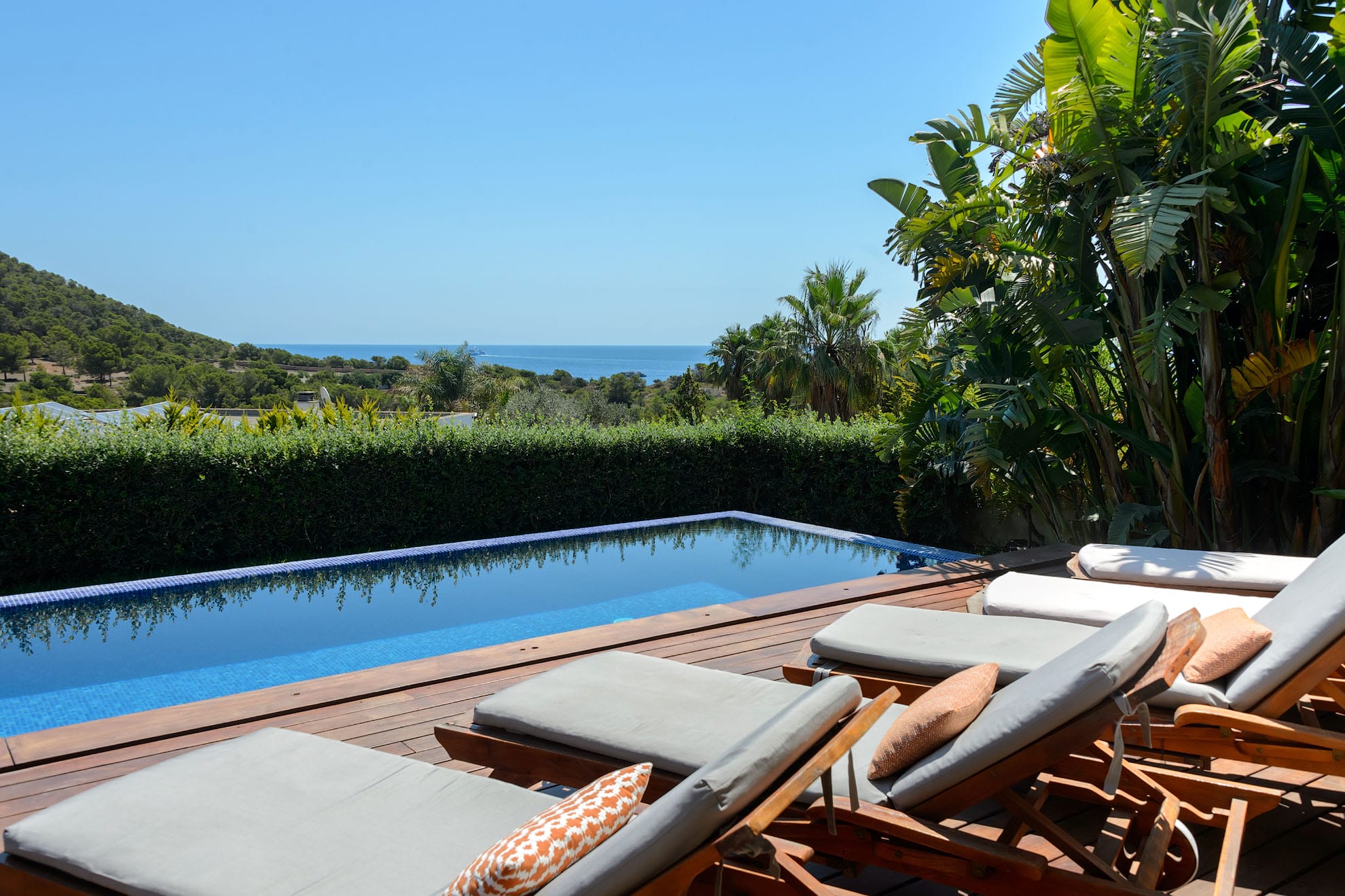 This modern luxury 6-bedroom villa is built into a hillside in the exclusive Cap Martinet area, offering sensational sea views over Ibiza’s southeast coast.