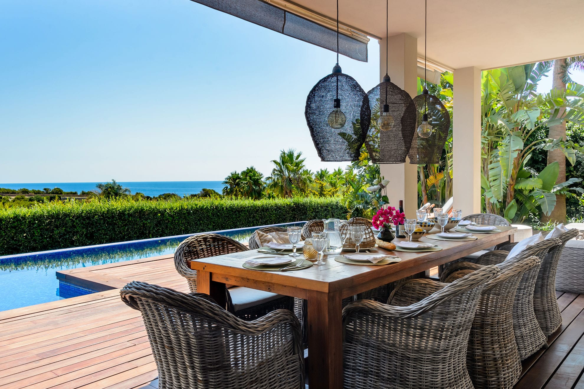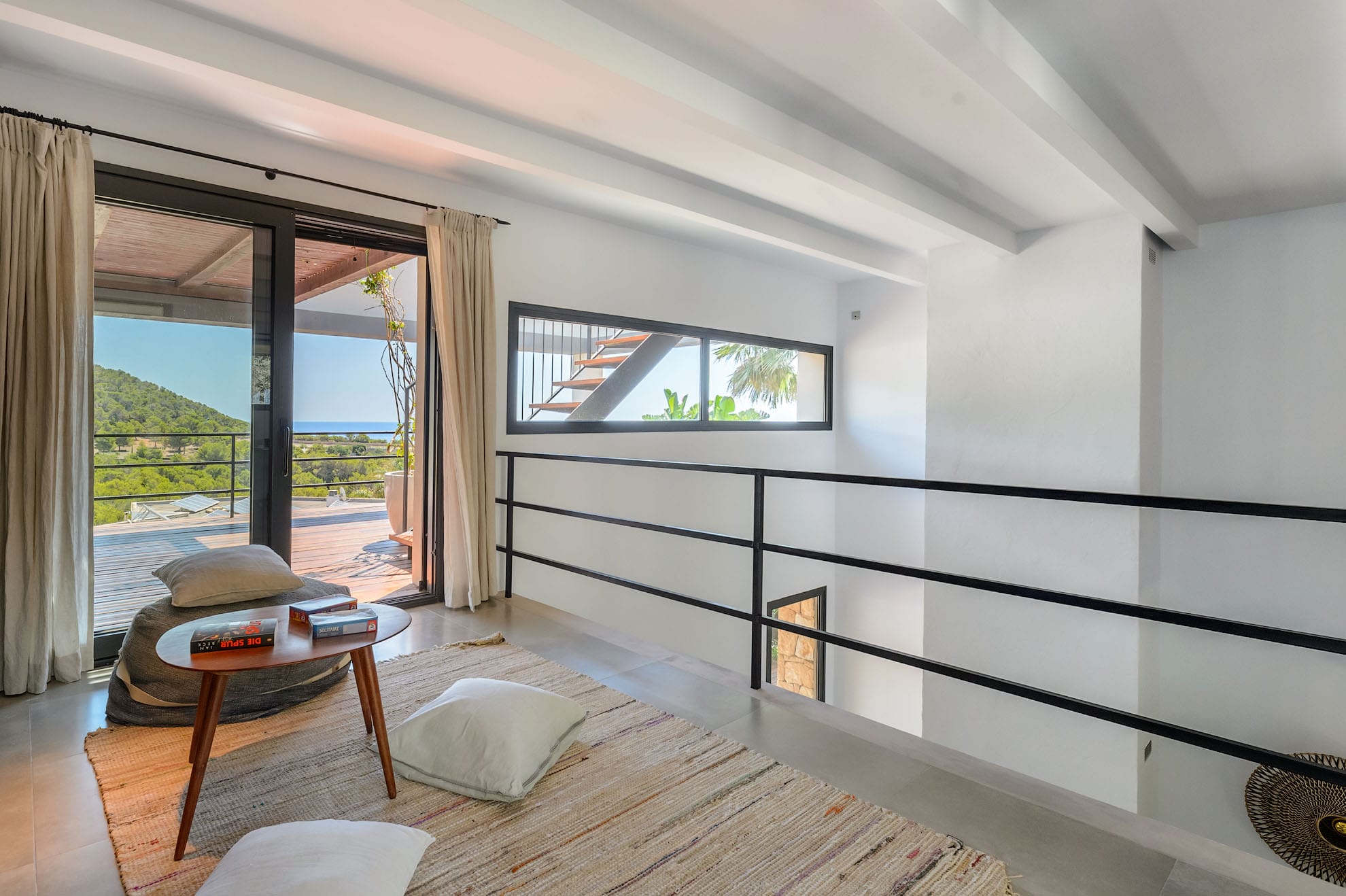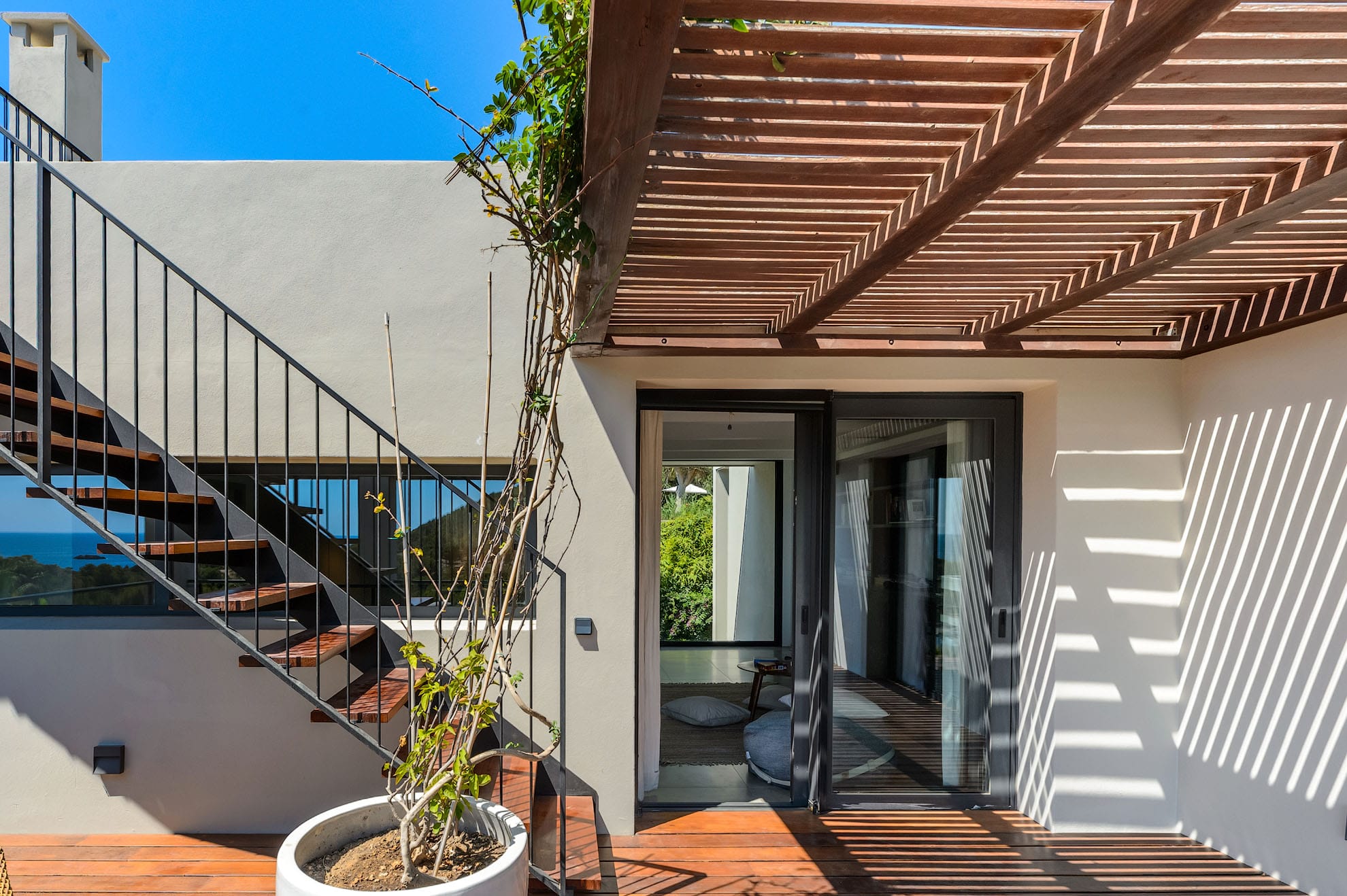 This modern luxury 6-bedroom villa is built into a hillside in the exclusive Cap Martinet area, offering sensational sea views over Ibiza’s southeast coast.