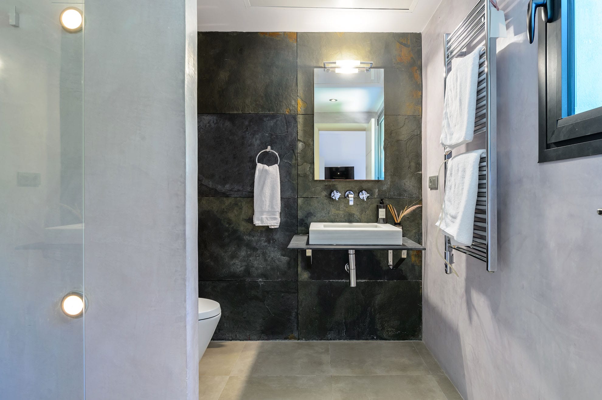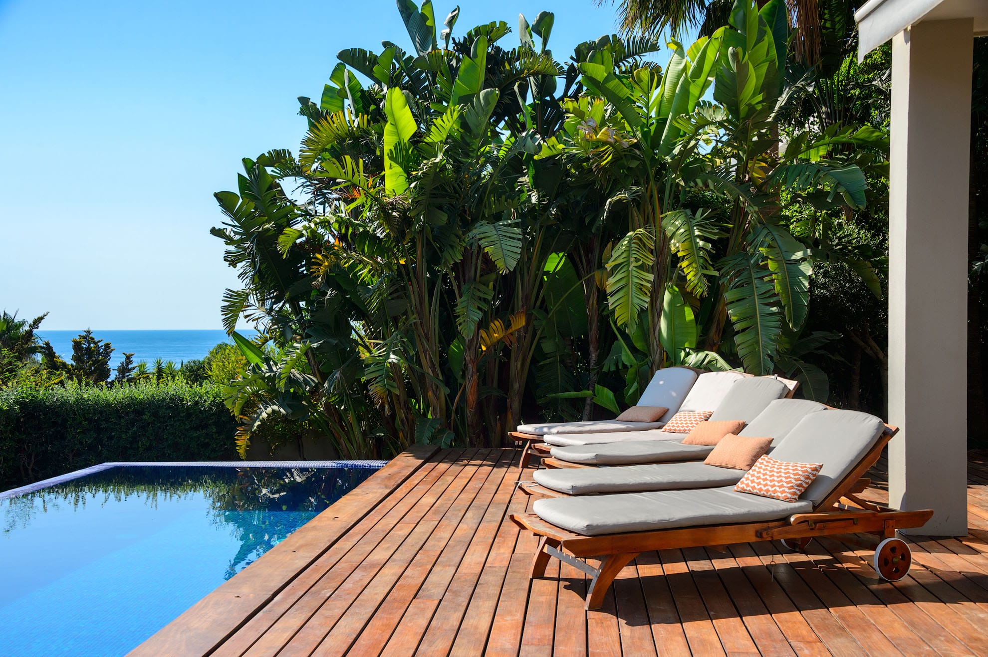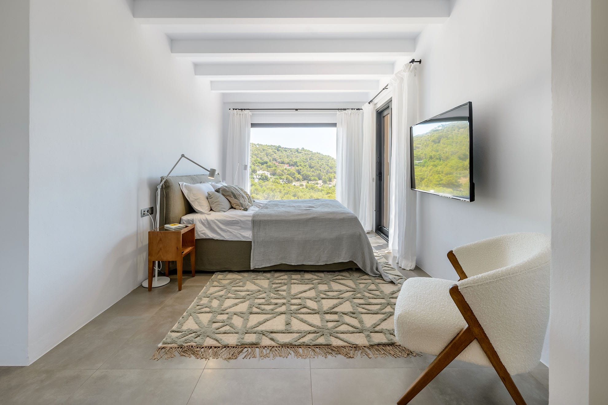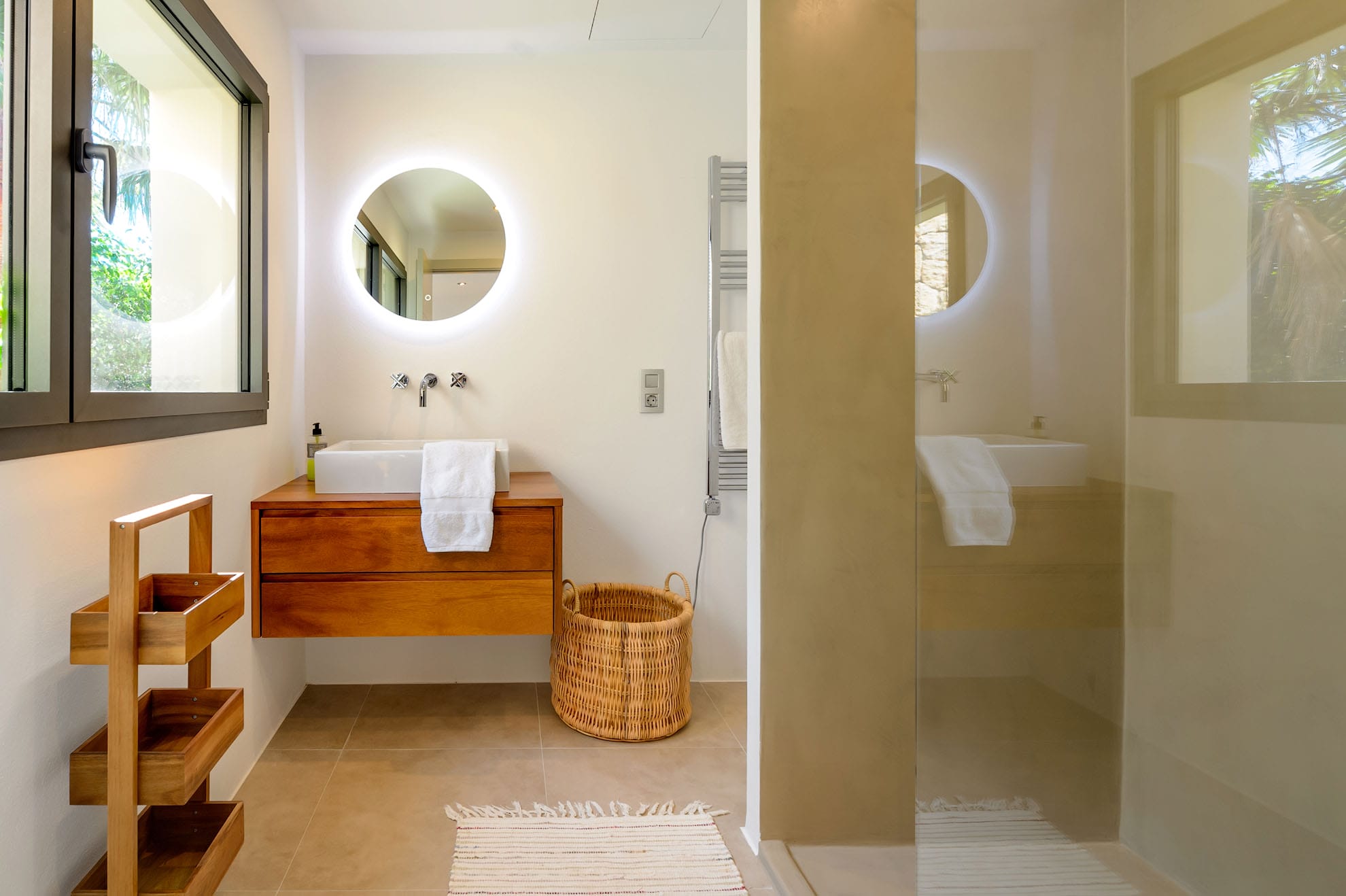 All six bedrooms feature king-size beds, en-suite bathrooms, air conditioning, mosquito nets, blackout blinds, TVs, Wi-Fi, safes, and spacious wardrobes. The interiors showcase exquisite stone floors, a refined neutral palette, and floor-to-ceiling windows that blend seamlessly with the outdoor terraces and heated saltwater pool.
