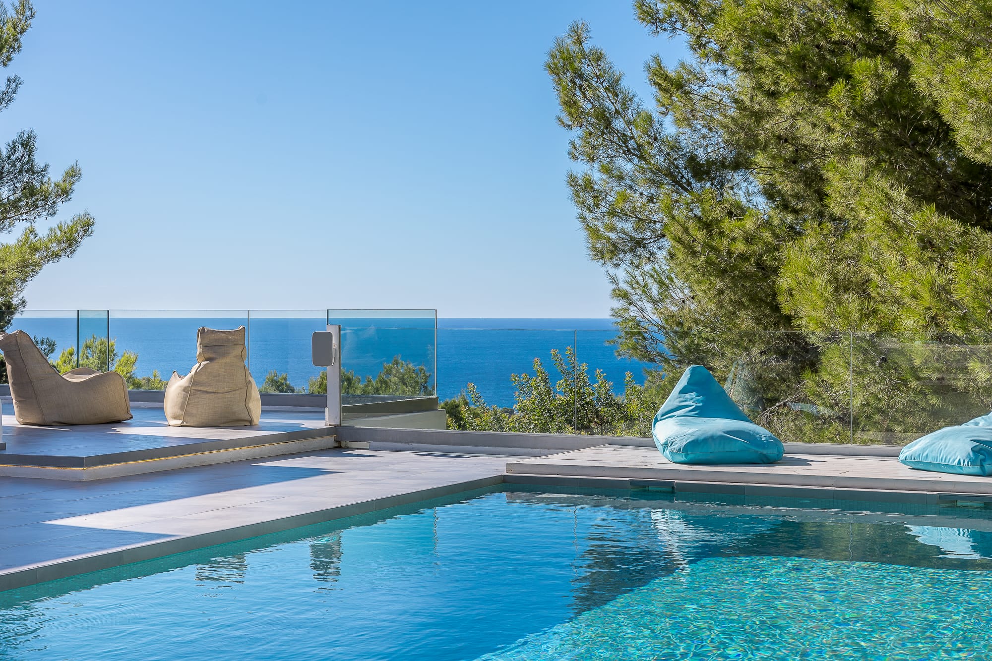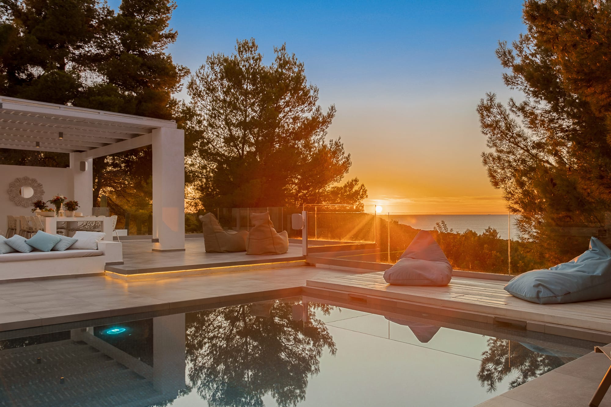 This stylish 6-bedroom villa is a true Mediterranean retreat, perfectly positioned to capture Ibiza’s legendary sunsets with breathtaking sea views from the pool, terraces, and wide windows.