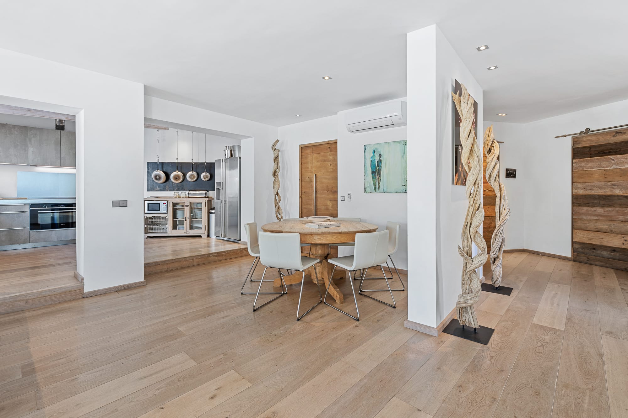 Outside: a sublime swimming pool with plush daybeds and shaded four-poster beds, al fresco dining area, illuminated rooftop terrace for sunset drinks, and a covered outdoor gym. The climatic pool can be heated or cooled (€700/week supplement).