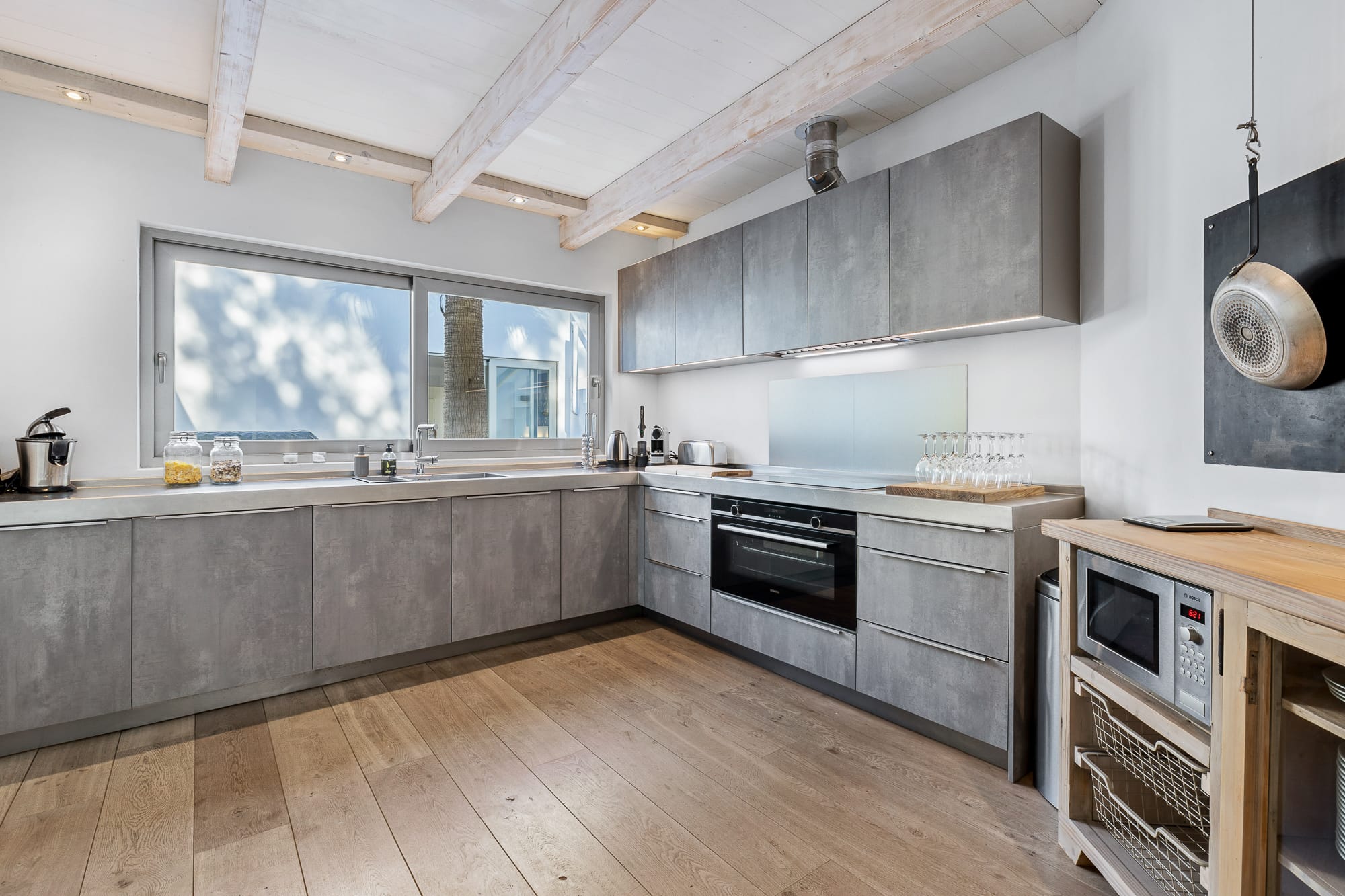 The contemporary coastal interiors feature cool tones, bleached woods, and chic furnishings. A professional kitchen flows into an open-plan dining and living area. All six bedrooms have en-suite or adjoining bathrooms, with most offering private terraces and beautiful views. Four bedrooms can be configured as twins or doubles, making it perfect for families and groups.