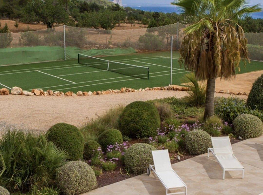 Outside: a fabulous swimming pool surrounded by luxurious sun loungers, a large outdoor dining area with BBQ, and a shaded chill-out space with beautiful sea views. A full-size tennis court is also available.