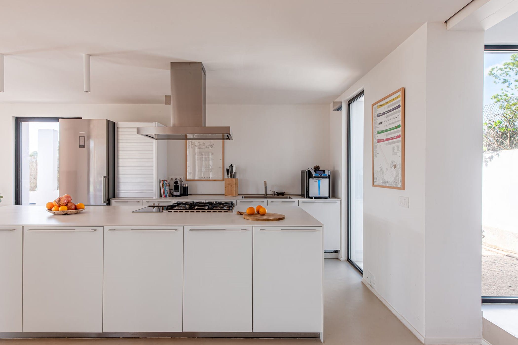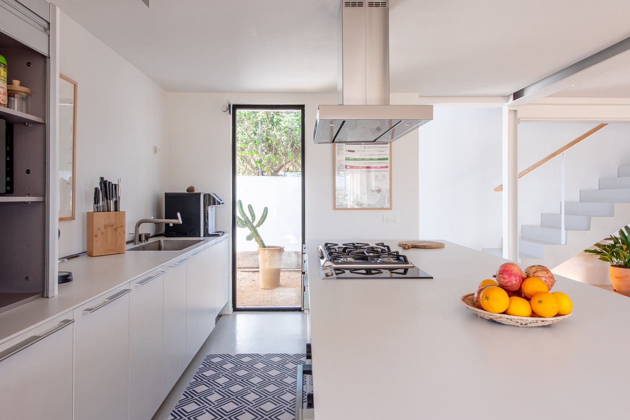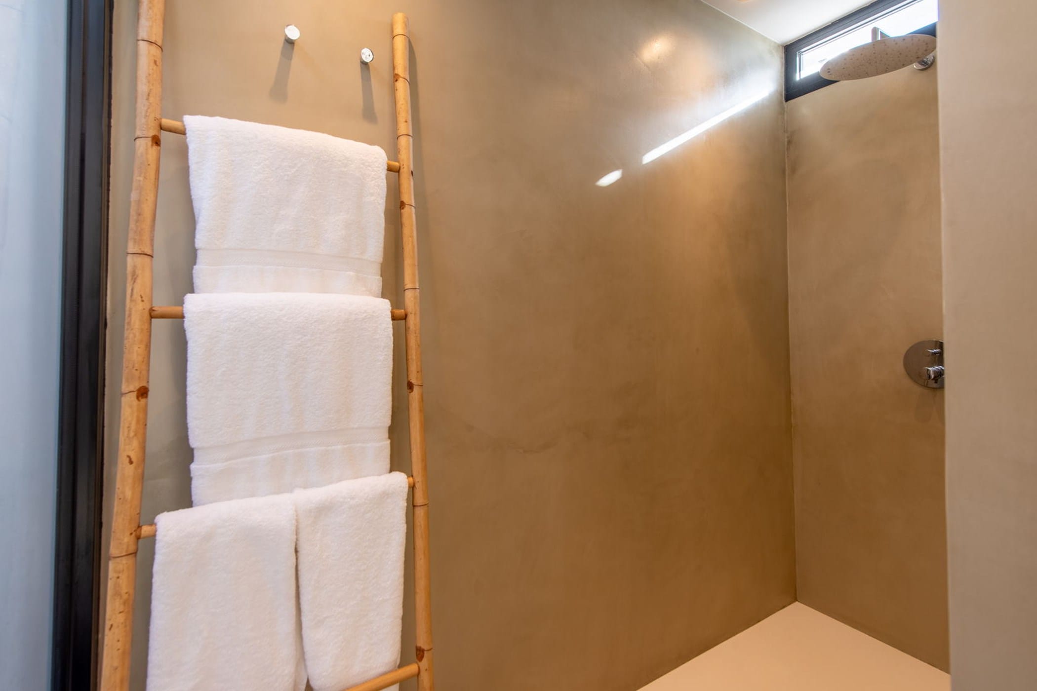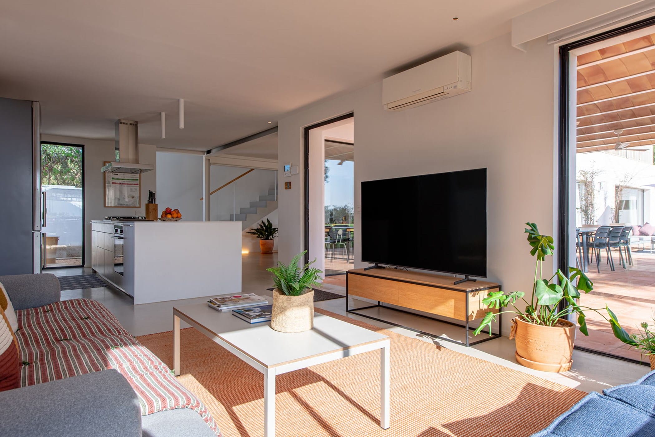 The 400m² villa spans two levels with sleek micro-cement flooring and air conditioning throughout. Ground floor: spacious open-plan living area, fully equipped kitchen, guest bathroom, twin bedroom with en-suite, and master bedroom with en-suite — both opening directly to the garden. Upper level: two additional en-suite bedrooms and a large terrace with captivating sea views.