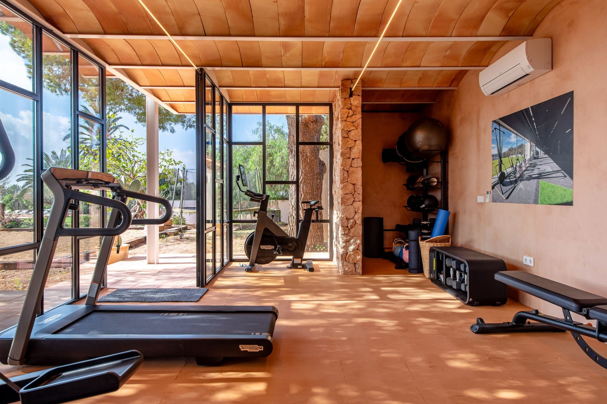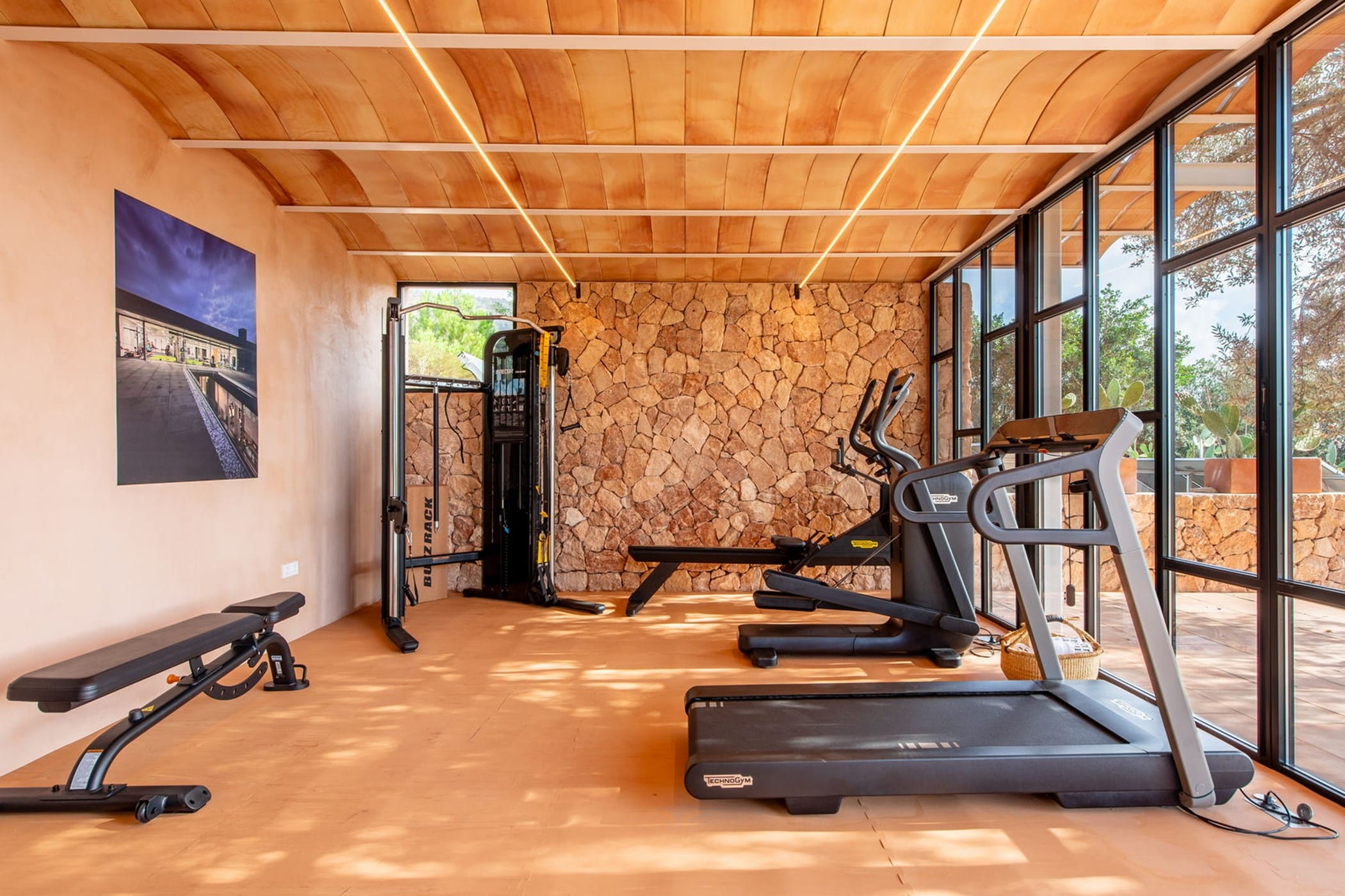 A separate stone house provides two more en-suite bedrooms with a kitchen. Highlights include a 5x12m swimming pool and a brand-new Technogym® fitness area located beneath the pool.