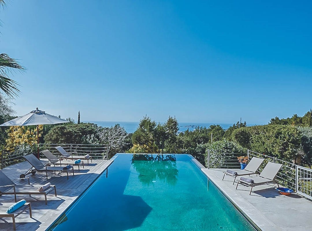 Outside, the stunning infinity pool blends with the horizon, surrounded by landscaped gardens, multiple terraces, shaded lounging areas, and a beautiful sunset-facing al-fresco dining space.