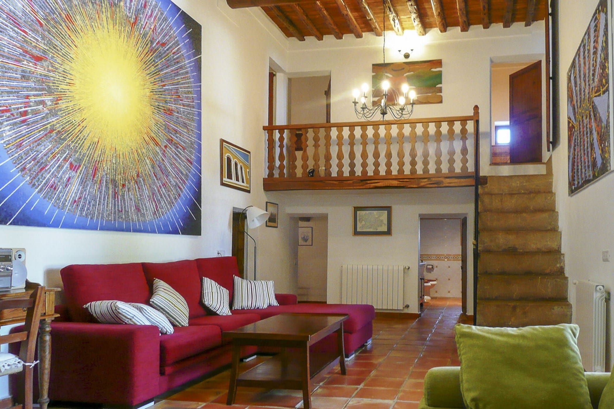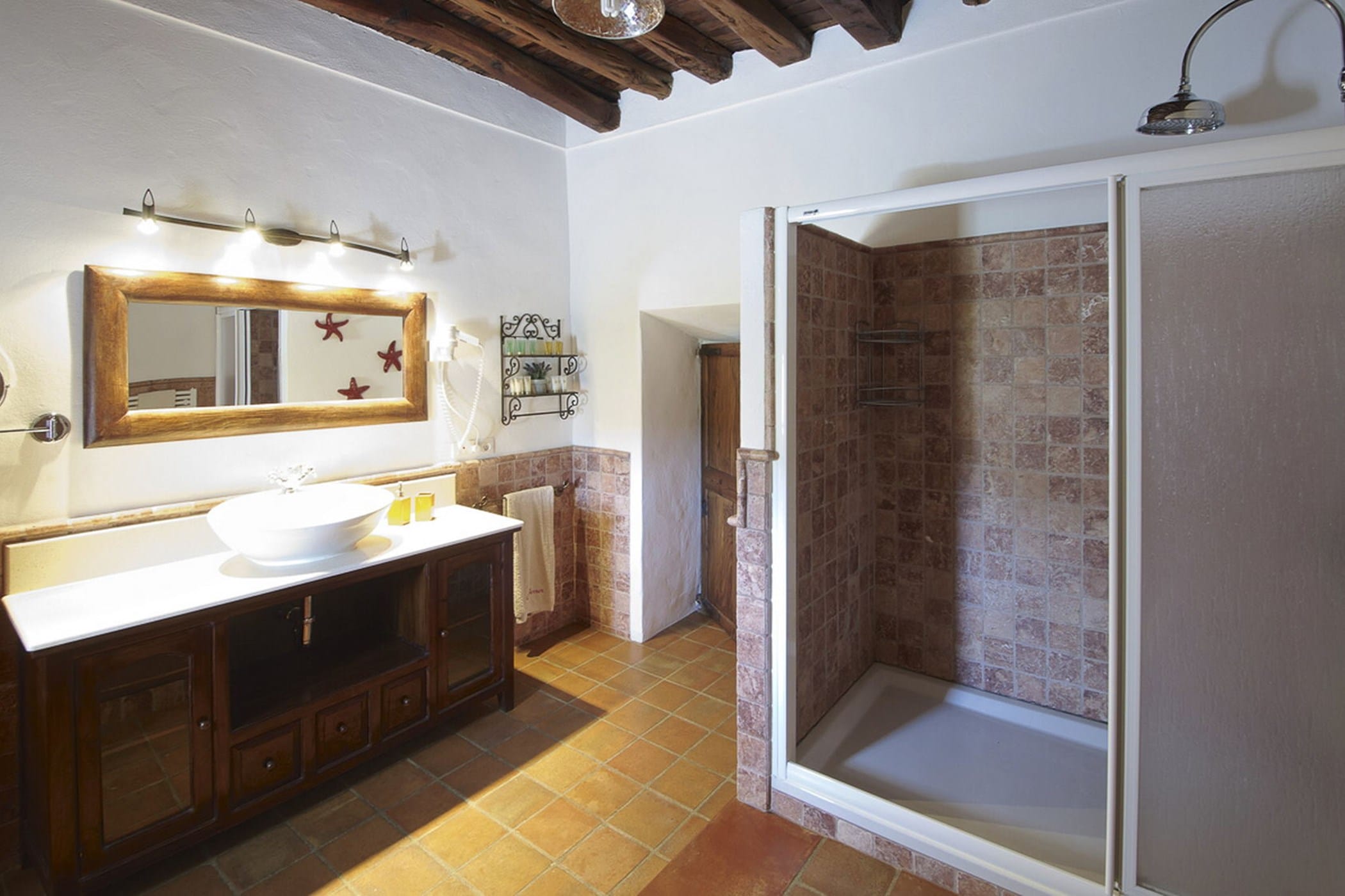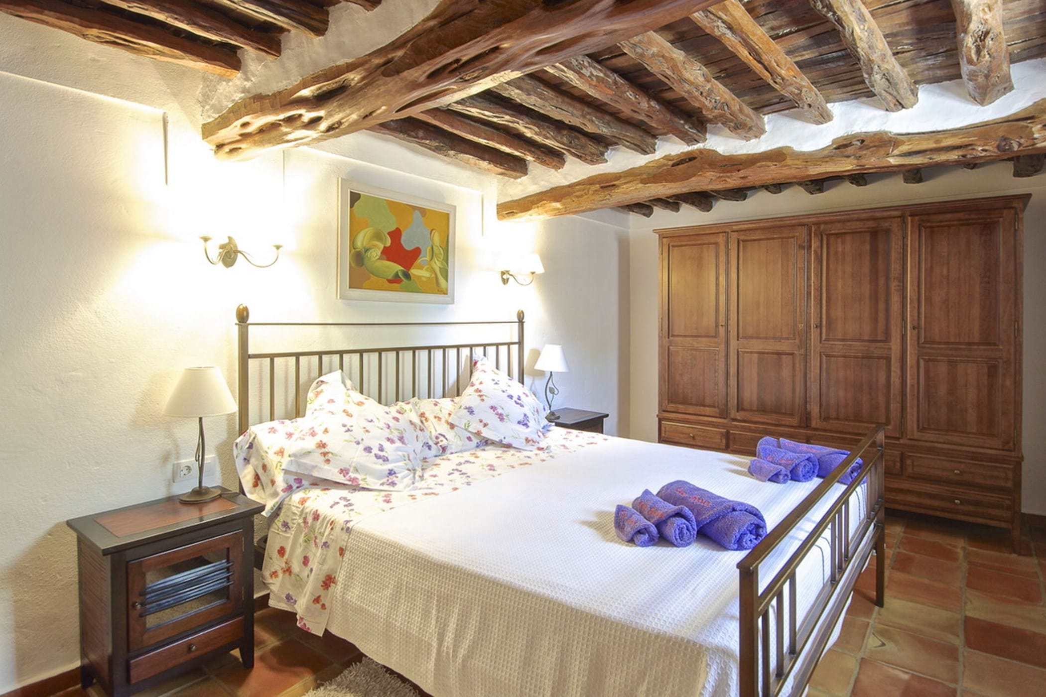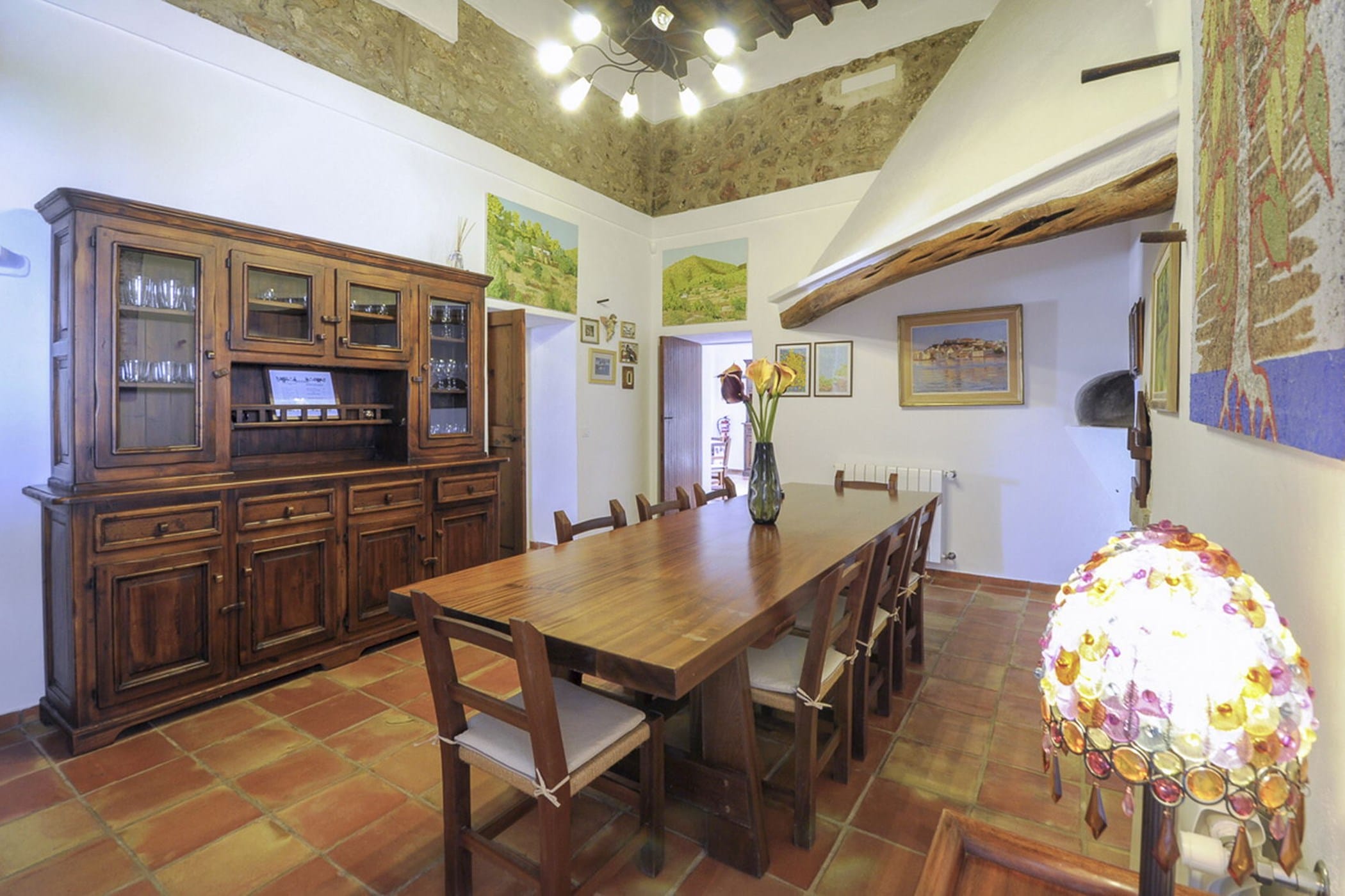 Carefully restored while preserving its original Sabina wood ceilings and thick stone walls, the villa blends authentic character with modern comfort. It features six double bedrooms (three with 180x200cm beds, one with 150x190cm, and two with twin 90x200cm beds) and four bathrooms (one with a whirlpool tub and one by the pool).