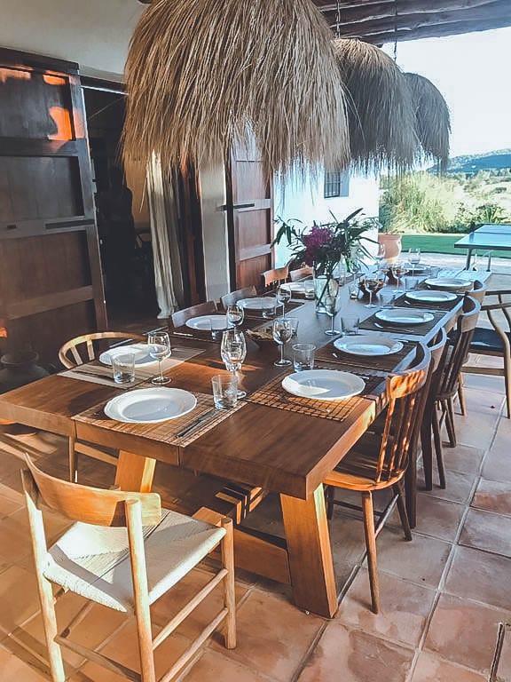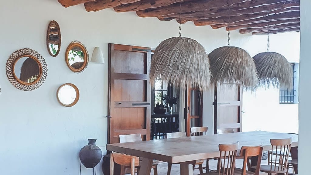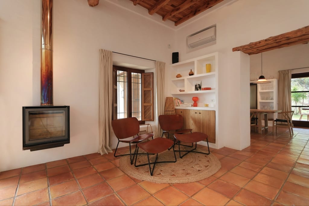 The bright interiors feature ethnic-inspired decor, natural light, and a cozy yet stylish living area. It includes two kitchens (one fully outdoor), multiple dining spaces, and a stunning wooden table under the open sky with a professional BBQ — ideal for al fresco meals.