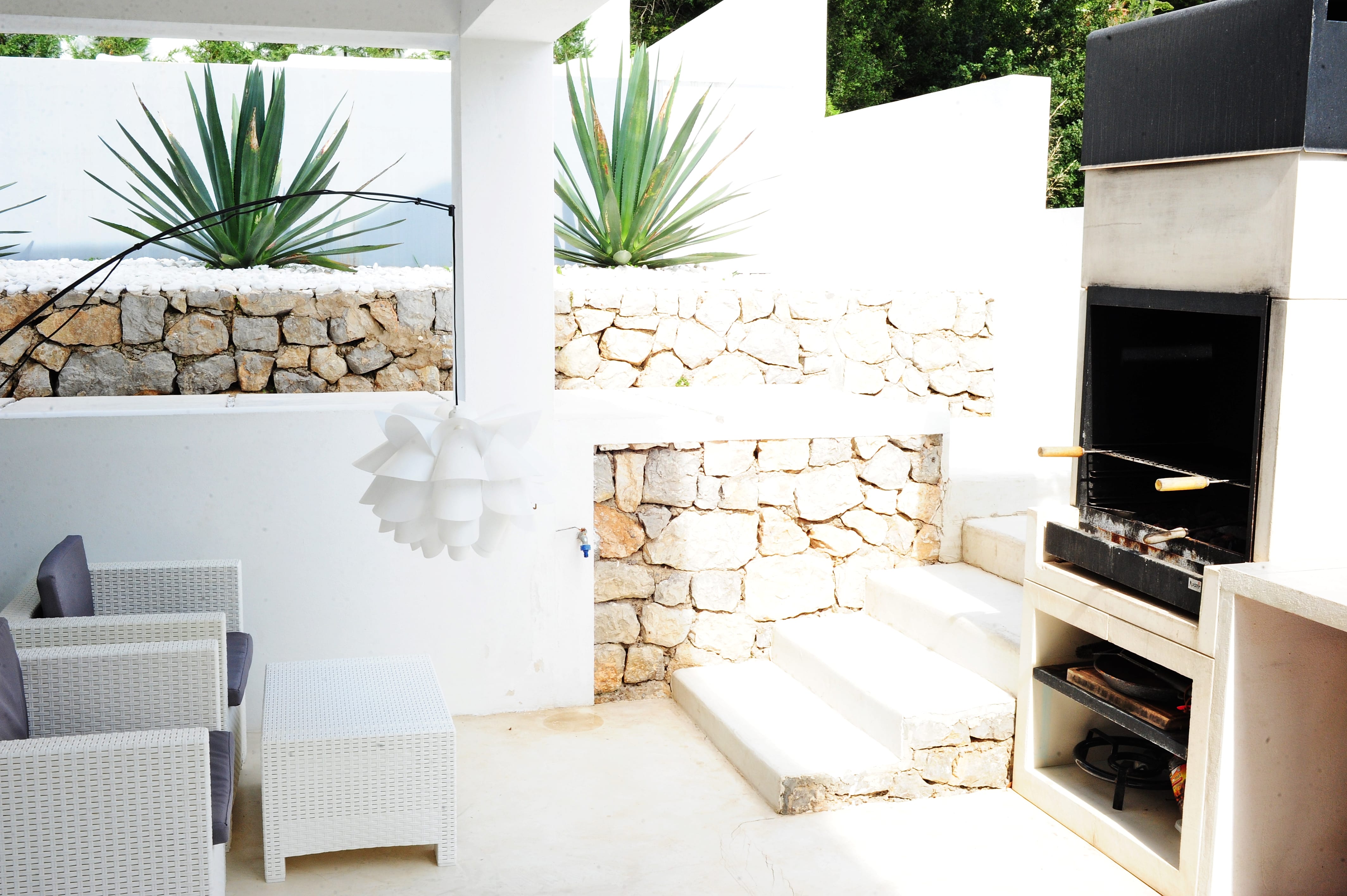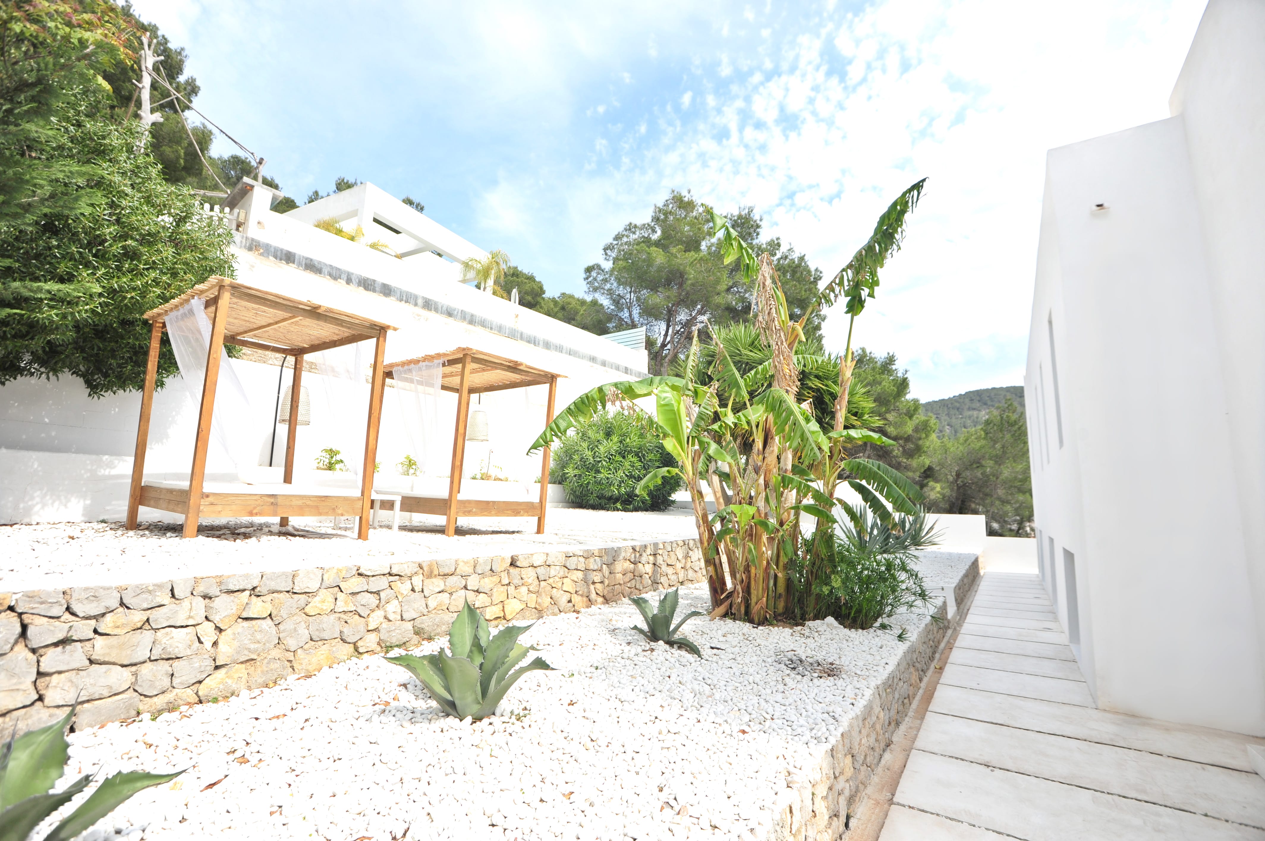 The outdoor area is equally impressive, featuring a main terrace with a dining table and barbecue, a chill-out zone with Balinese-style beds, and a lush tropical garden. A standout feature is the long jacuzzi, perfect for cooling off in summer or relaxing during cooler evenings, making it ideal for stargazing in total tranquility. Located near Cala Llonga, the villa is close to amenities and within walking distance of a family-friendly beach, offering both convenience and peaceful luxury.