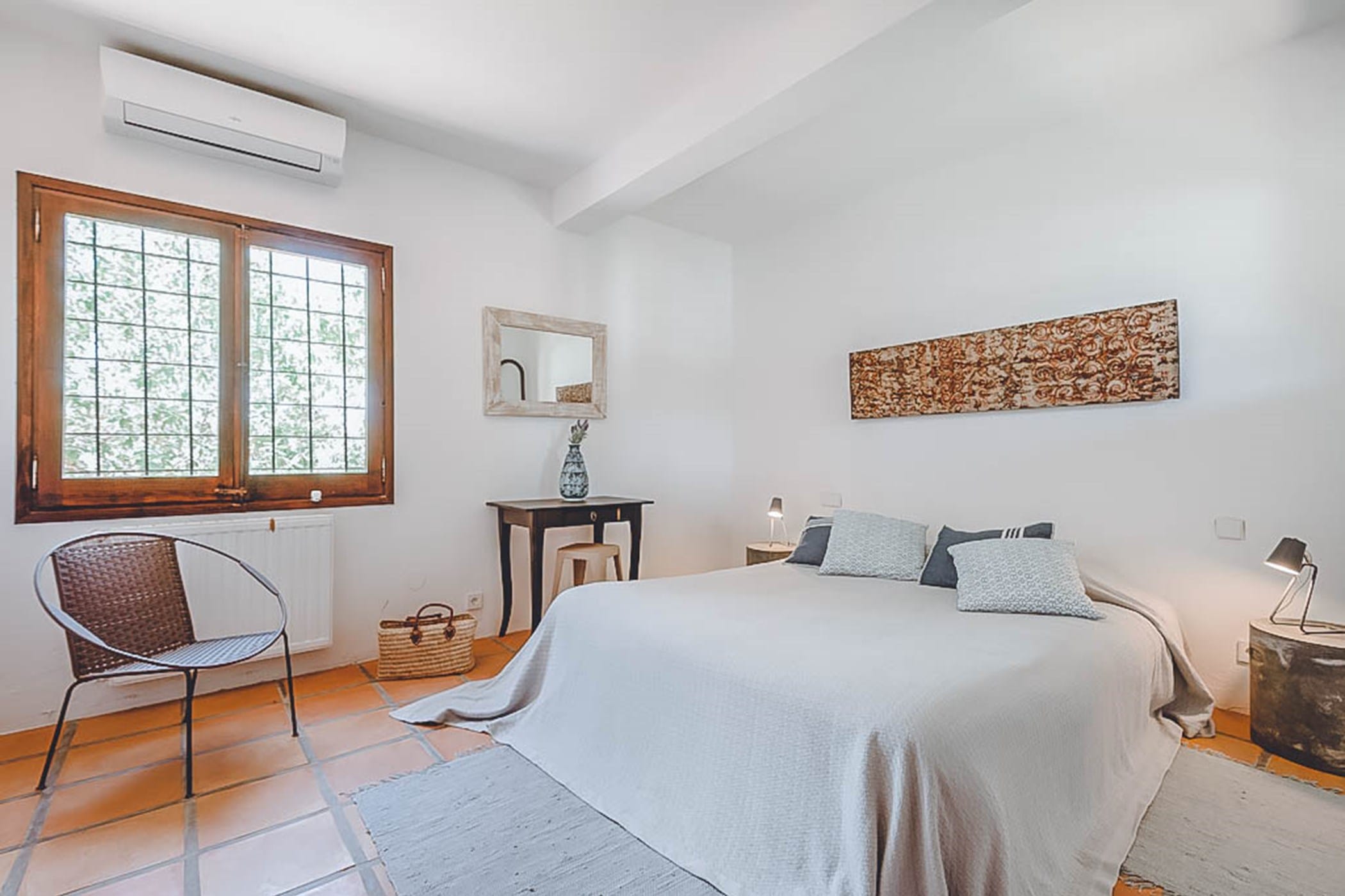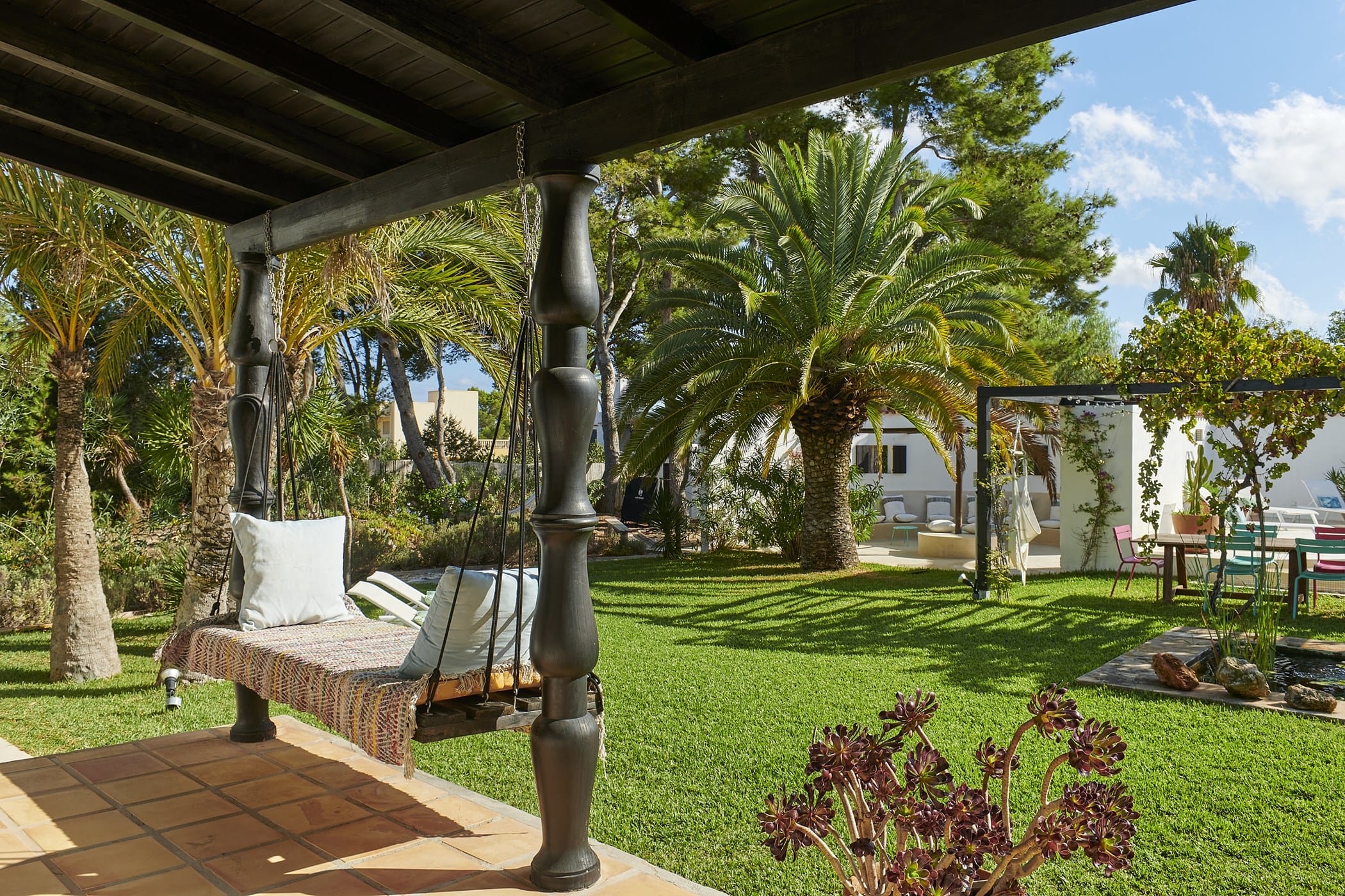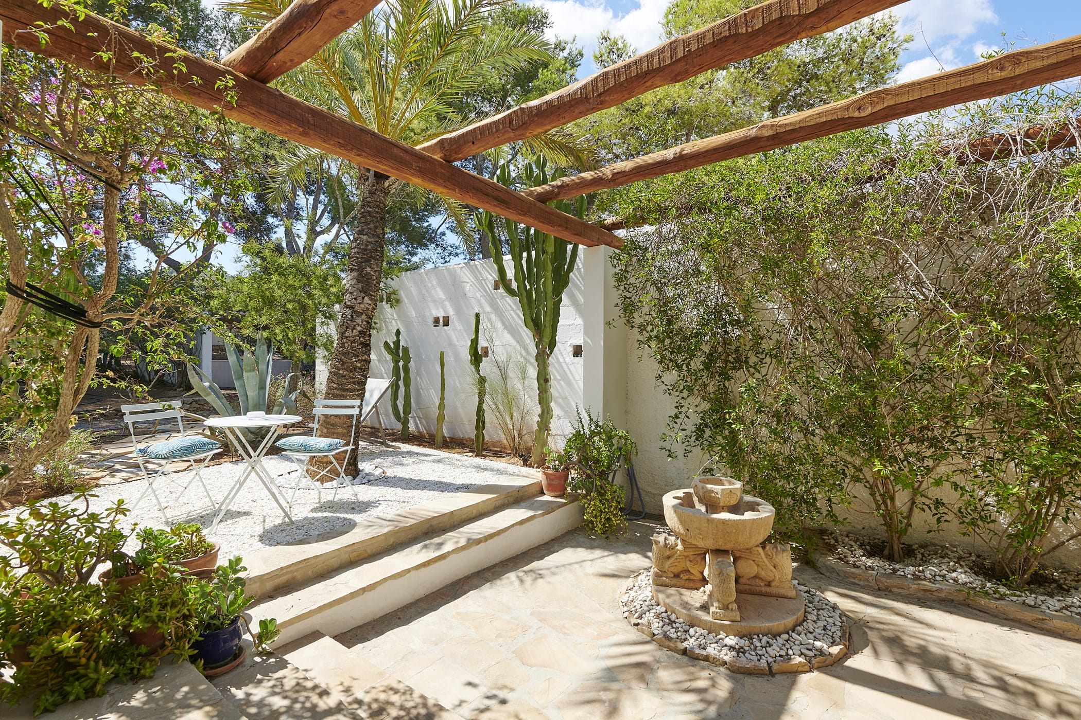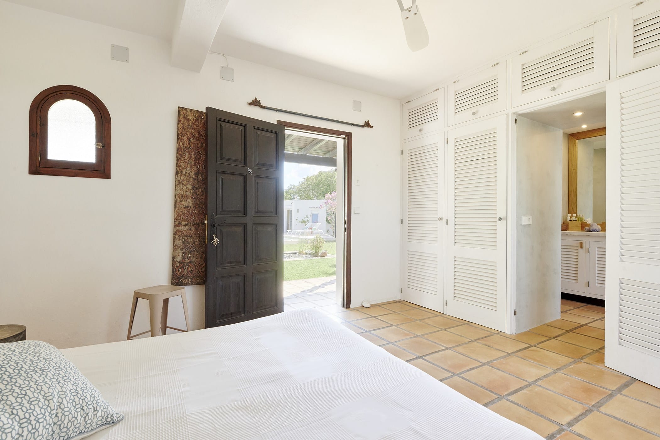 The property includes a master bedroom with a private terrace, while the remaining guest bedrooms are set apart with independent entrances, offering added privacy. Outdoors, guests can unwind in a serene environment designed for relaxation year-round, with comfortable amenities and a warm, welcoming atmosphere that captures the essence of Ibiza living.