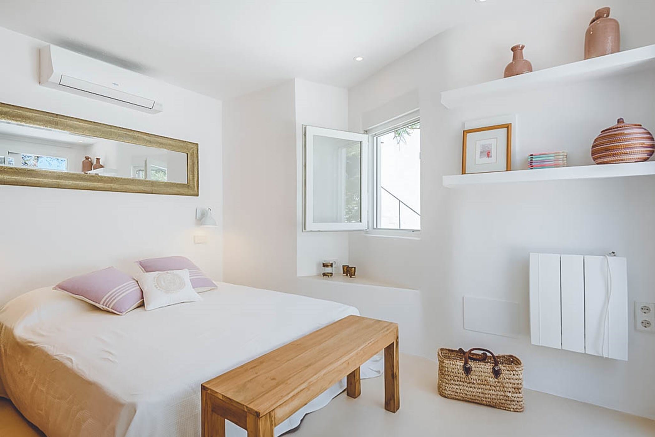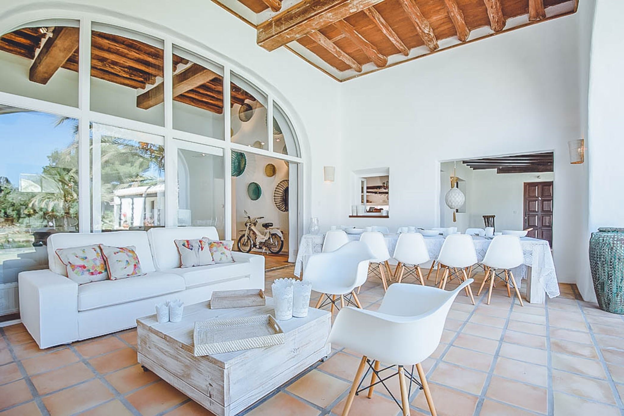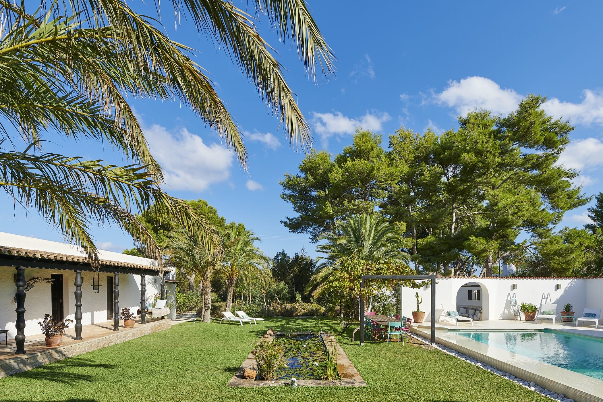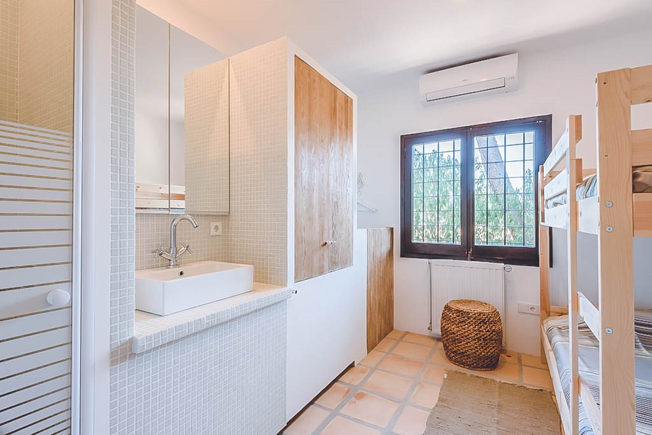 The property includes a master bedroom with a private terrace, while the remaining guest bedrooms are set apart with independent entrances, offering added privacy. Outdoors, guests can unwind in a serene environment designed for relaxation year-round, with comfortable amenities and a warm, welcoming atmosphere that captures the essence of Ibiza living.
