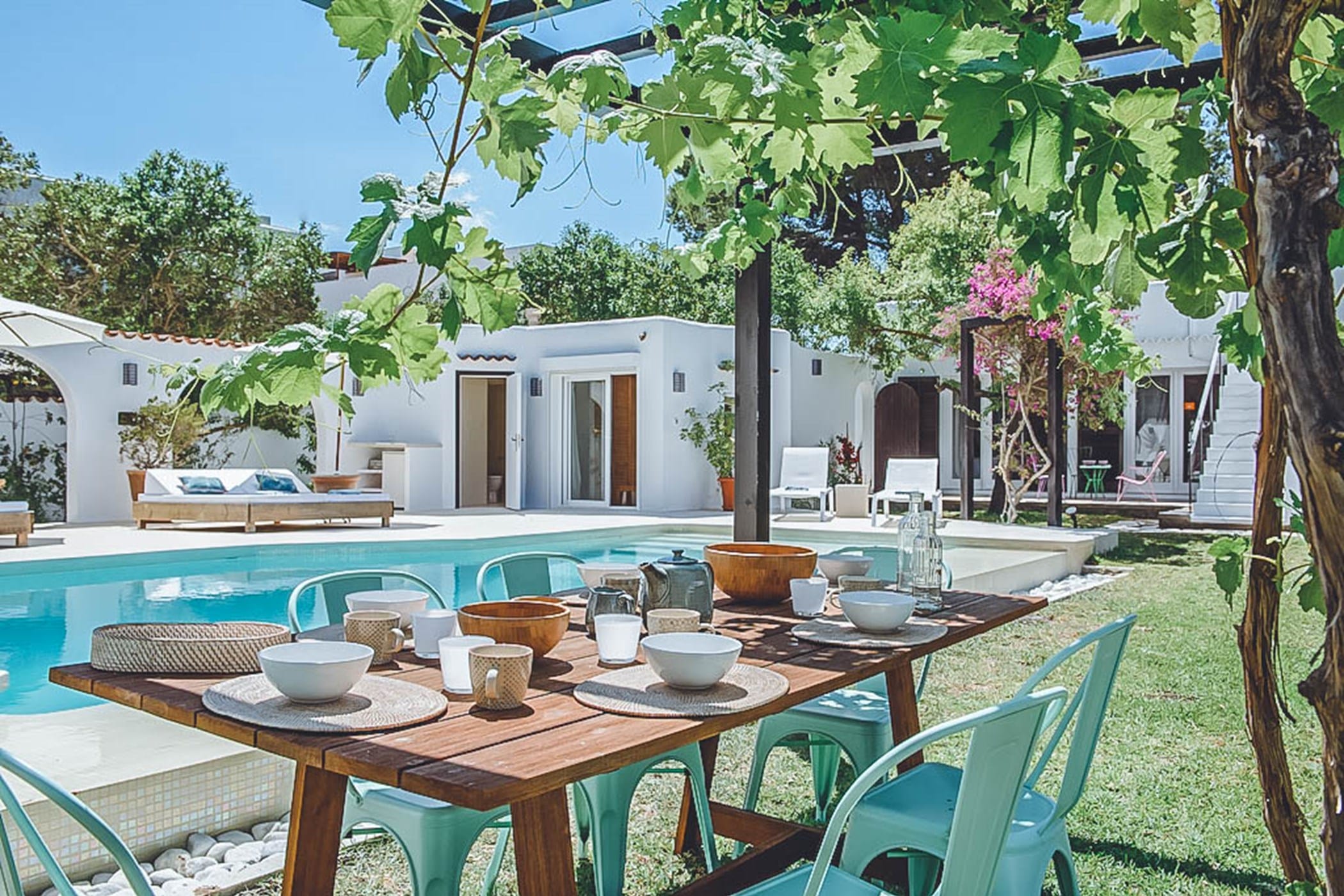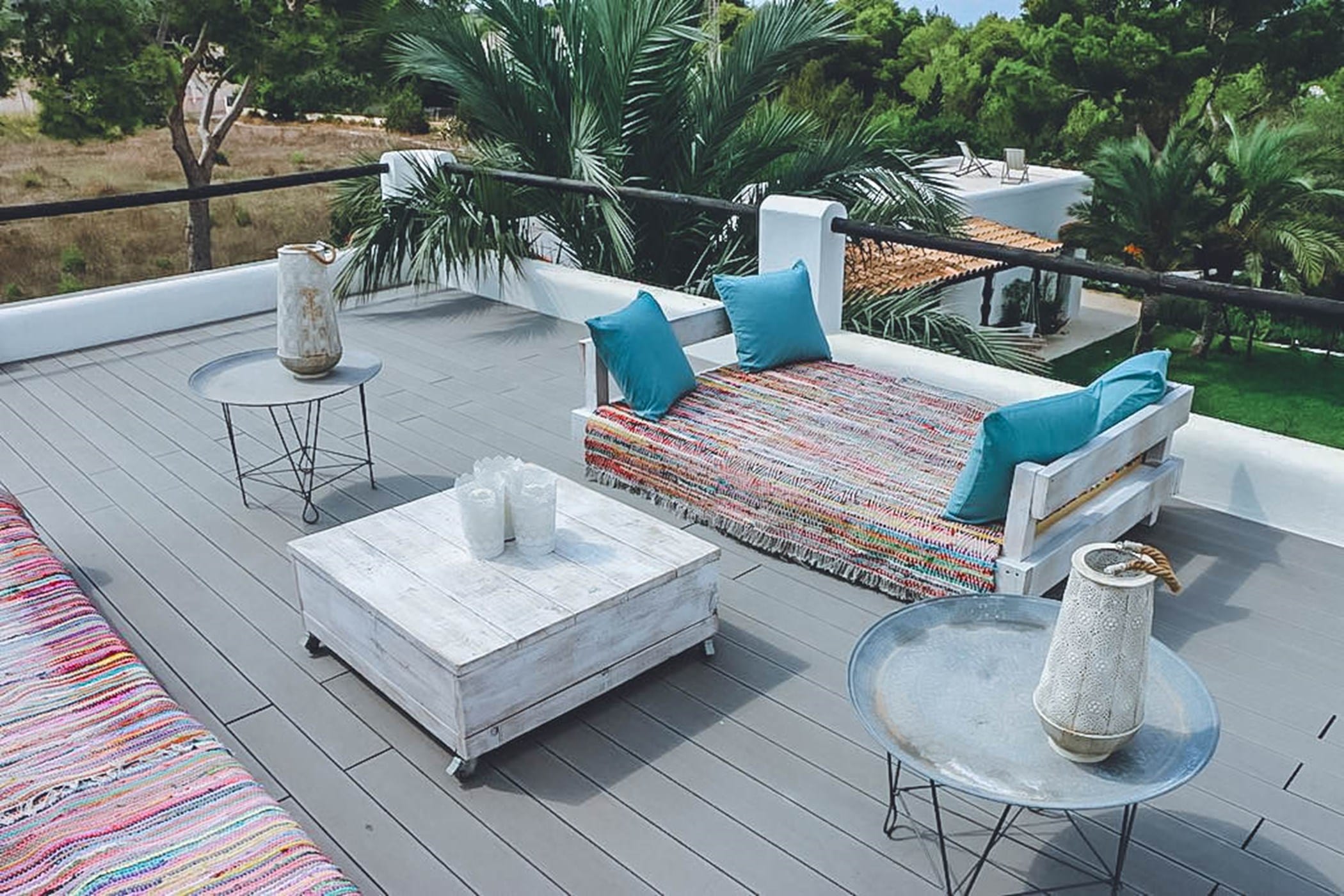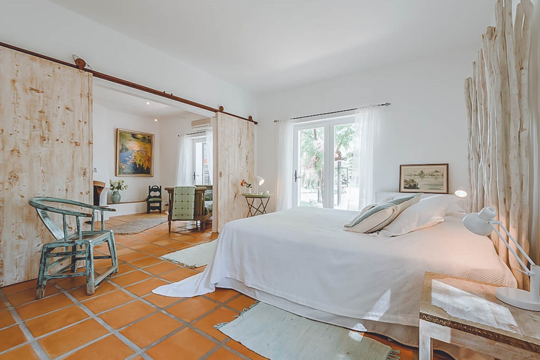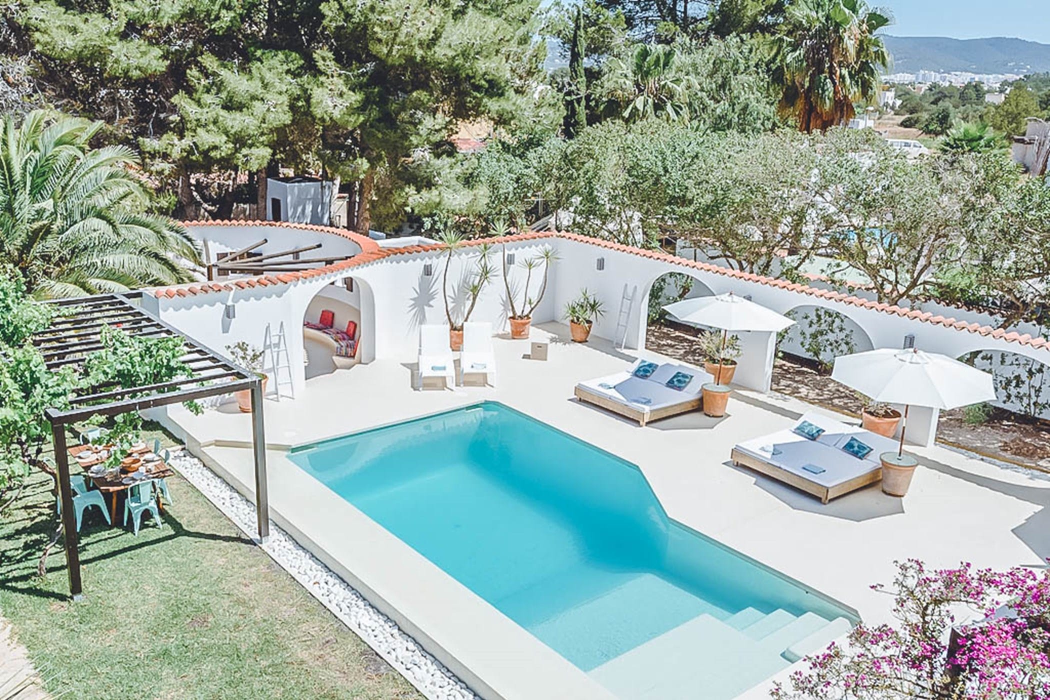 The property includes a master bedroom with a private terrace, while the remaining guest bedrooms are set apart with independent entrances, offering added privacy. Outdoors, guests can unwind in a serene environment designed for relaxation year-round, with comfortable amenities and a warm, welcoming atmosphere that captures the essence of Ibiza living.