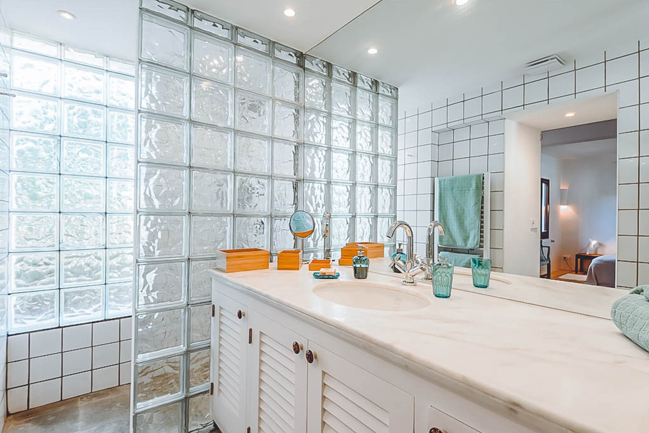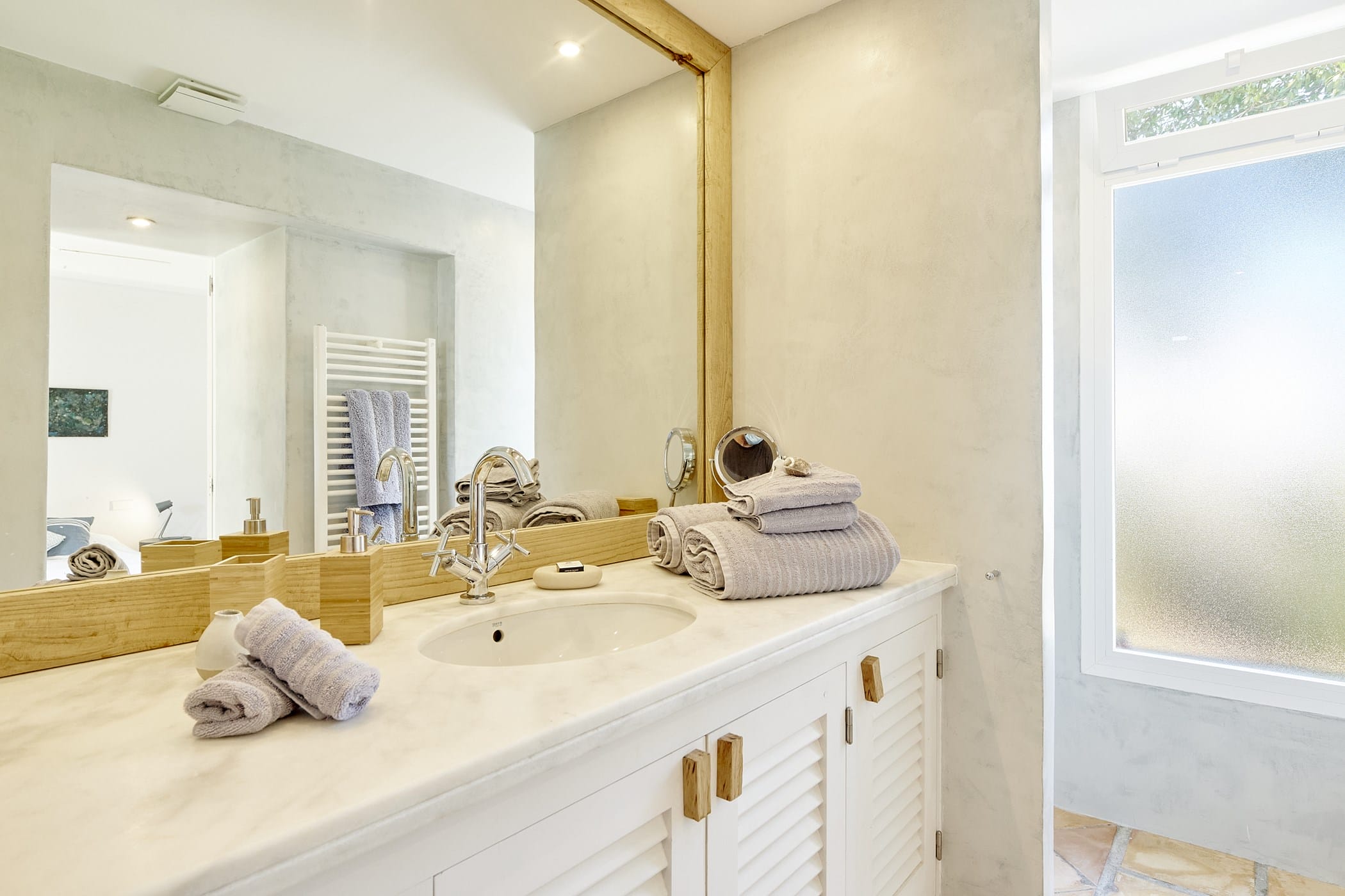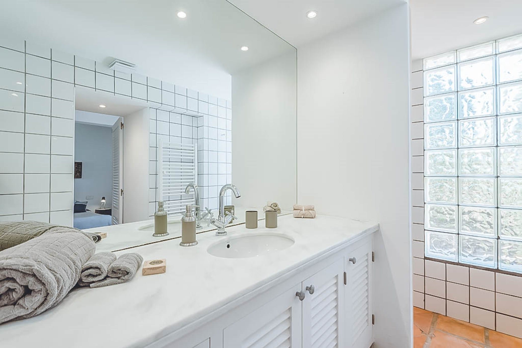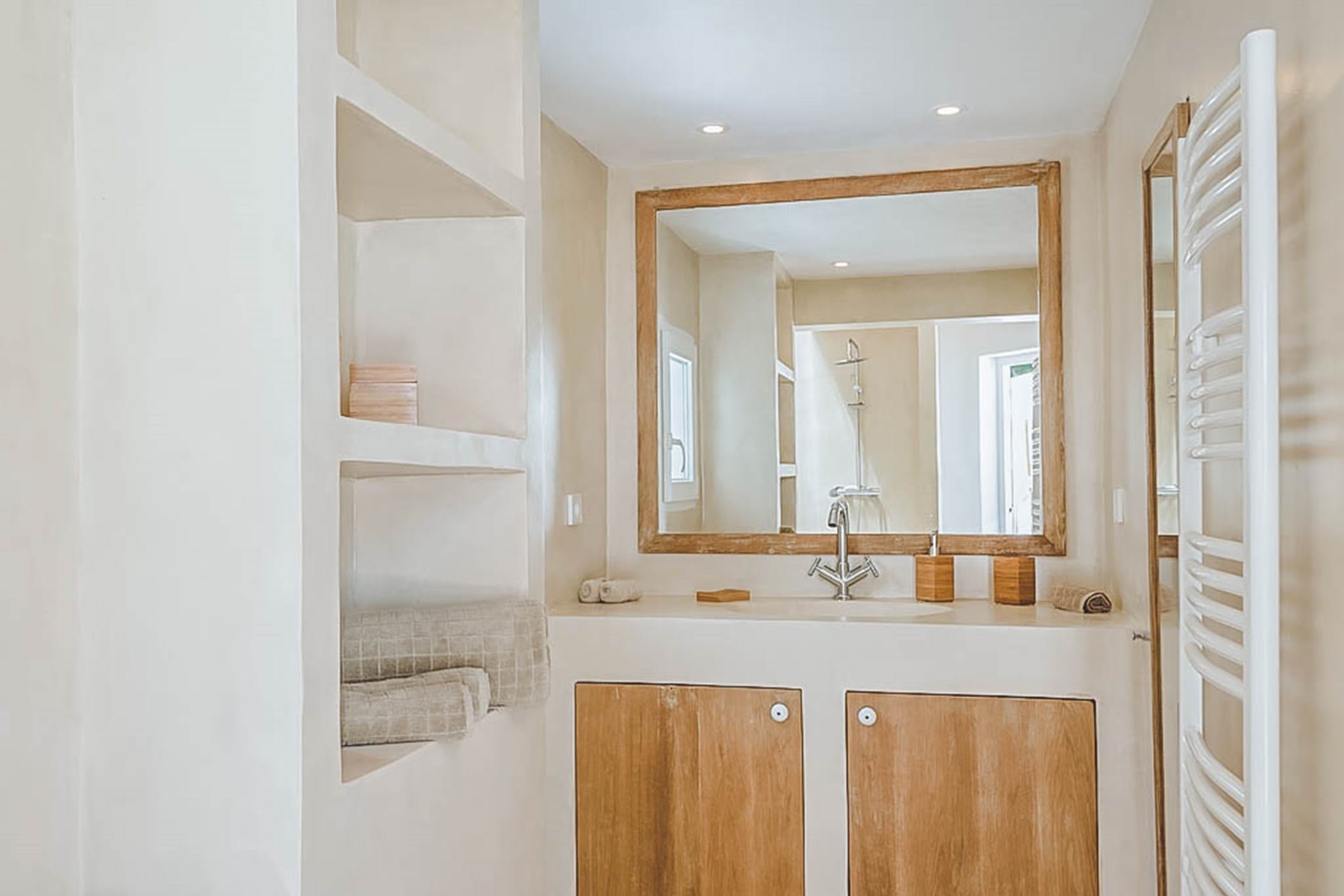 The property includes a master bedroom with a private terrace, while the remaining guest bedrooms are set apart with independent entrances, offering added privacy. Outdoors, guests can unwind in a serene environment designed for relaxation year-round, with comfortable amenities and a warm, welcoming atmosphere that captures the essence of Ibiza living.