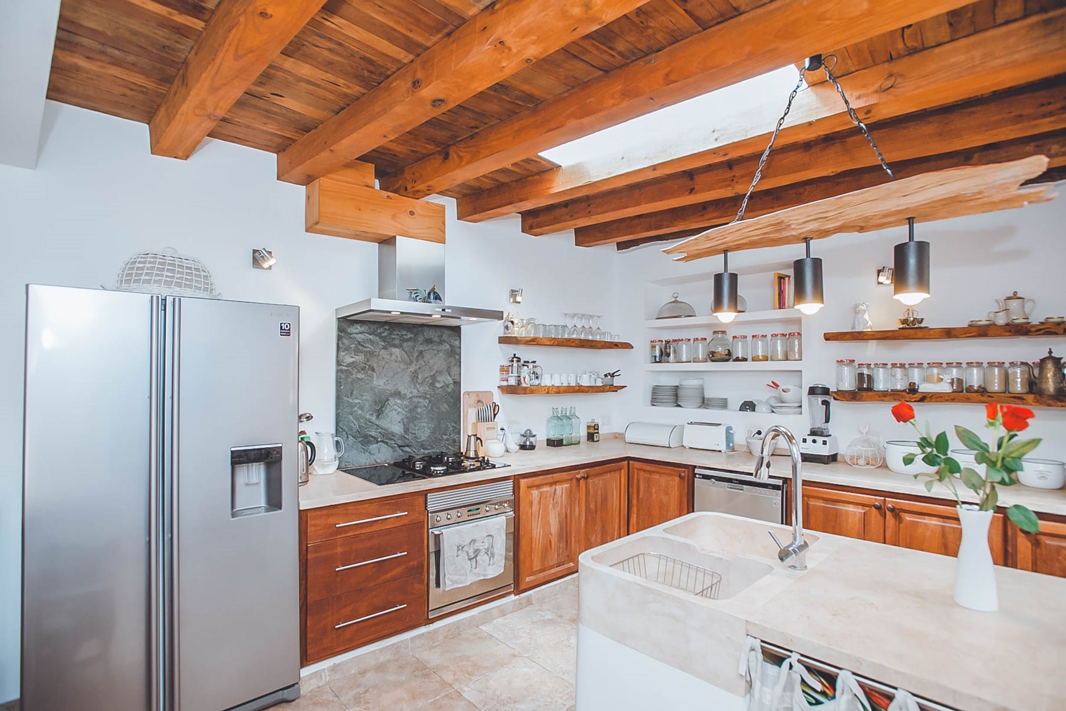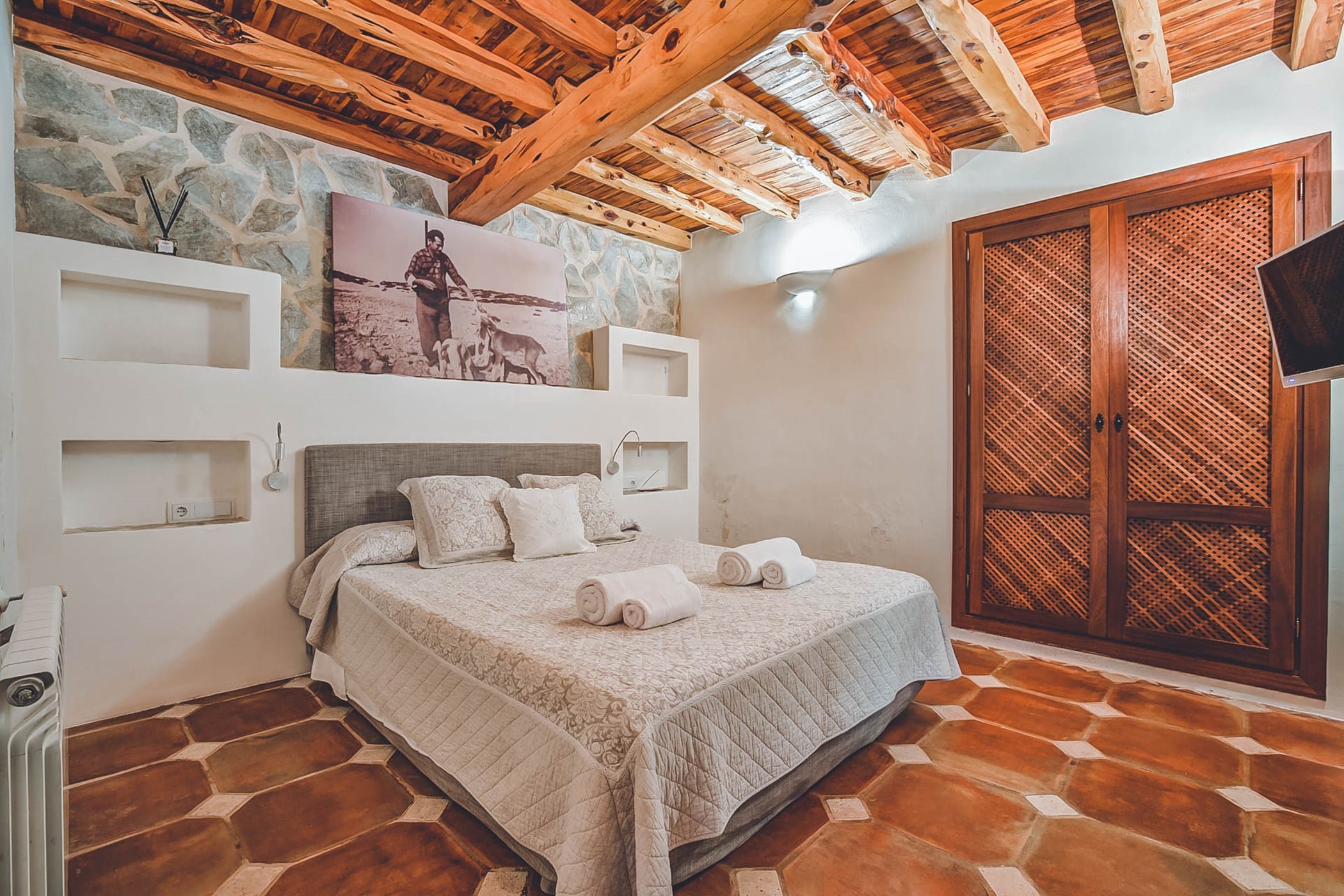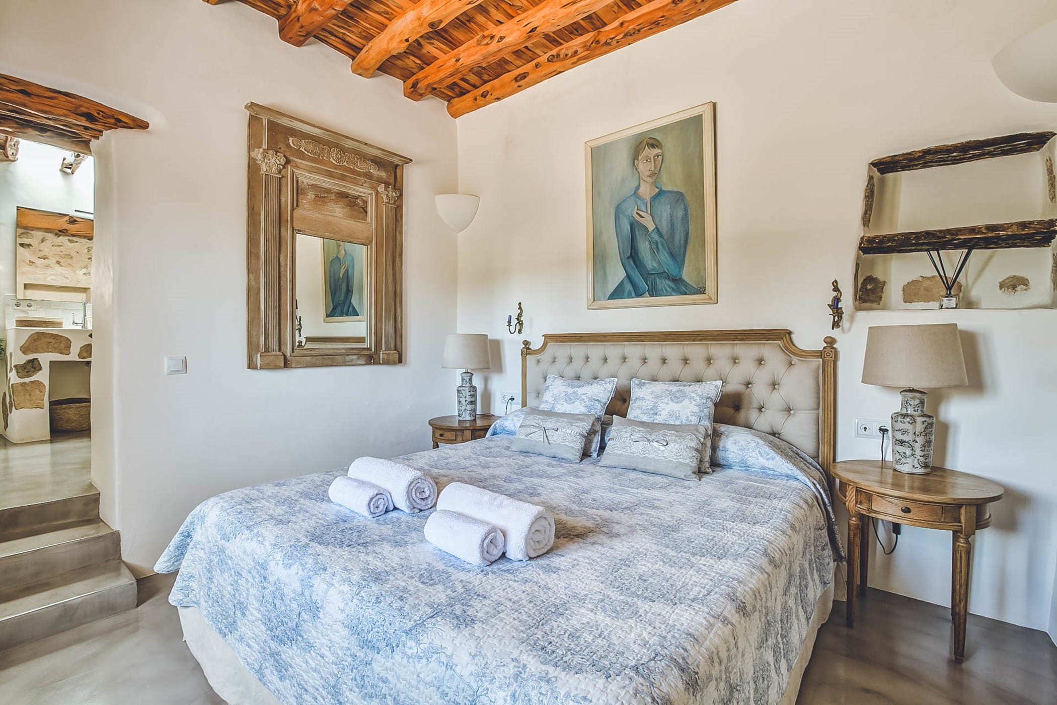 The interiors feature original stone walls, hardwood beamed ceilings, and traditional cement floors. The spacious master suite (with four-poster bed) is located in the tower and includes an en-suite bathroom (shower + bathtub) and a private terrace with stunning views over the valley, mountains, and coastline. The other five bedrooms (some convertible to twins) offer a mix of en-suite and shared bathrooms, with two guest bedrooms providing separate external access for added privacy.
