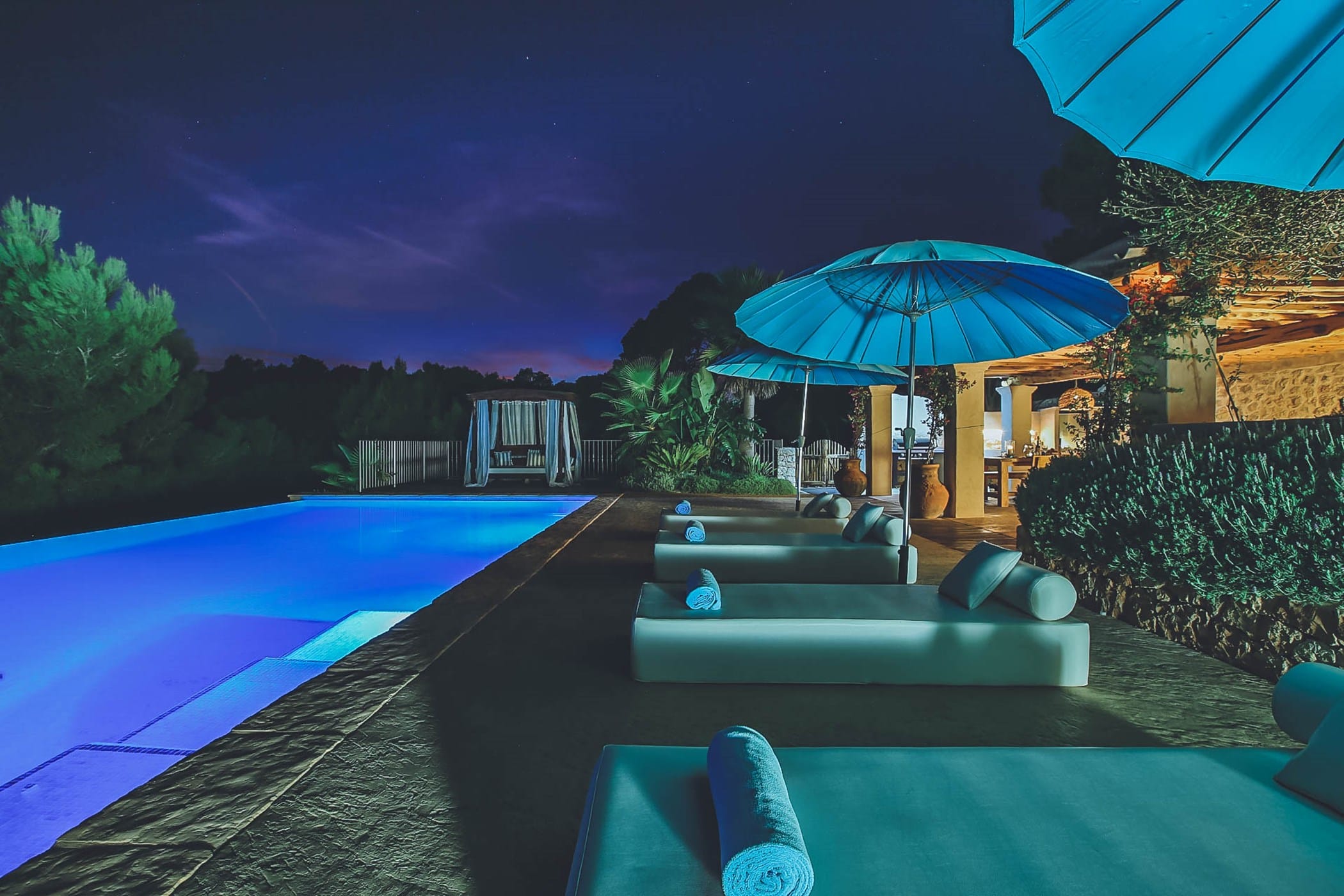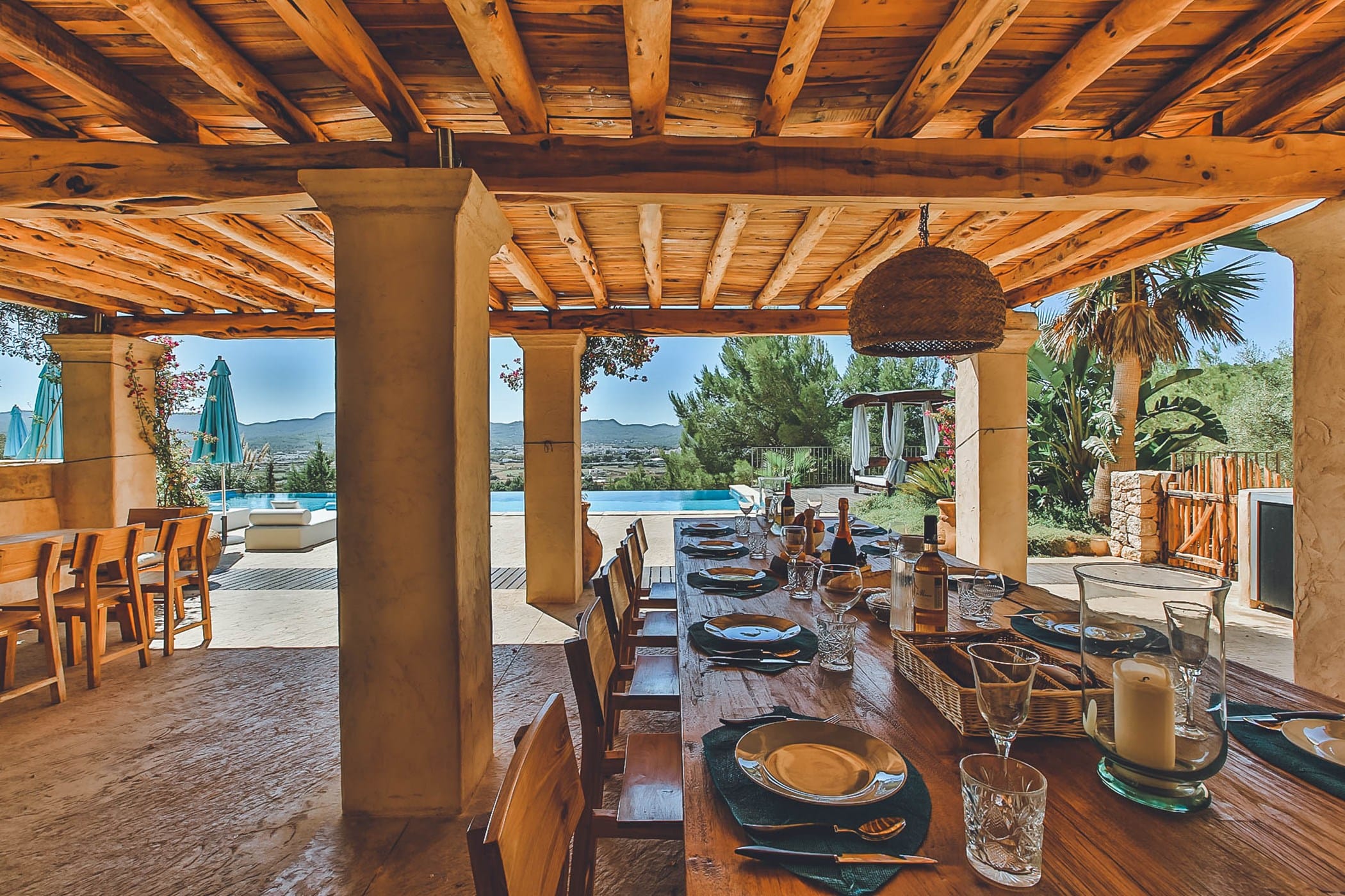 Outside, the villa boasts extensive landscaped terraces, an infinity pool, and multiple dining and chill-out areas — perfect for enjoying long summer days and unforgettable Ibiza sunsets.