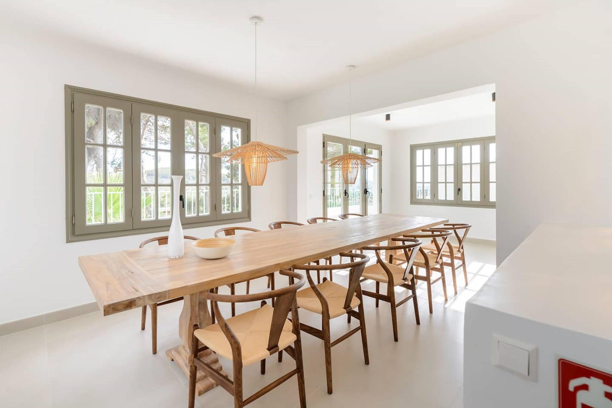 The bright, spacious interiors feature a large living area with a 7m sofa, reclaimed monastery dining table for 12, fully equipped kitchen (Miele appliances, Nespresso, etc.), and a dedicated office. All six bedrooms are stylish and comfortable, with flexible bedding options and en-suite bathrooms.