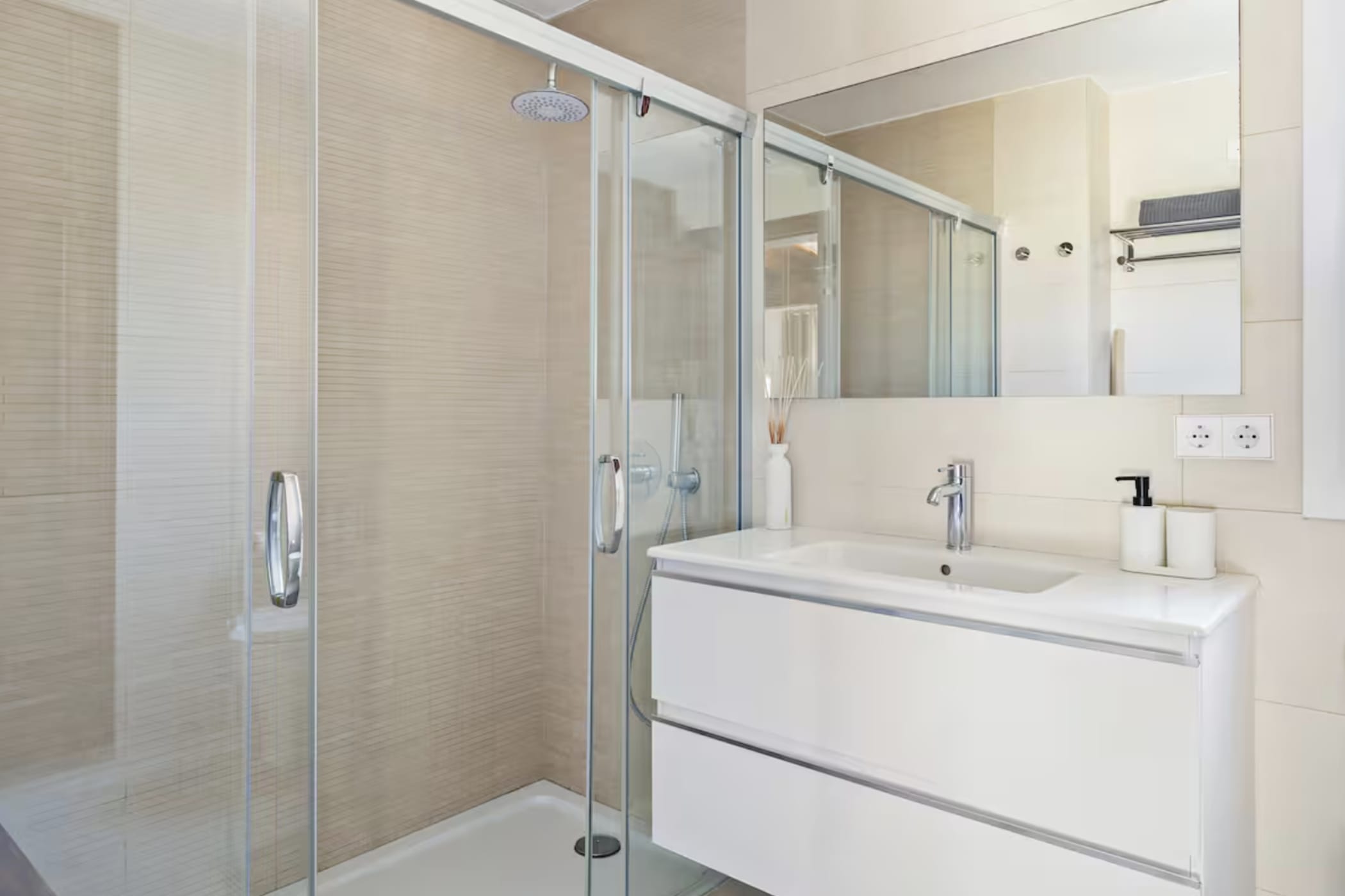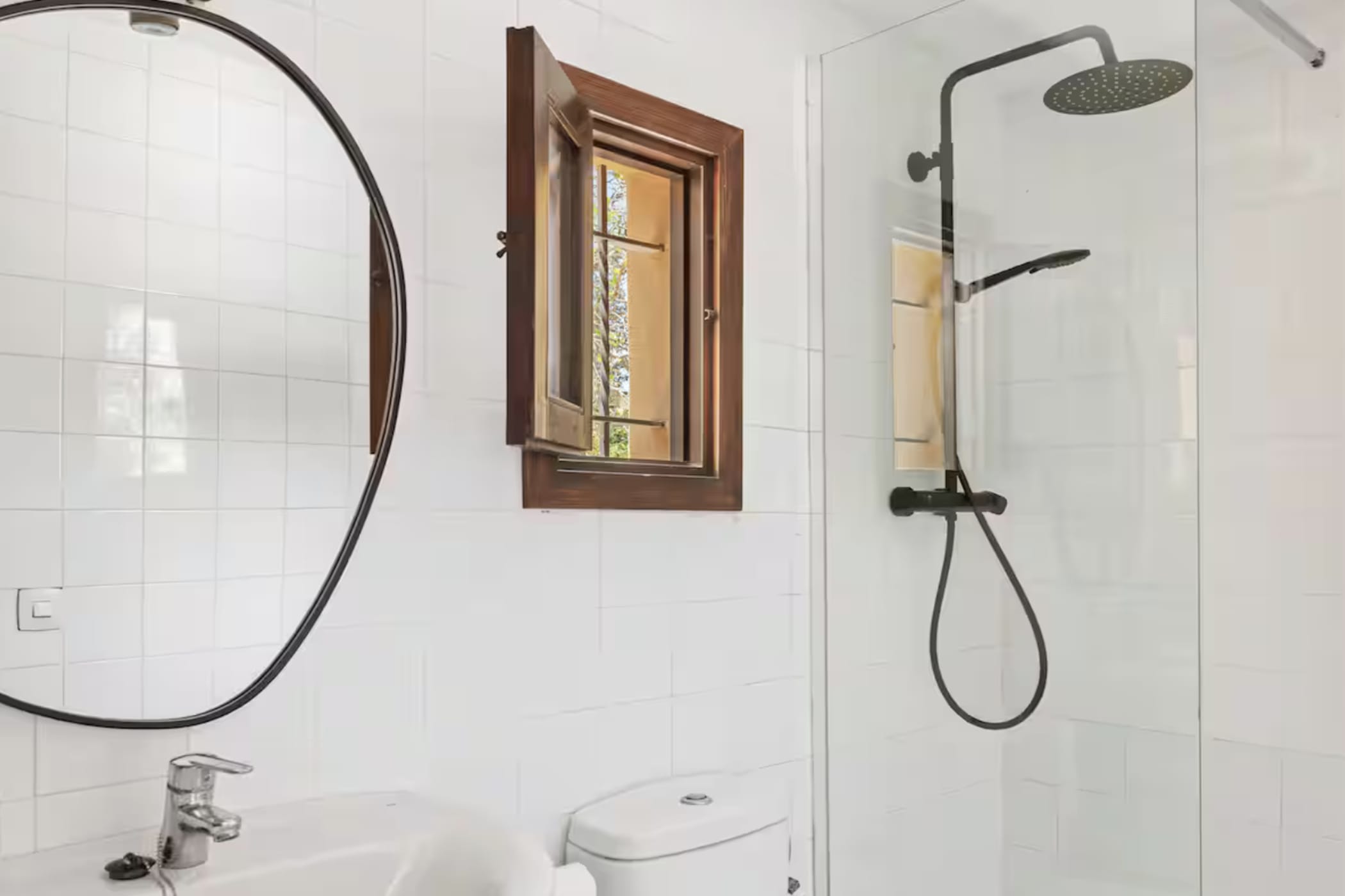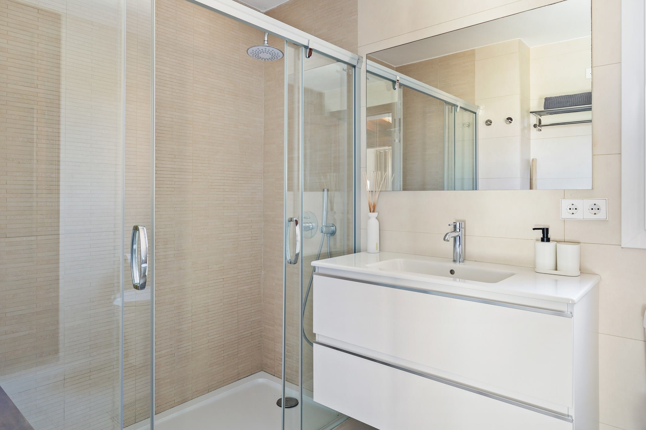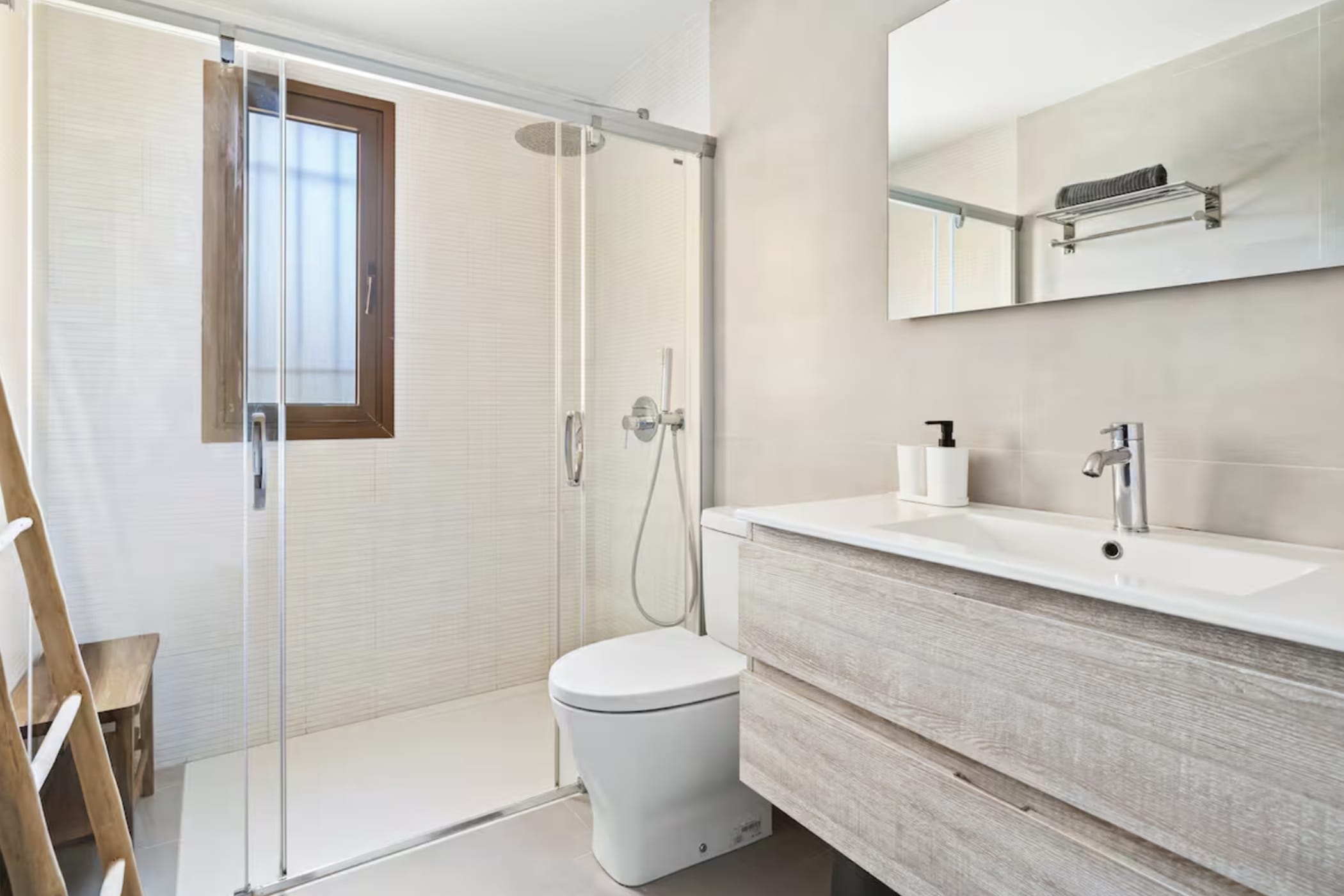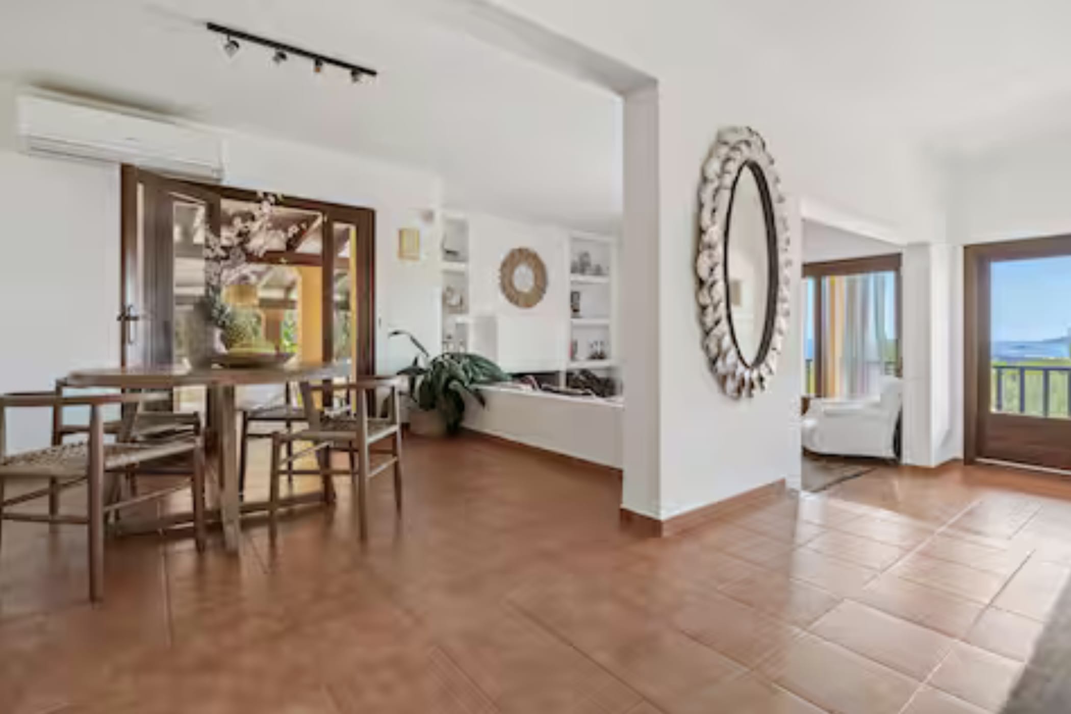 The villa features 6 bedrooms and 4 bathrooms. The master bedroom is on the upper level with a modern en-suite. The other bedrooms are comfortable and well-distributed, including one with independent external access for added privacy. A separate studio provides extra flexibility with its own entrance, living area, double bed, and bathroom.