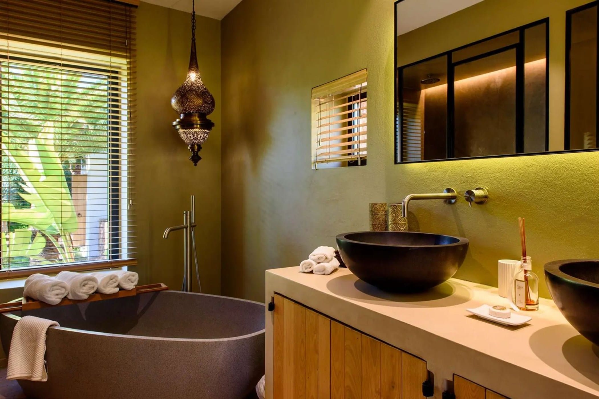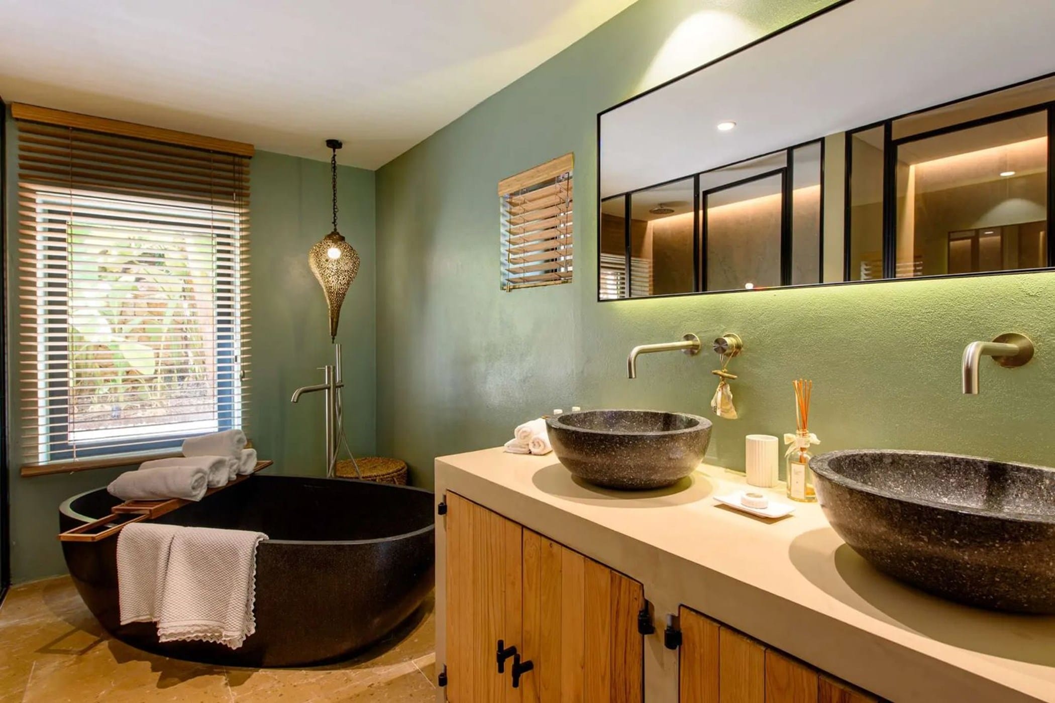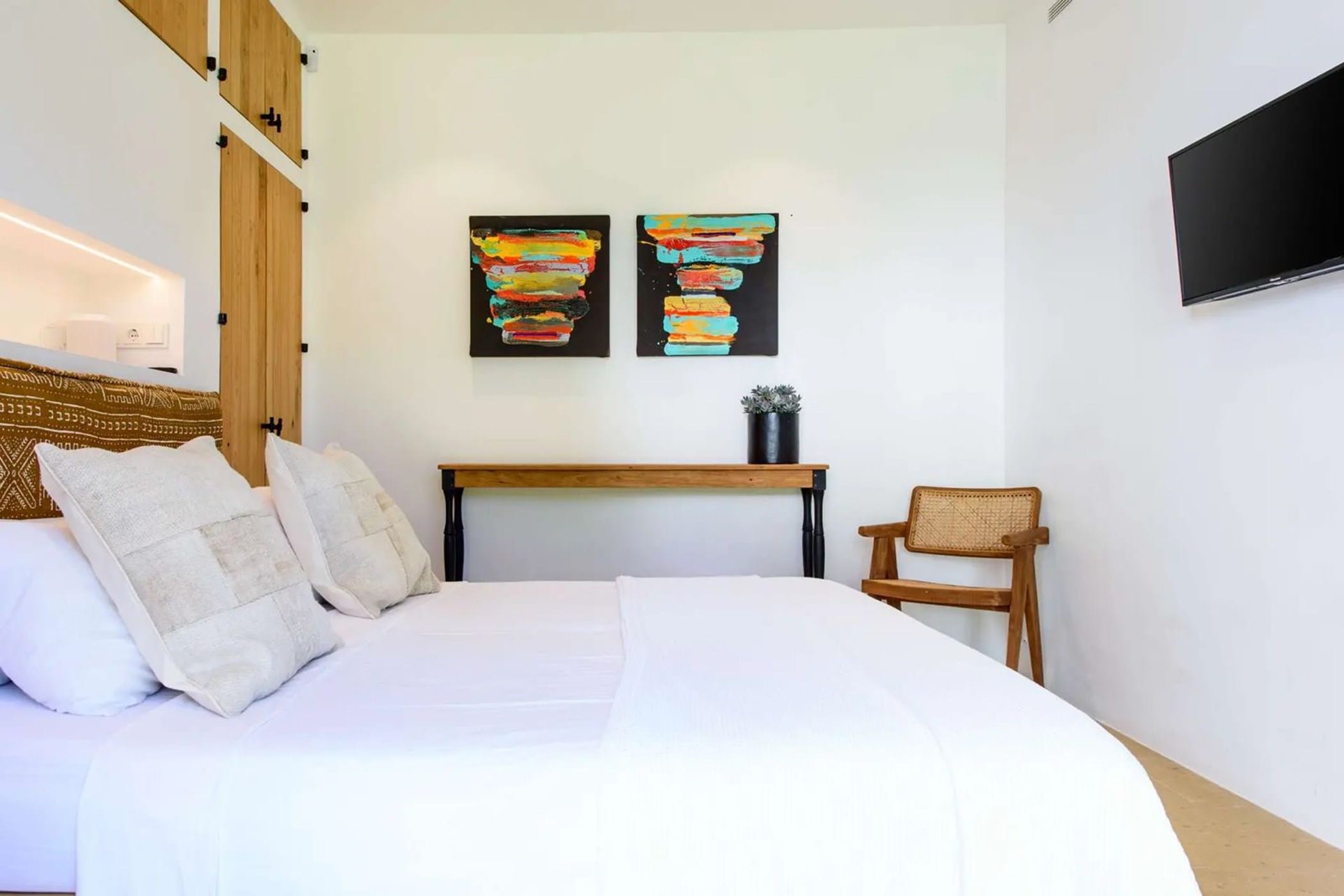 The villa features six stylish bedrooms: two on the ground floor and a spacious master suite with freestanding bath and private rooftop terrace in the main house, plus three en-suite bedrooms in a separate guest casita for added privacy.