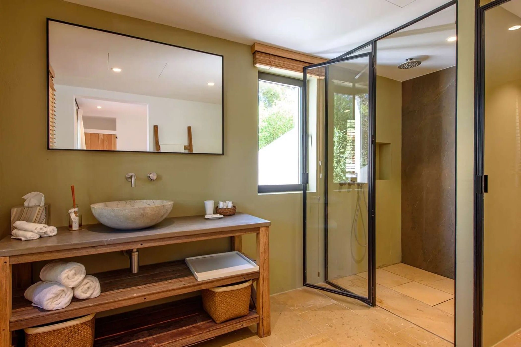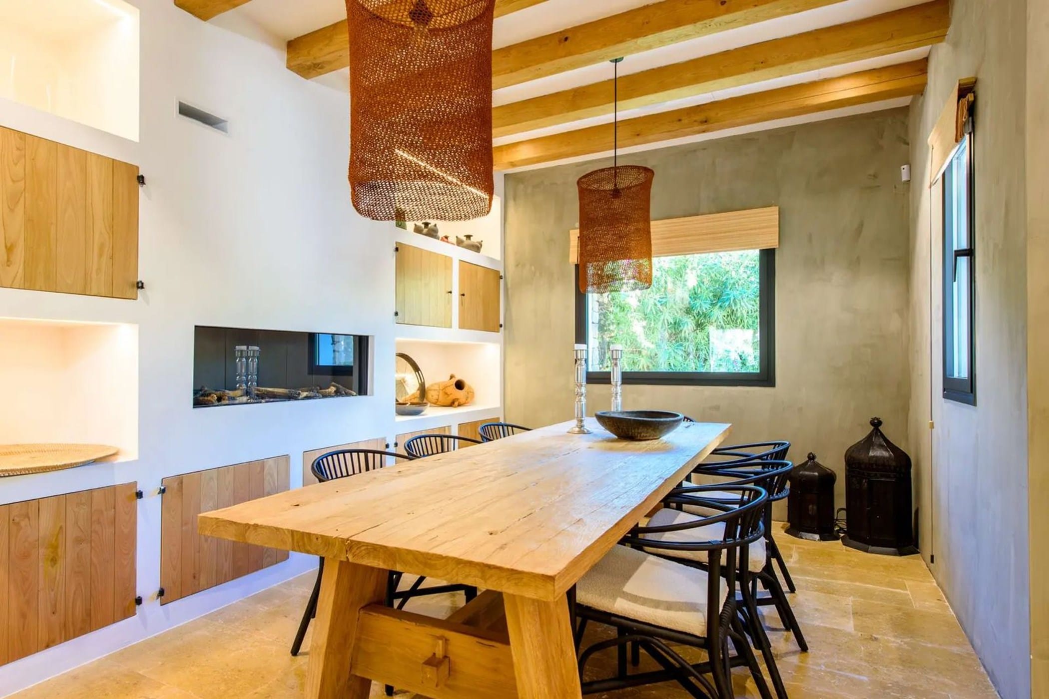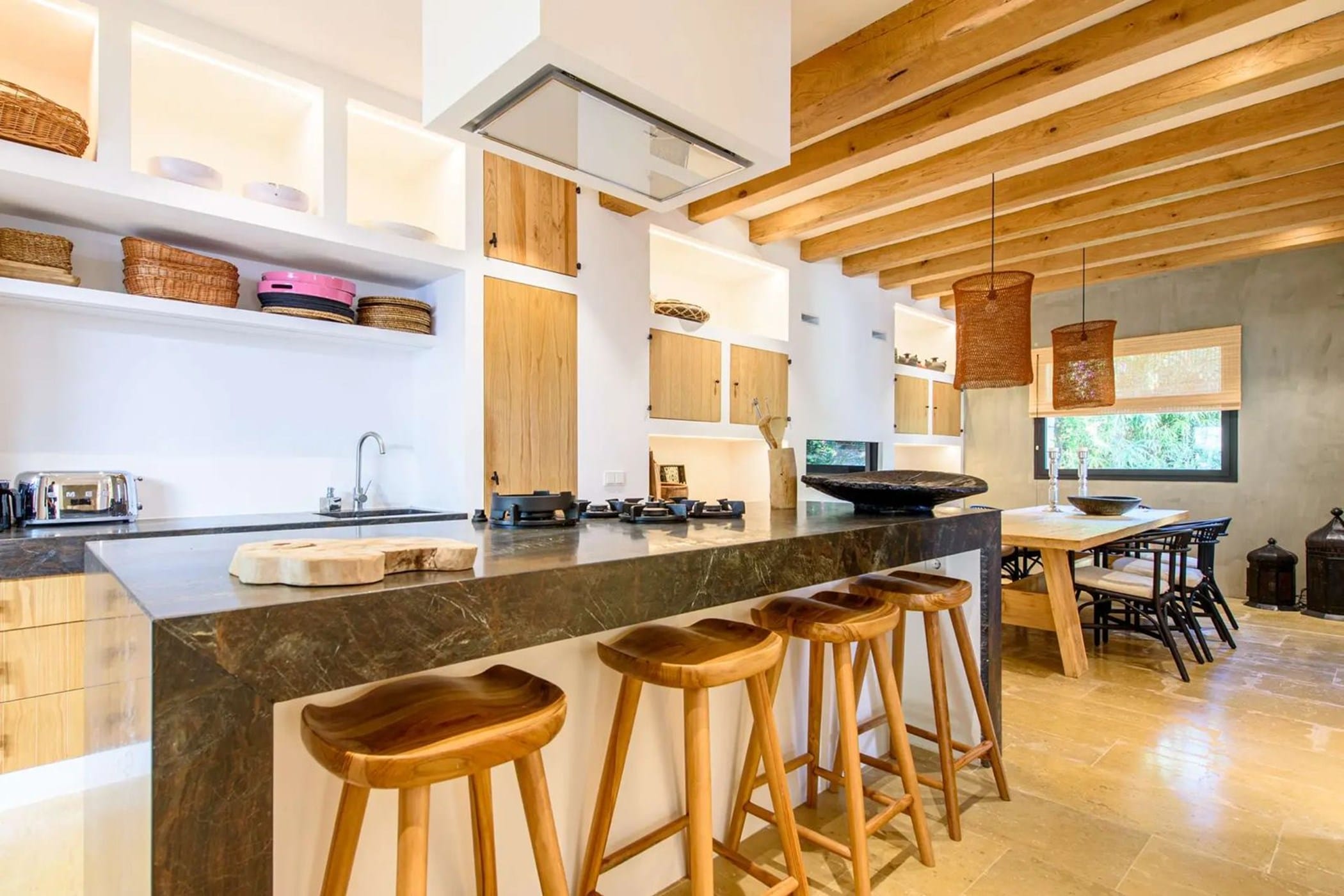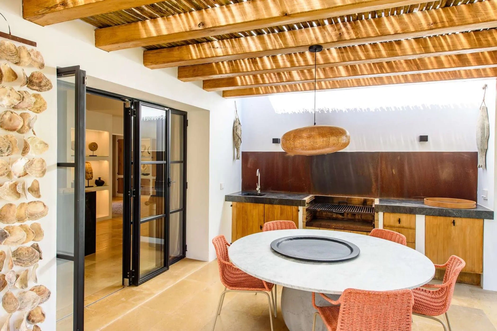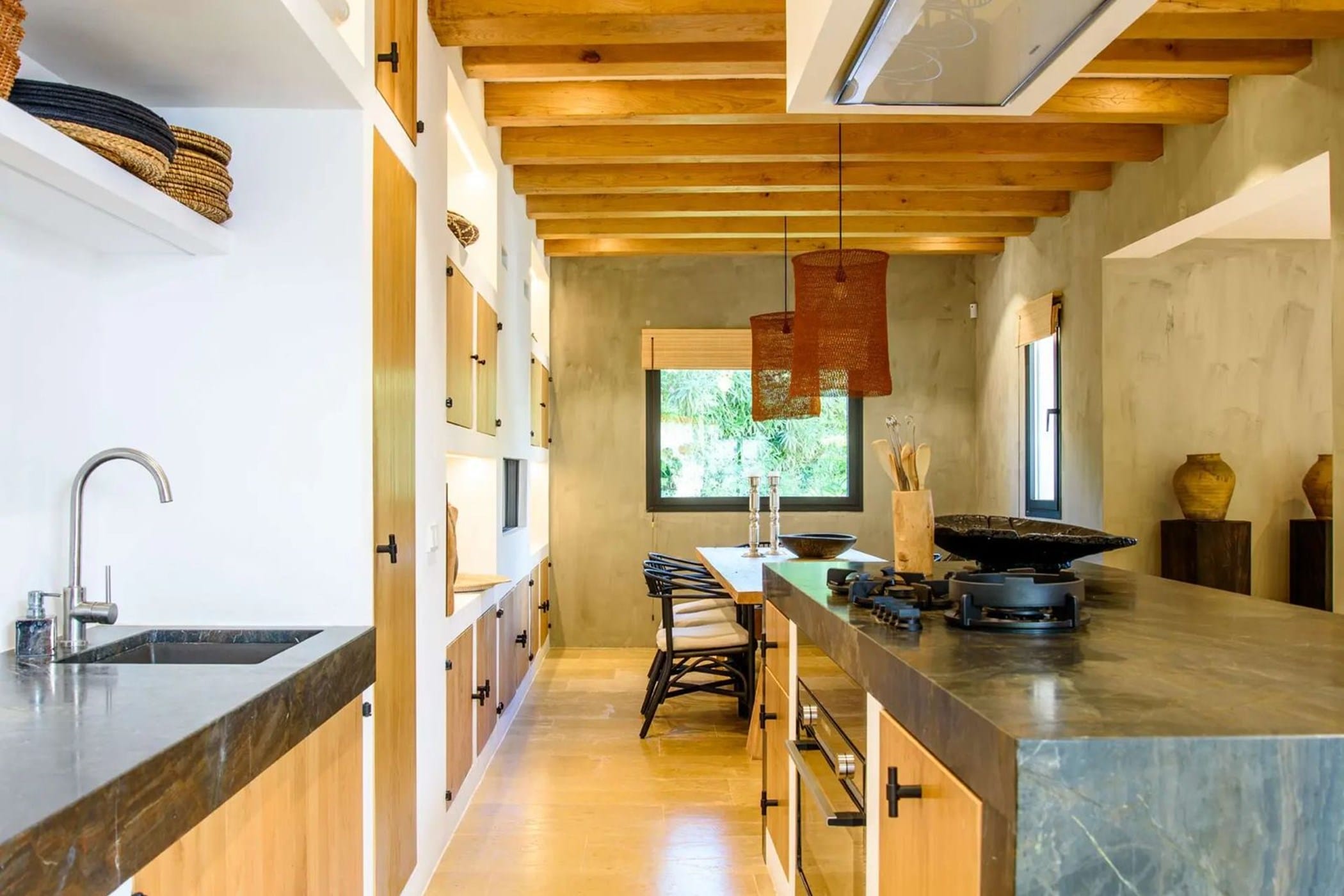 The bright interiors blend original wooden beams and natural stone with contemporary design. The fully equipped designer kitchen opens to generous indoor and outdoor dining areas for up to 12 guests.