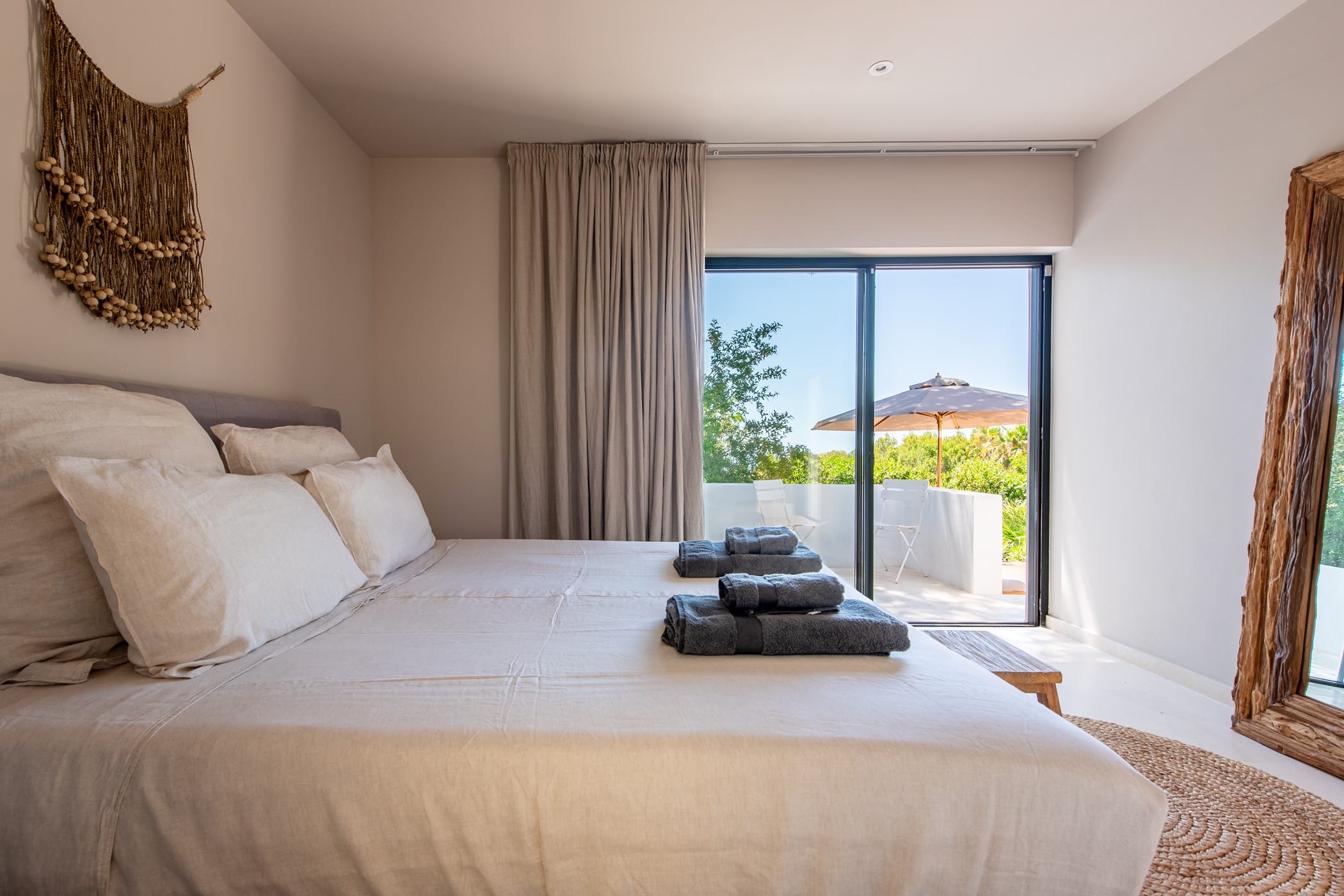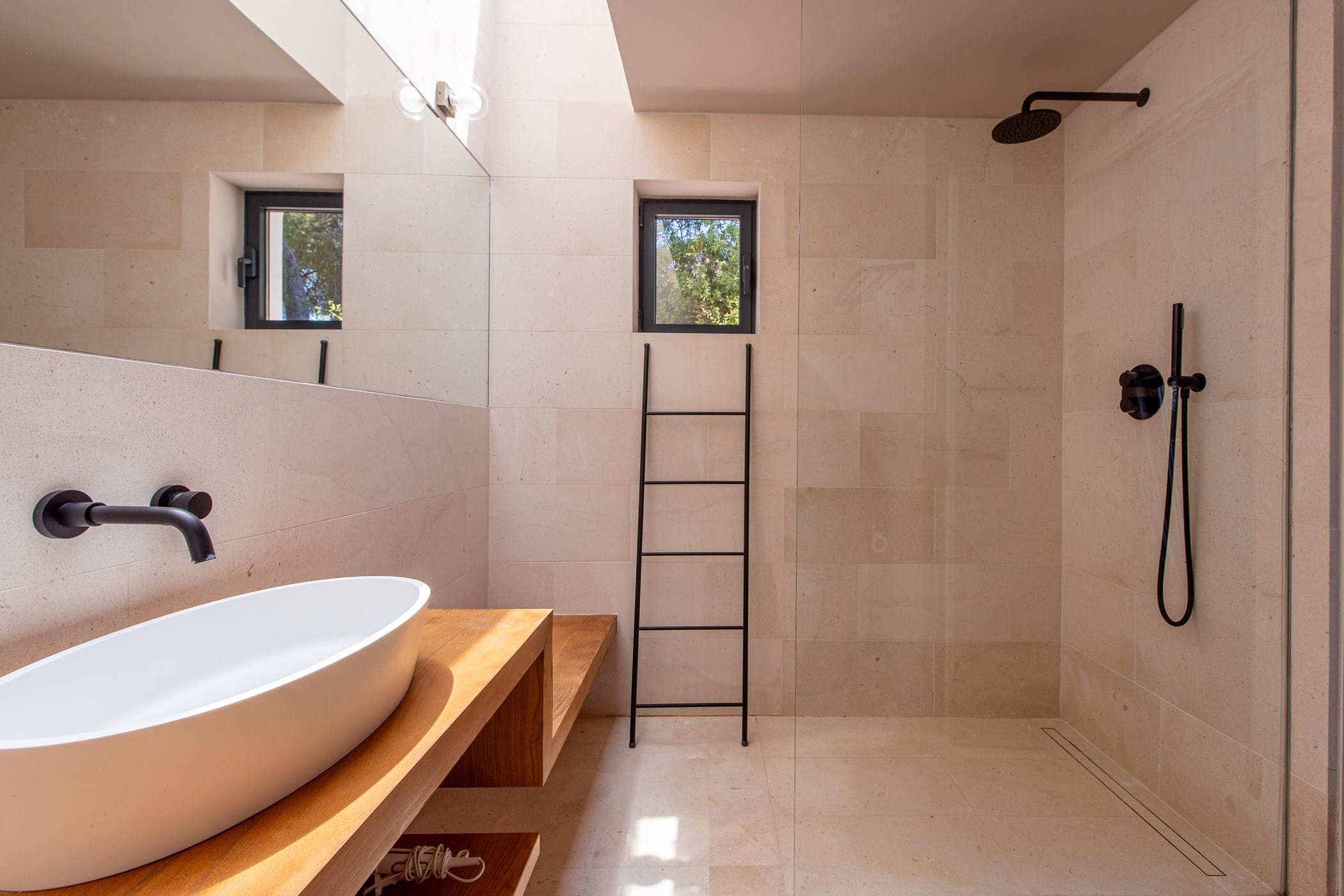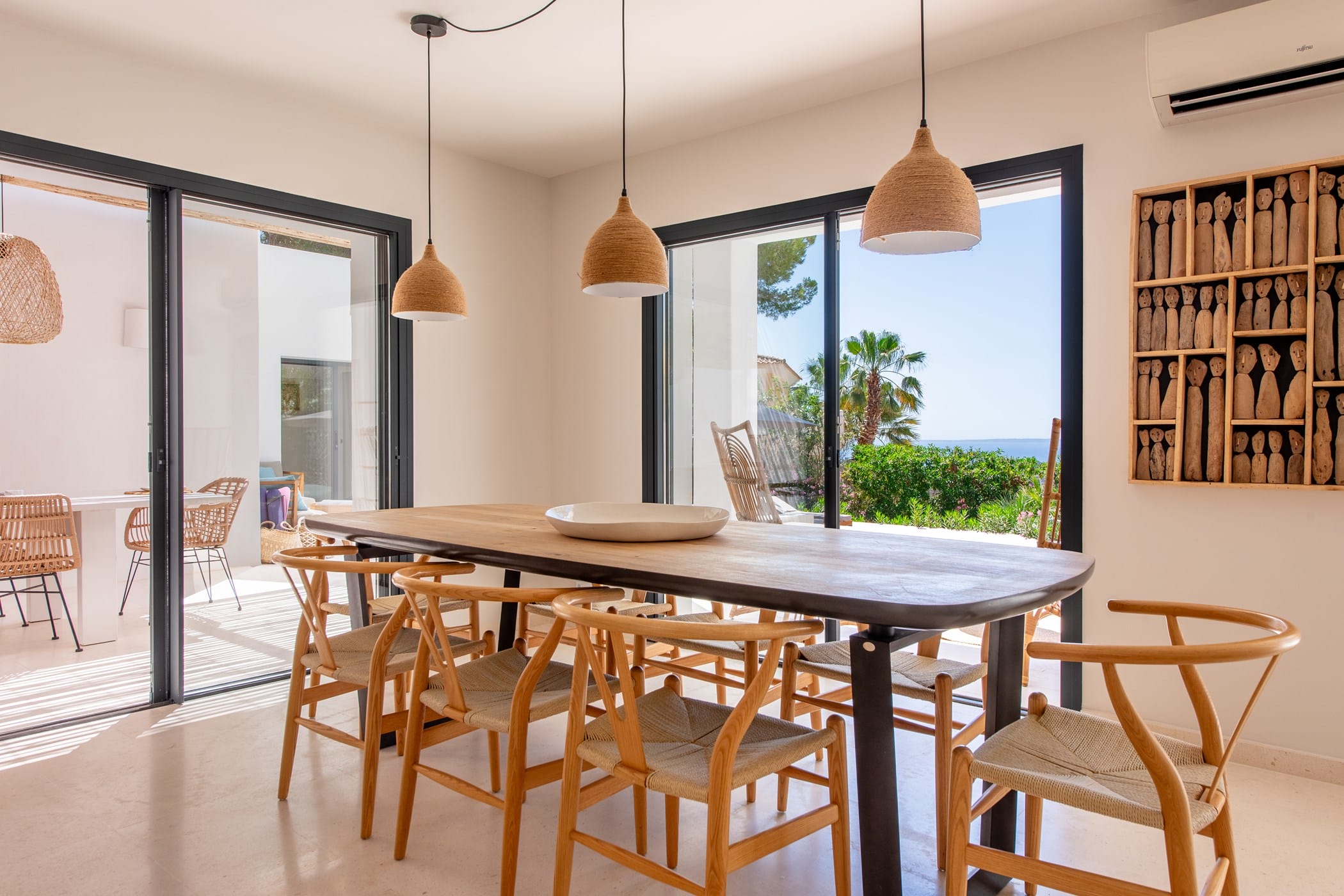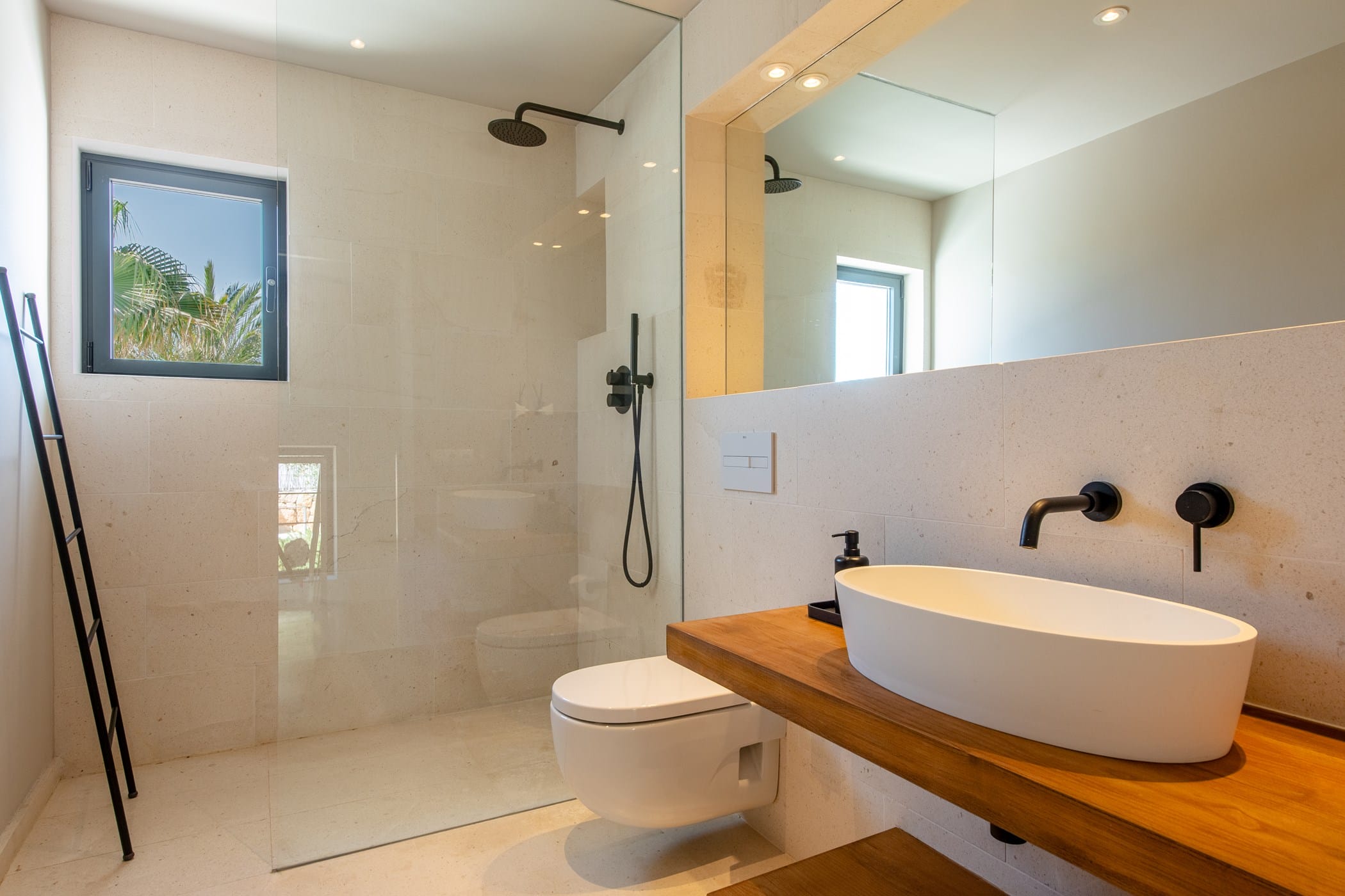 The upper level hosts the main house with bright, open-plan living and dining areas, a fully equipped modern kitchen, and well-appointed bedrooms, including a master suite with beautiful sea views. The lower level features a separate annex with three en-suite bedrooms, offering additional privacy for guests or extended family.