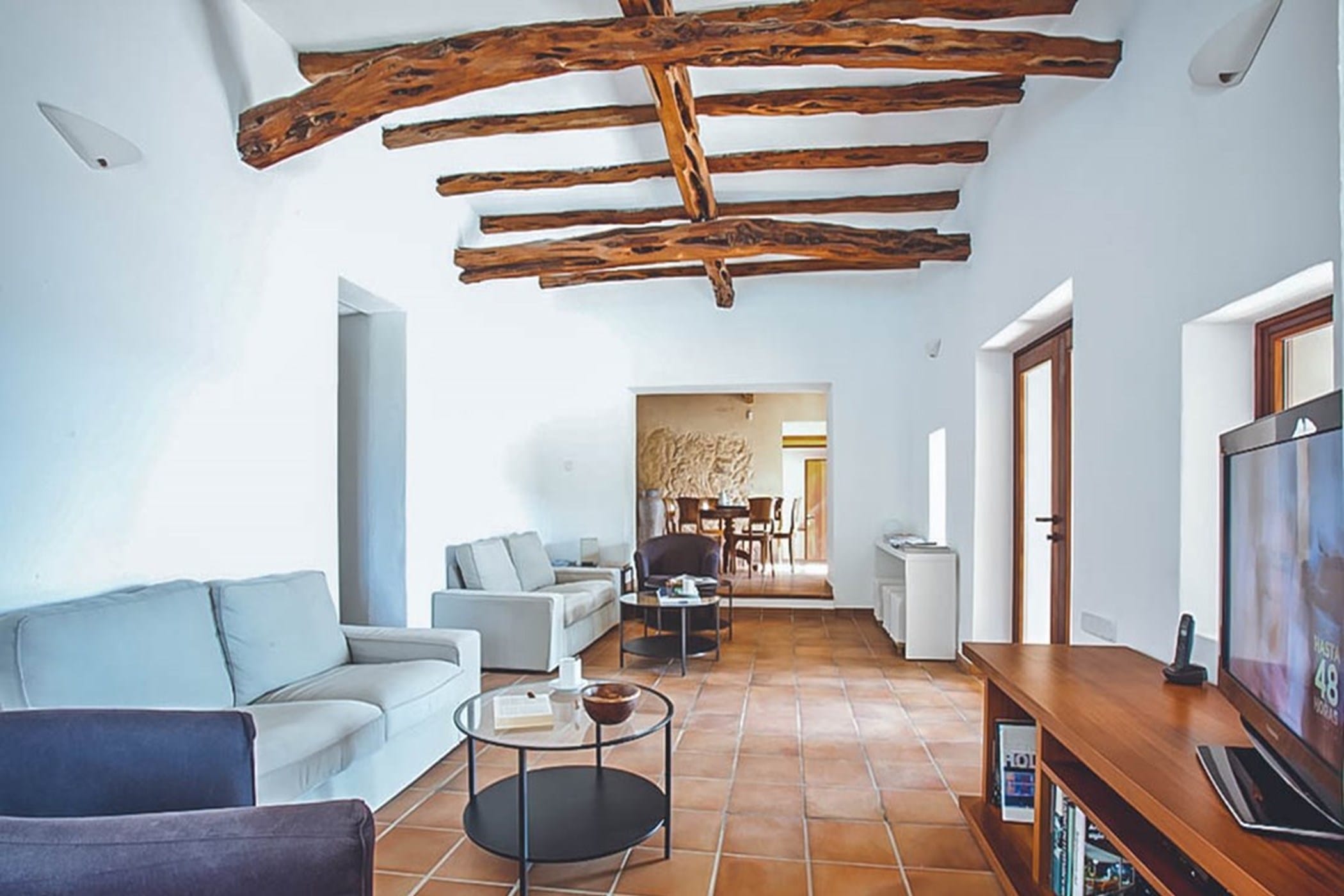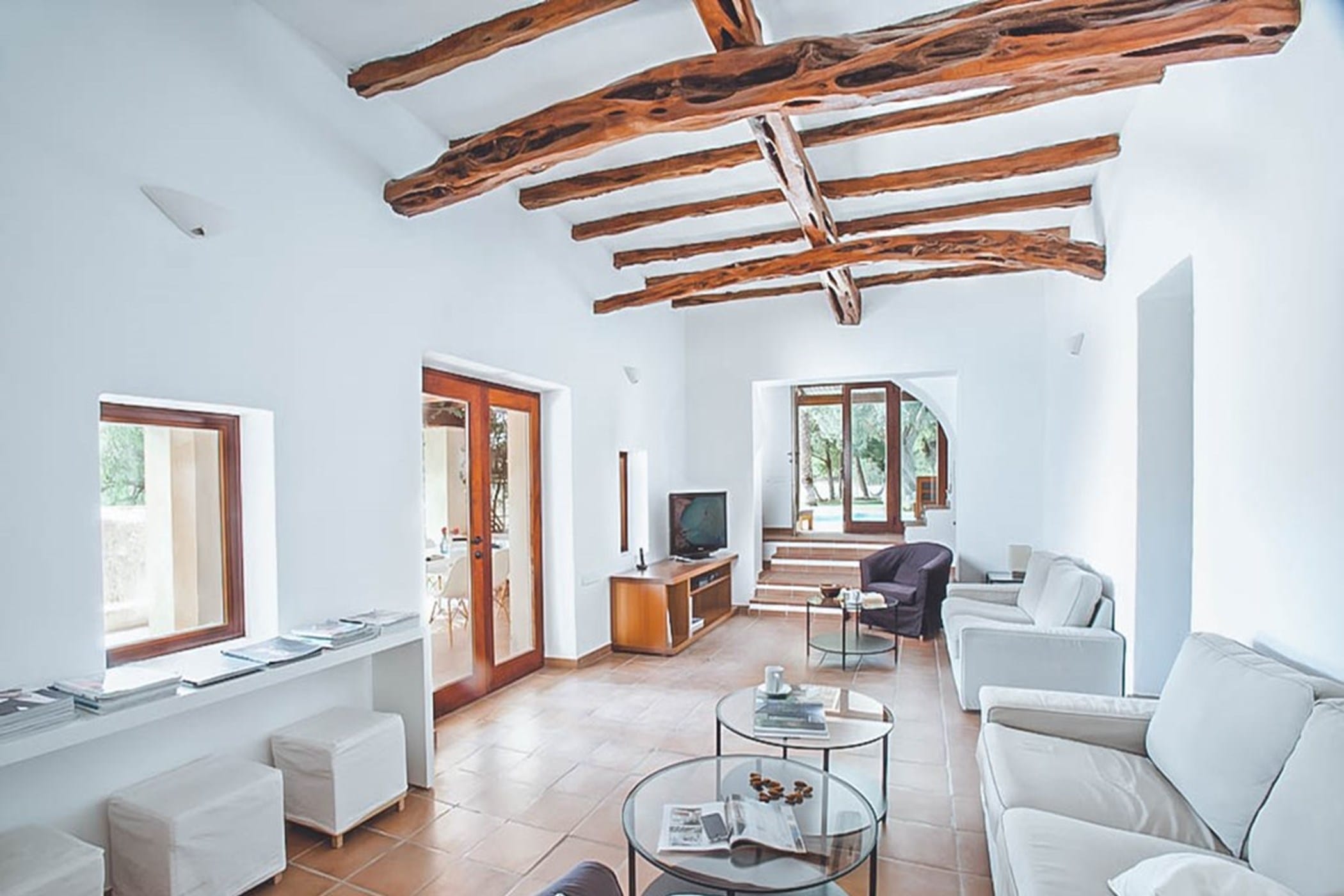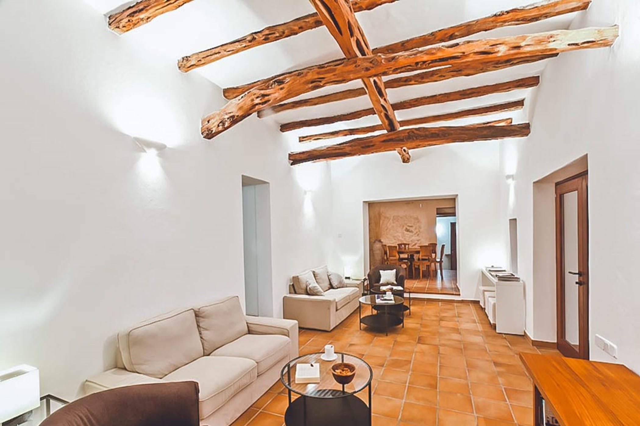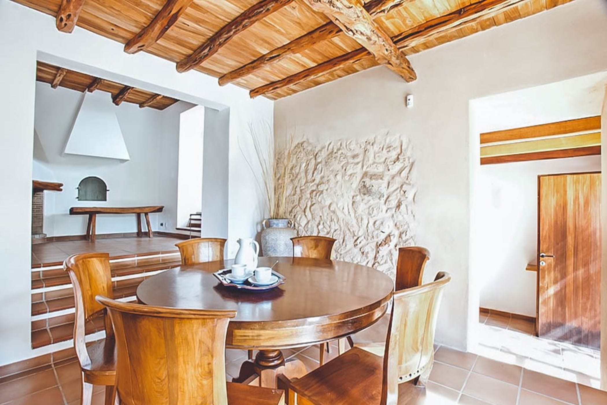 The interiors feature terracotta floors, white walls, and wooden beamed ceilings, complemented by contemporary design and high-quality furnishings. The main house includes a bright kitchen with a breakfast area, indoor dining space, and a spacious lounge that opens onto the pool terrace. Additional guest accommodation is provided in separate casitas, each with twin beds, en-suite bathrooms, and private terrace access, ensuring comfort and privacy.