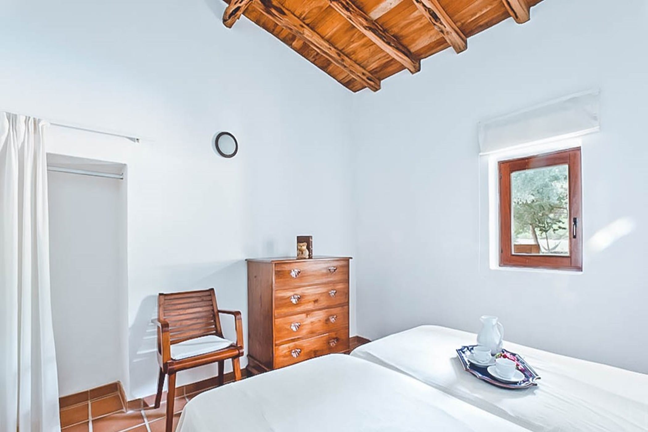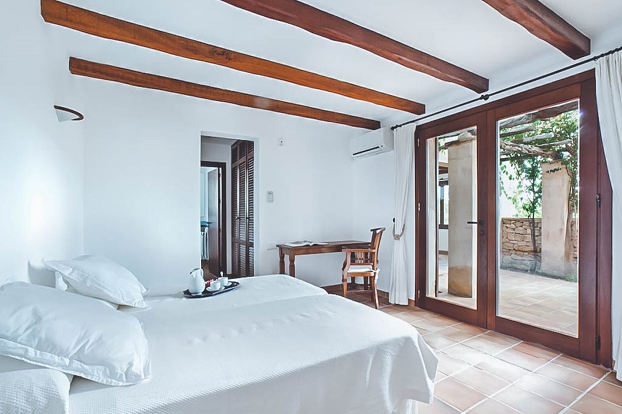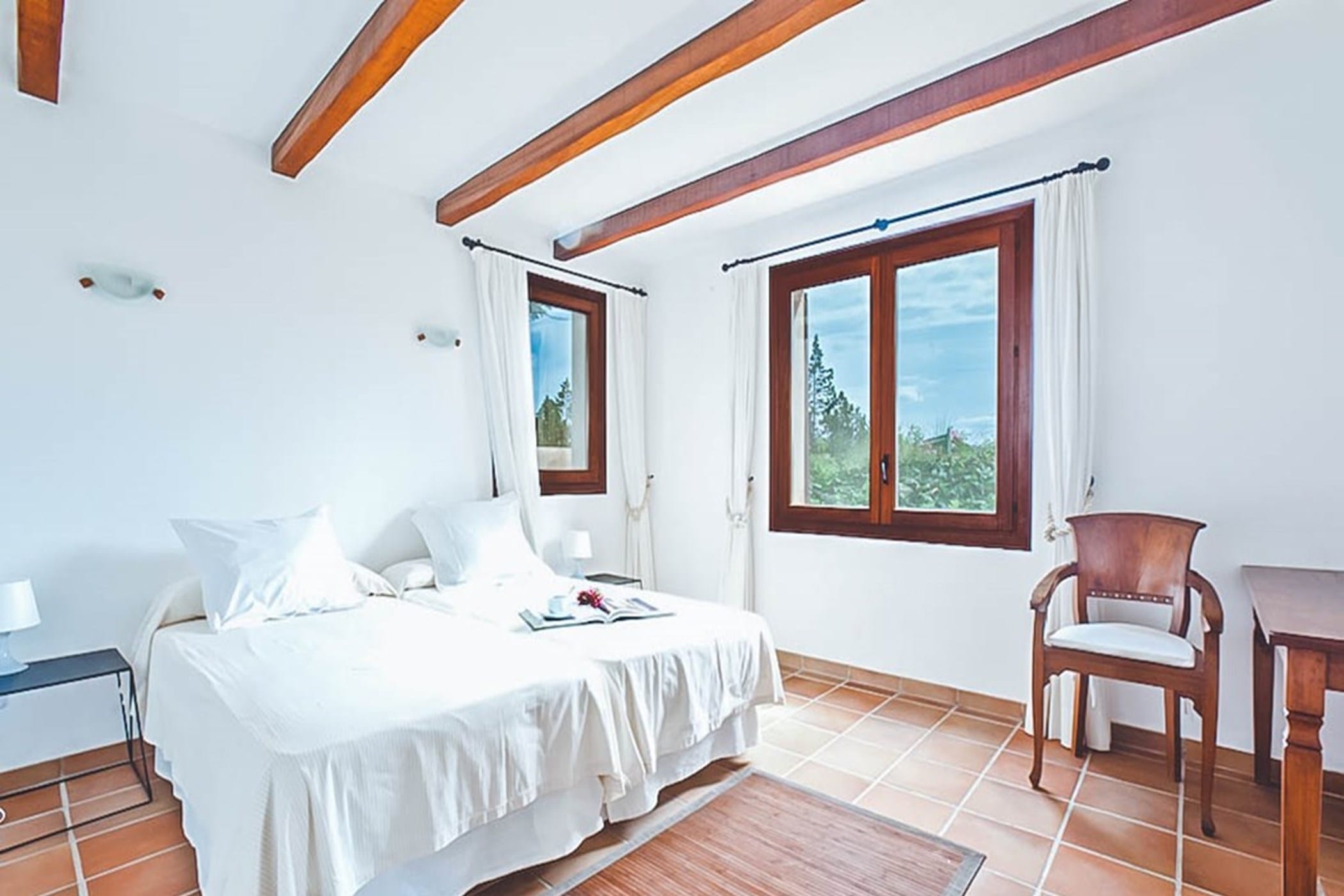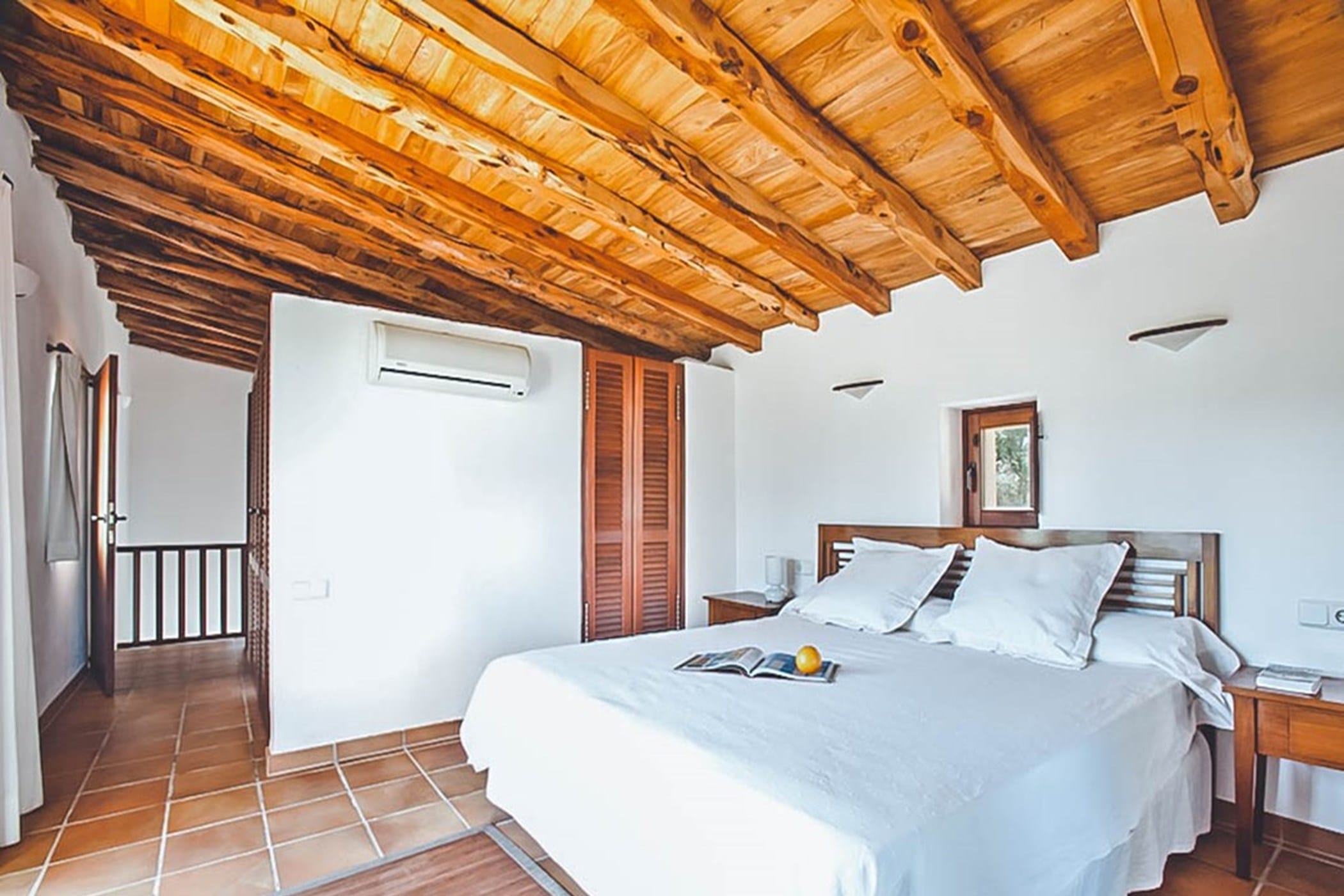 The interiors feature terracotta floors, white walls, and wooden beamed ceilings, complemented by contemporary design and high-quality furnishings. The main house includes a bright kitchen with a breakfast area, indoor dining space, and a spacious lounge that opens onto the pool terrace. Additional guest accommodation is provided in separate casitas, each with twin beds, en-suite bathrooms, and private terrace access, ensuring comfort and privacy.