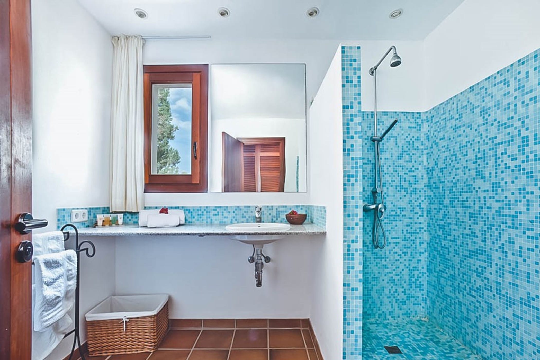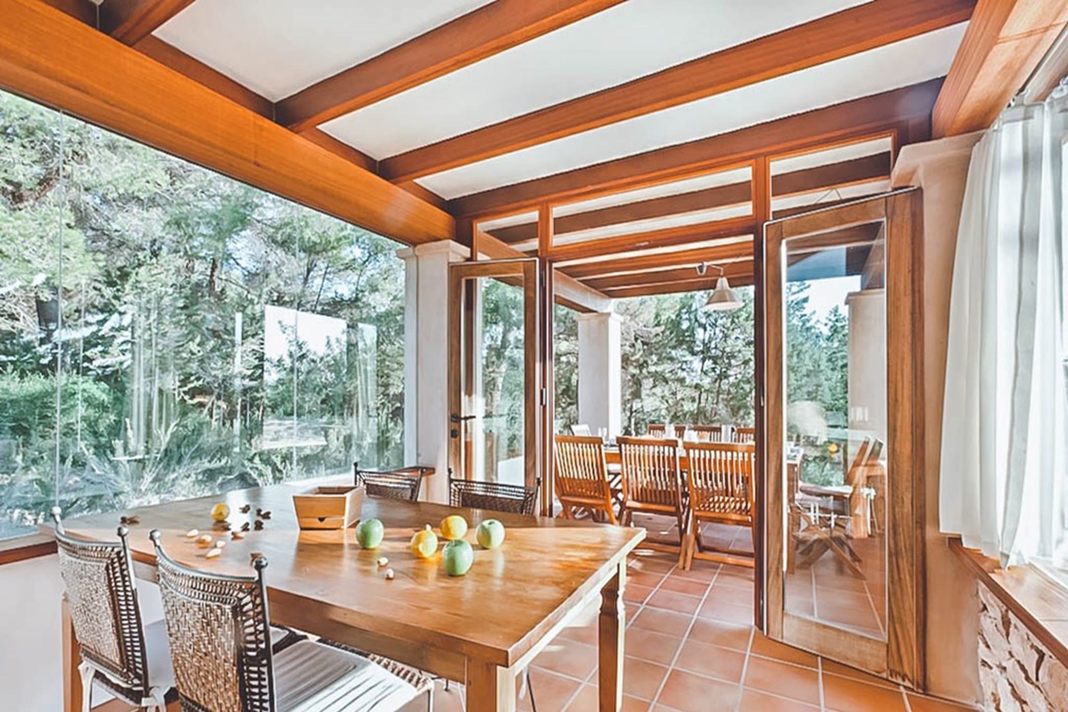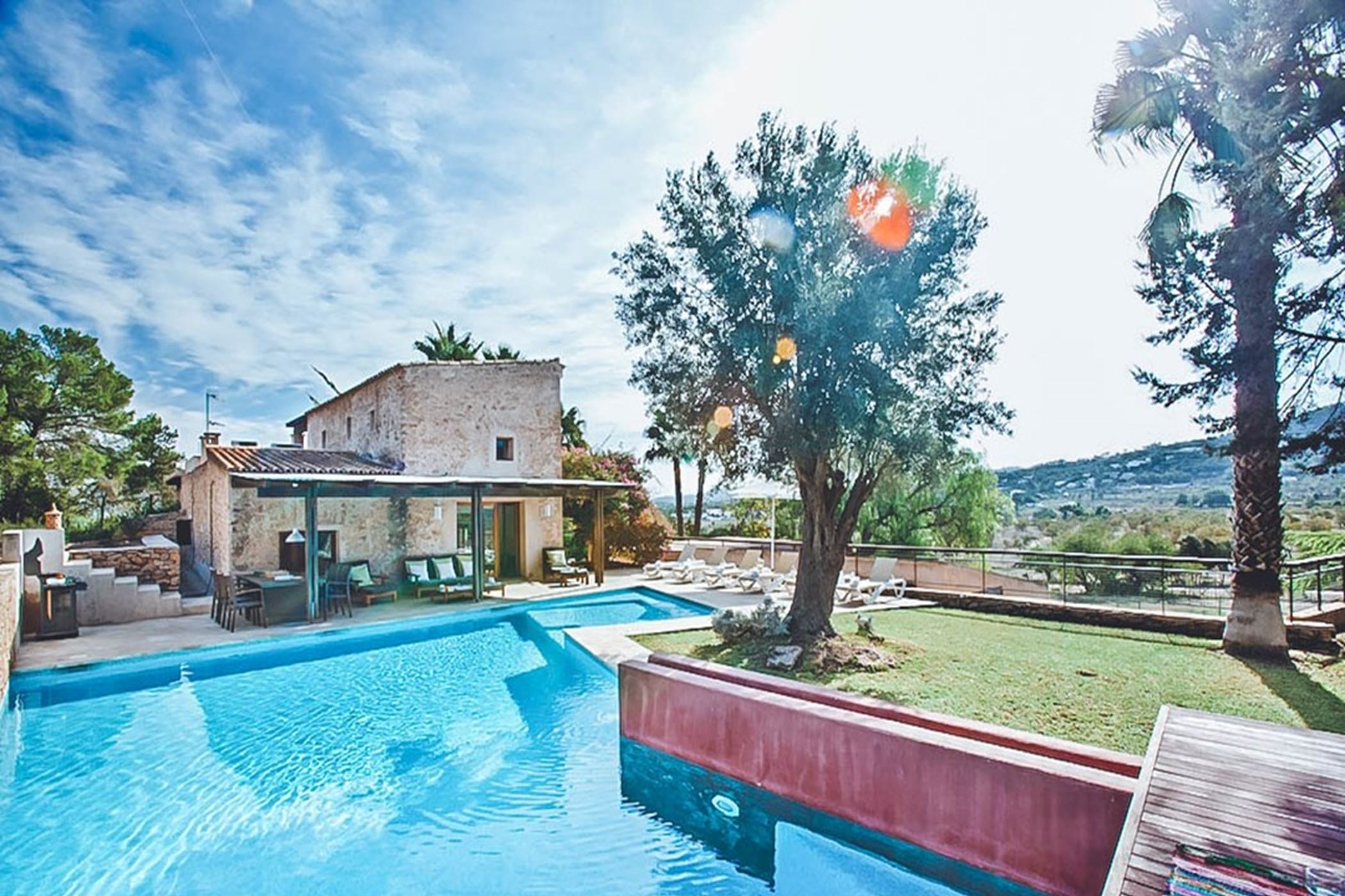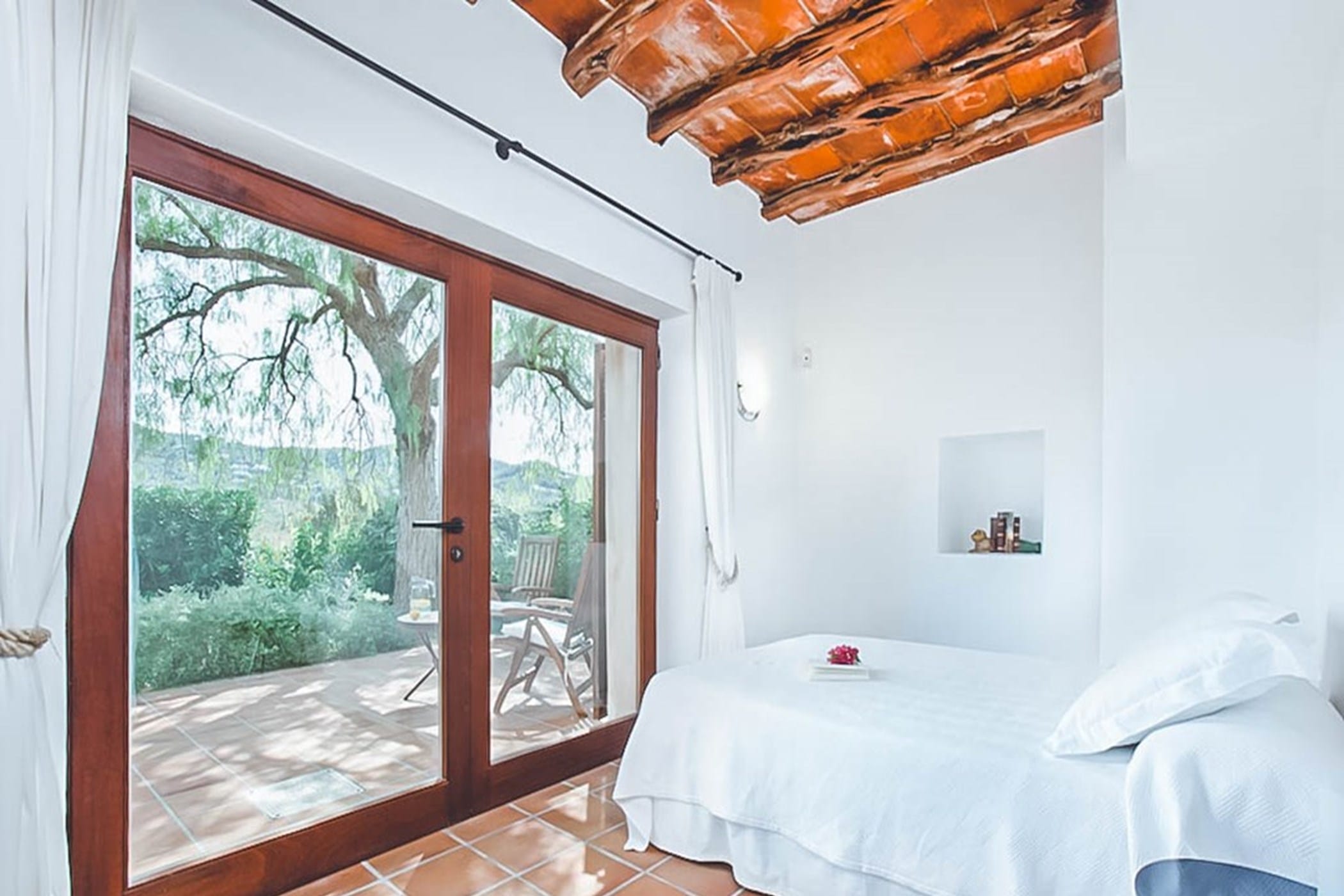The interiors feature terracotta floors, white walls, and wooden beamed ceilings, complemented by contemporary design and high-quality furnishings. The main house includes a bright kitchen with a breakfast area, indoor dining space, and a spacious lounge that opens onto the pool terrace. Additional guest accommodation is provided in separate casitas, each with twin beds, en-suite bathrooms, and private terrace access, ensuring comfort and privacy.