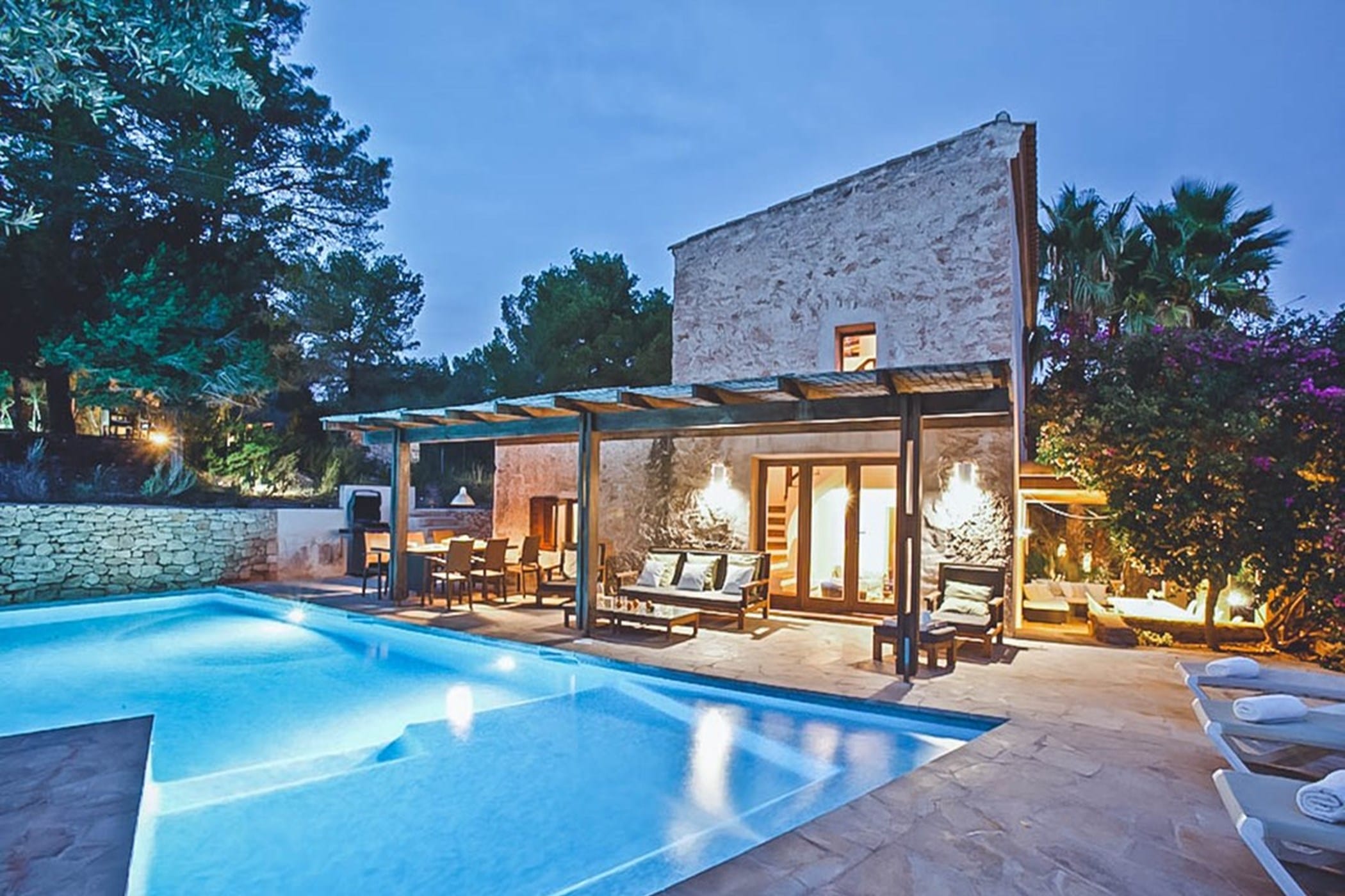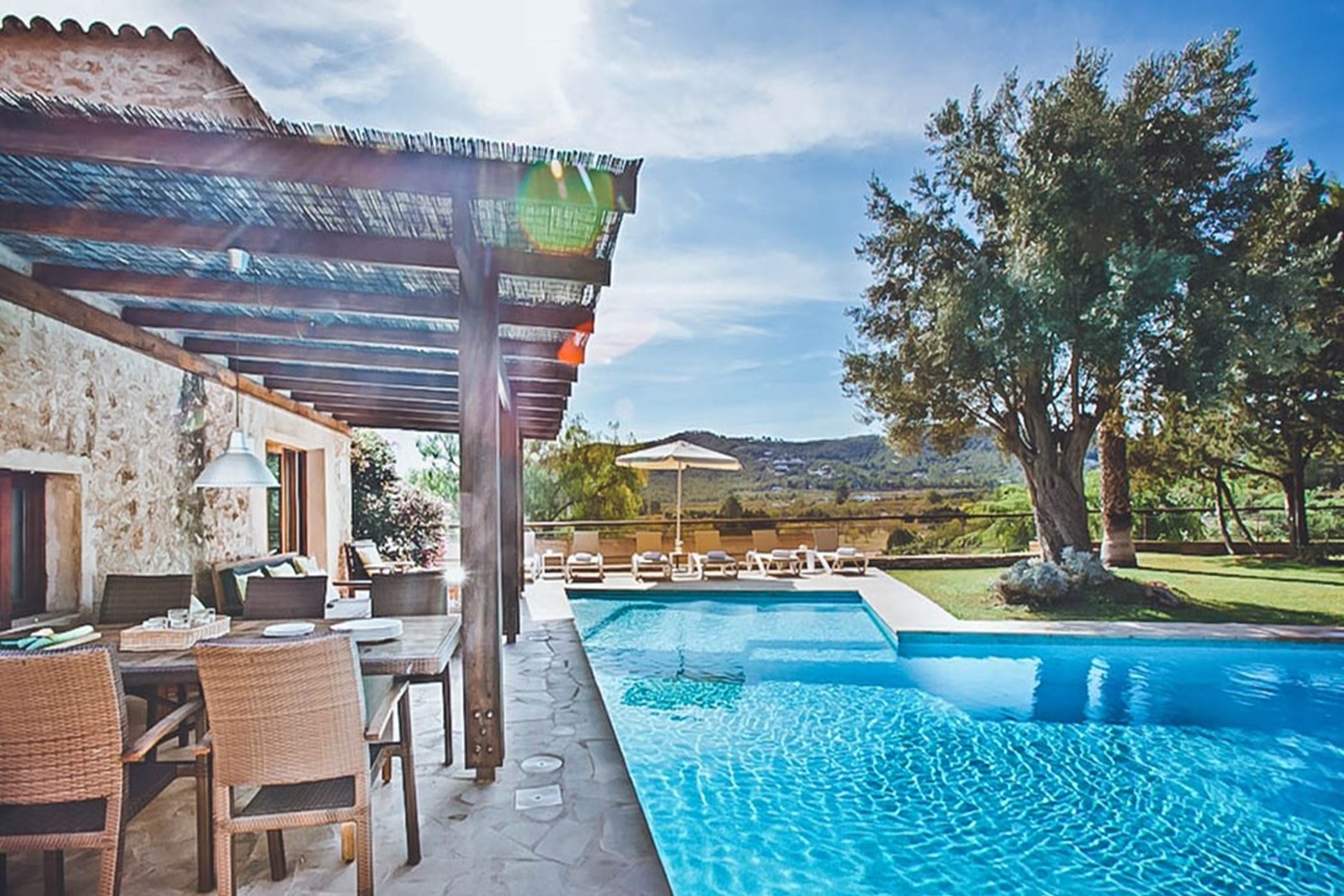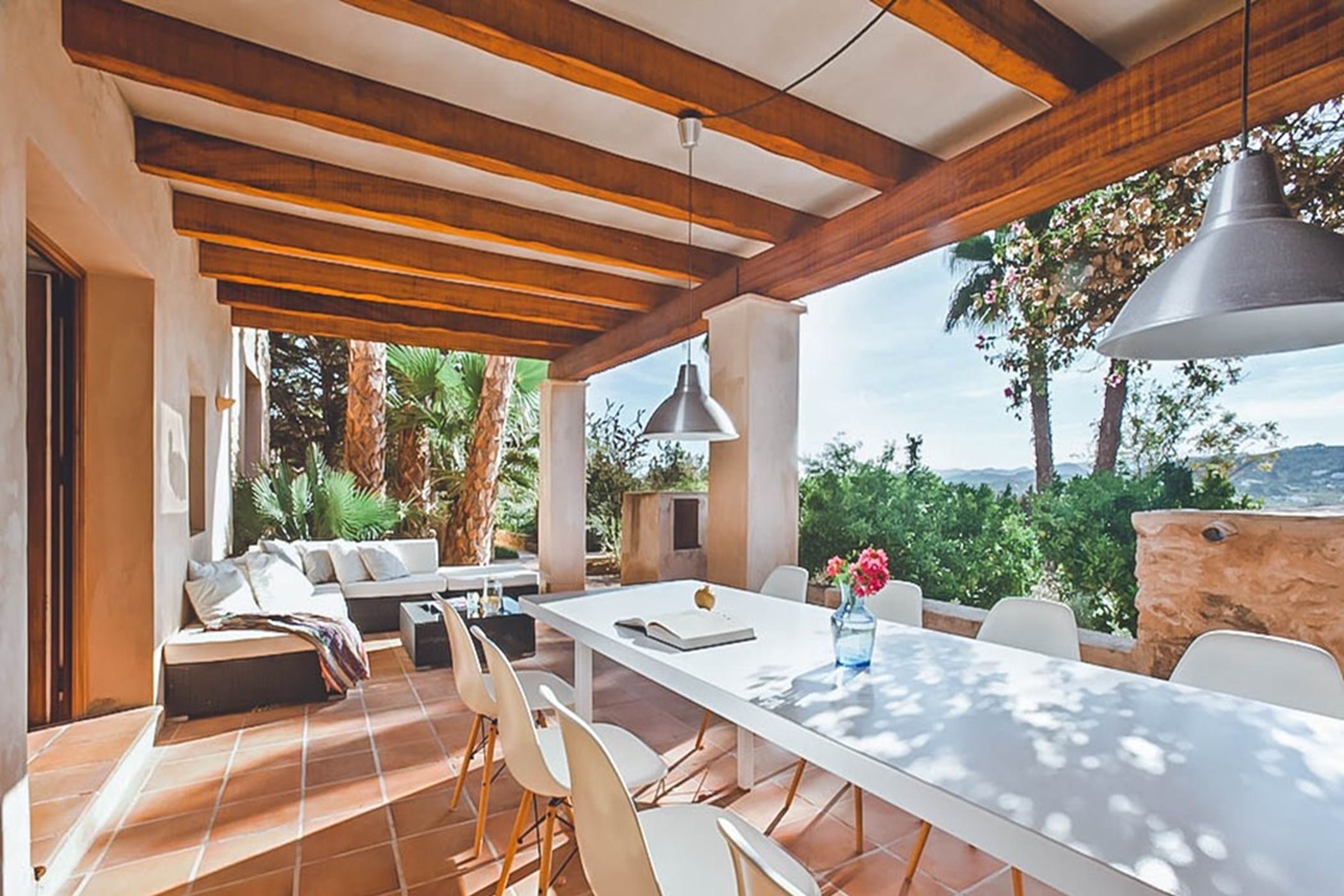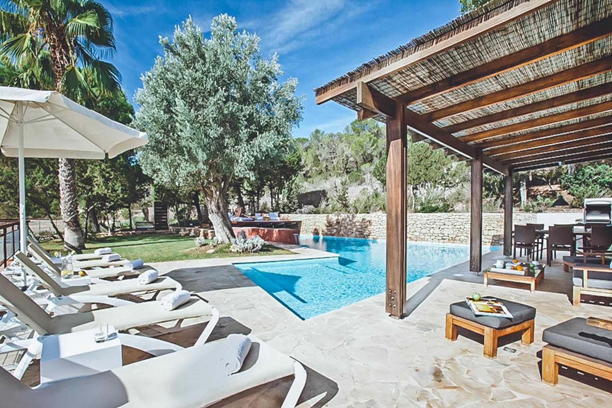 Outdoors, the villa offers an L-shaped pool, wooden decking, and multiple terraces with shaded dining areas and seating spaces. Surrounded by gardens and designed for relaxed outdoor living, it provides the perfect setting to enjoy Ibiza’s renowned sunsets in a tranquil and inviting atmosphere.