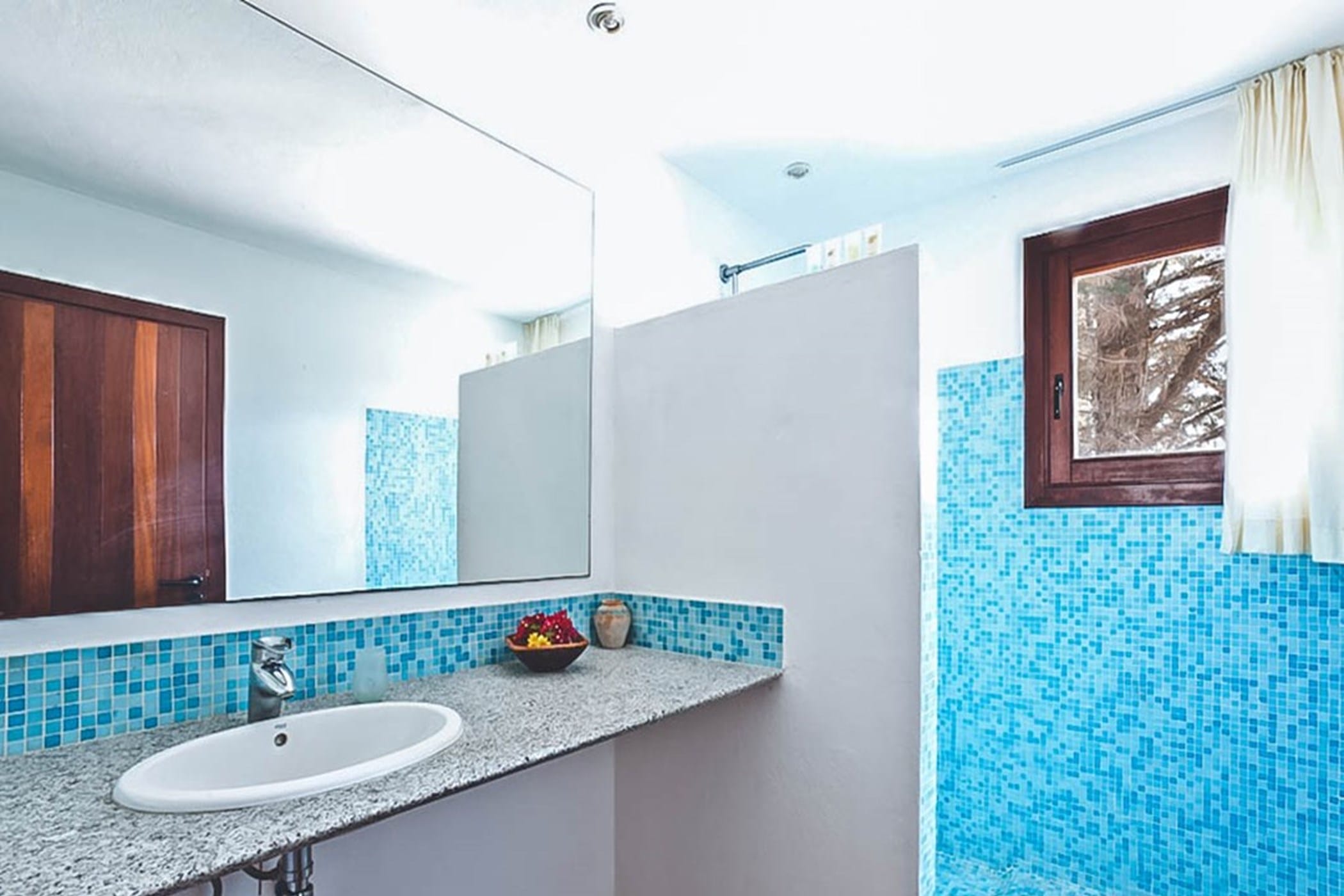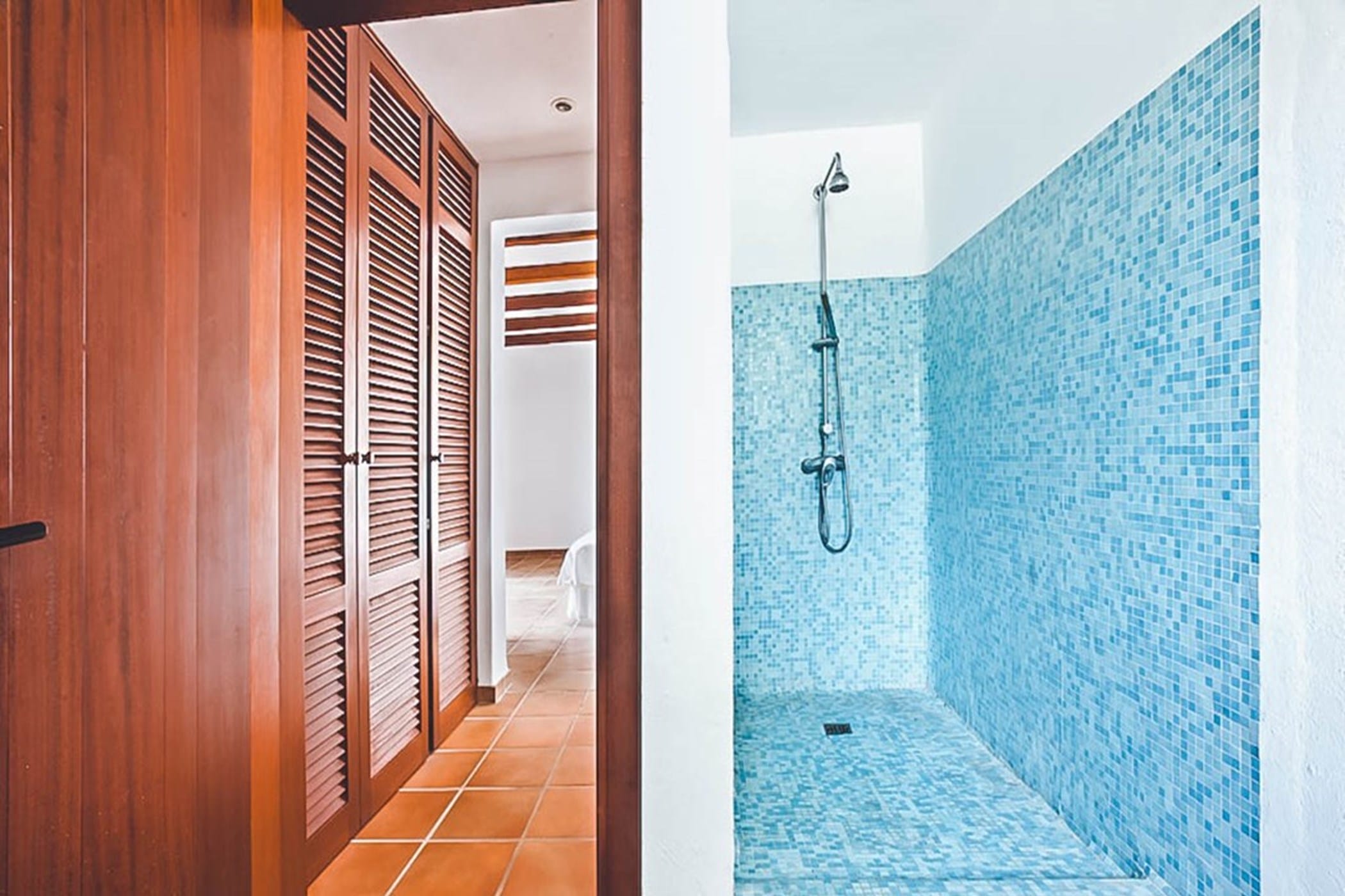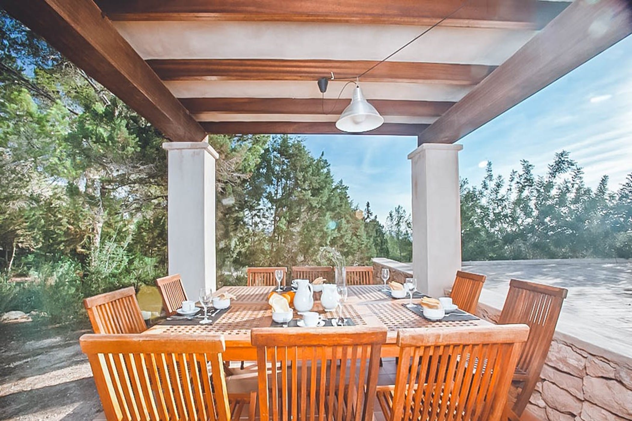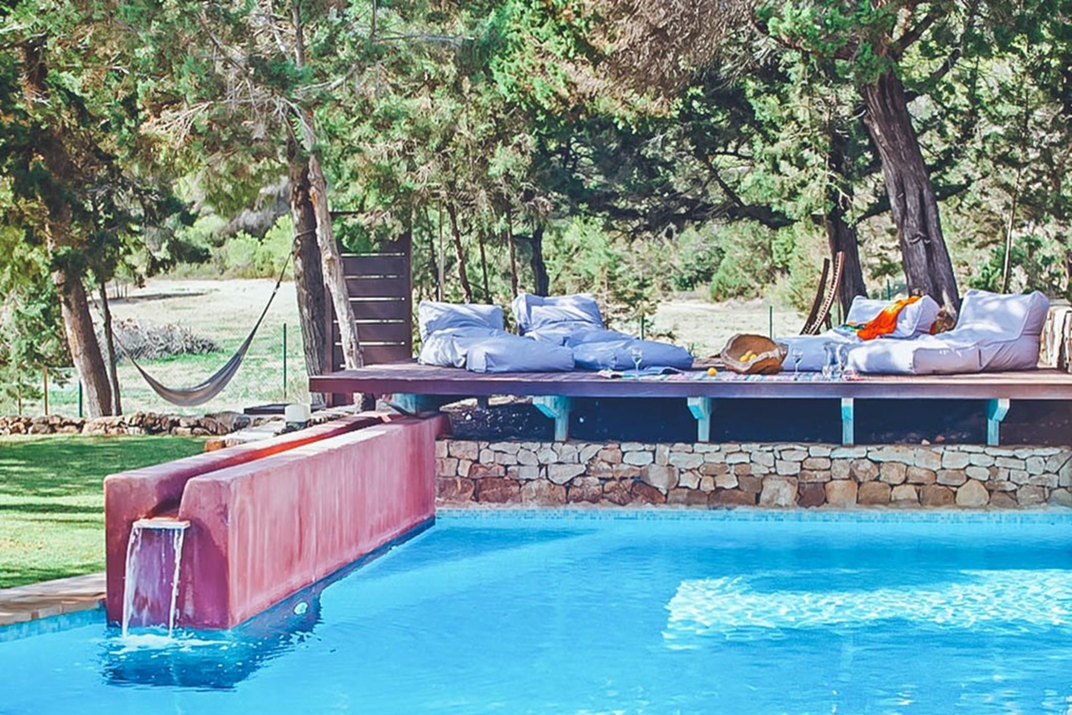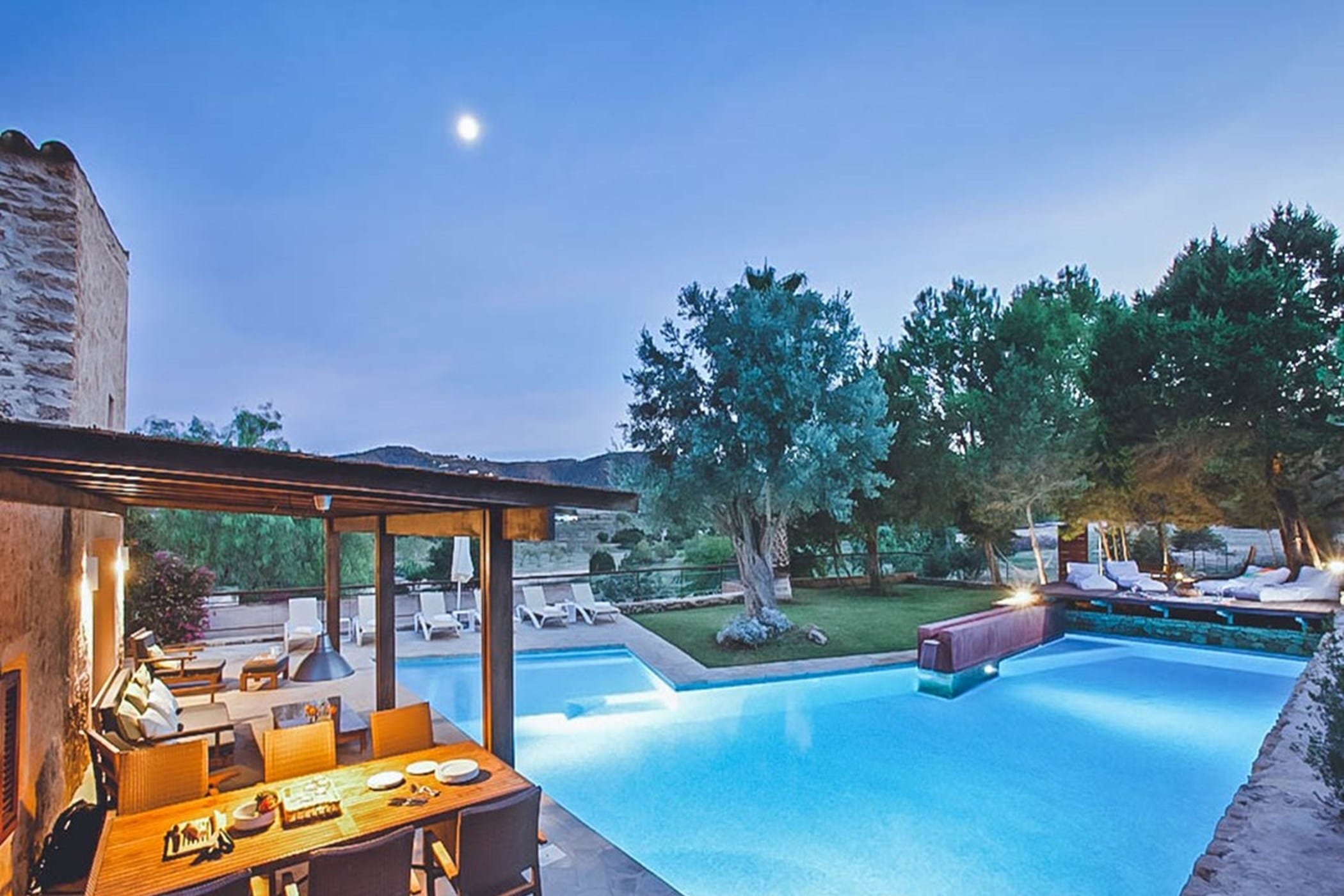 Outdoors, the villa offers an L-shaped pool, wooden decking, and multiple terraces with shaded dining areas and seating spaces. Surrounded by gardens and designed for relaxed outdoor living, it provides the perfect setting to enjoy Ibiza’s renowned sunsets in a tranquil and inviting atmosphere.