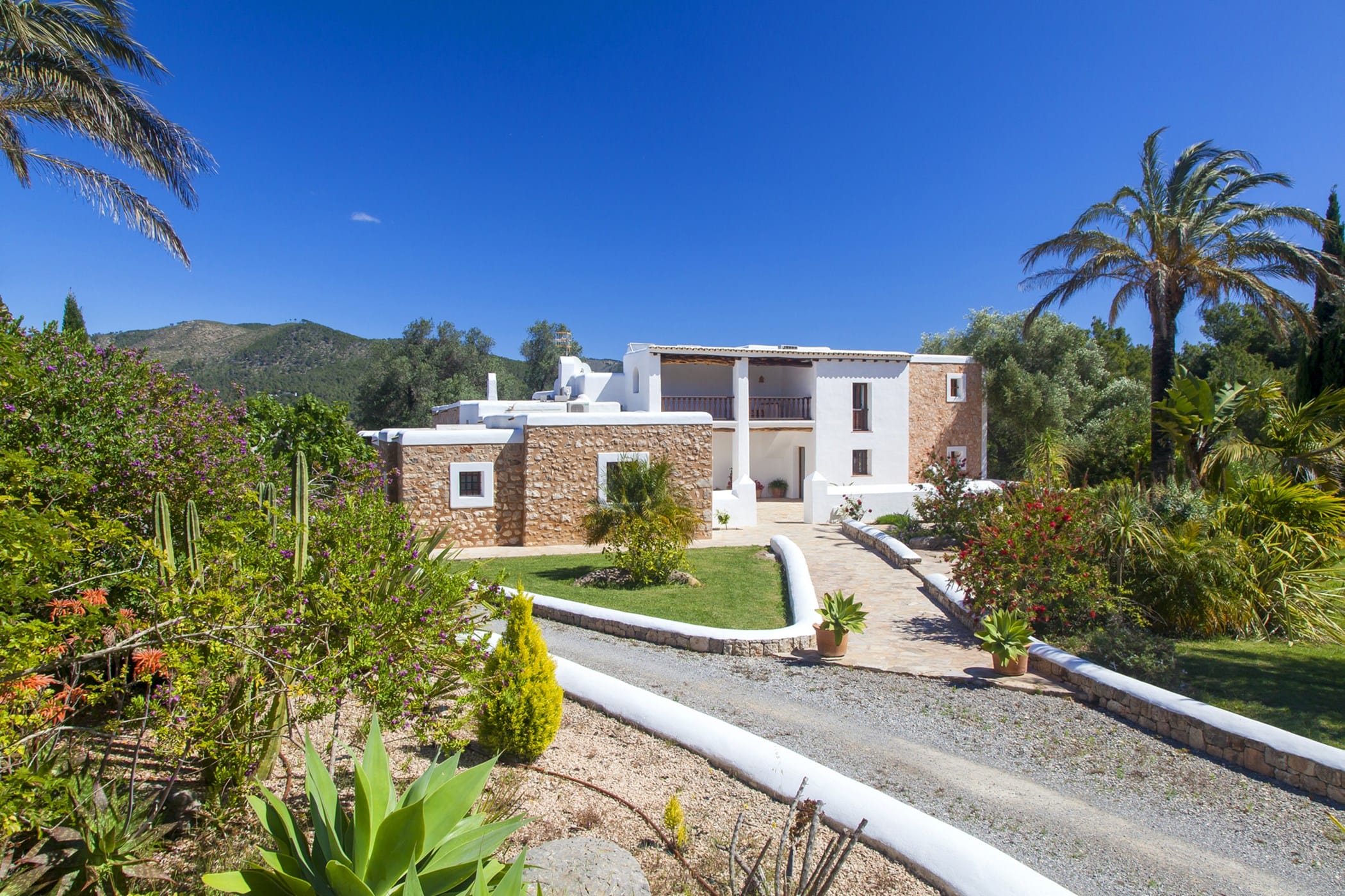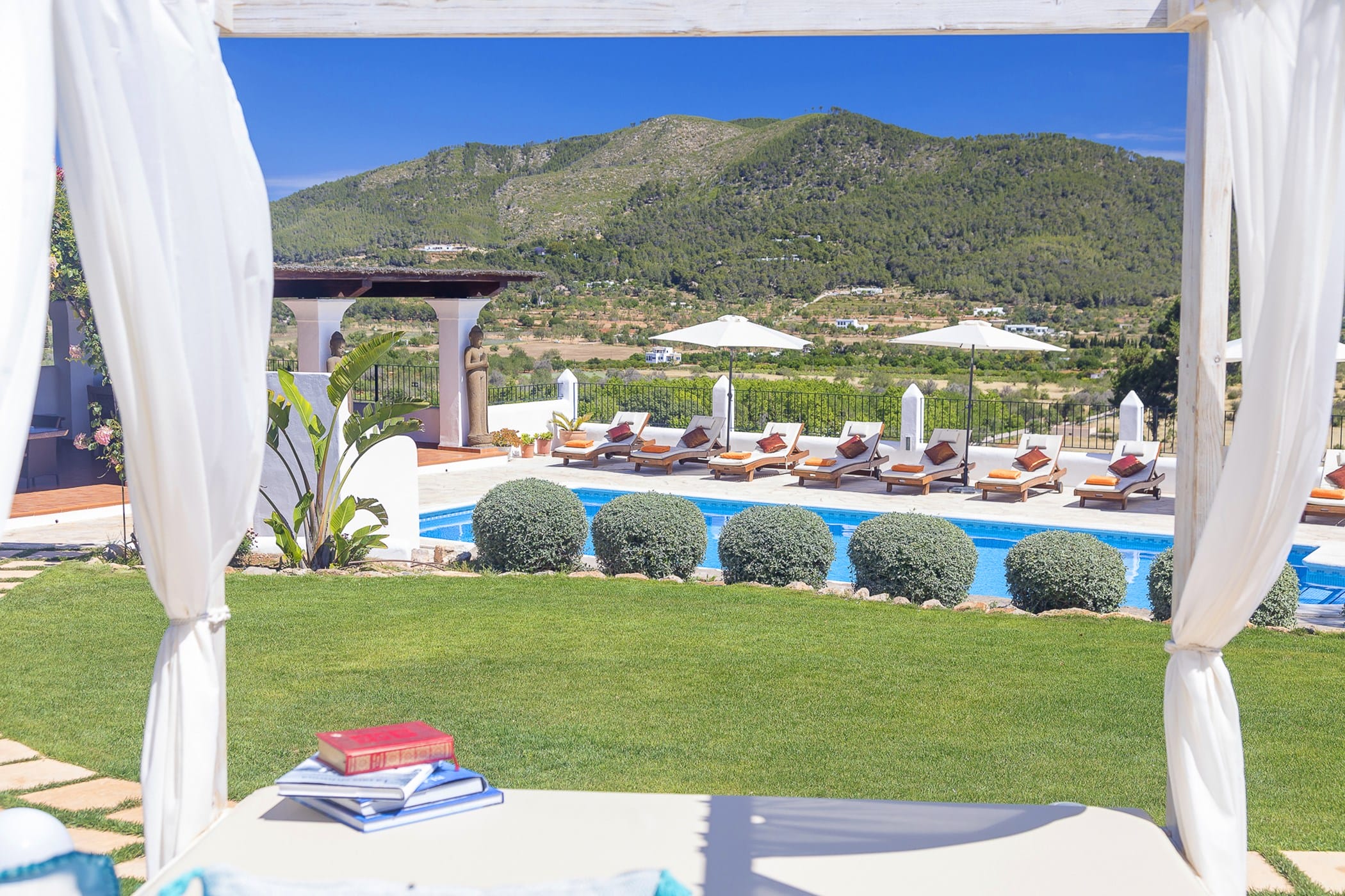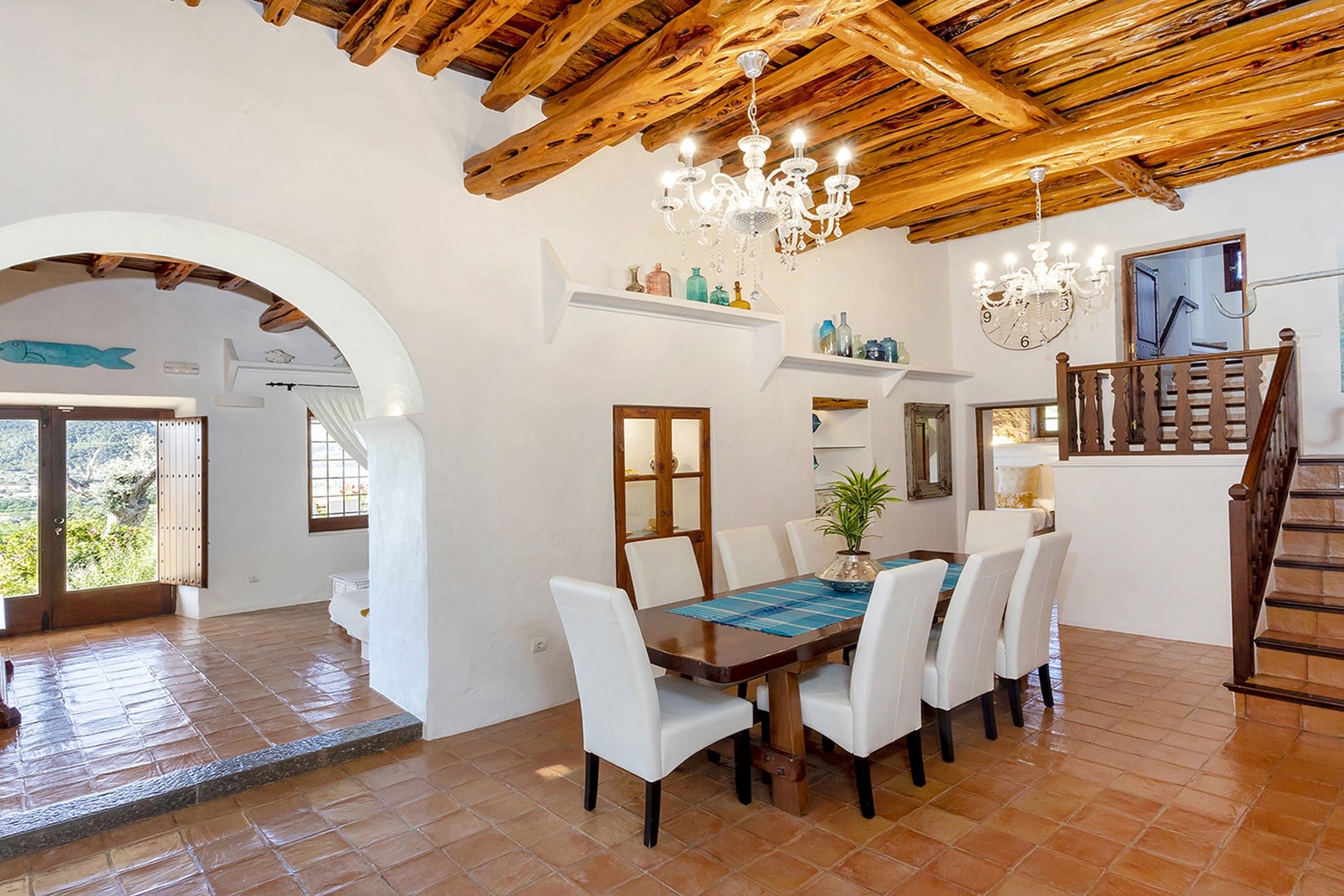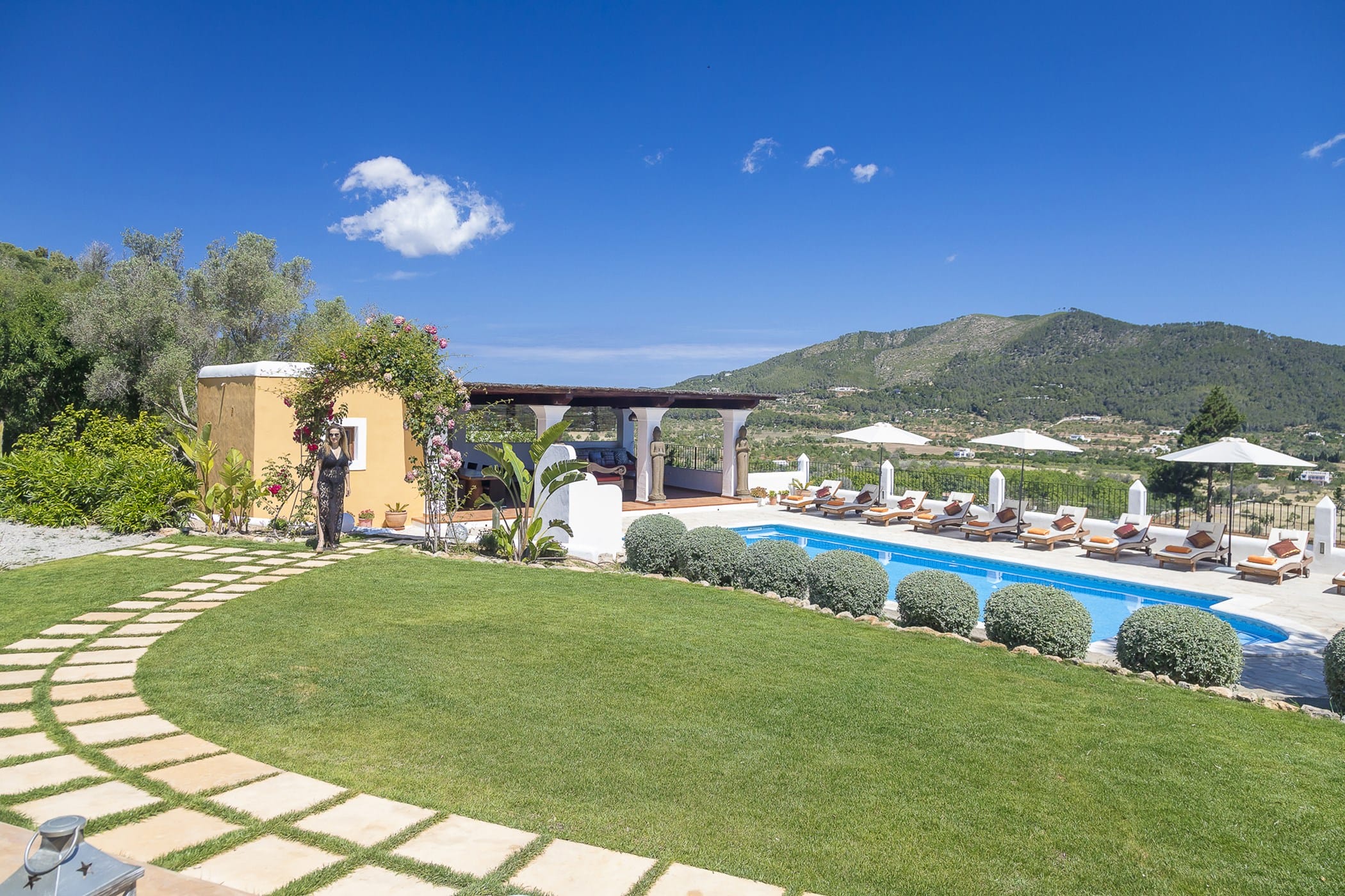 Outdoor living is a key highlight, with a swimming pool overlooking the valley, sun loungers, shaded chill-out areas, and multiple dining spaces. Surrounded by landscaped gardens, the villa offers plenty of areas to relax, dine, and unwind, making it a perfect setting for an authentic and tranquil Ibiza getaway.