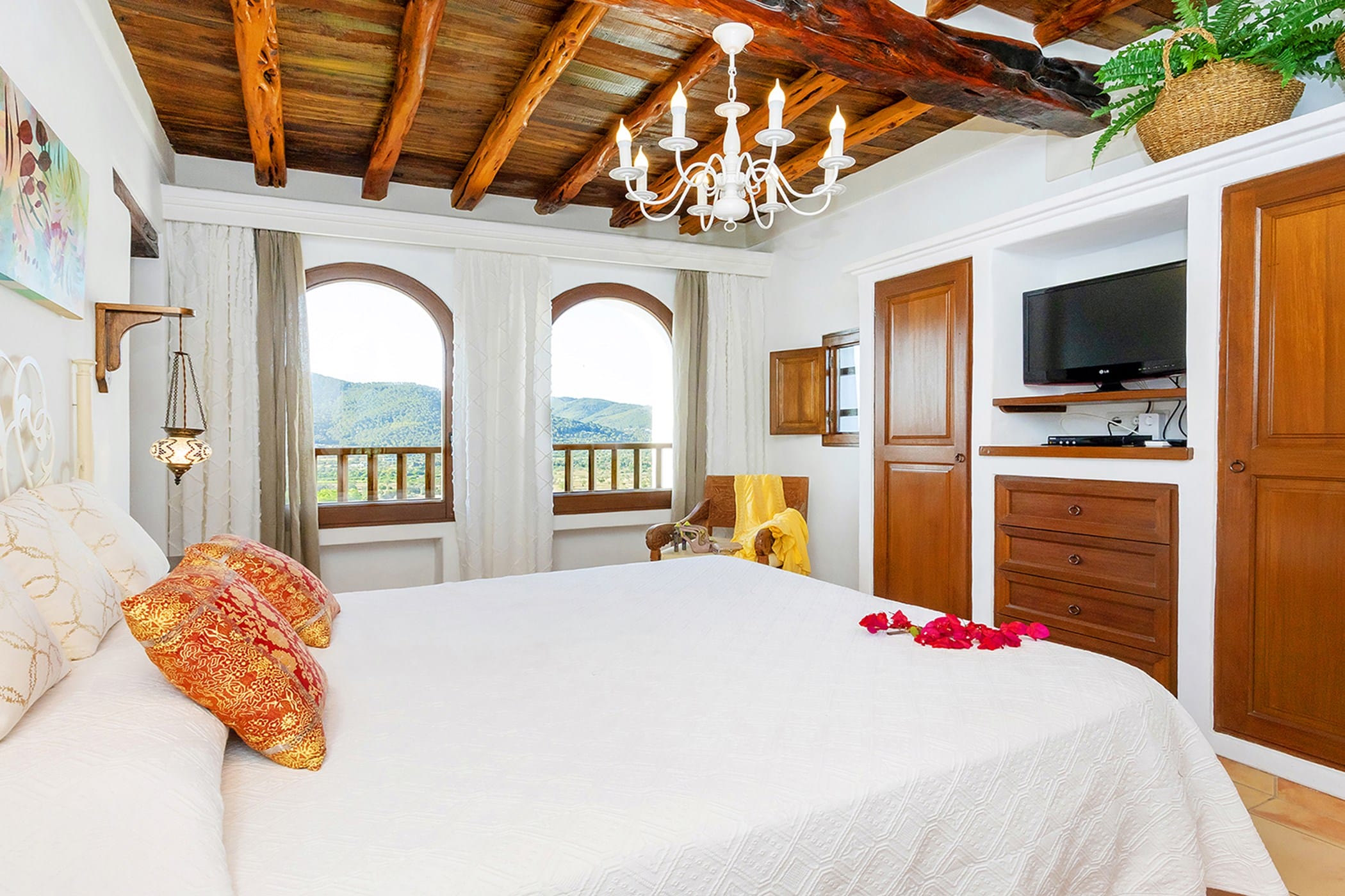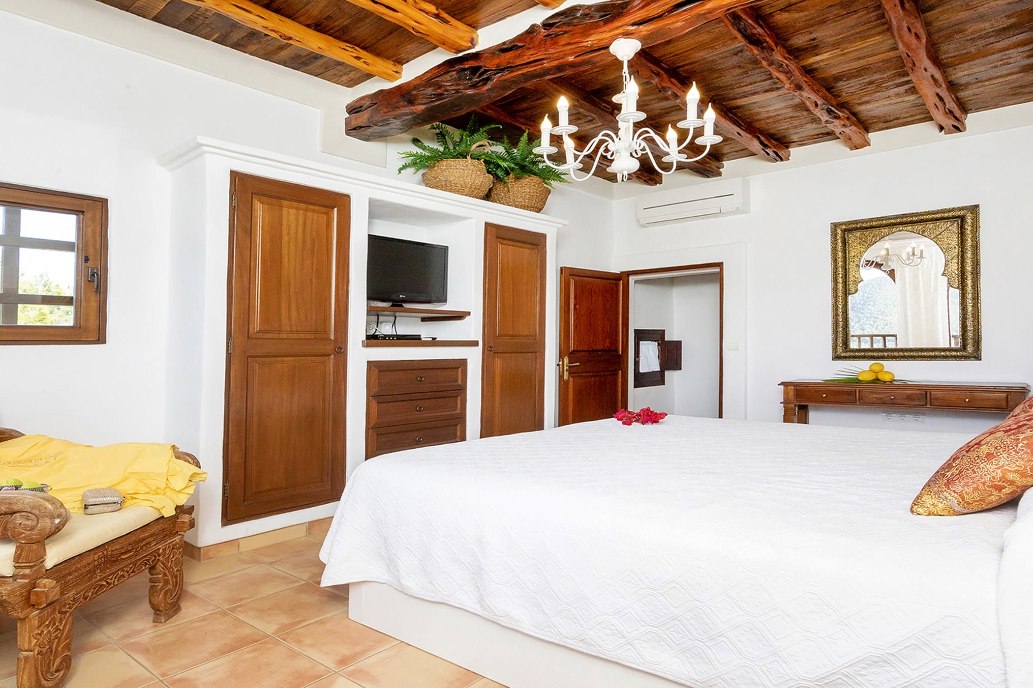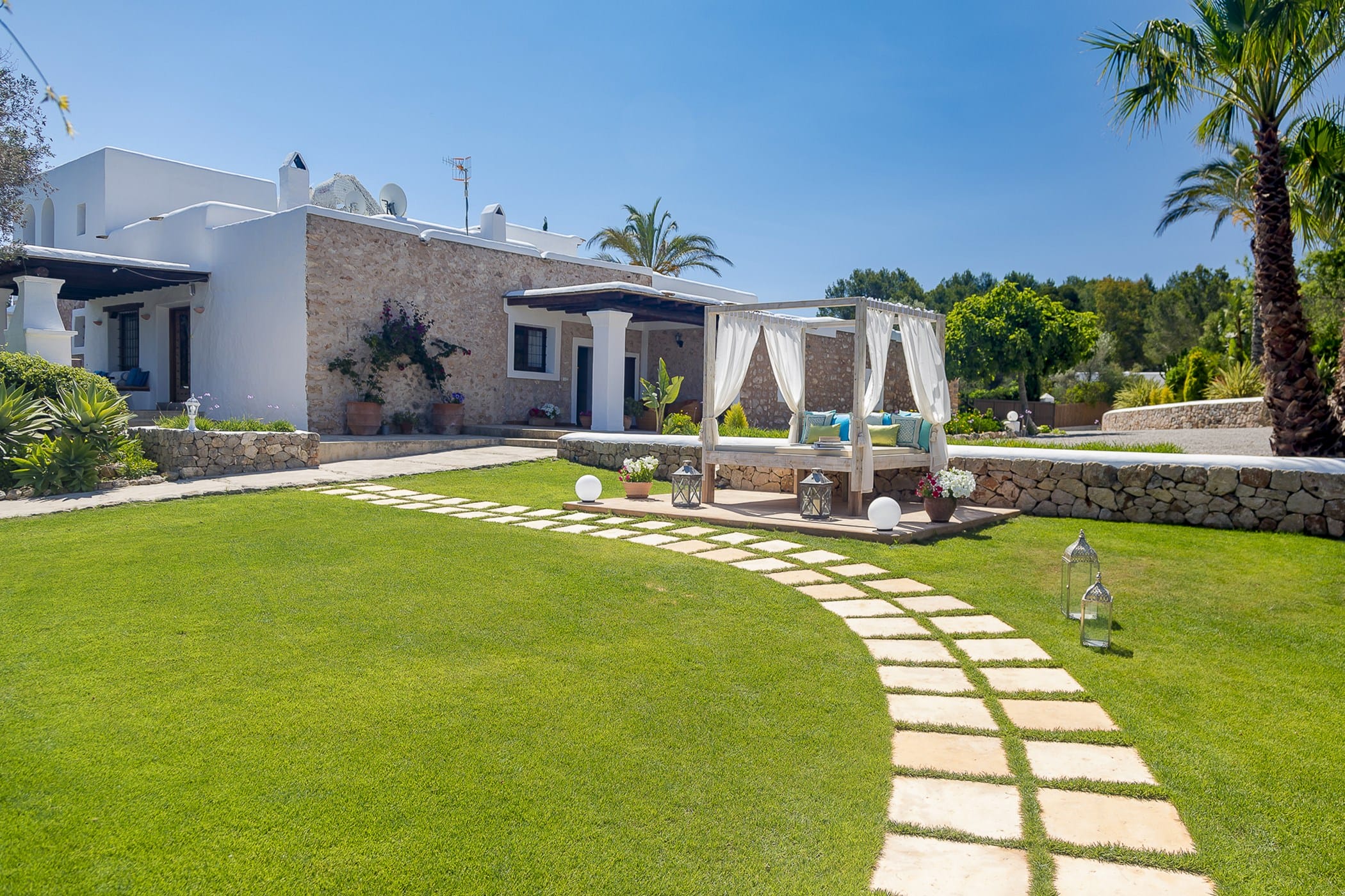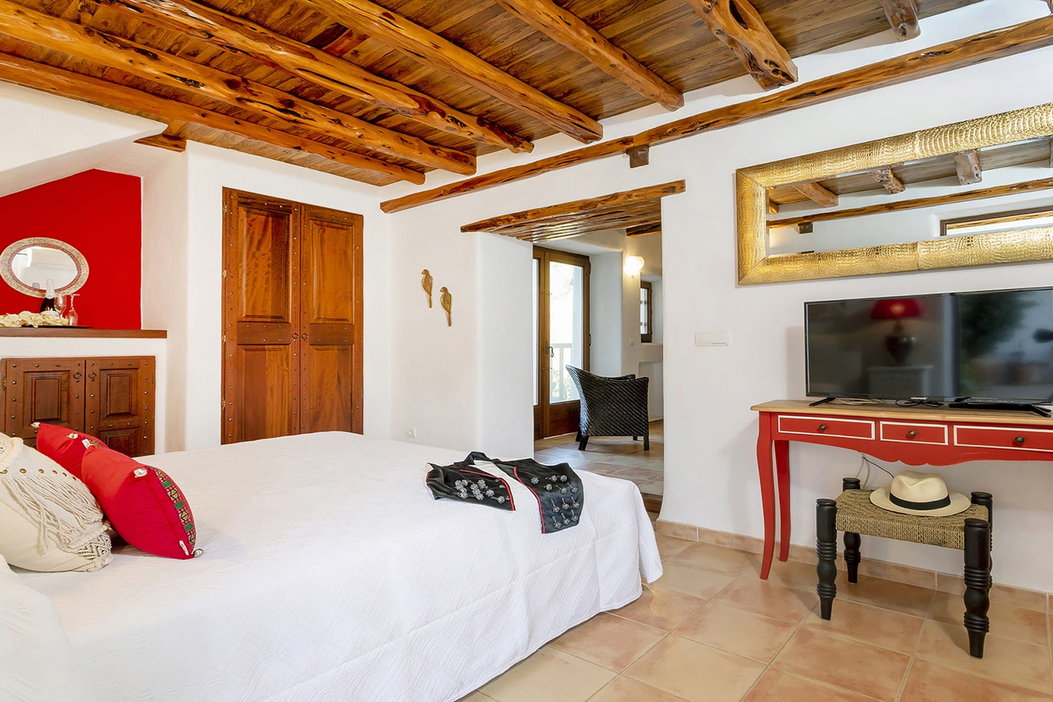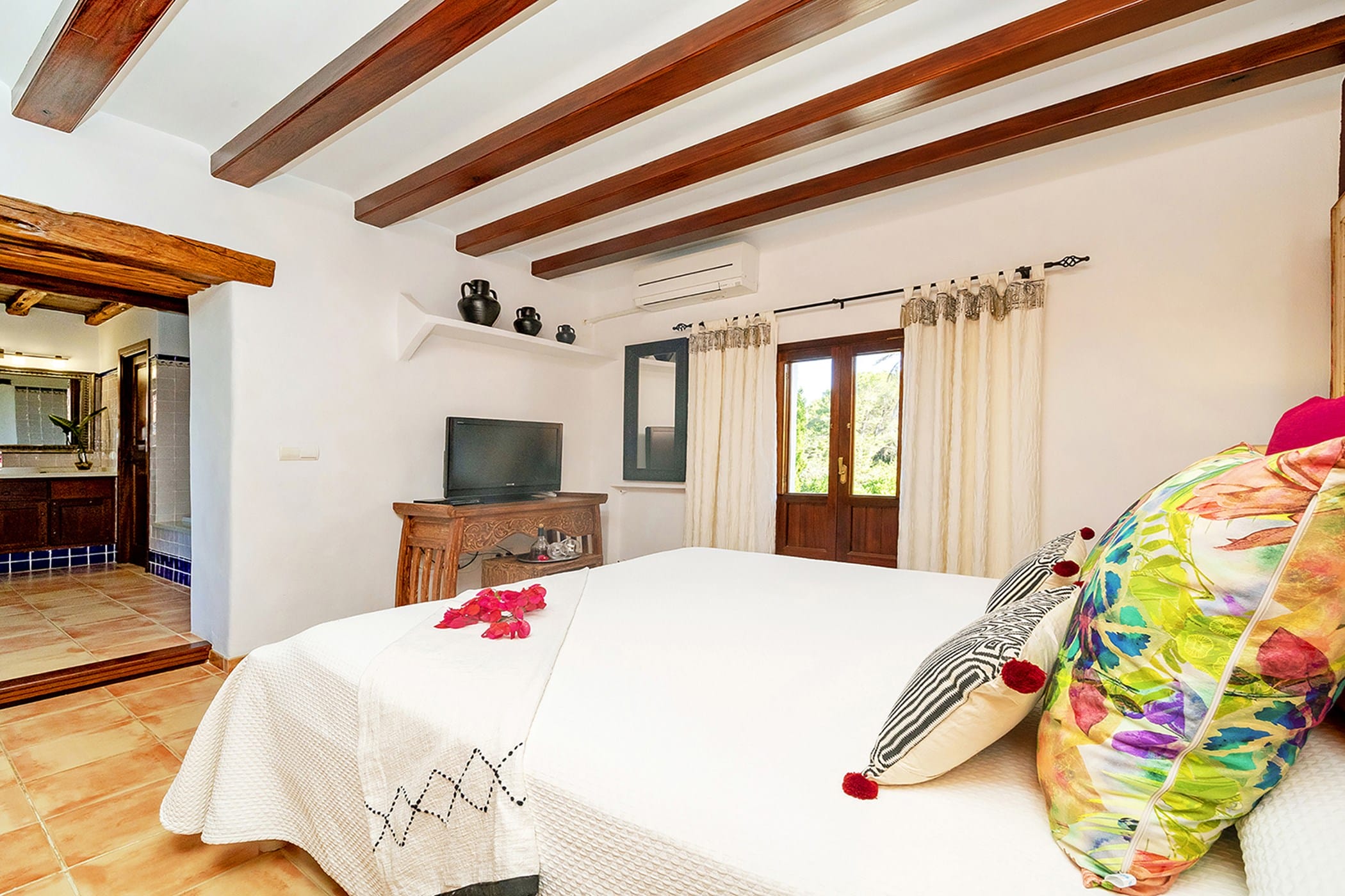 Outdoor living is a key highlight, with a swimming pool overlooking the valley, sun loungers, shaded chill-out areas, and multiple dining spaces. Surrounded by landscaped gardens, the villa offers plenty of areas to relax, dine, and unwind, making it a perfect setting for an authentic and tranquil Ibiza getaway.