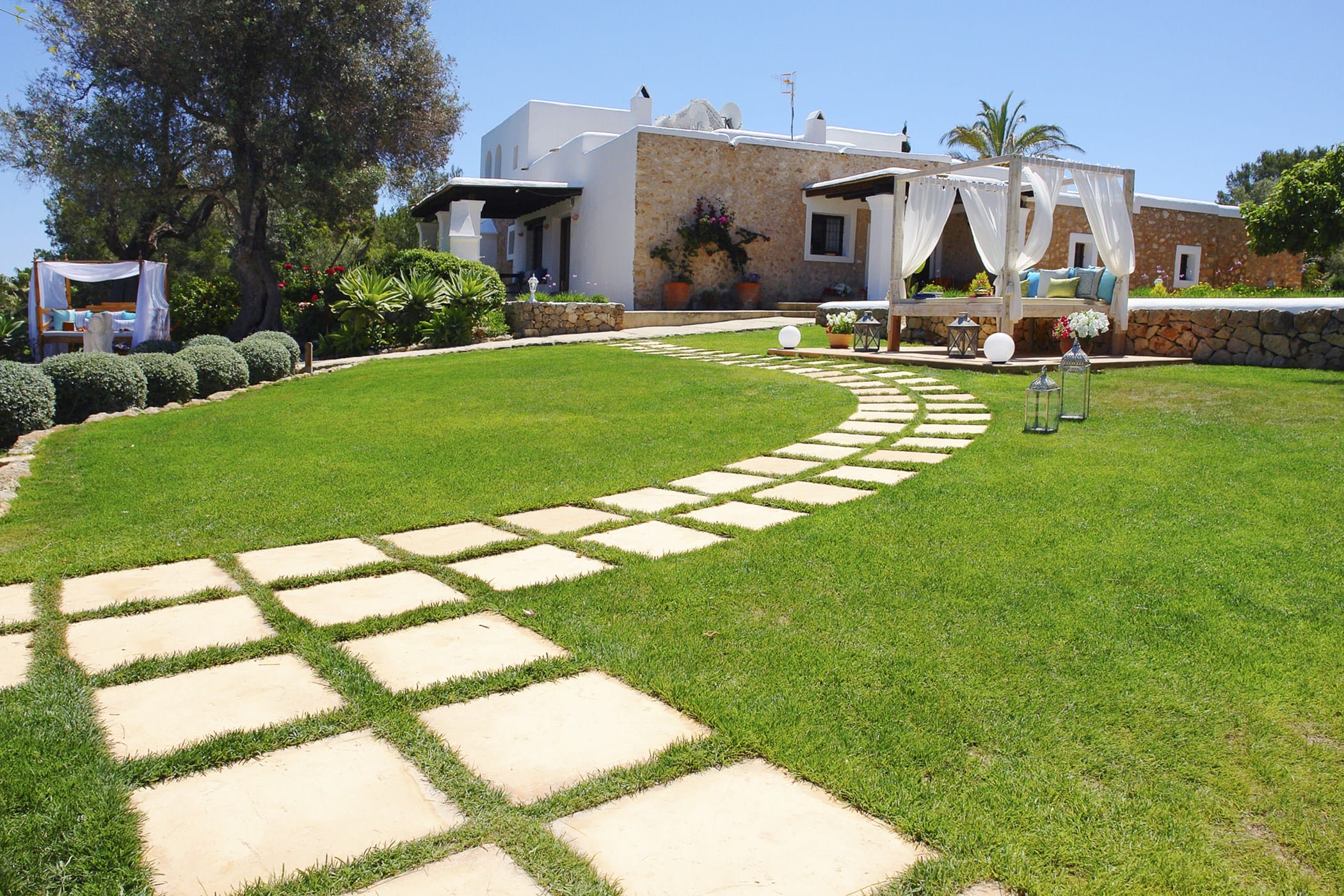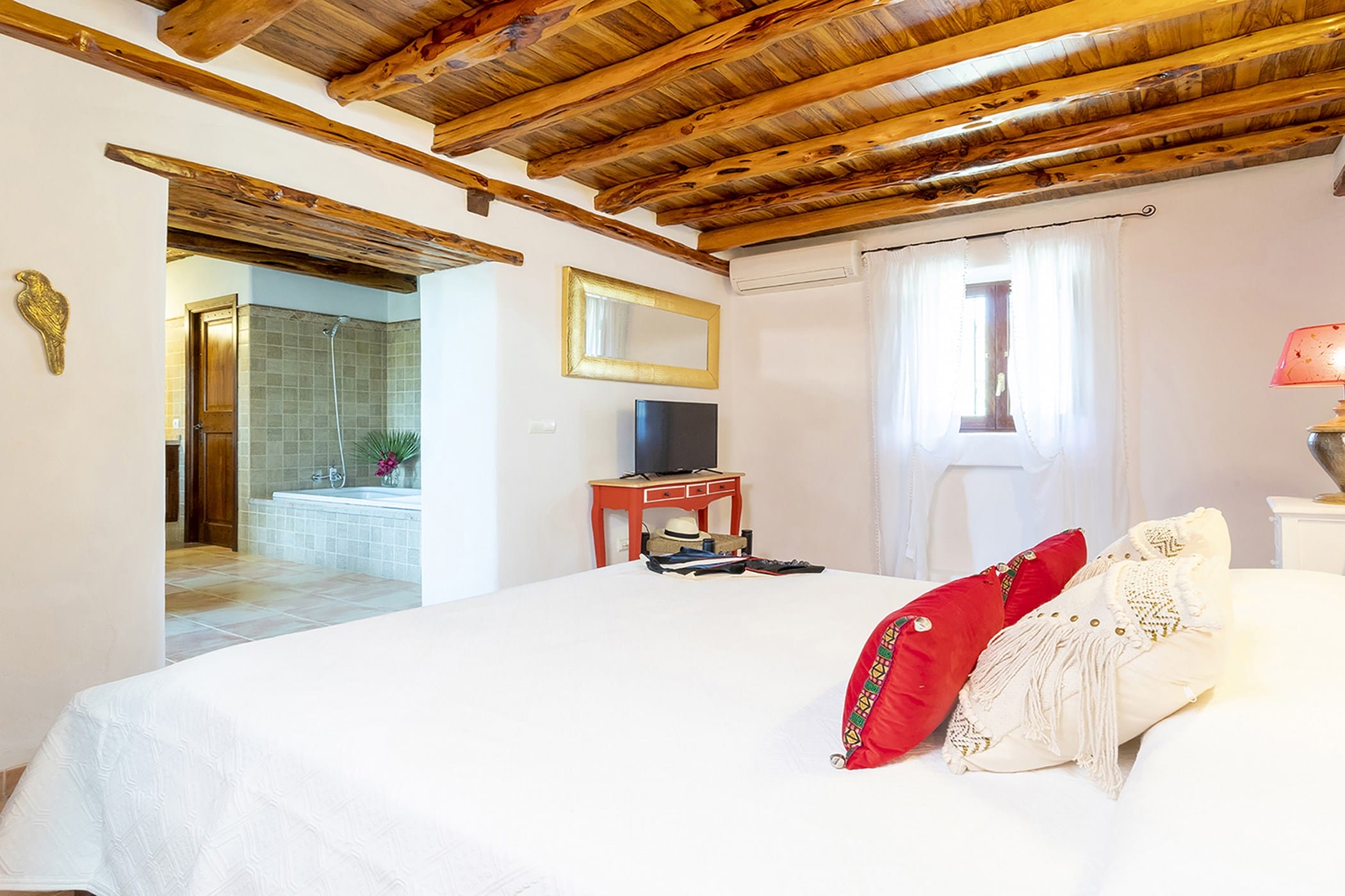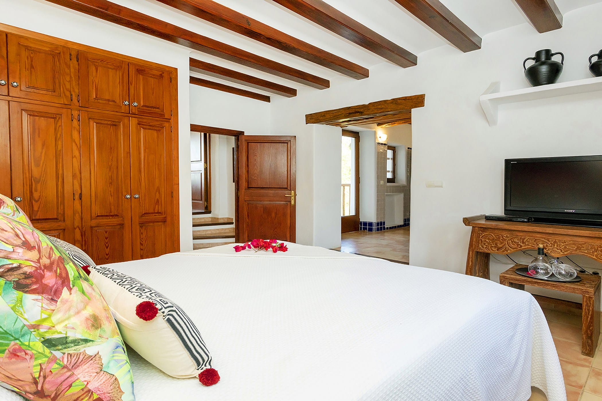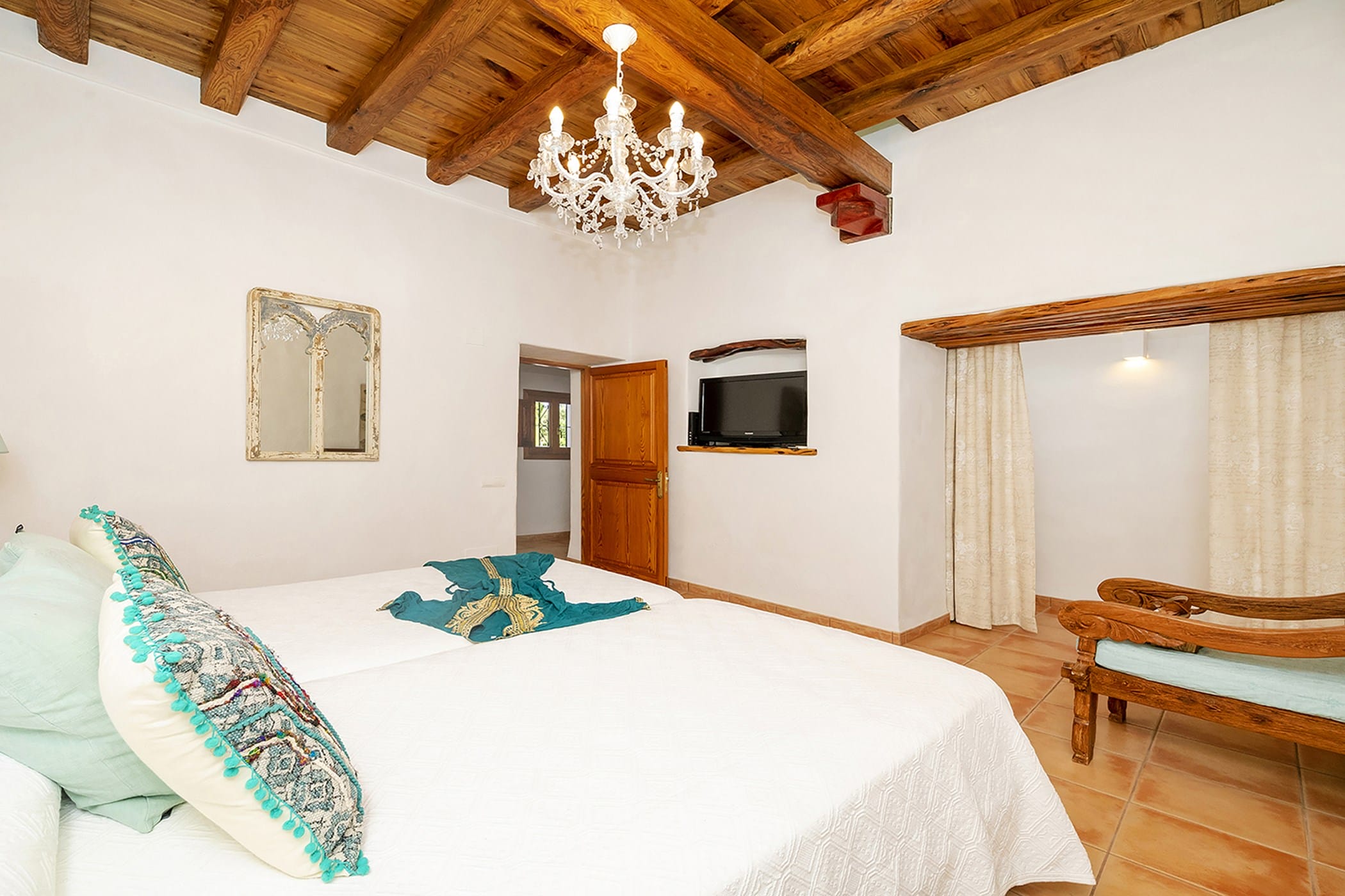 Outdoor living is a key highlight, with a swimming pool overlooking the valley, sun loungers, shaded chill-out areas, and multiple dining spaces. Surrounded by landscaped gardens, the villa offers plenty of areas to relax, dine, and unwind, making it a perfect setting for an authentic and tranquil Ibiza getaway.