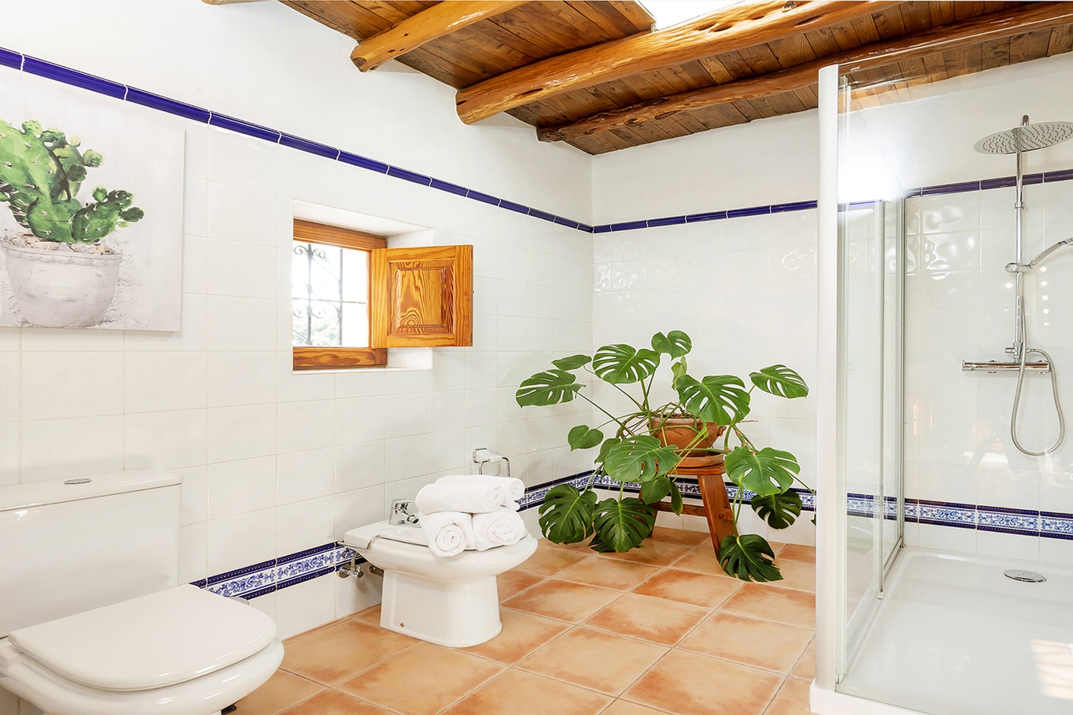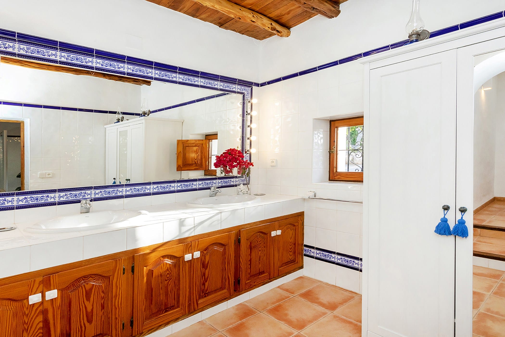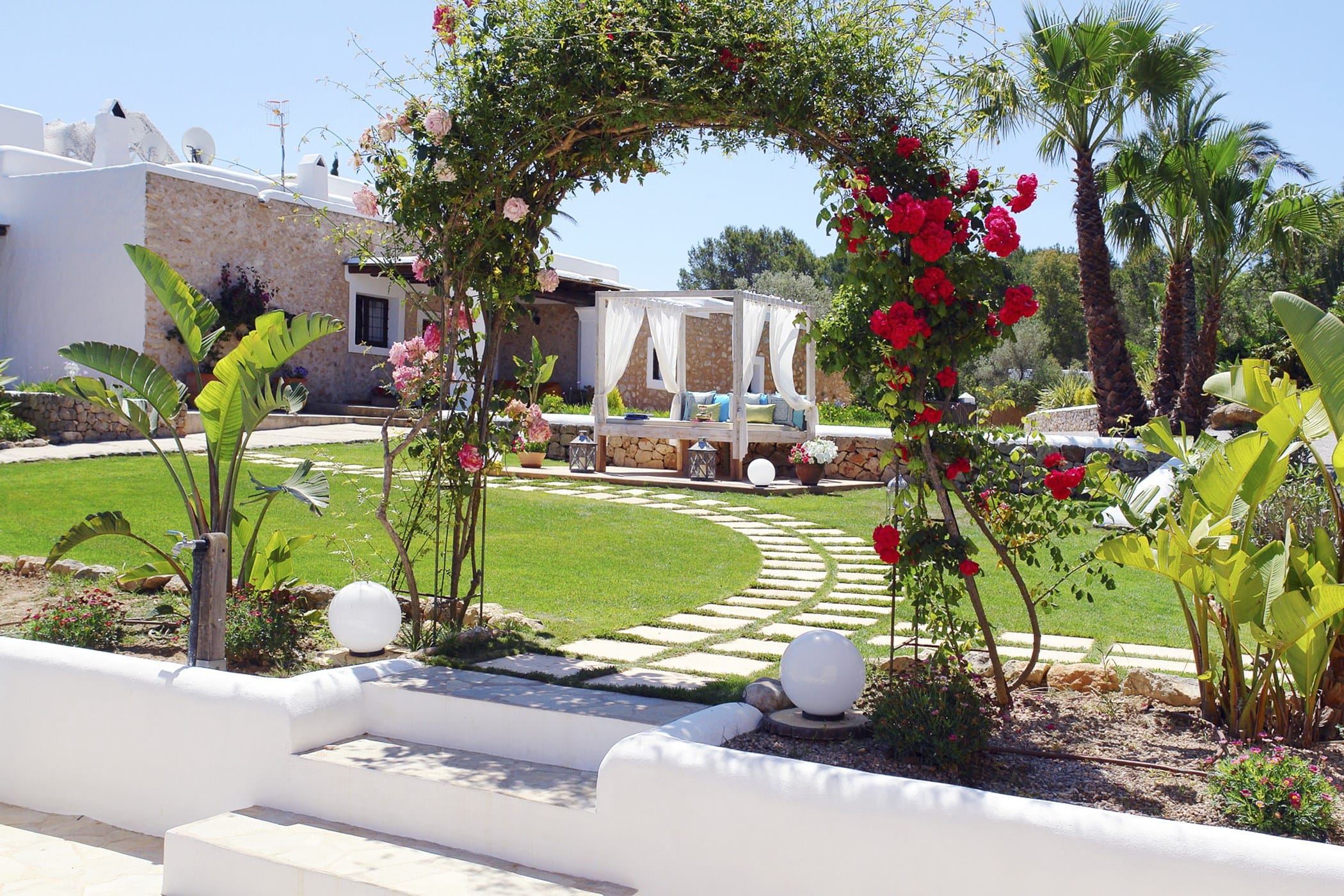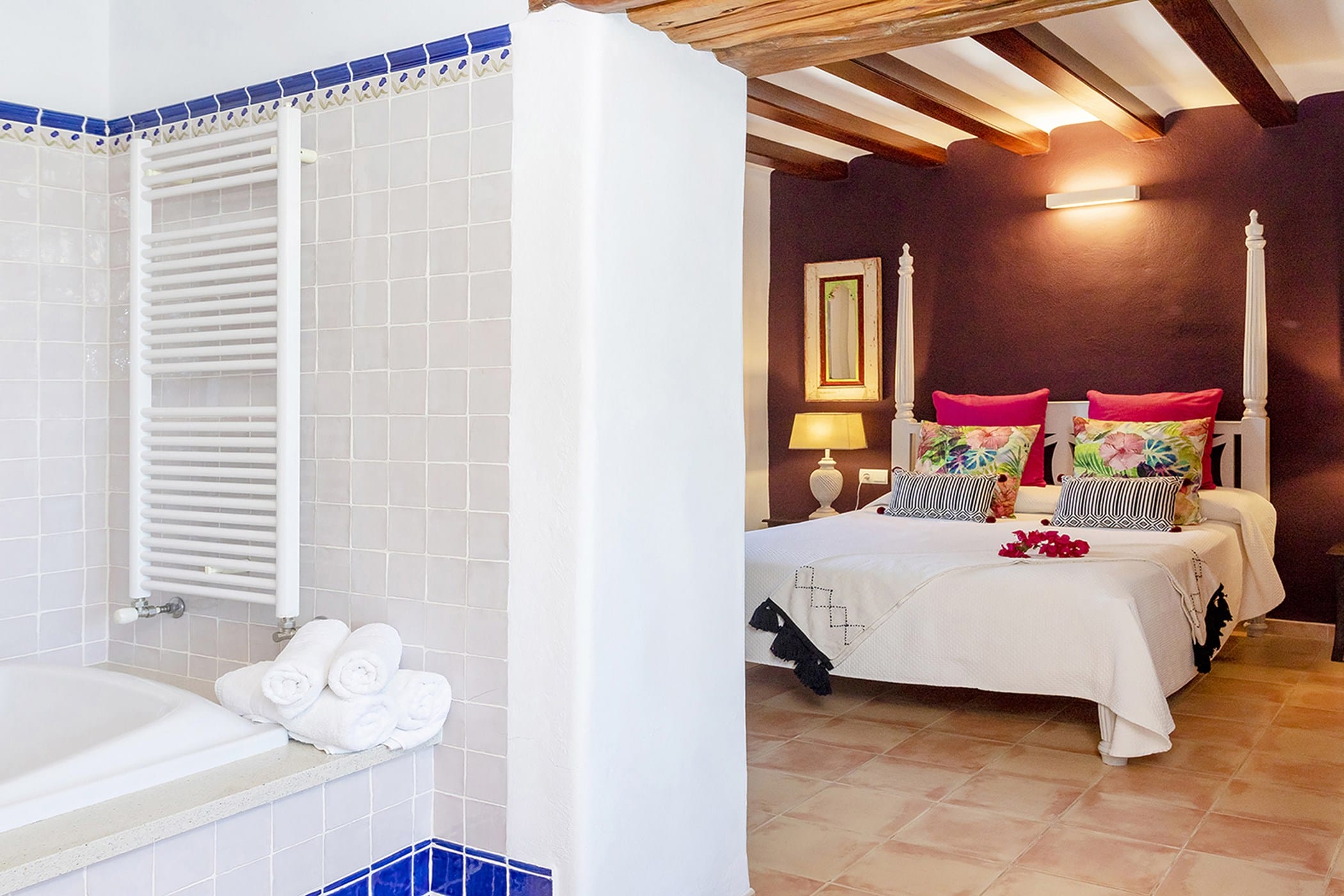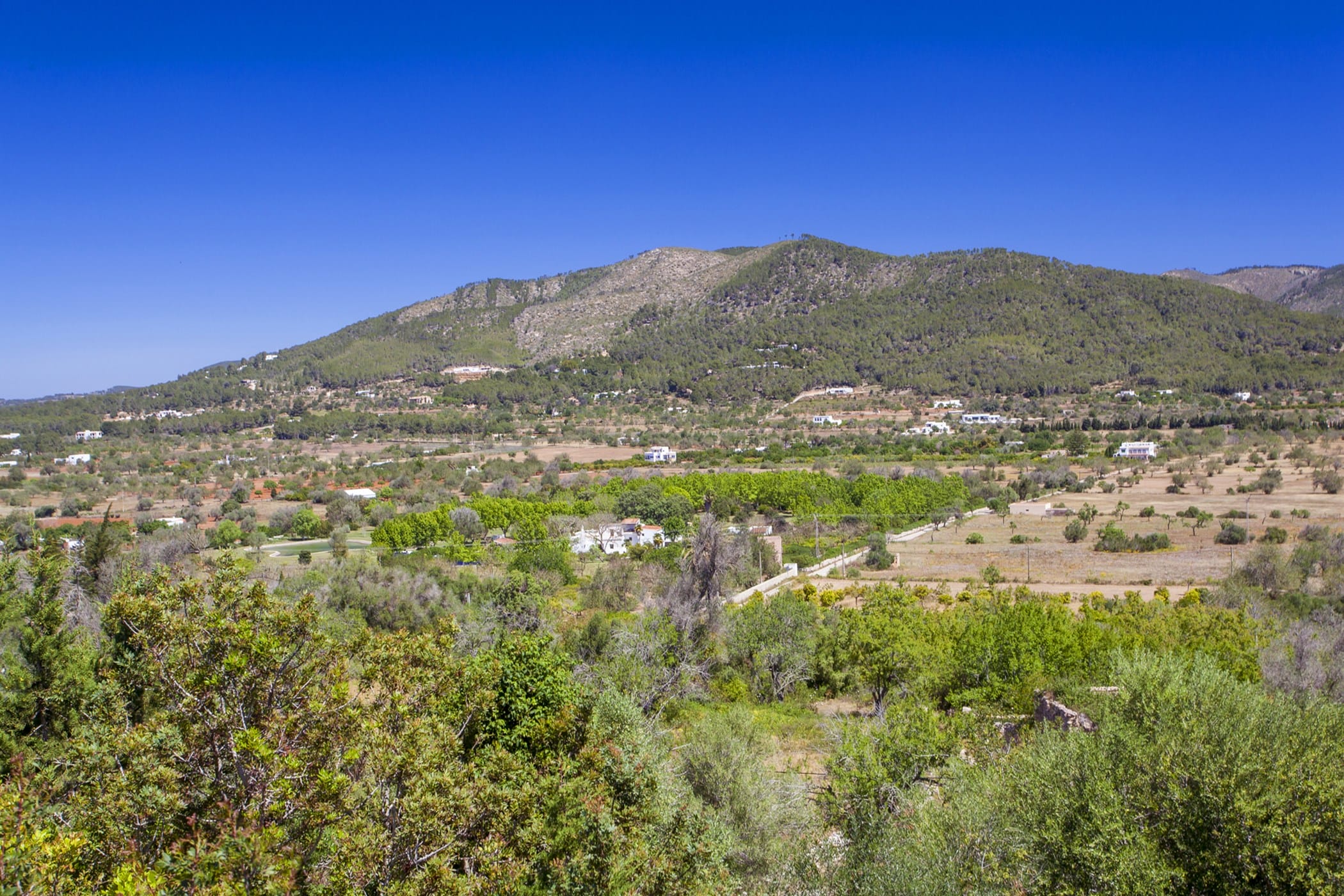 Outdoor living is a key highlight, with a swimming pool overlooking the valley, sun loungers, shaded chill-out areas, and multiple dining spaces. Surrounded by landscaped gardens, the villa offers plenty of areas to relax, dine, and unwind, making it a perfect setting for an authentic and tranquil Ibiza getaway.