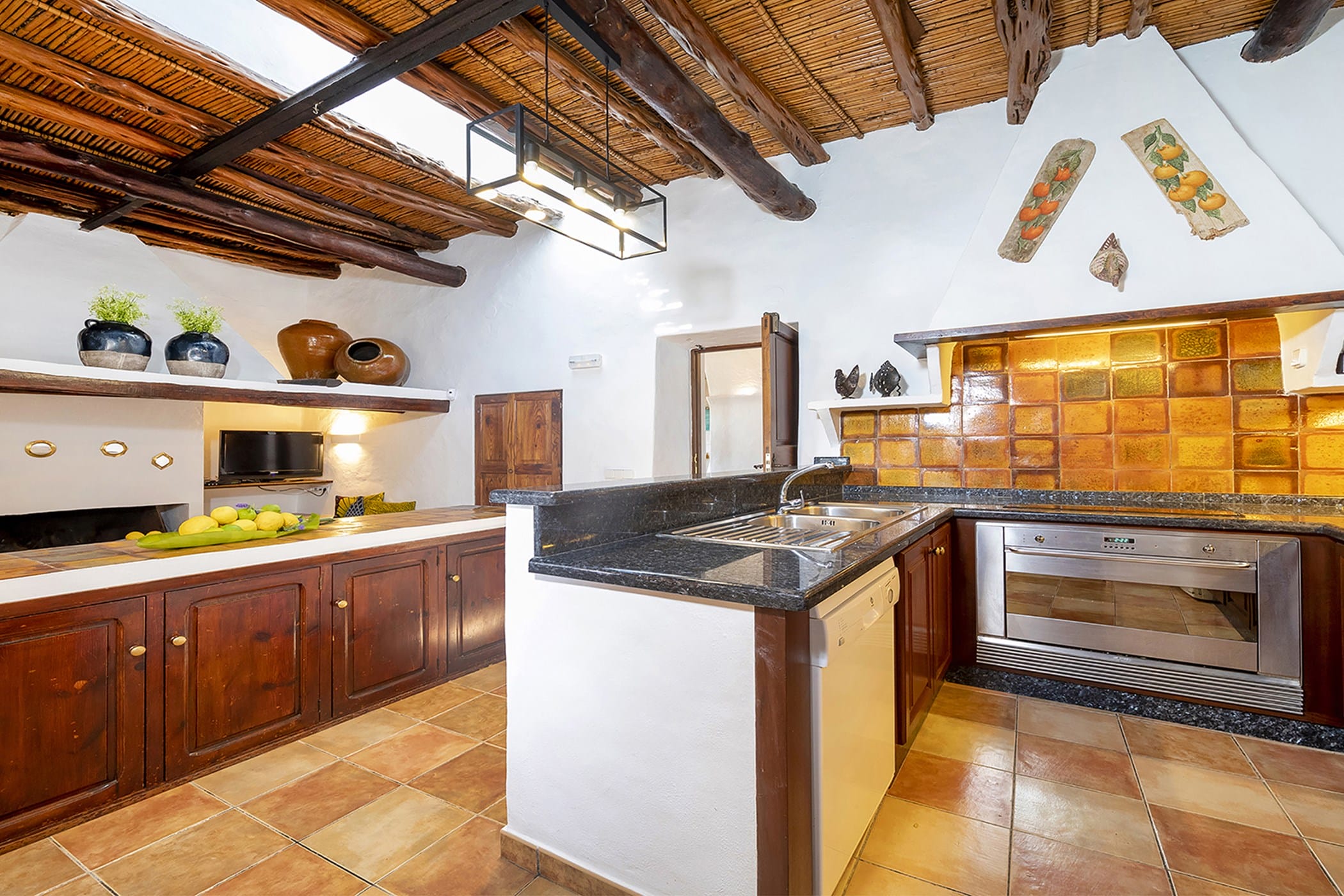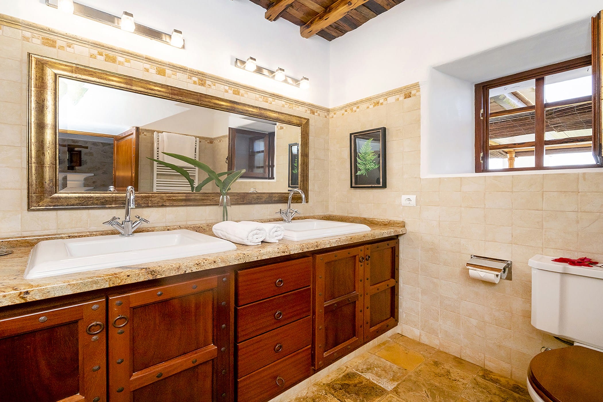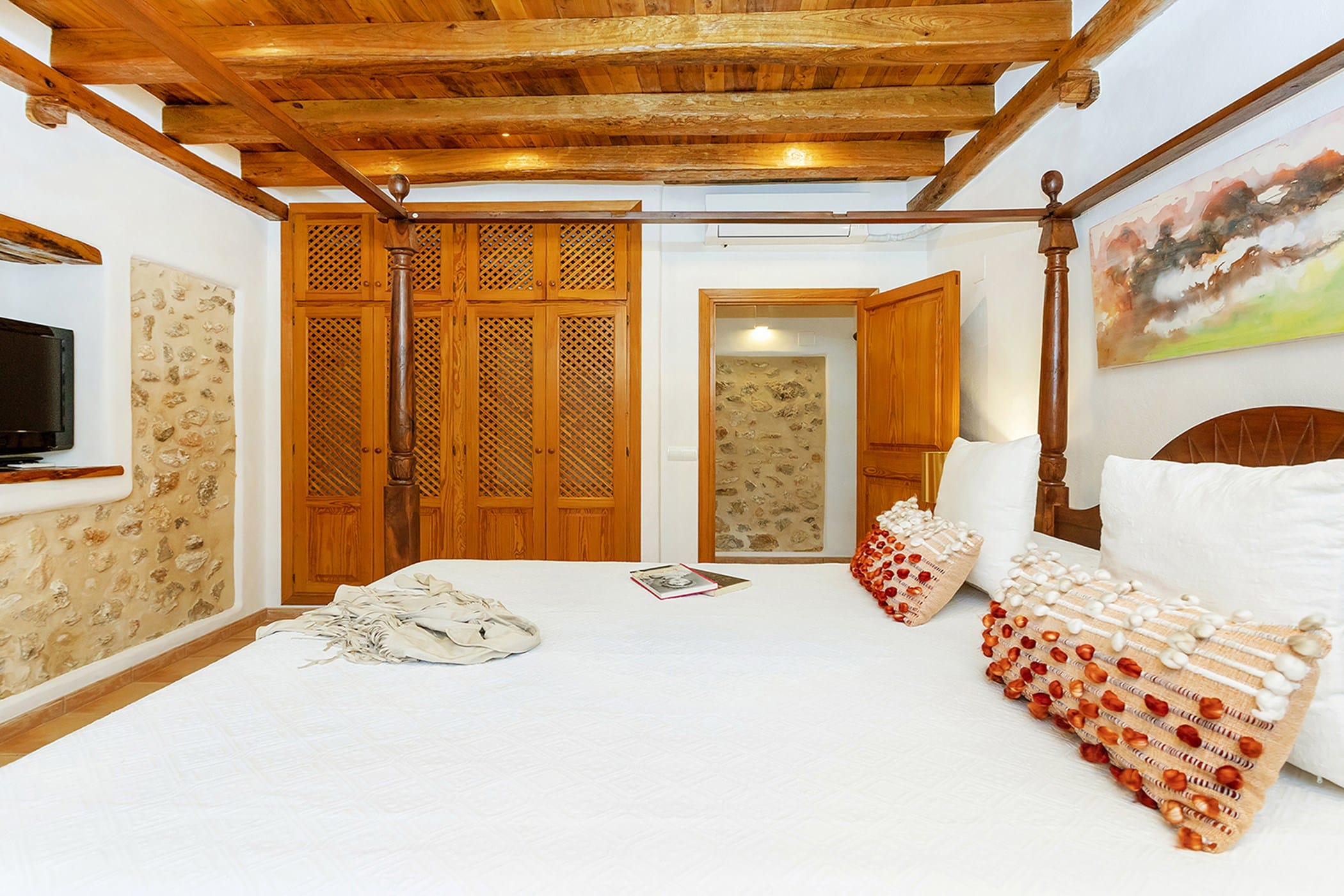 The property includes six air-conditioned bedrooms, all with en-suite bathrooms, thoughtfully distributed to provide both comfort and privacy. Some rooms offer flexible layouts, while one benefits from a separate entrance, making it ideal for guests seeking additional independence. The interiors include a fully equipped traditional kitchen with a fireplace, as well as welcoming living and dining areas that combine rustic charm with contemporary touches.