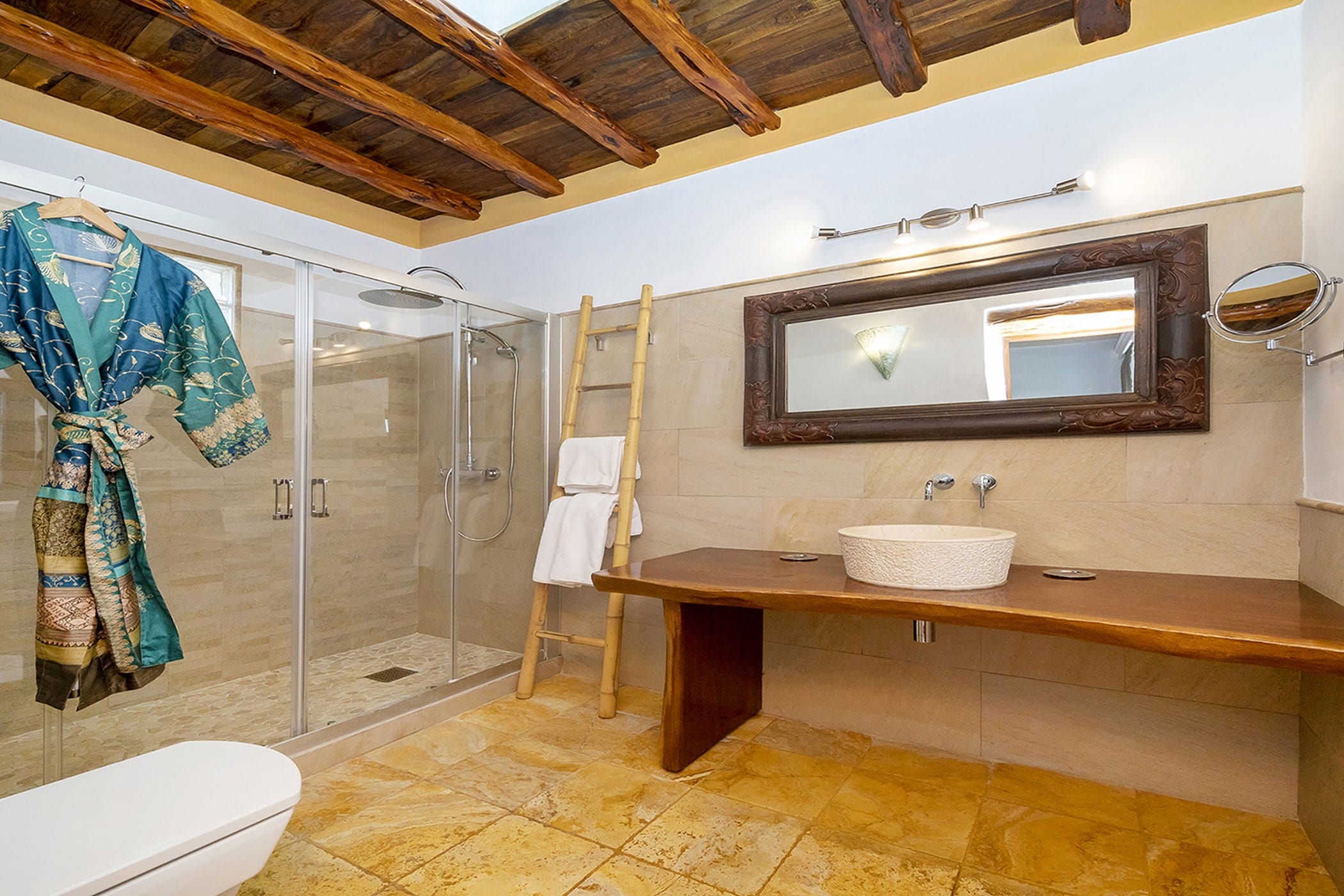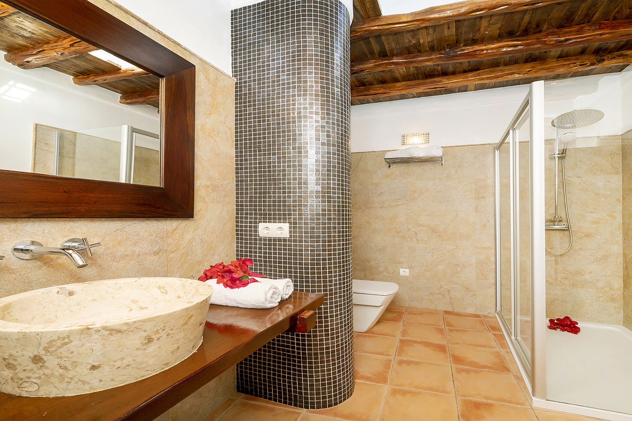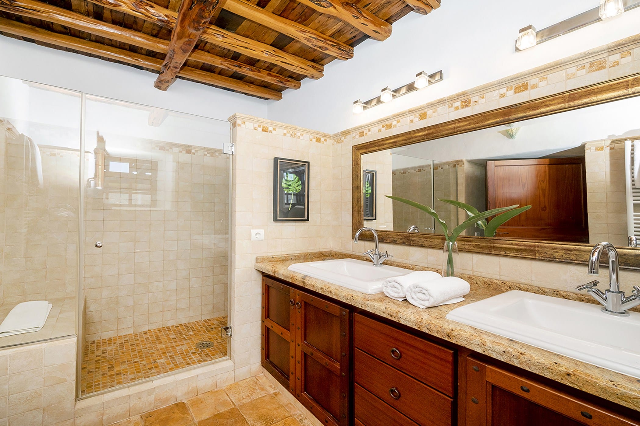 The property includes six air-conditioned bedrooms, all with en-suite bathrooms, thoughtfully distributed to provide both comfort and privacy. Some rooms offer flexible layouts, while one benefits from a separate entrance, making it ideal for guests seeking additional independence. The interiors include a fully equipped traditional kitchen with a fireplace, as well as welcoming living and dining areas that combine rustic charm with contemporary touches.