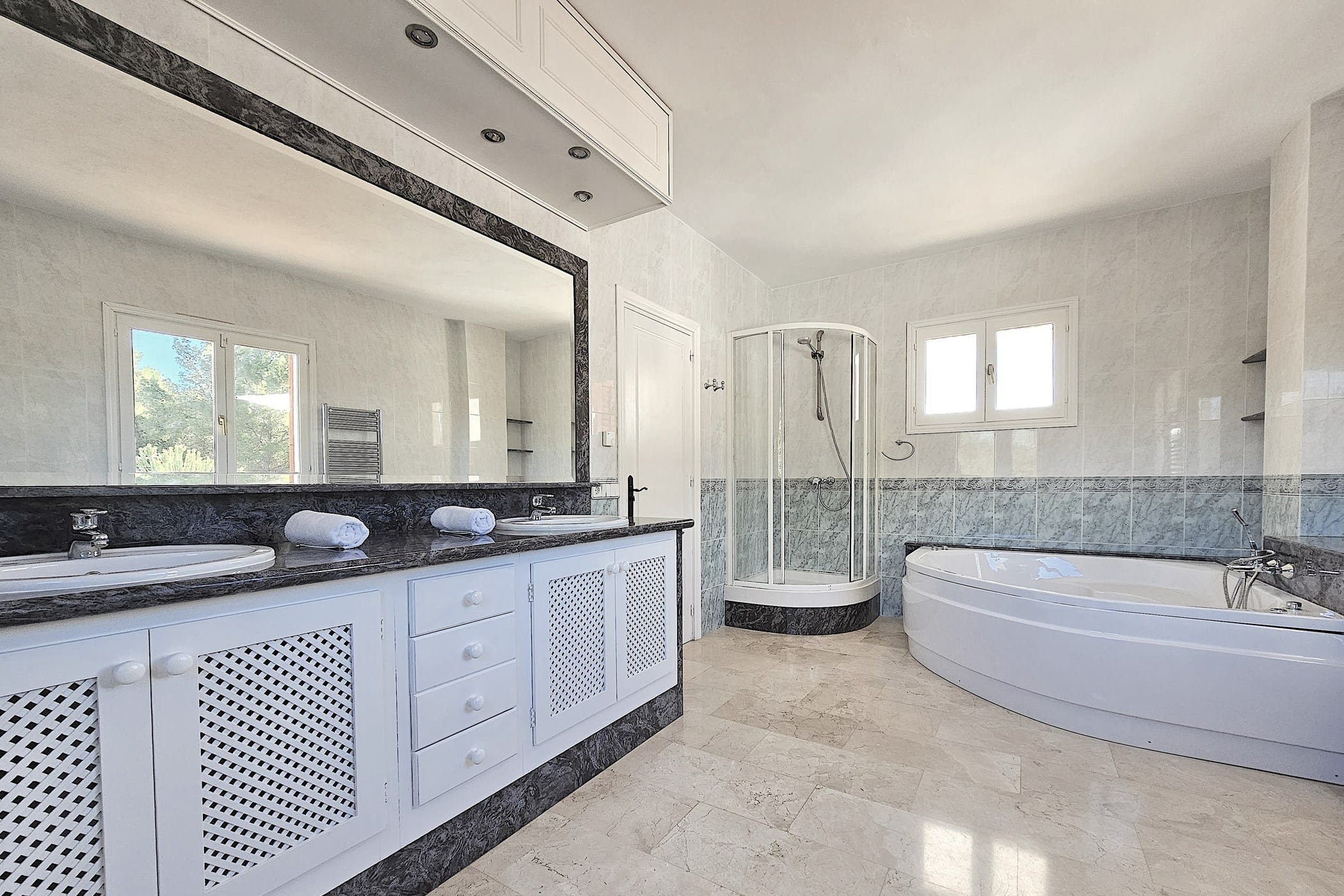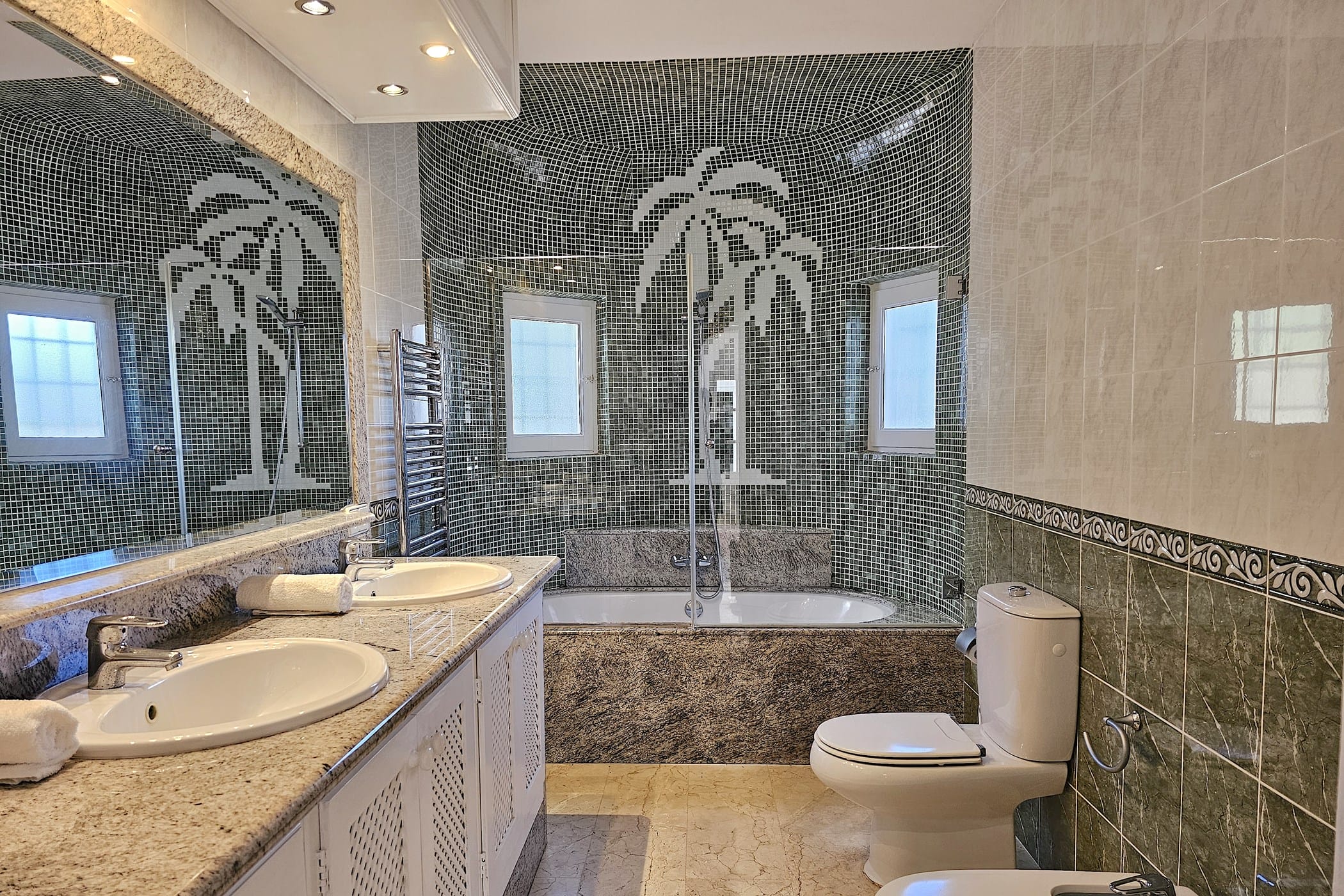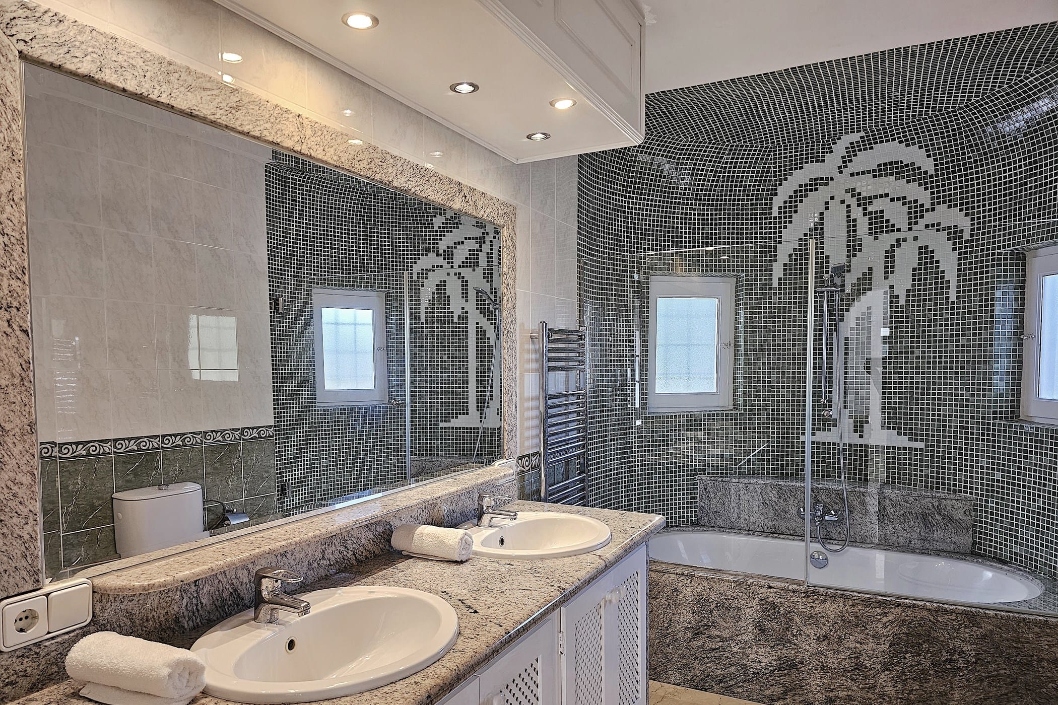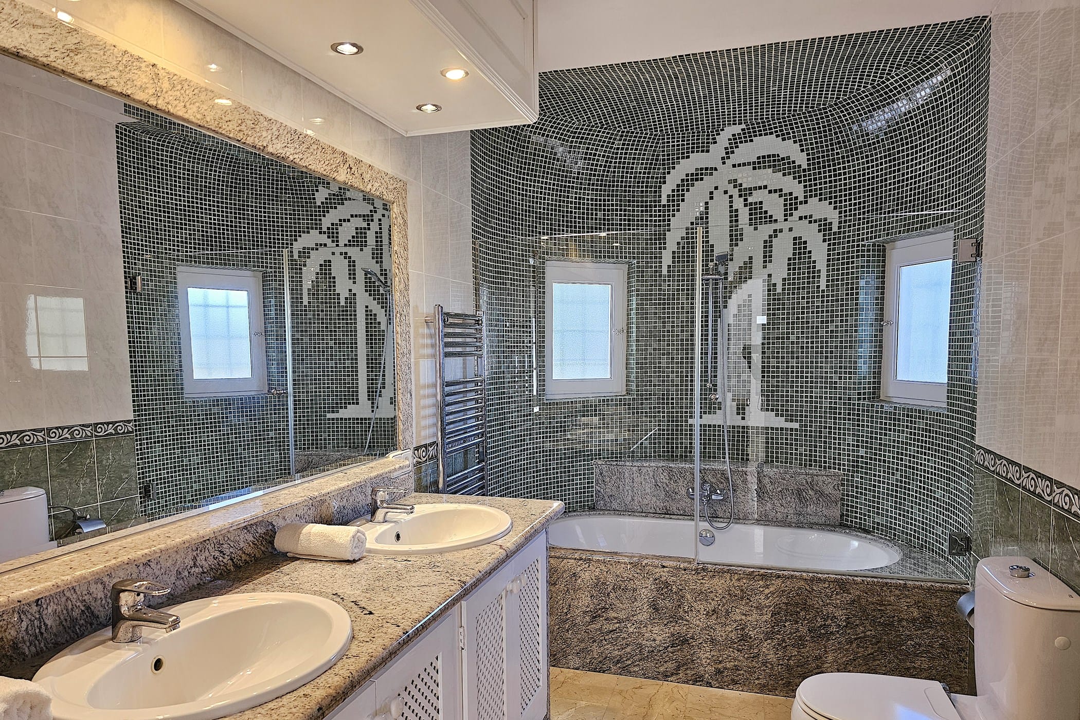 The property features six bedrooms distributed across two floors, along with multiple bathrooms, a comfortable living area, and a fully equipped kitchen. The upper level includes spacious terraces with beautiful views, enhancing the sense of openness and connection to the surroundings.