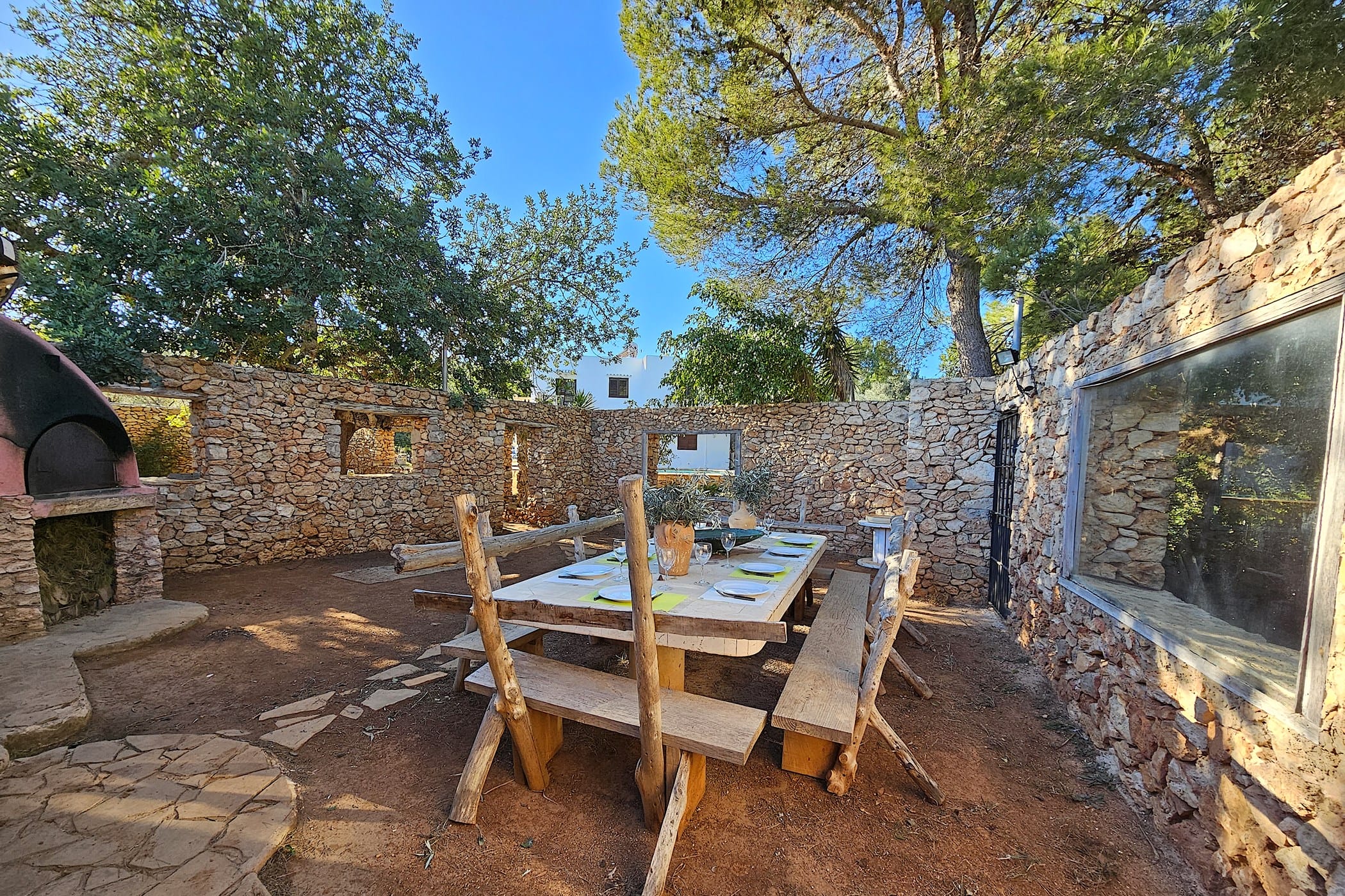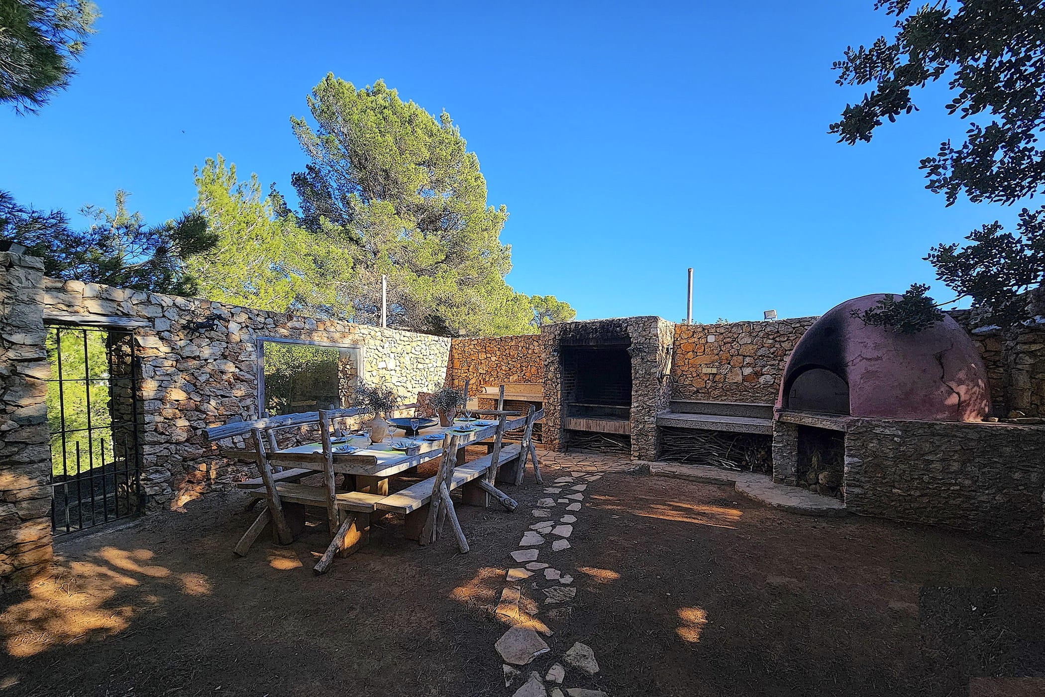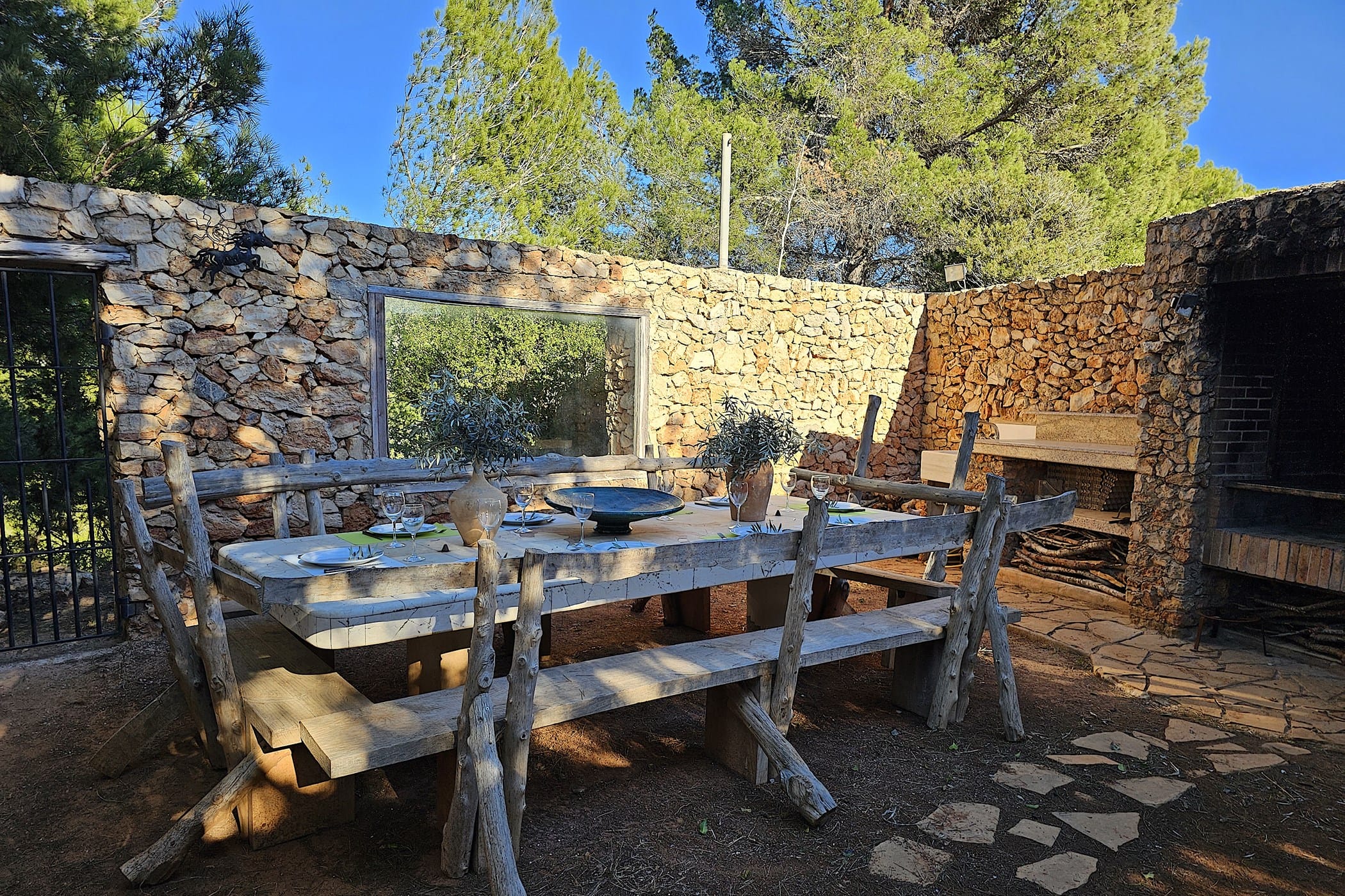Outdoor living is a key highlight, with a large swimming pool, relaxing hammock area, and several terraces designed for leisure and socializing. A separate annex built with traditional stone includes a dining area, barbecue, and wood oven, making it perfect for alfresco meals and gatherings. Combining traditional architecture with modern amenities, it offers a stylish and tranquil retreat in Ibiza.