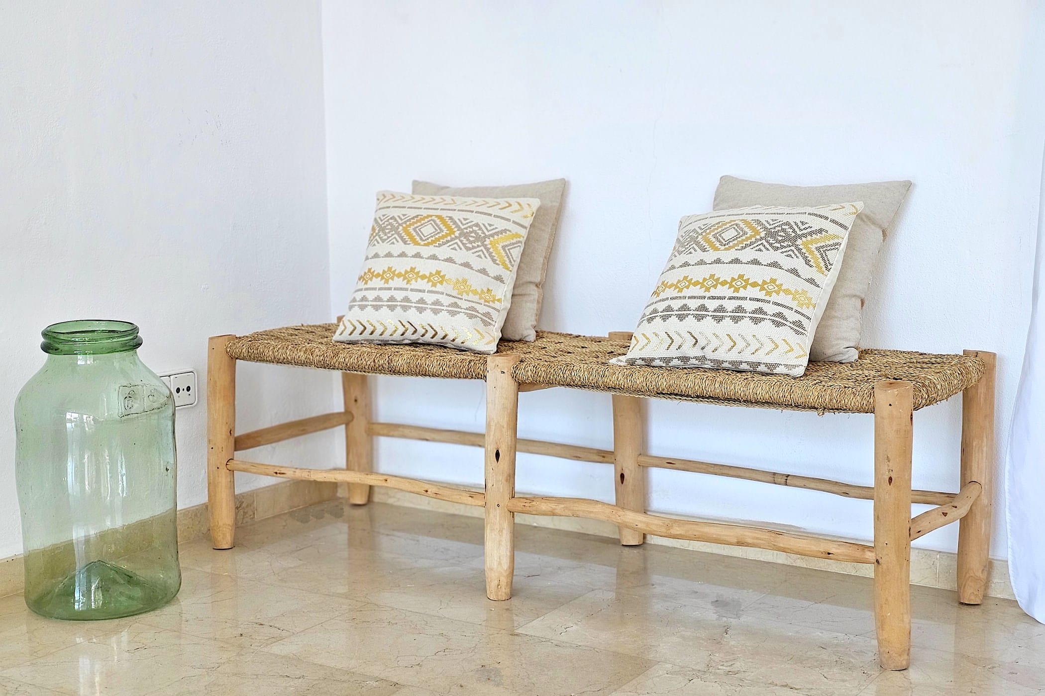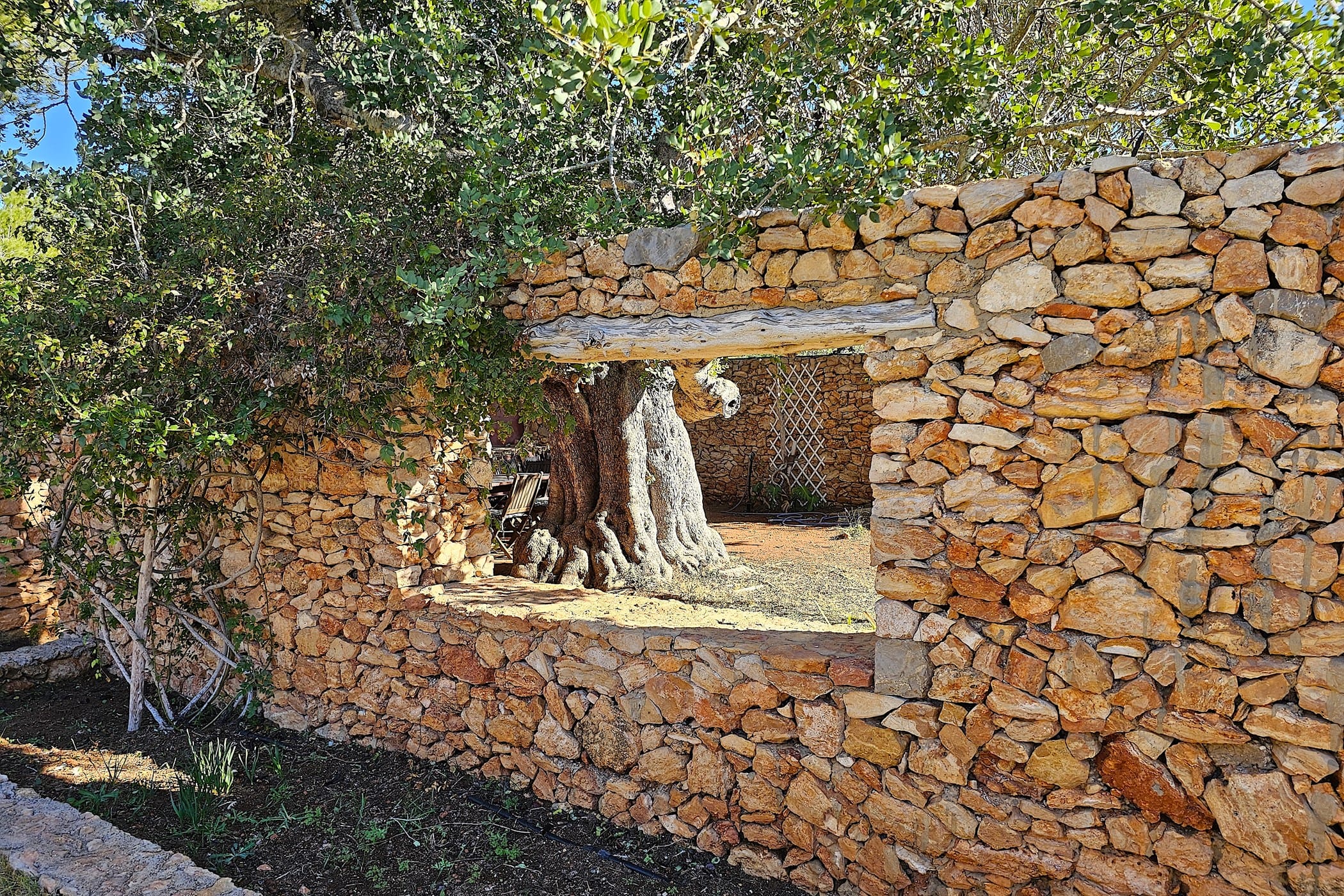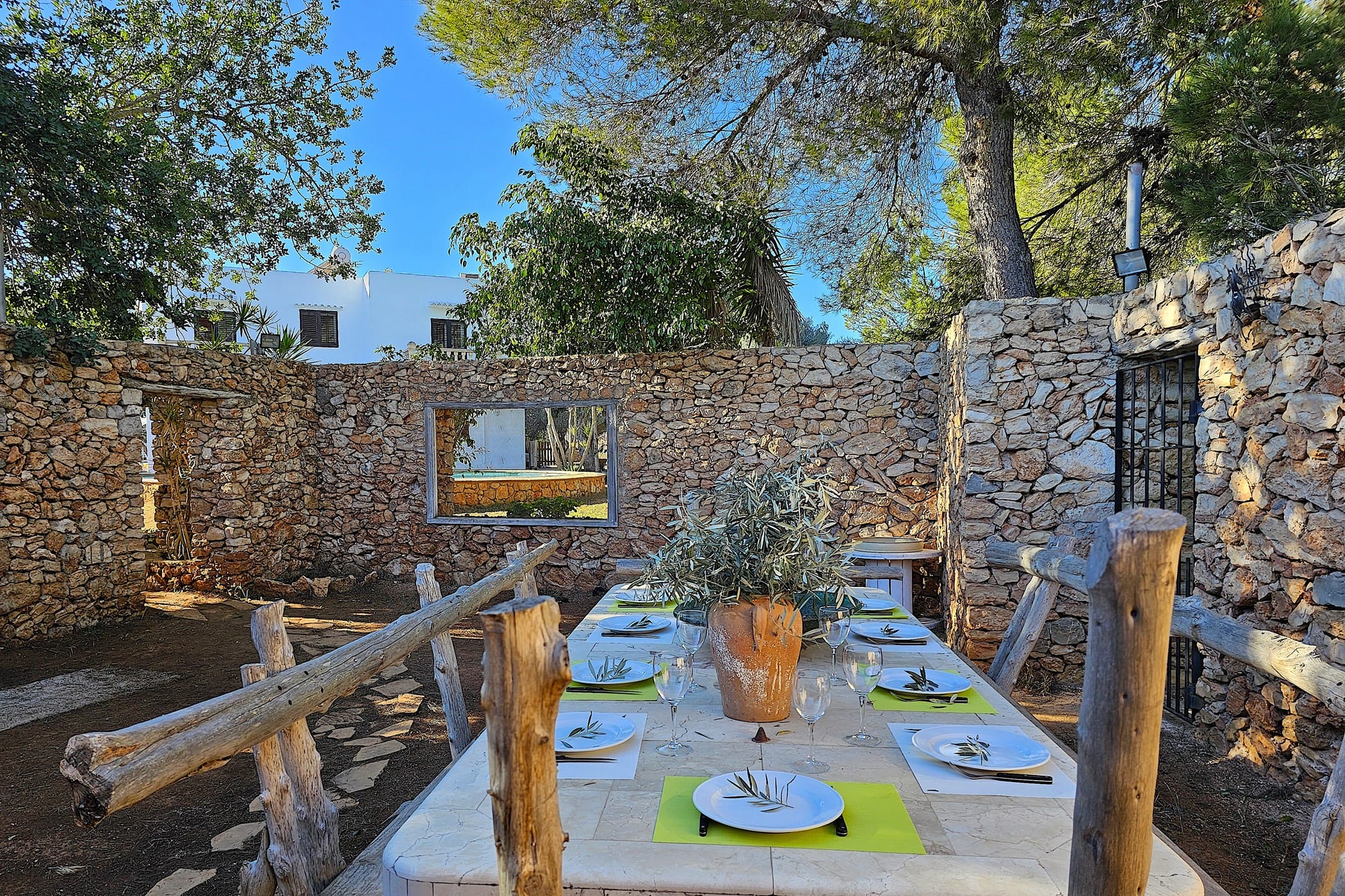 Outdoor living is a key highlight, with a large swimming pool, relaxing hammock area, and several terraces designed for leisure and socializing. A separate annex built with traditional stone includes a dining area, barbecue, and wood oven, making it perfect for alfresco meals and gatherings. Combining traditional architecture with modern amenities, it offers a stylish and tranquil retreat in Ibiza.