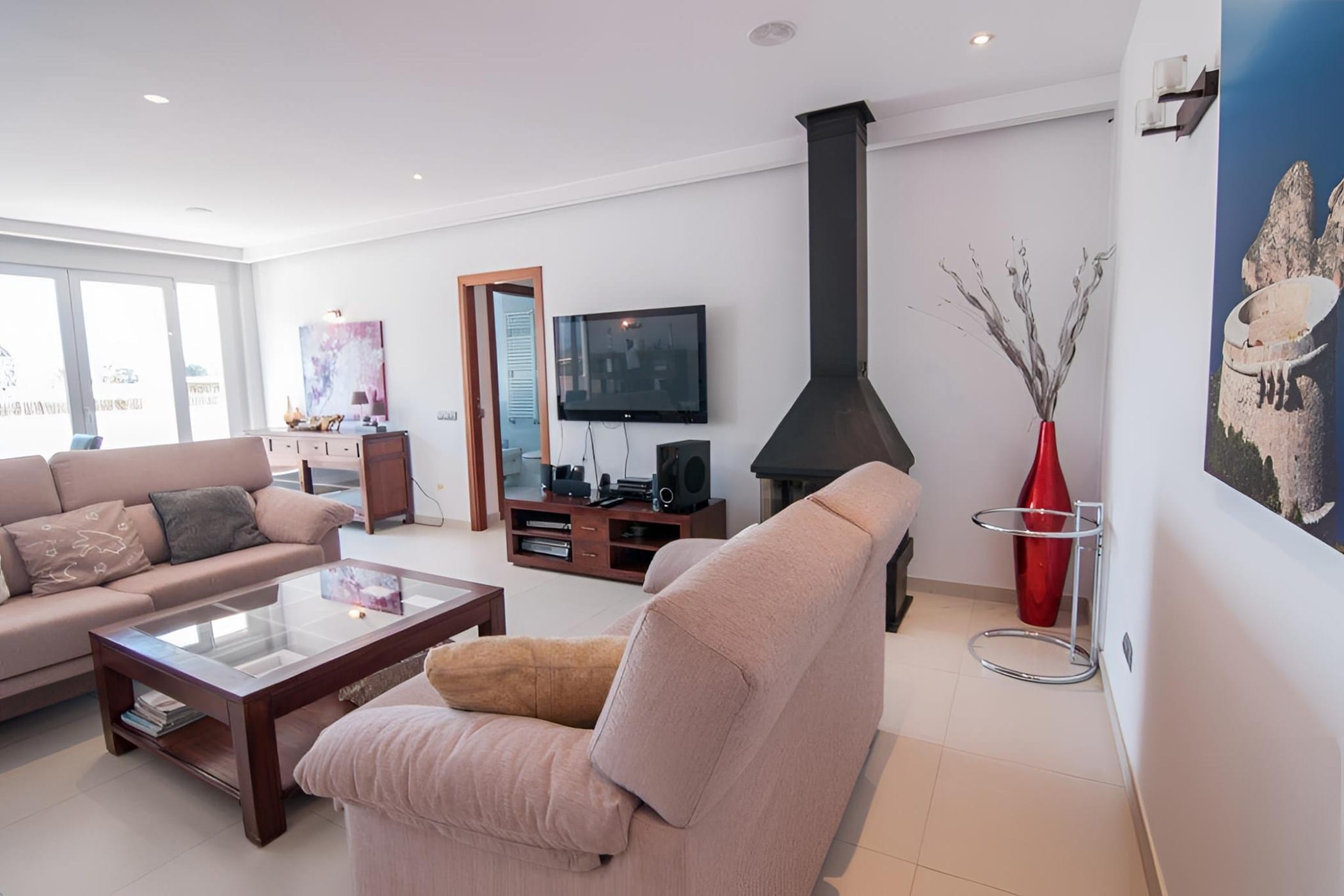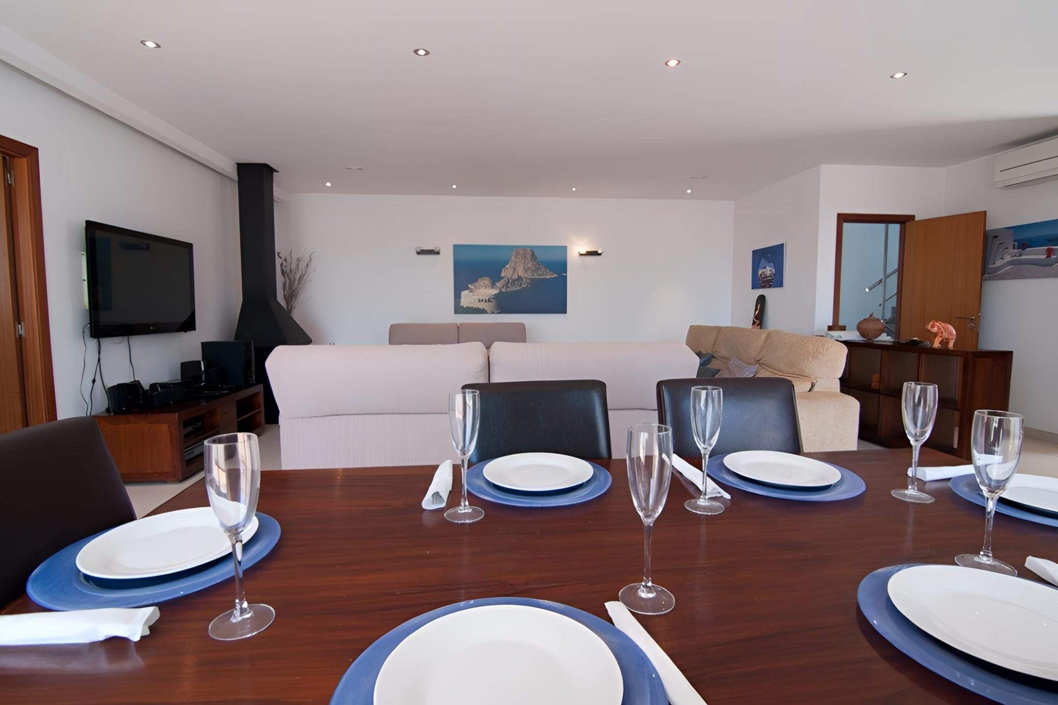 The interiors are bright and stylish, with a fully equipped modern kitchen, a welcoming living room with a fireplace, and ample dining spaces. The layout ensures both shared spaces for socializing and private areas for relaxation, with several bedrooms enjoying direct access to terraces.