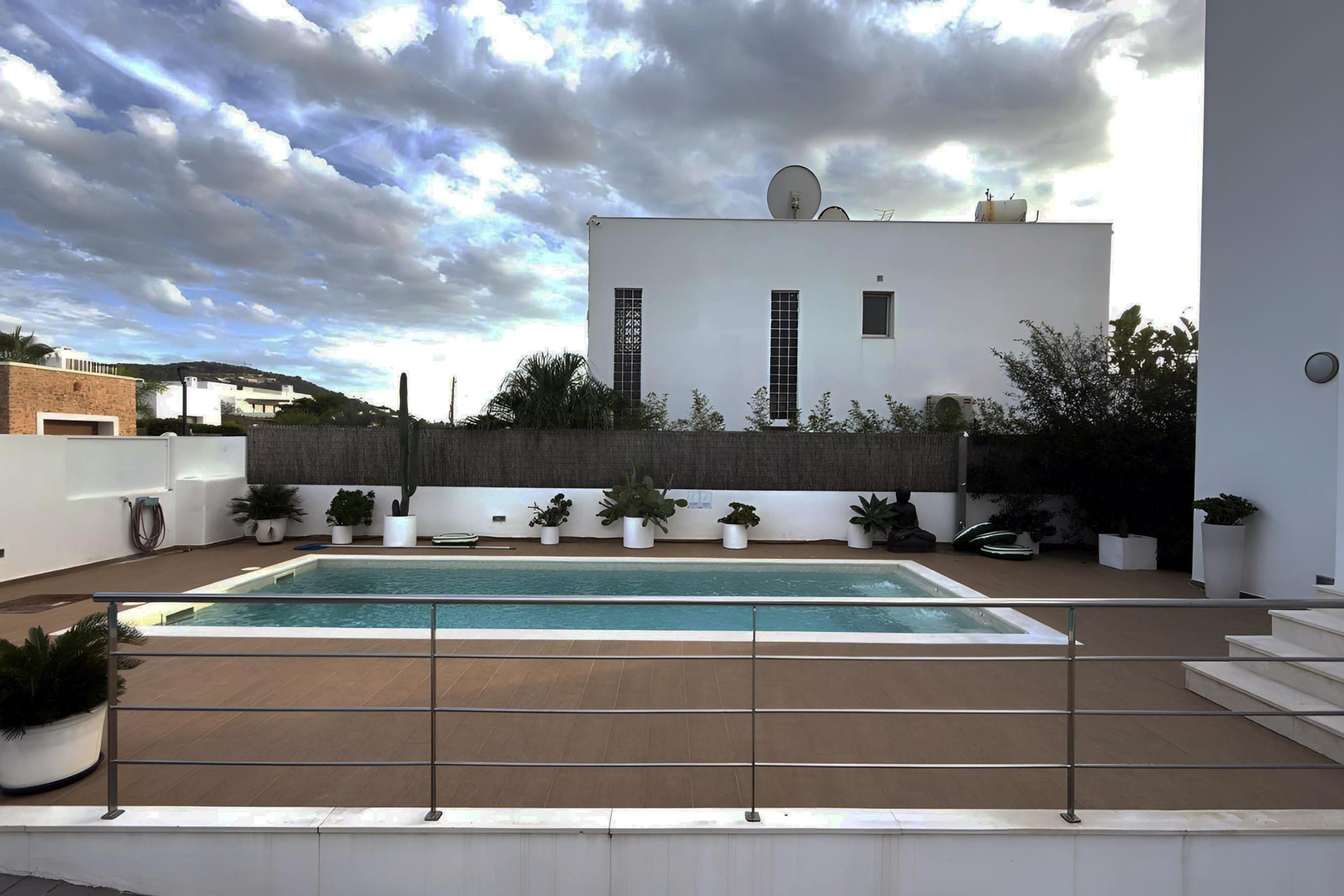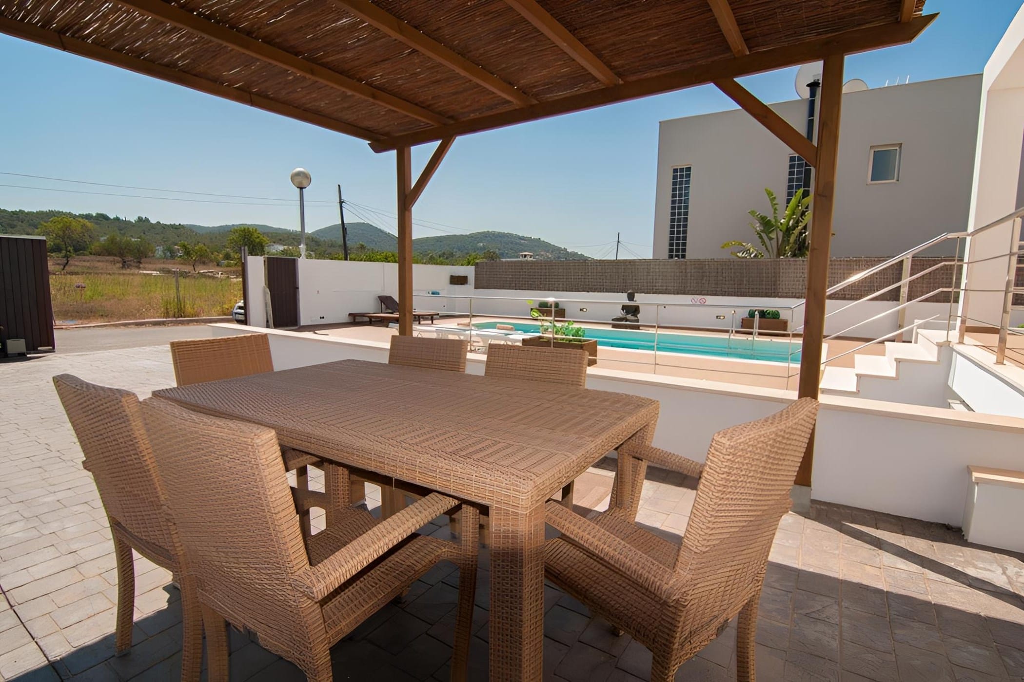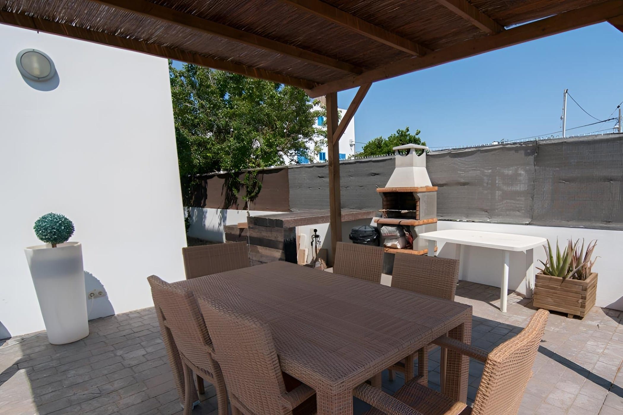 Outside, the villa offers a private pool surrounded by sun loungers, a Balinese bed, and beautifully landscaped areas with tropical plants. A shaded dining space with a built-in barbecue and an upper terrace with panoramic views provide ideal settings for outdoor living. Combining modern comfort with a relaxed atmosphere, it is perfect for a memorable Ibiza getaway.