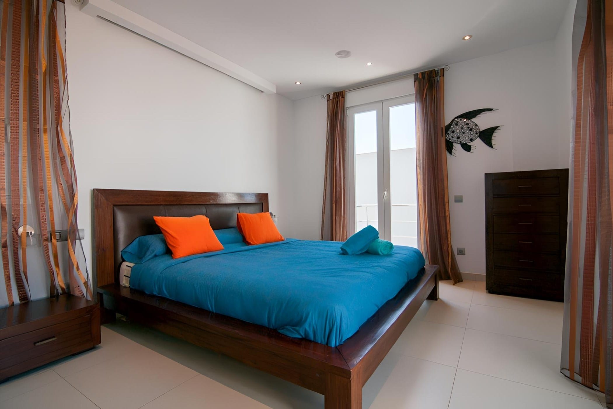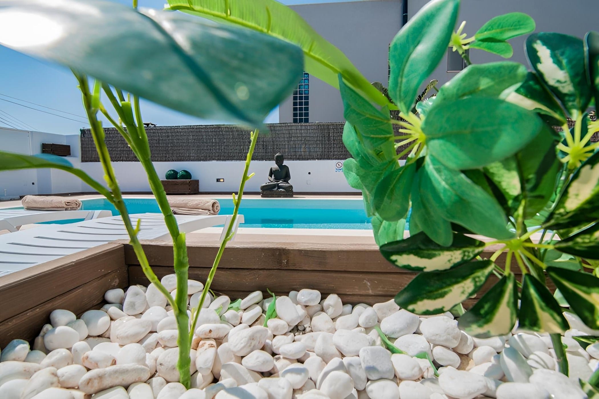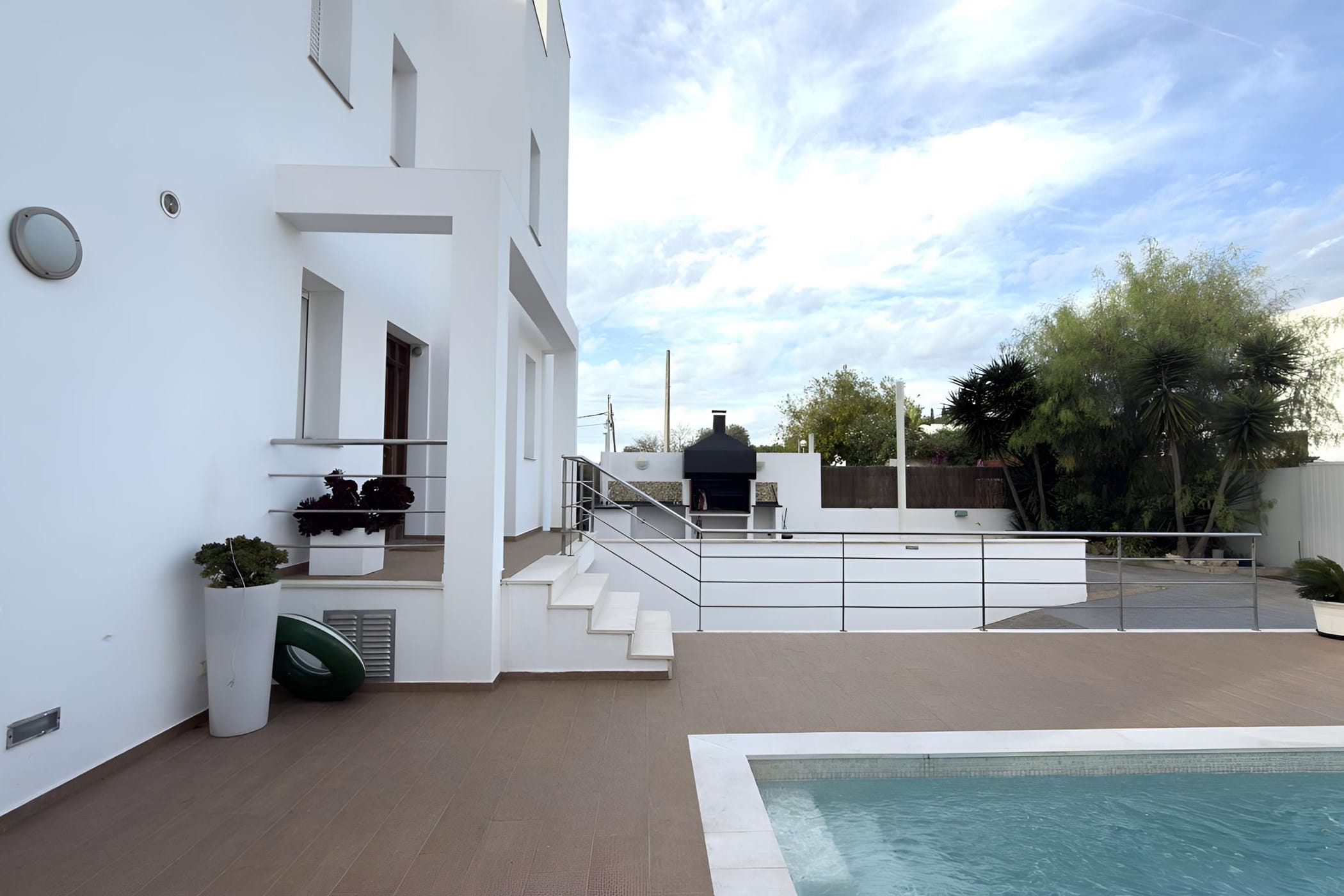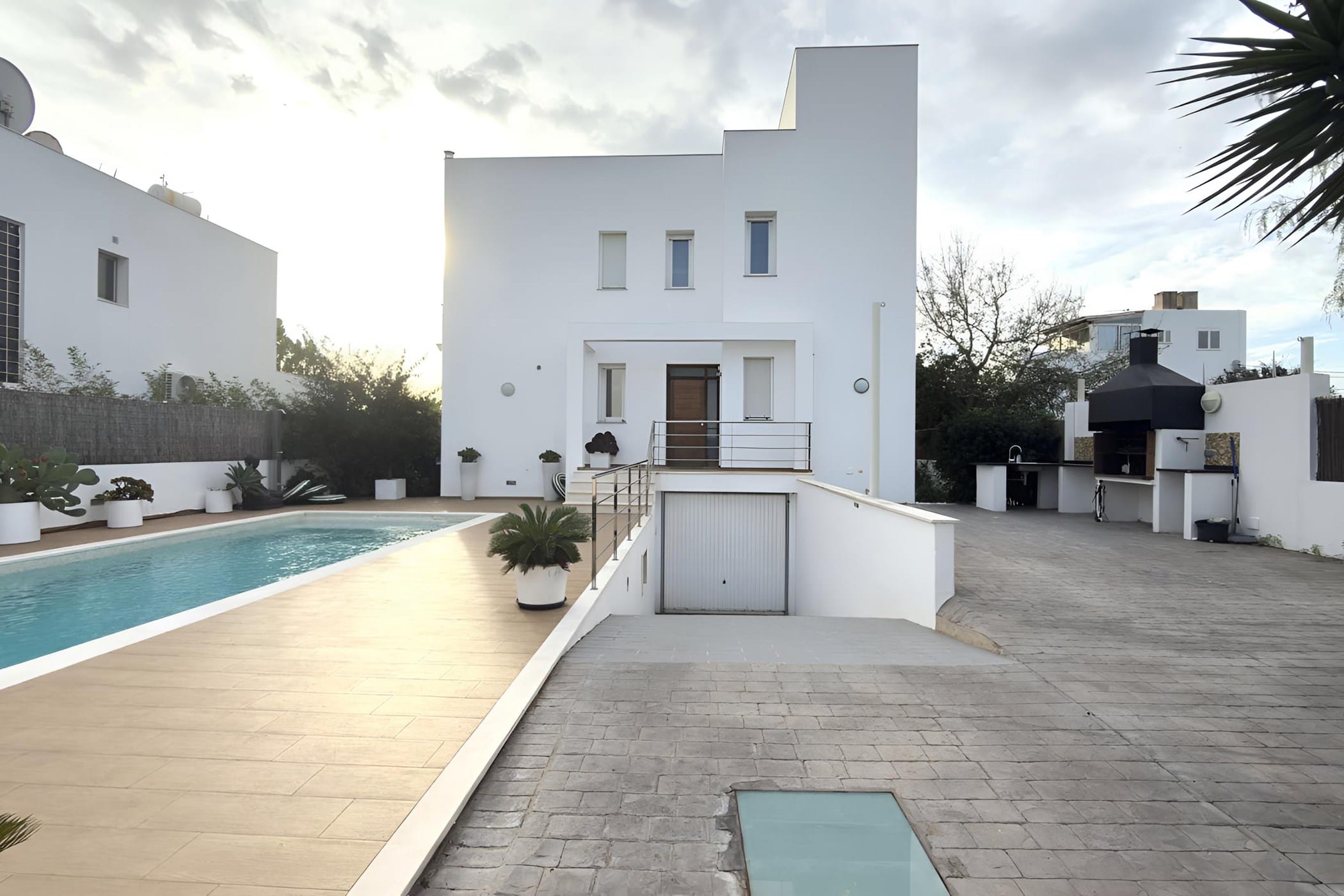 Outside, the villa offers a private pool surrounded by sun loungers, a Balinese bed, and beautifully landscaped areas with tropical plants. A shaded dining space with a built-in barbecue and an upper terrace with panoramic views provide ideal settings for outdoor living. Combining modern comfort with a relaxed atmosphere, it is perfect for a memorable Ibiza getaway.