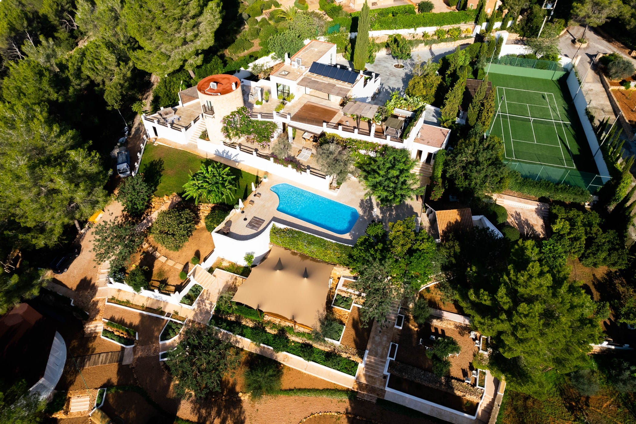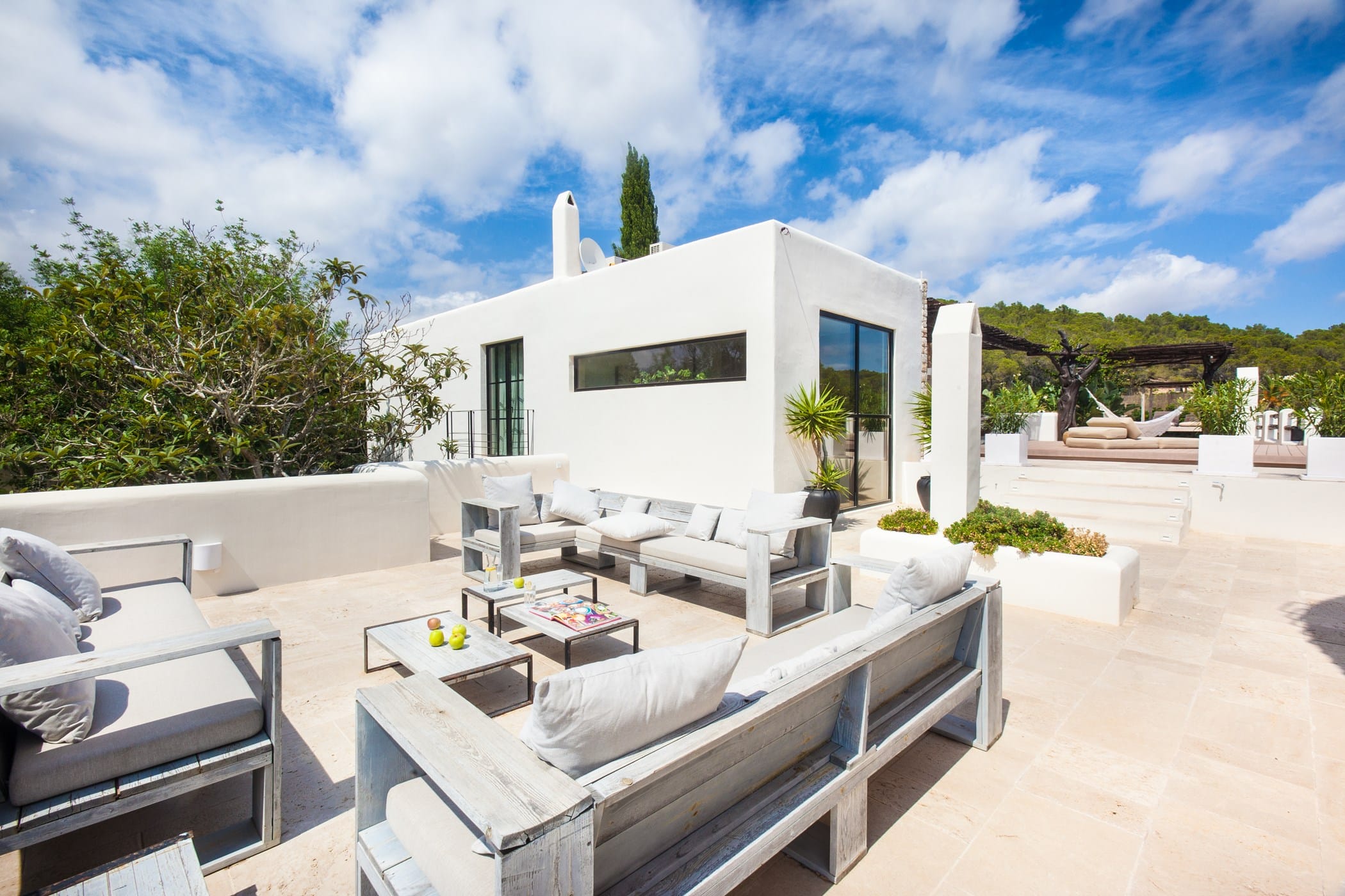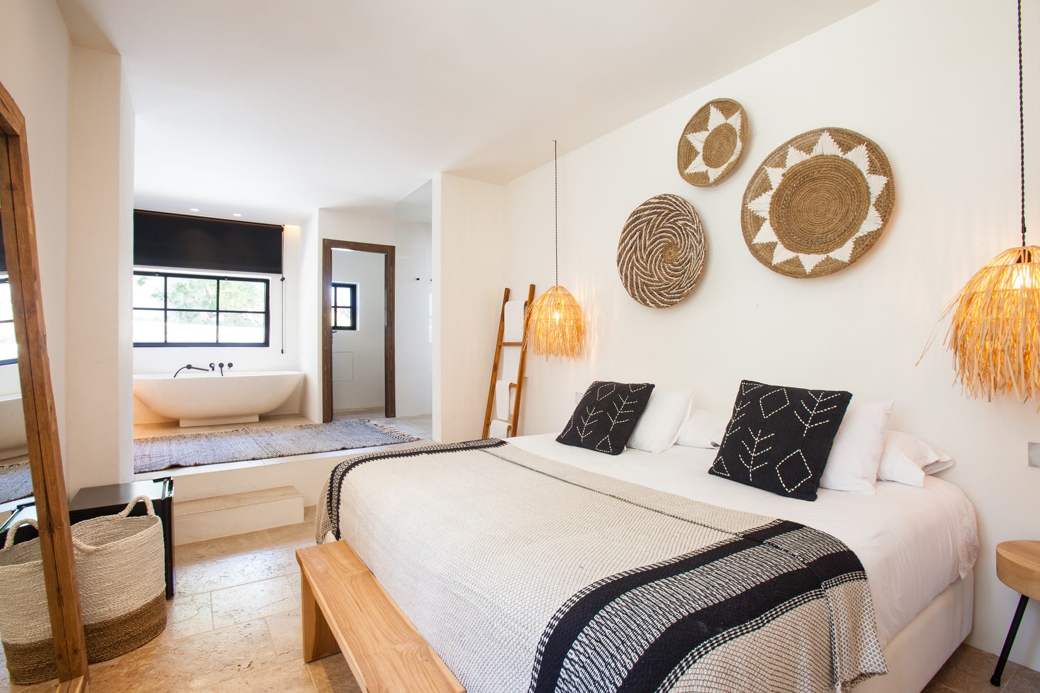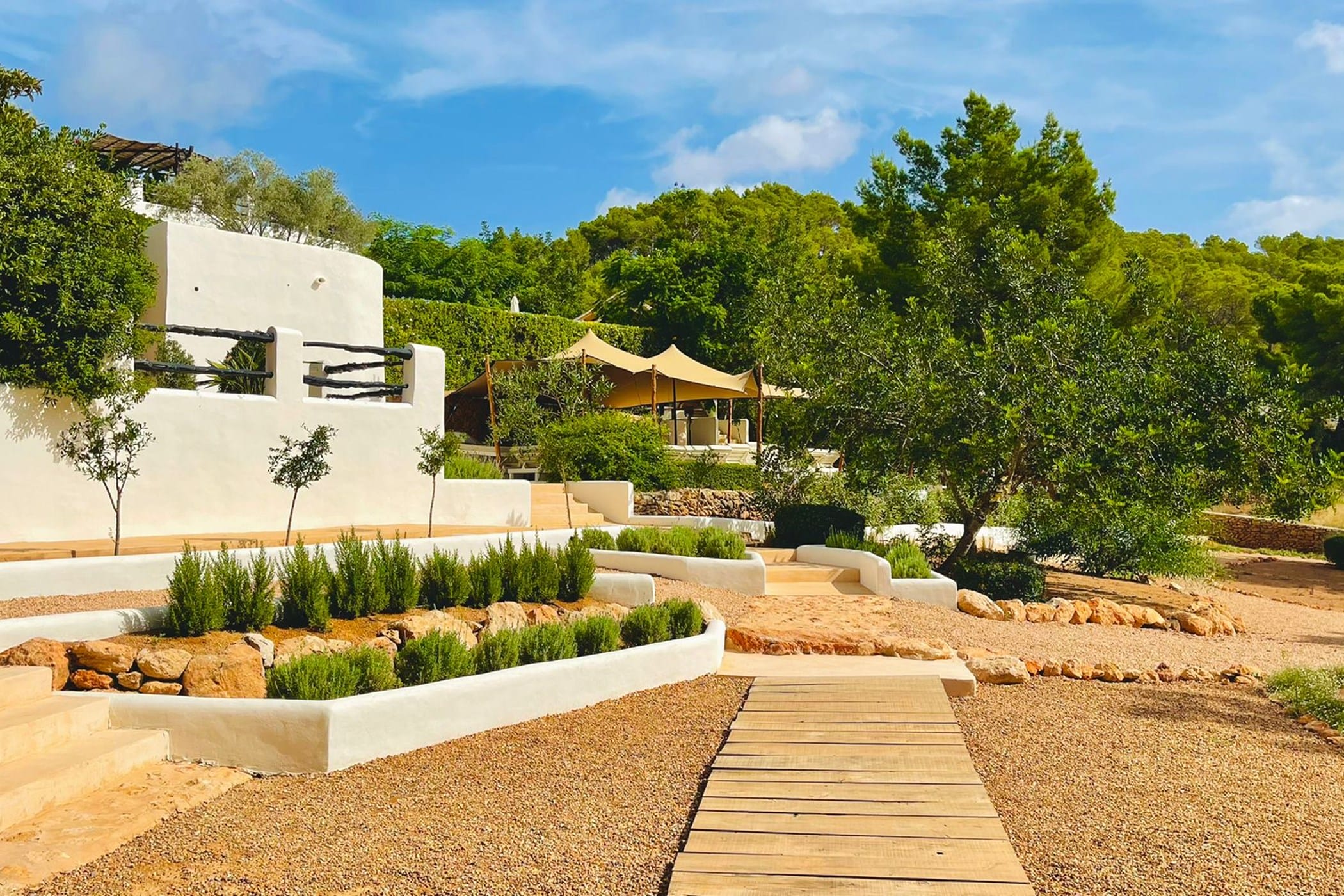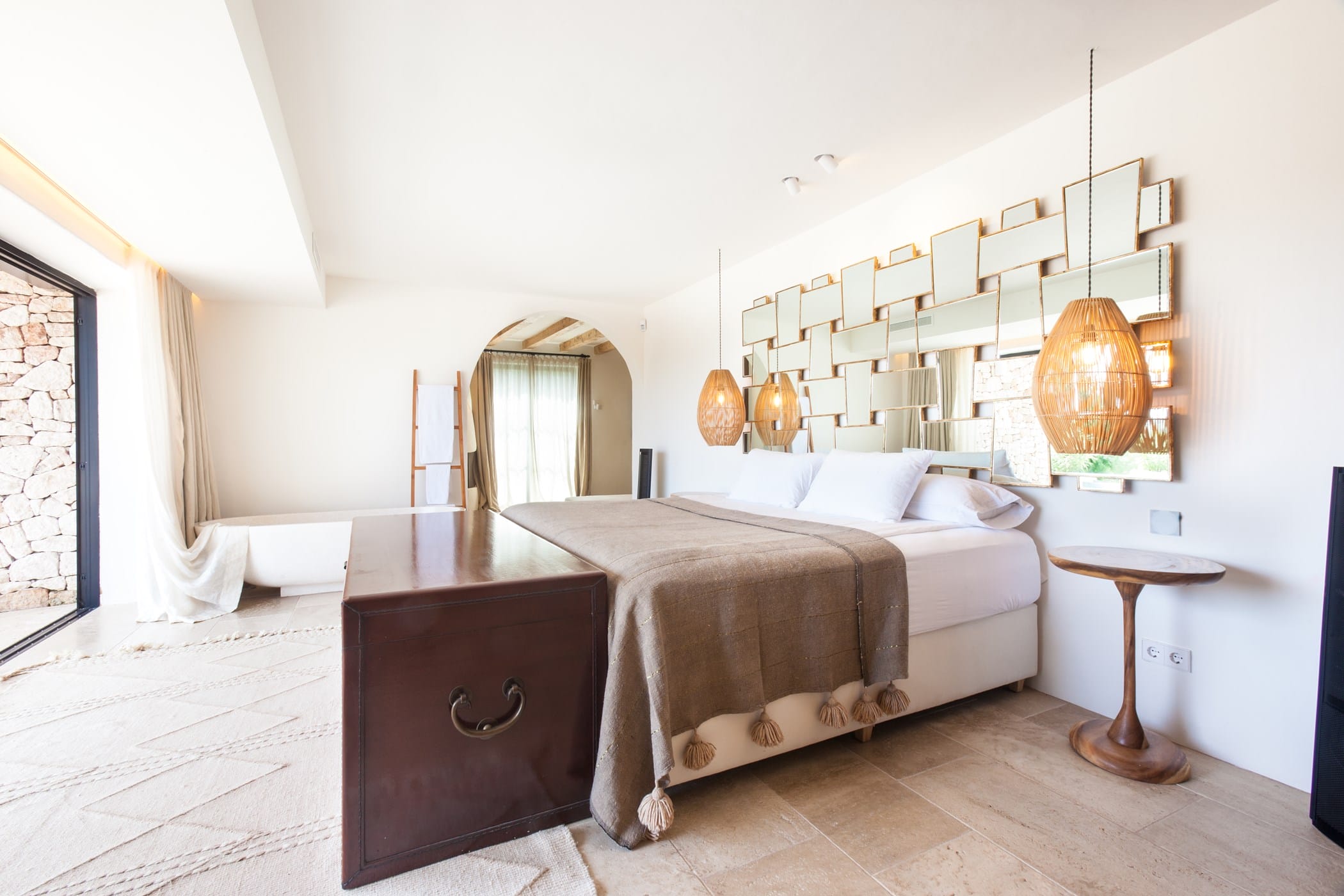 The property offers several en-suite bedrooms distributed between the main house and separate guest accommodations, ensuring privacy and comfort. Outdoors, guests can enjoy a pool, yoga platforms, wellness areas, and landscaped gardens. Combining luxury, space, and top-tier facilities, it provides an exceptional setting for a private and immersive Ibiza retreat.