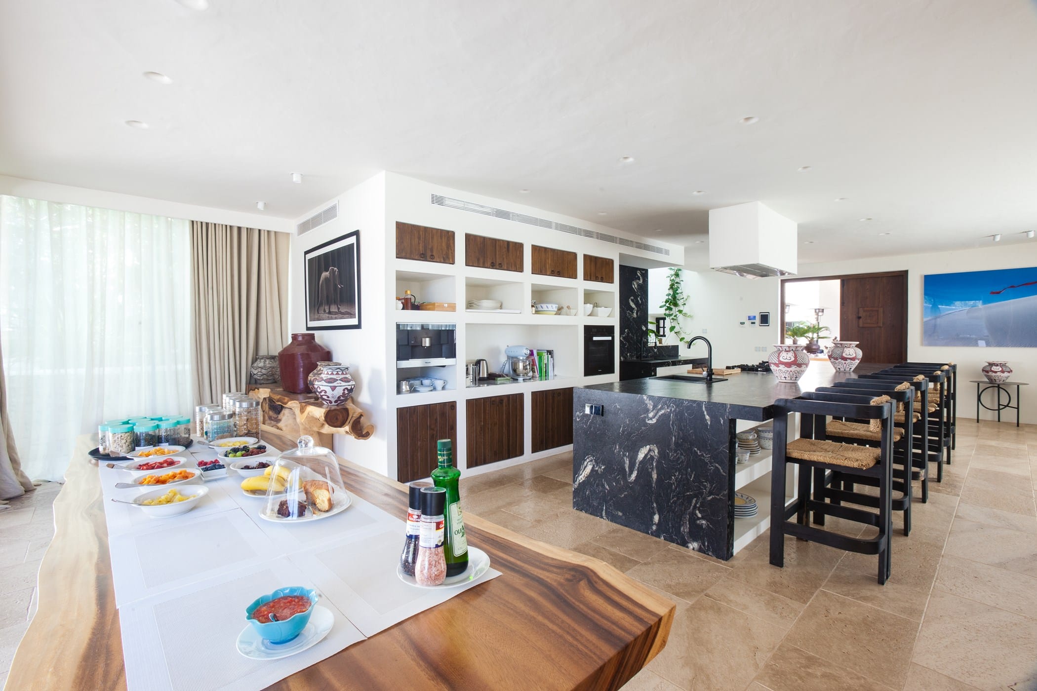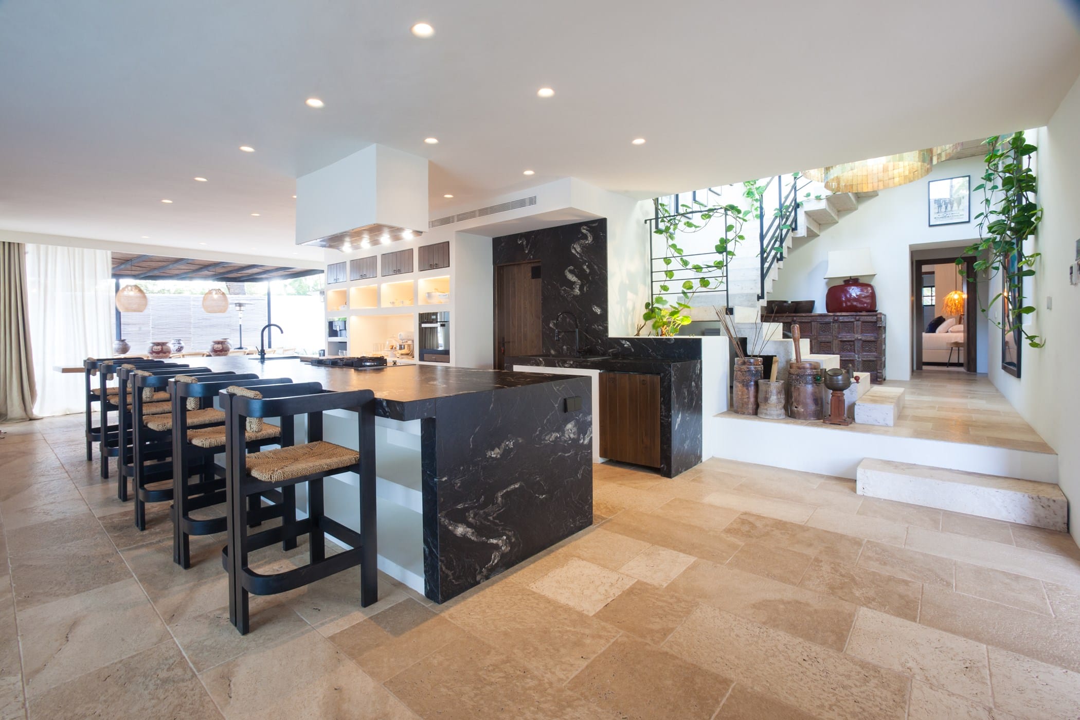 At its core is a spacious, high-end kitchen built for hosting, with top-quality appliances, a large central island, and seamless access to indoor and outdoor dining areas. Additional features include a secondary chef’s kitchen, multiple lounges, a home cinema-style living room, and a covered summer lounge connected to a bar and entertainment area. Advanced home automation controls lighting, climate, and sound throughout the villa.