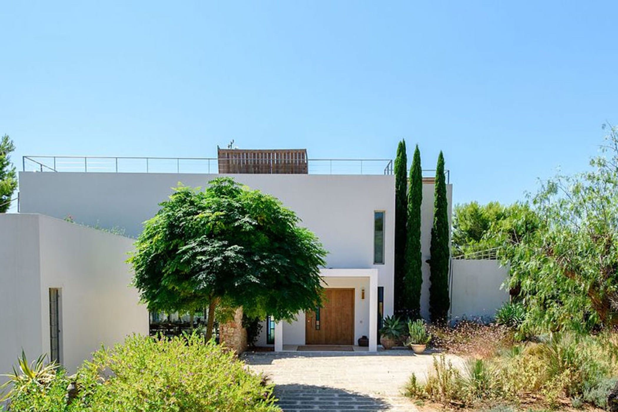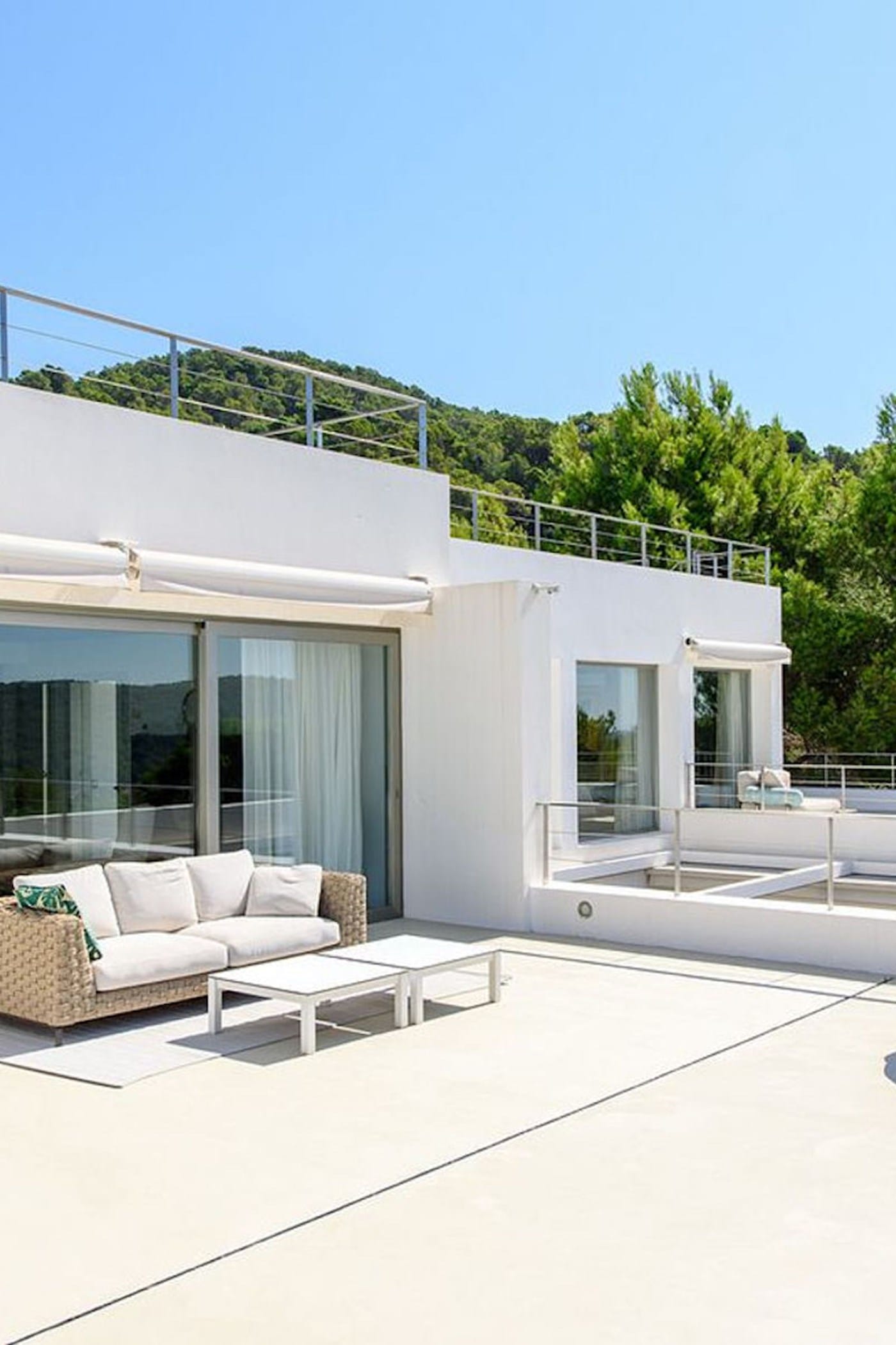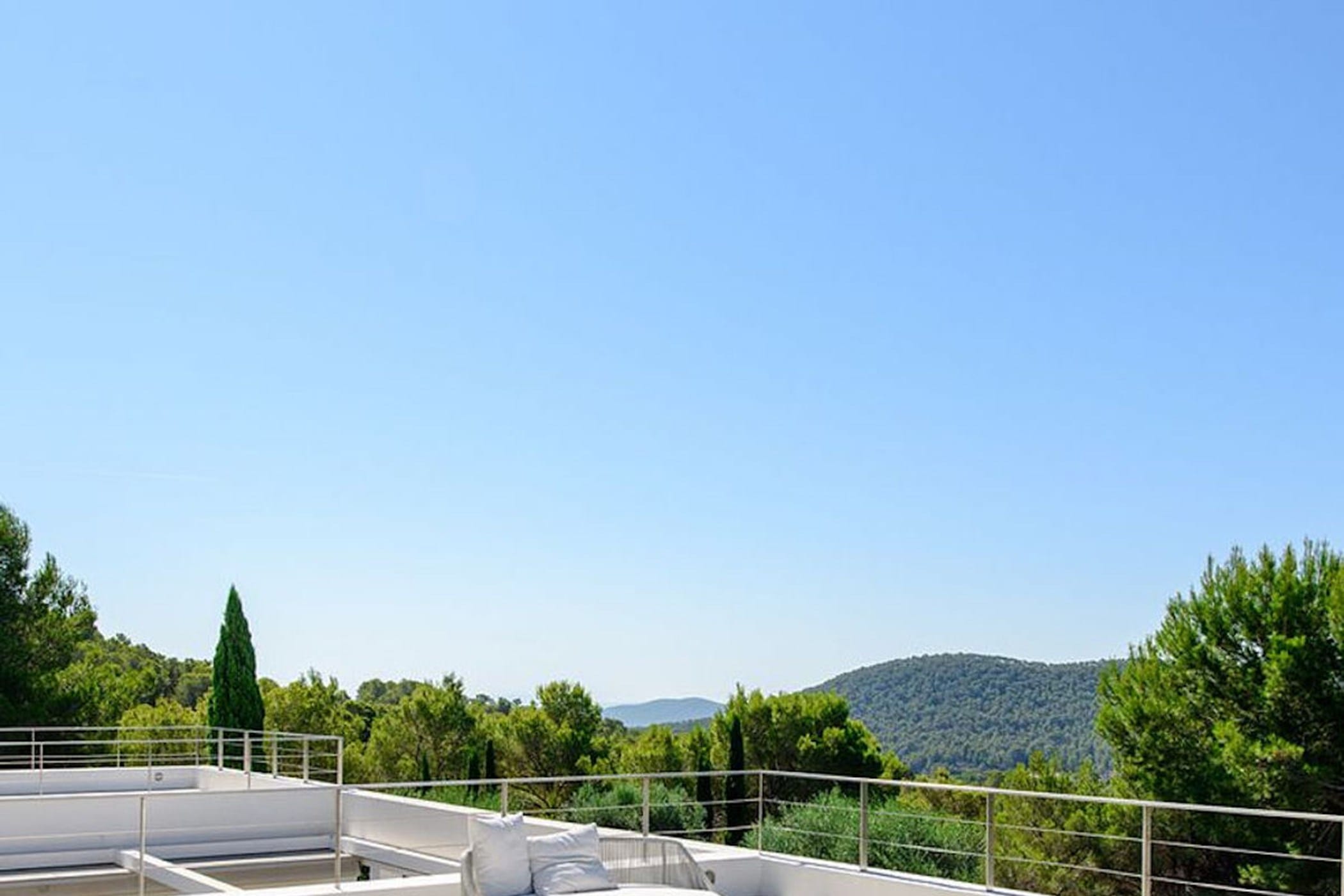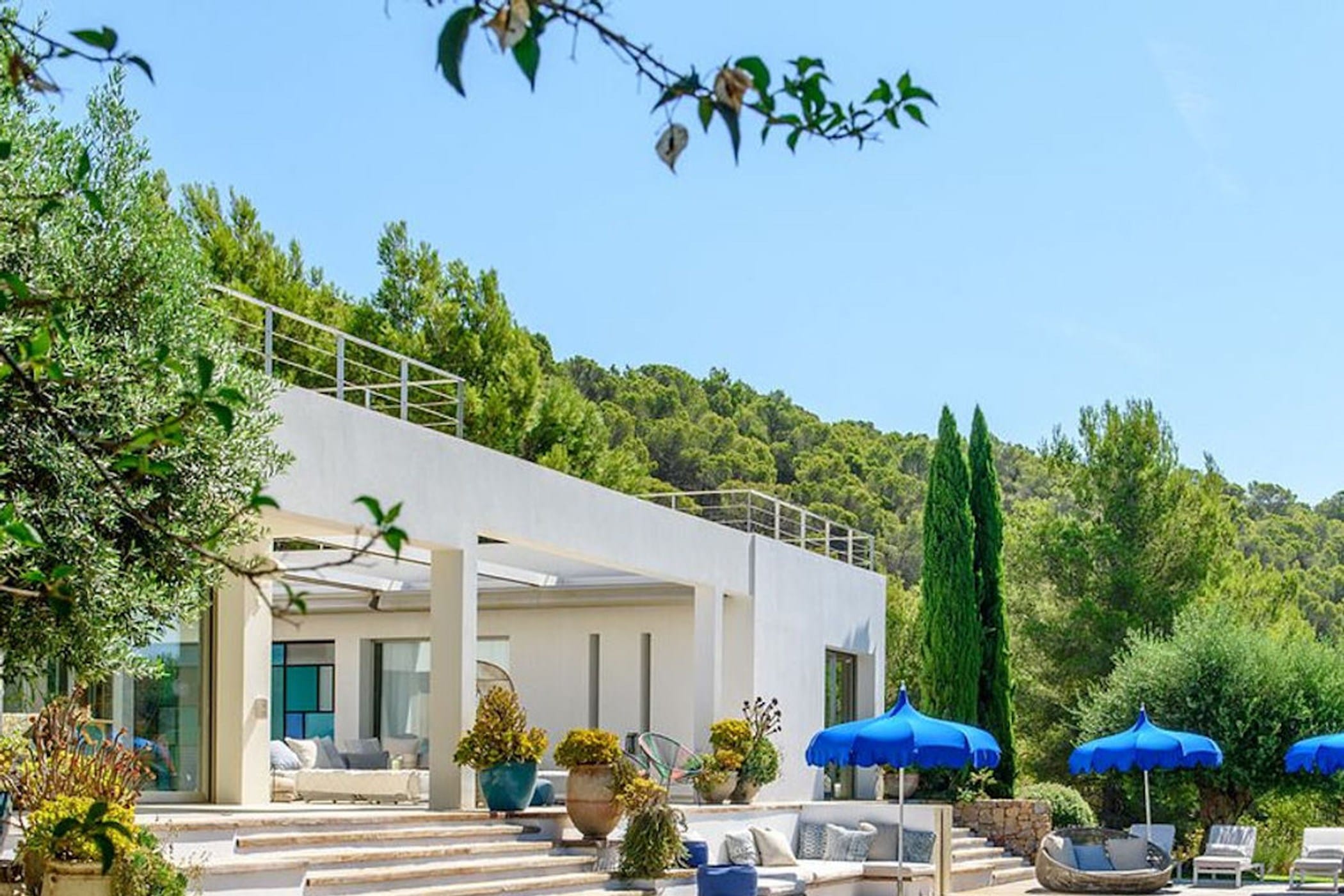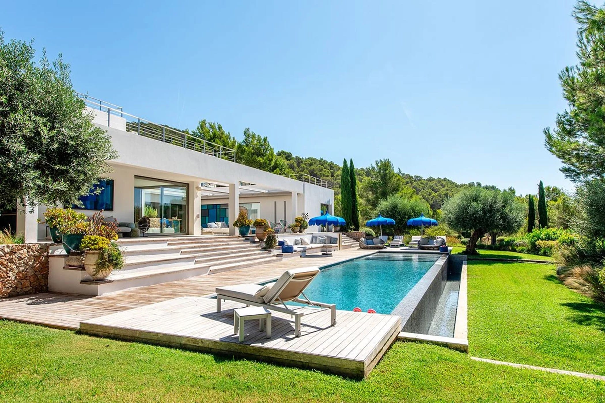 This modern 7-bedroom mansion, designed by renowned architect Jaime Serra, sits majestically on a hillside with beautiful views over green hills and Cala Jondal bay, home to the world-famous Blue Marlin beach club. Close to the charming village of San Jose and Ibiza Town.