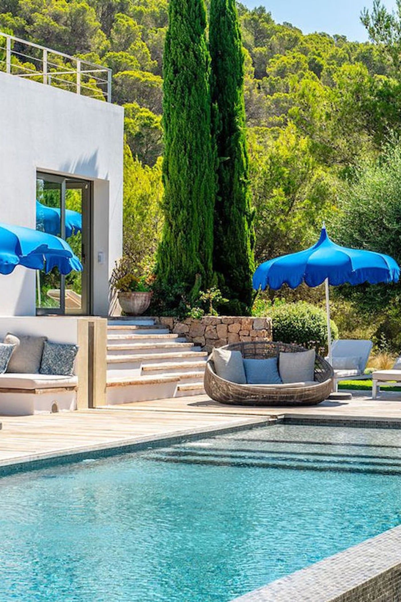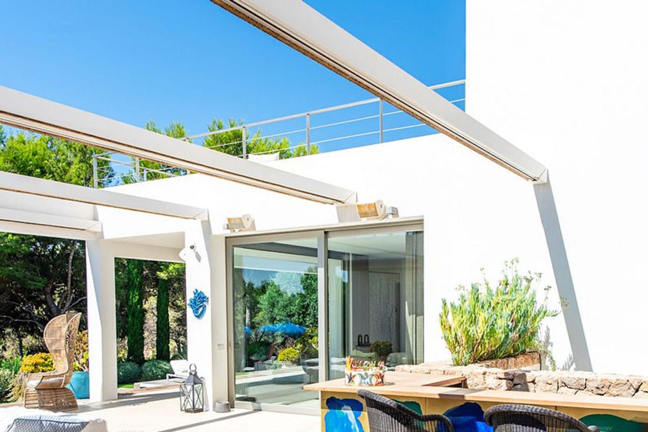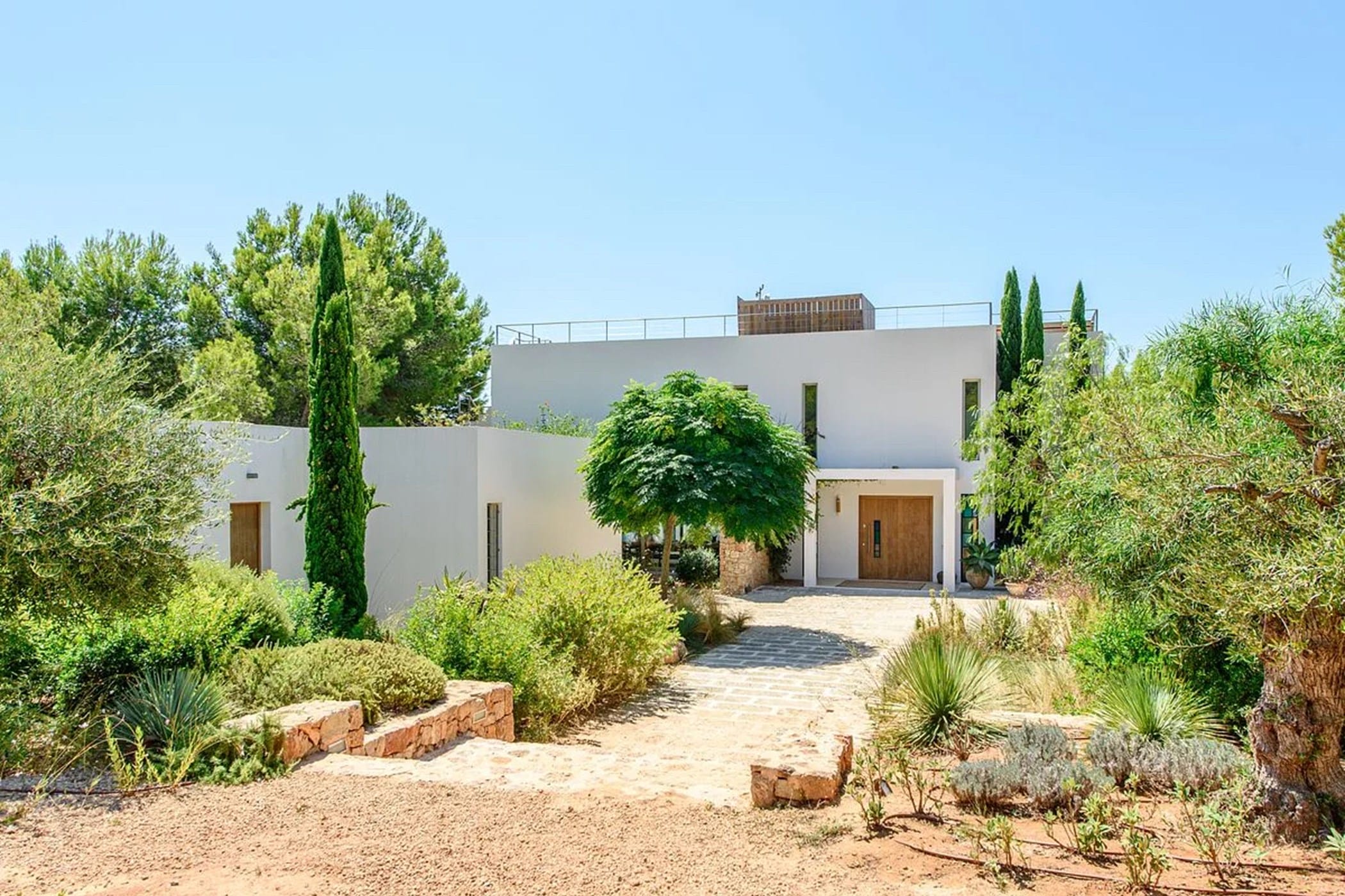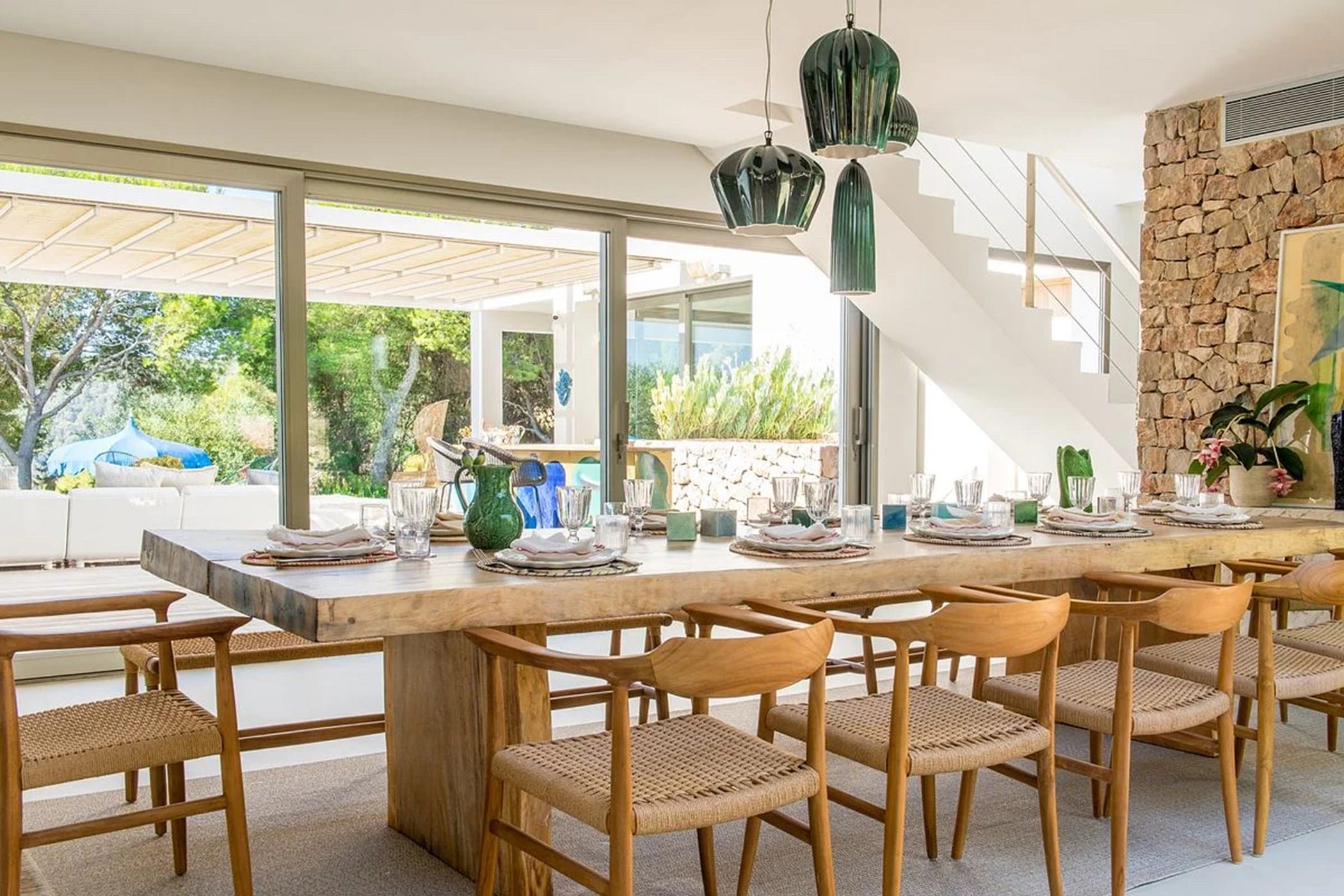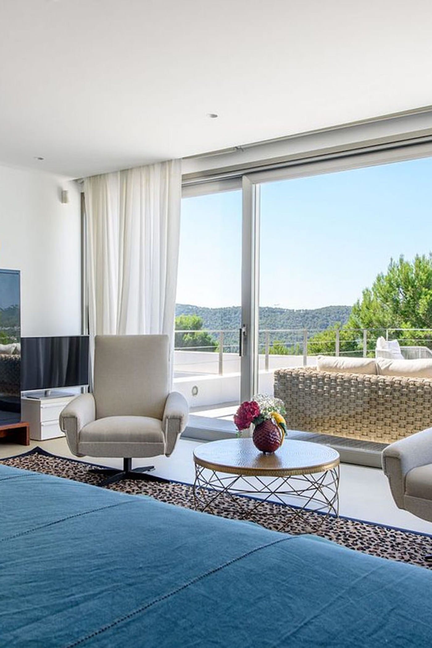 This modern 7-bedroom mansion, designed by renowned architect Jaime Serra, sits majestically on a hillside with beautiful views over green hills and Cala Jondal bay, home to the world-famous Blue Marlin beach club. Close to the charming village of San Jose and Ibiza Town.