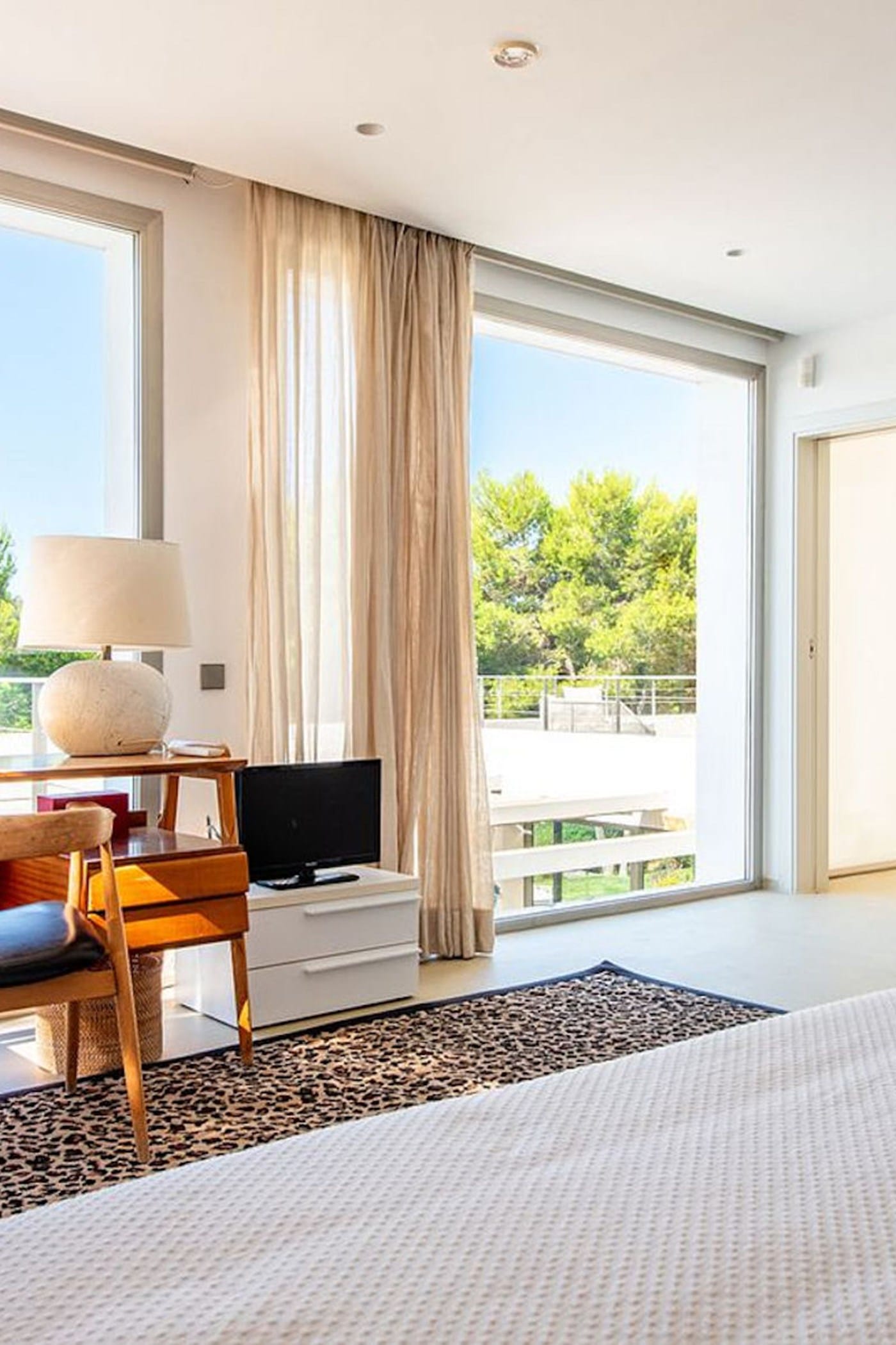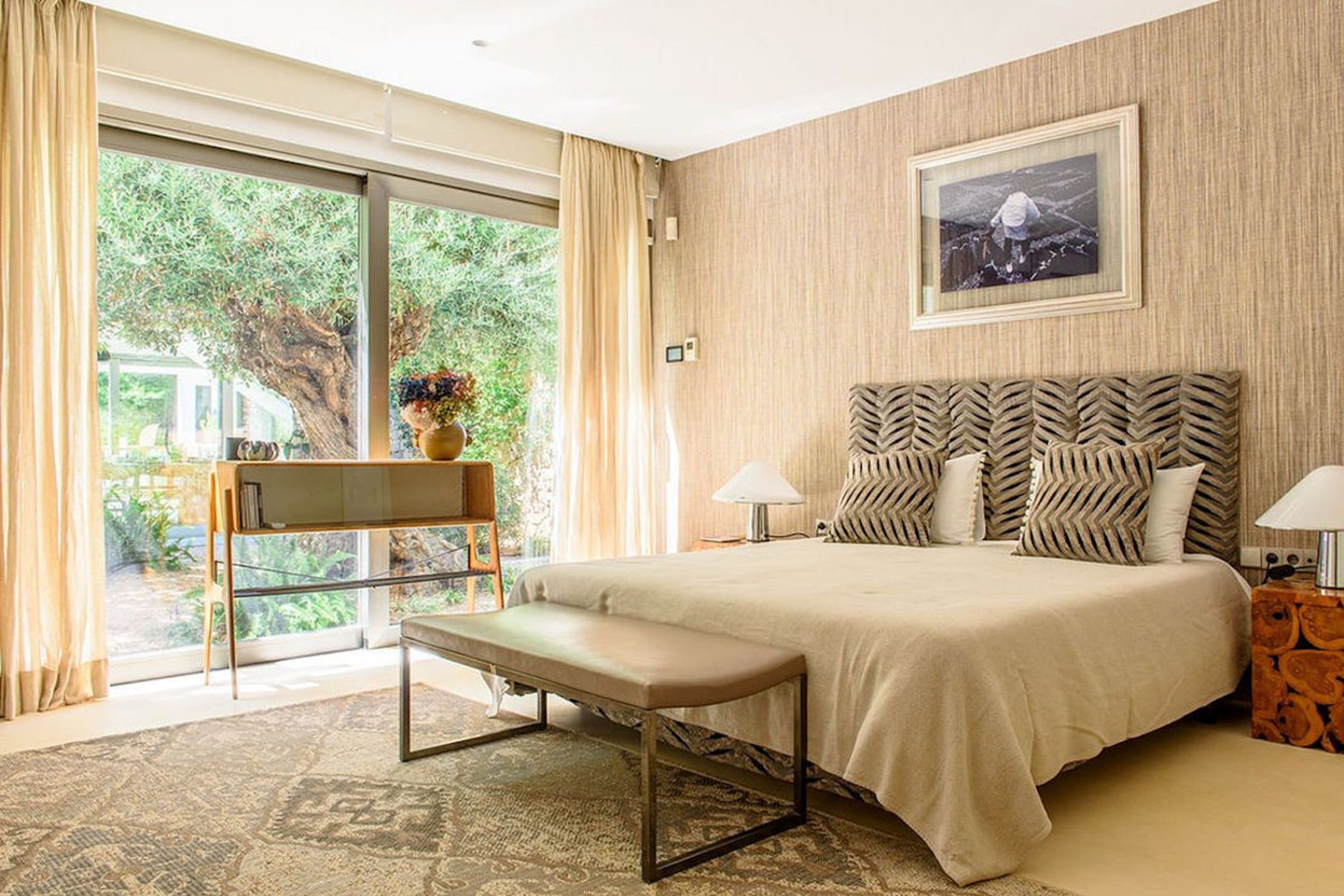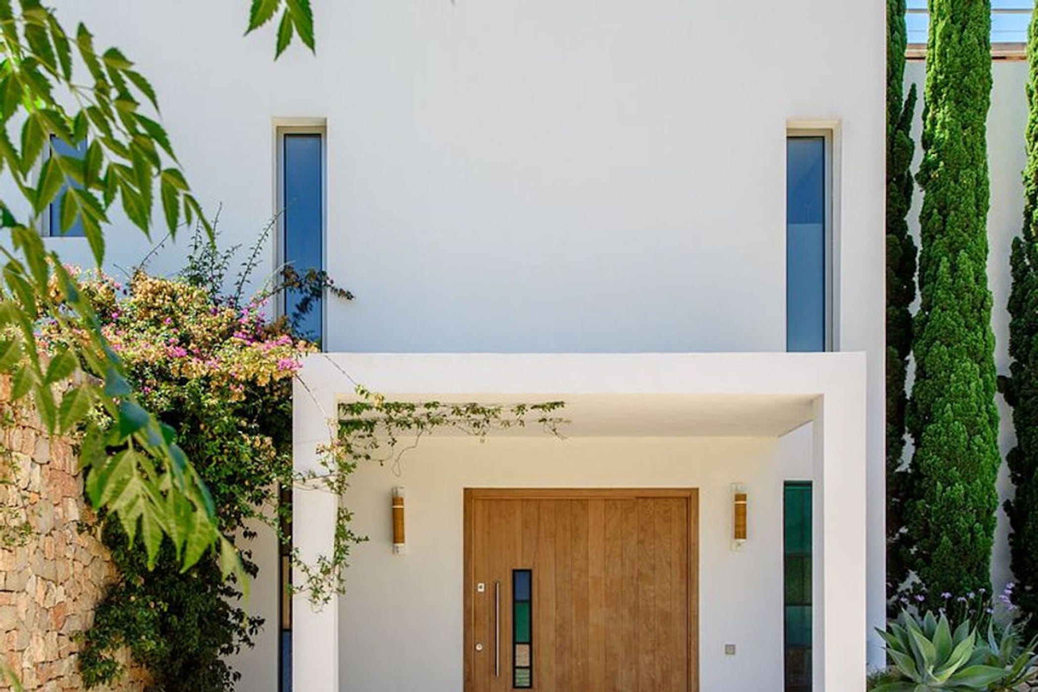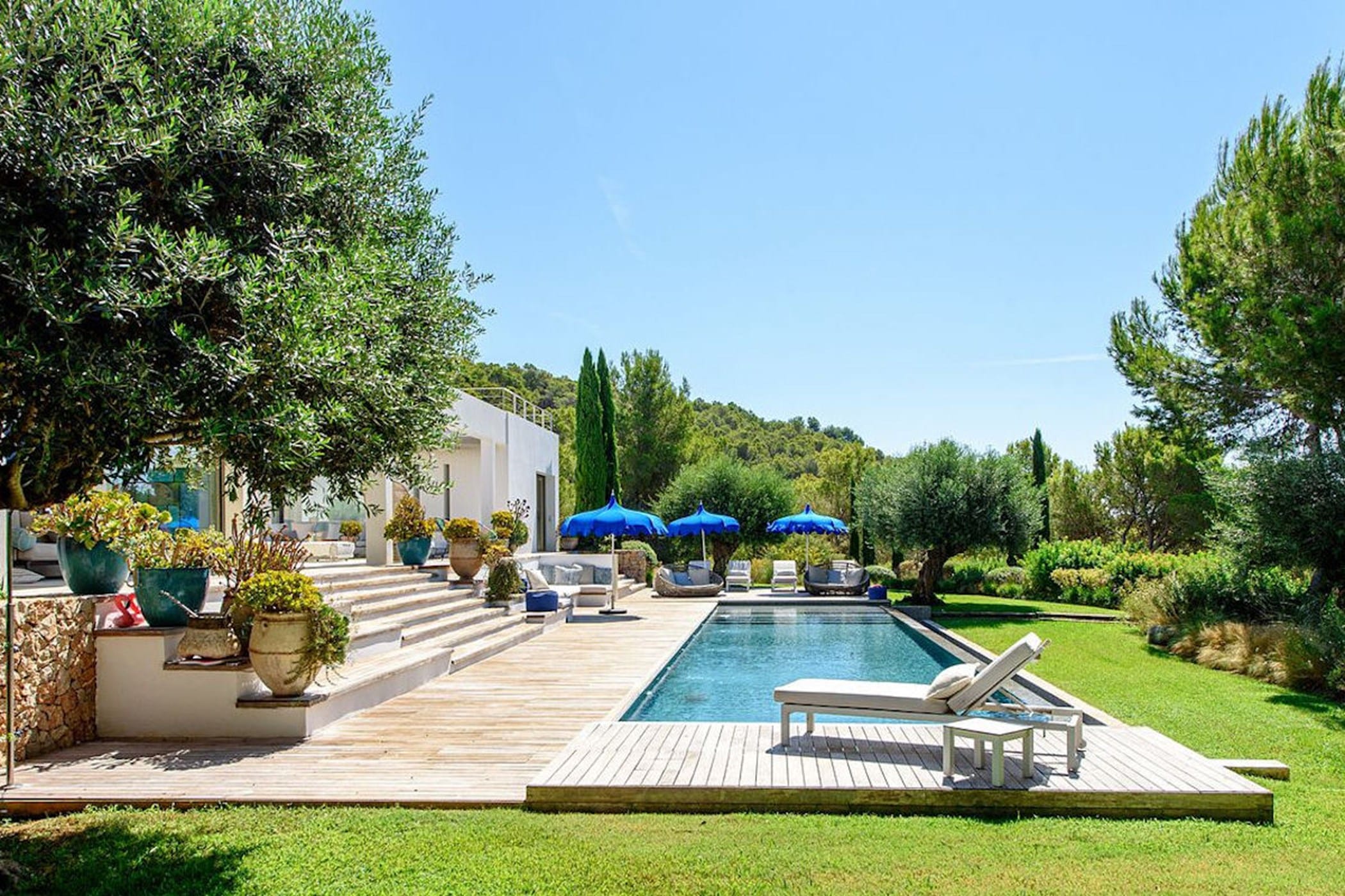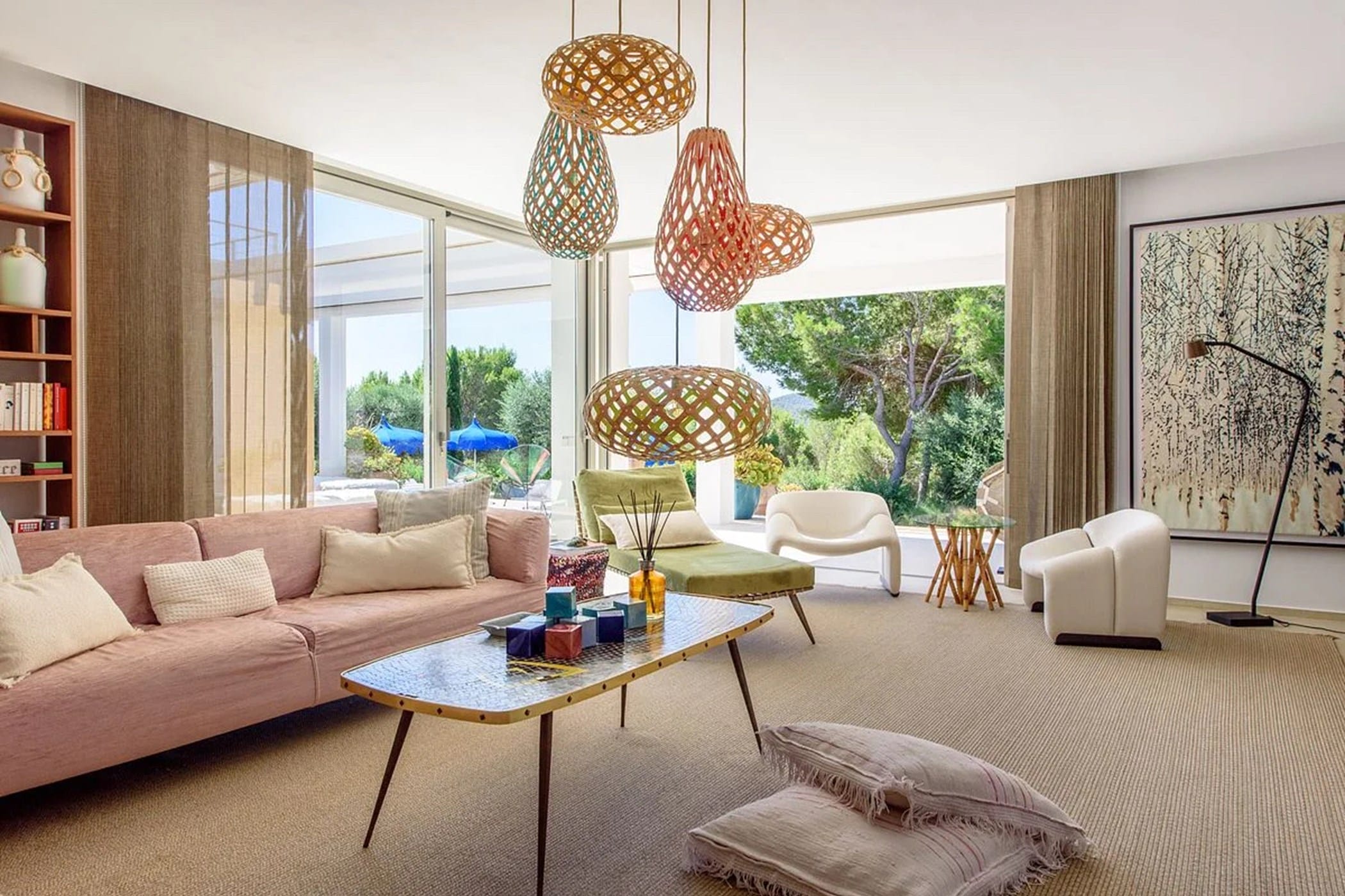 This modern 7-bedroom mansion, designed by renowned architect Jaime Serra, sits majestically on a hillside with beautiful views over green hills and Cala Jondal bay, home to the world-famous Blue Marlin beach club. Close to the charming village of San Jose and Ibiza Town.