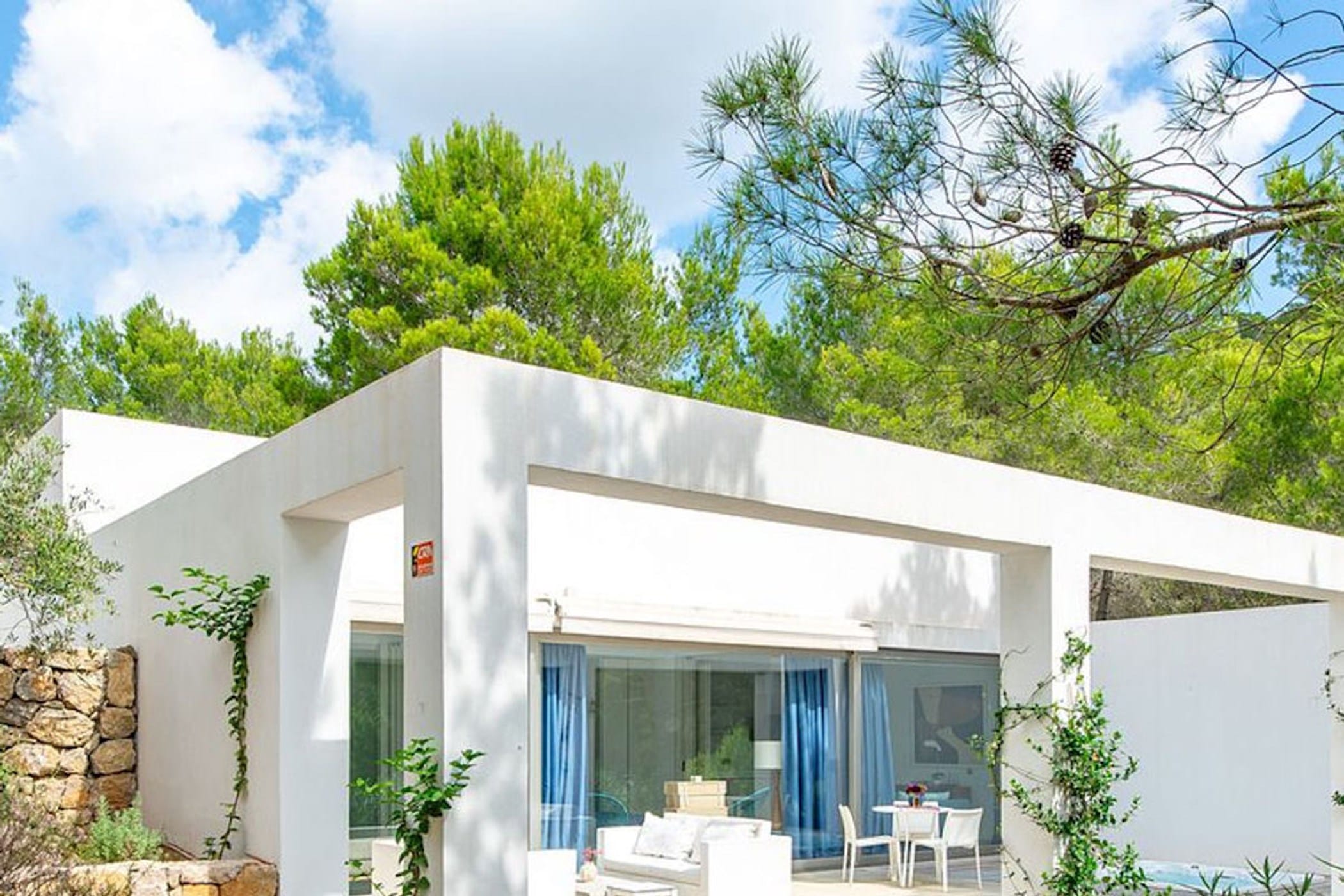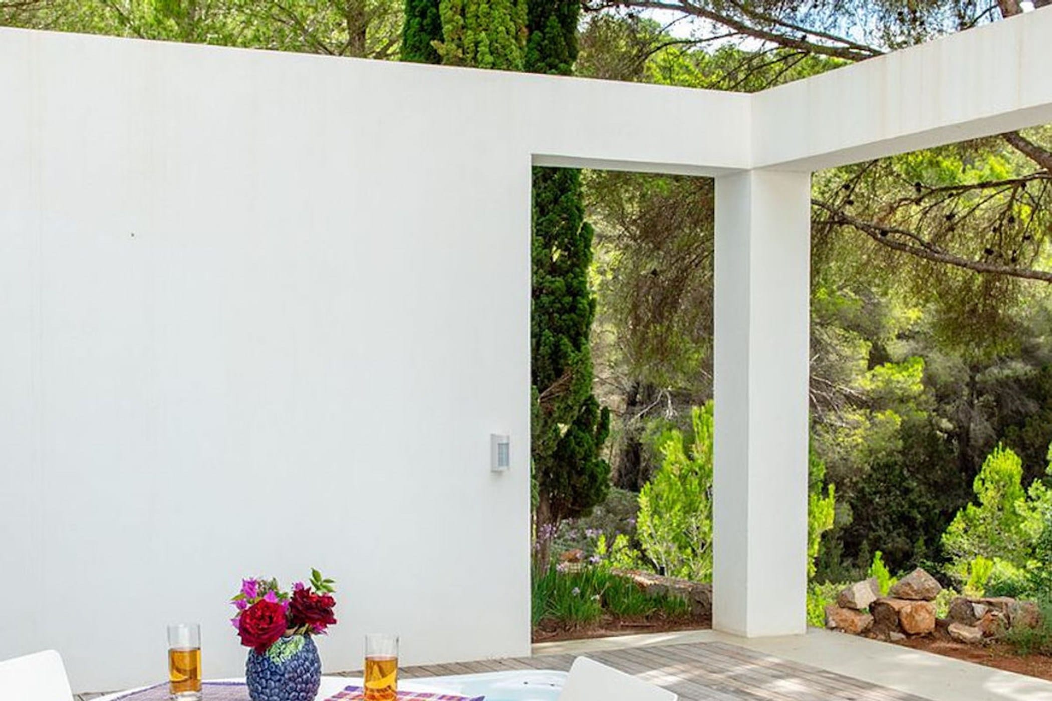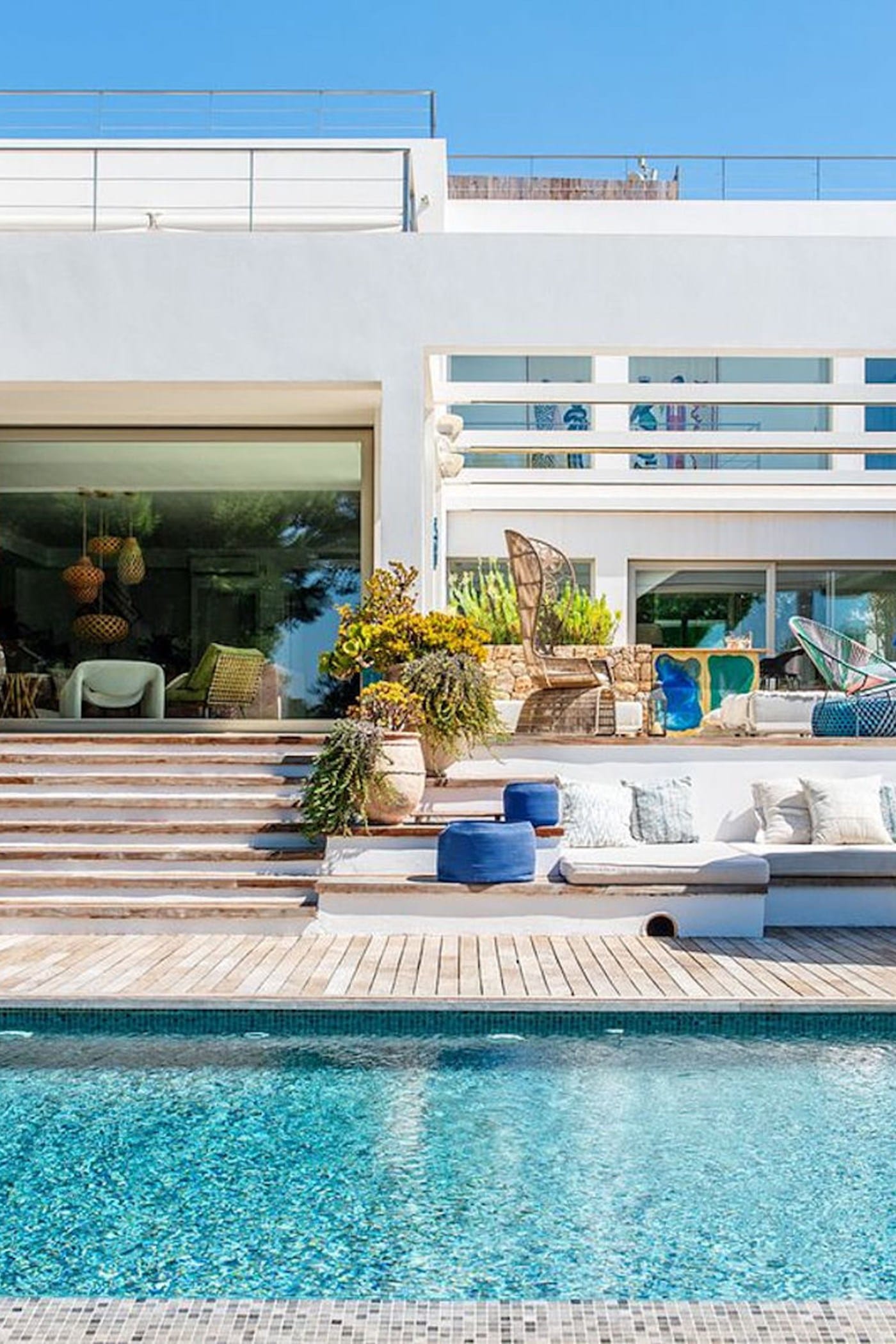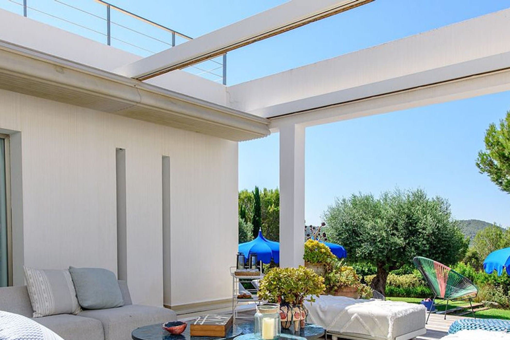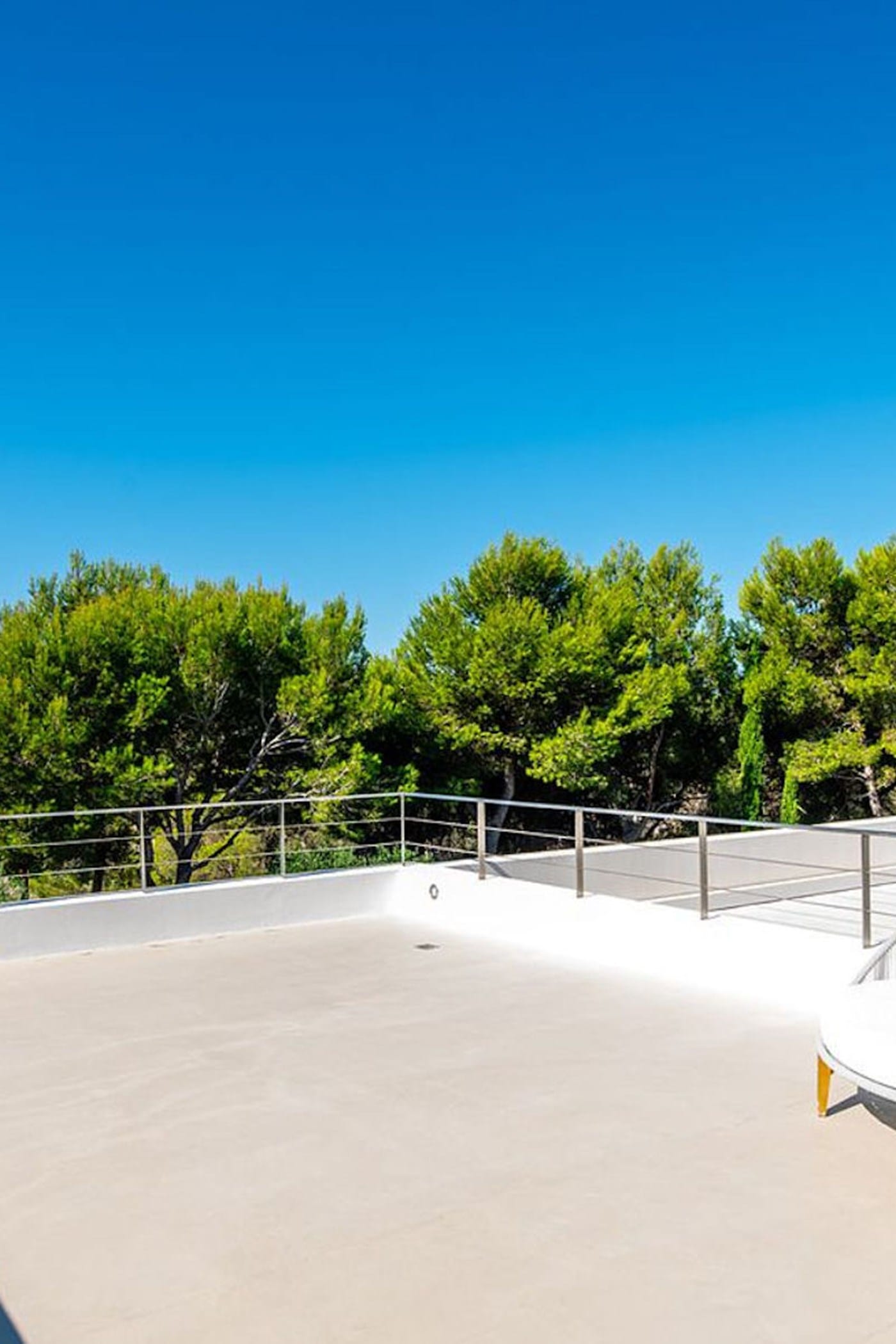 This modern 7-bedroom mansion, designed by renowned architect Jaime Serra, sits majestically on a hillside with beautiful views over green hills and Cala Jondal bay, home to the world-famous Blue Marlin beach club. Close to the charming village of San Jose and Ibiza Town.